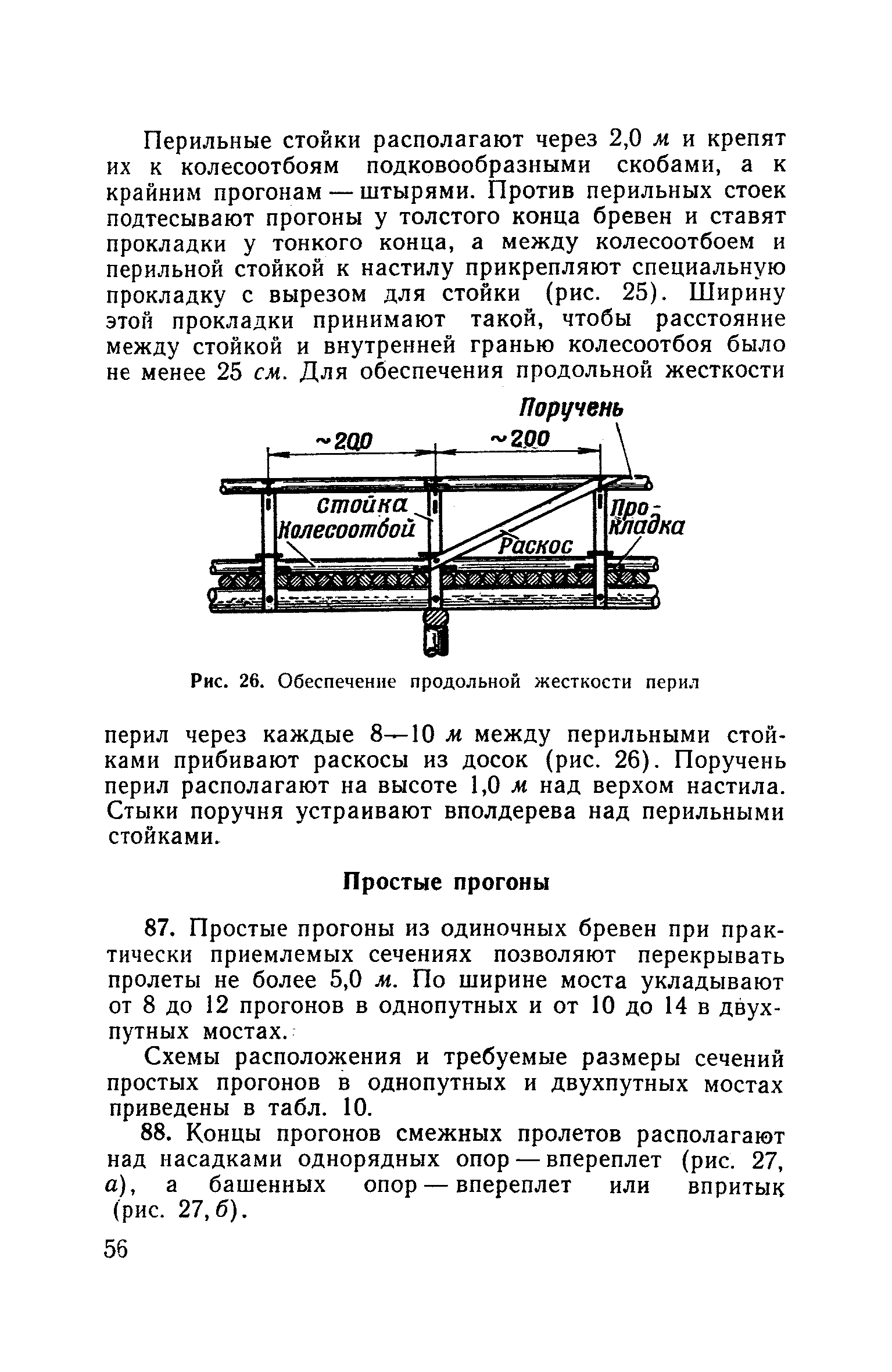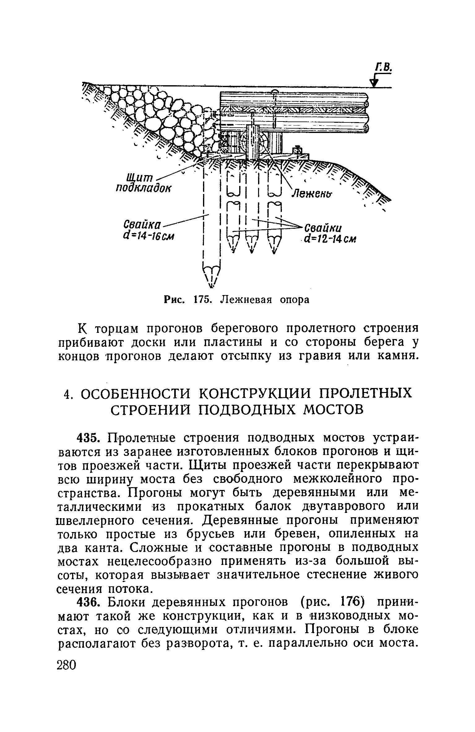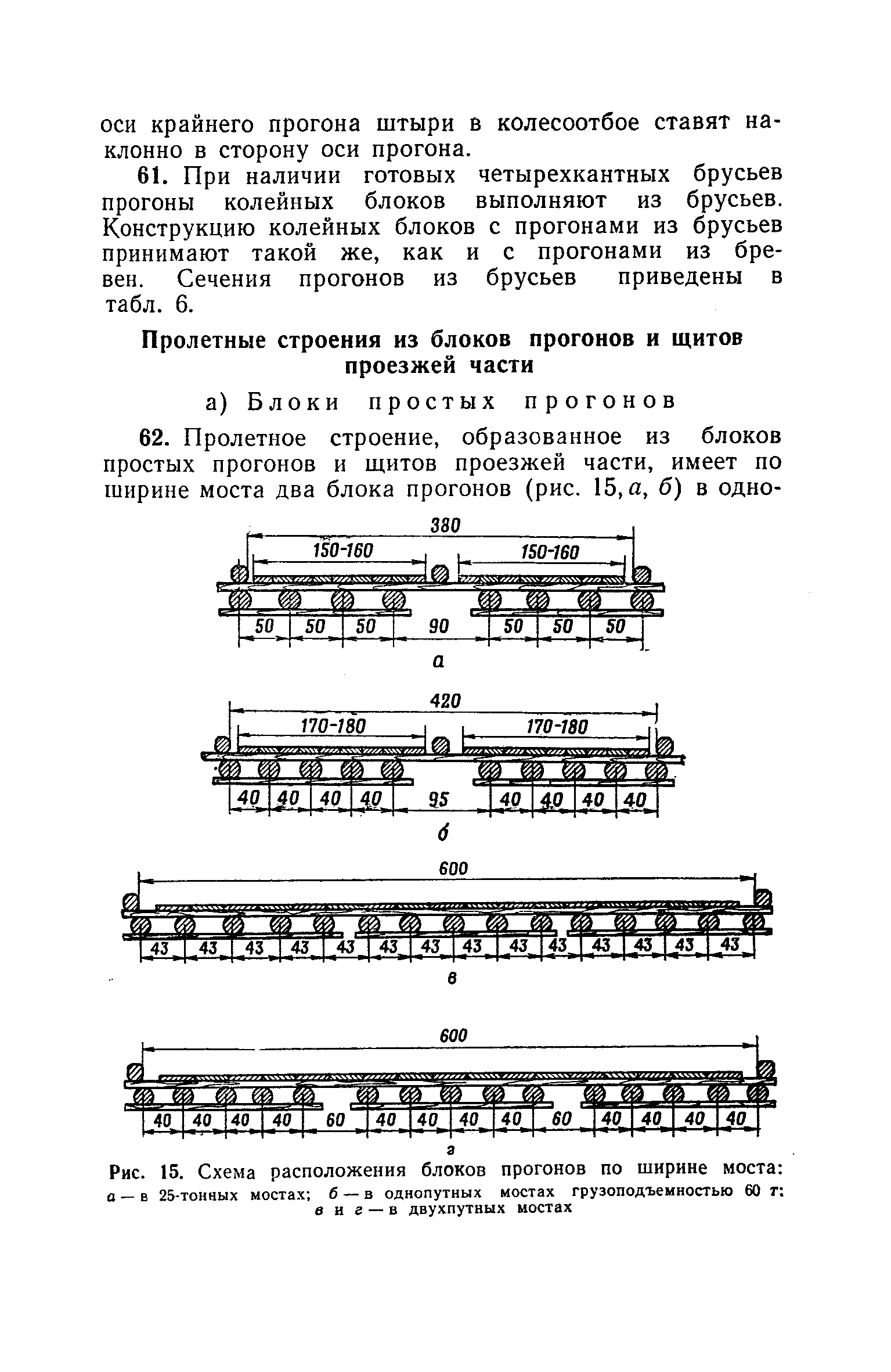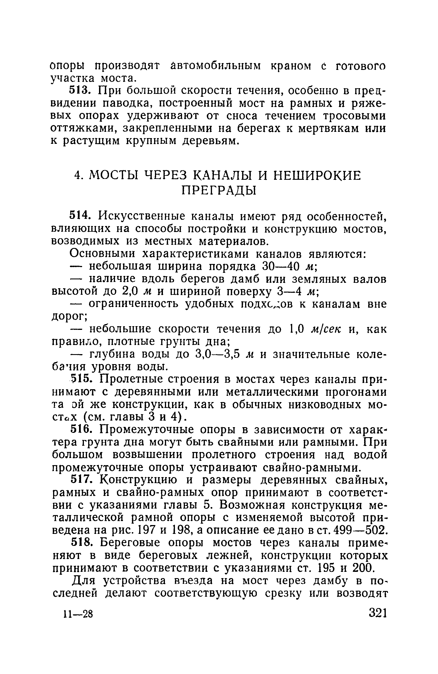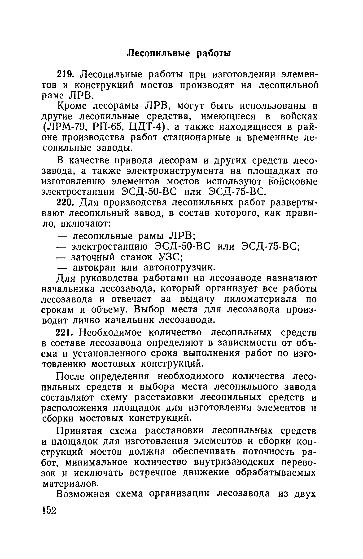 | Оглавление: | Глава 1. Общие положения Глава 2. Инженерная разведка района постройки моста Глава 3. Конструкции деревянных пролетных строений низководных мостов 1. Блочные пролетные строения Пролетные строения из колейных блоков Пролетные строения из блоков прогонов и щитов проезжей части а) Блоки простых прогонов б) Блоки сложных прогонов в) Блоки составных прогонов 2. Пролетные строения из отдельных элементов с простыми и сложными прогонами Проезжая часть Простые прогоны Сложные прогоны Глава 4. Конструкции металлических пролетных строений низководных мостов 1. Блочные пролетные строения Блоки из четырех прогонов Блоки из двух прогонов Проезжая часть 2. Пролетные строения из отдельных элементов Несущая конструкция с простыми прогонами и пакетами Несущая конструкция с составными прогонами Проезжая часть Глава 5. Промежуточные опоры низководных мостов 1. Свайные опоры 2. Рамные деревянные опоры 3. Клеточные опоры 4. Обеспечение продольной устойчивости моста Глава 6. Береговые опоры и сопряжение моста с берегами Глава 7. Изготовление и транспортировка мостовых конструкций 1. Общие положения 2. Изготовление конструкций низководных деревянных мостов Лесозаготовительные работы Лесопильные работы Работы по изготовлению деревянных мостовых конструкций Изготовление колейных блоков Сборка блоков прогонов Изготовление конструкций пролетного строения из блоков прогонов и щитов проезжей части Особенности сборки блоков сложных прогонов Изготовление составных прогонов на стальных цилиндрических нагелях и сборка блоков из двух прогонов Изготовление свай Изготовление насадок и лежней опор Изготовление элементов и сборка рамных опор Особенности изготовления элементов мостовых конструкций при постройке мостов из отдельных элементов 3. Изготовление конструкций металлических мостов Общие положения Изготовление металлических элементов Изготовление элементов проезжей части Изготовление блоков прогонов Изготовление пролетных строений из отдельных элементов 4. Транспортировка мостовых конструкций Глава 8. Постройка низководных мостов 1. Общие положения 2. Разбивка оси моста и осей опор 3. Средства механизации работ при постройке мостов 4. Глубина забивки свай в опорах 5. Организация в производство работ при постройке низководных мостов Общие положения Постройка мостов на свайных опорах при помощи комплекта мостостроительных средств КМС Постройка мостов на свайных опорах при помощи дизель-молотов ДМ-150 с одностреловыми копрами ОСК и дизель-молотов ДБ-45 с приспособлениями ПУС-1 для установки свай Постройка мостов на рамных опорах при помощи паромов с домкратами из комплекта КМС Устройство береговых опор и сопряжений моста с берегами Постройка мостов из отдельных элементов Особенности постройки двухпутных мостов на свайных опорах Особенности постройки мостов на свайных опорах с увеличенными пролетами Глава 9. Подводные мосты 1. Общие положения 2. Особенности конструкции промежуточных опор 3. Береговые опоры и сопряжение подводного моста с берегами 4. Особенности конструкции пролетных строений подводных мостов 5. Особенности постройки подводных мостов на свайных опорах 6. Особенности постройки подводных мостов на рамных опорах 7. Особенности постройки подводных мостов с металлическими прогонами Глава 10. Особенности к