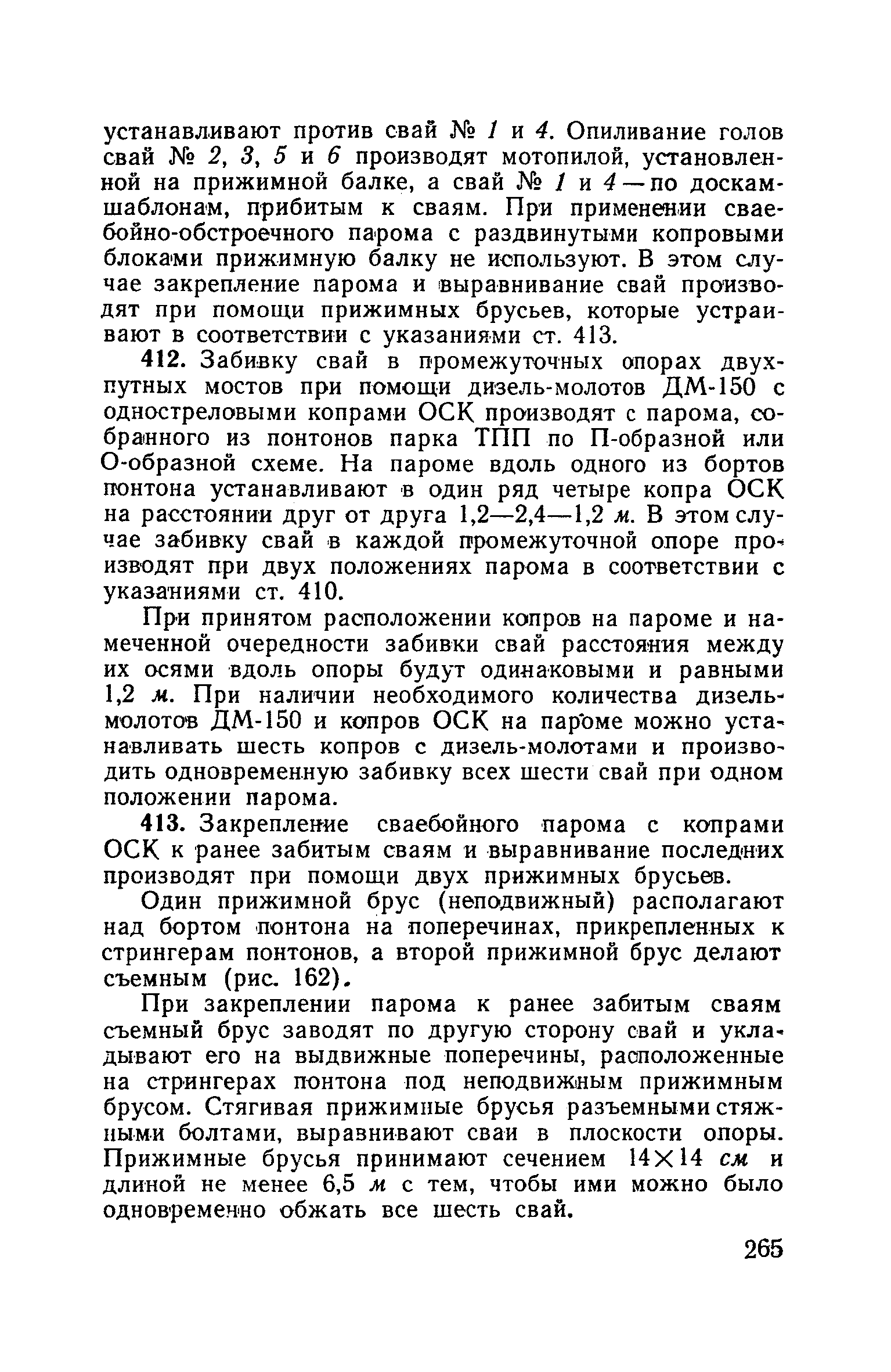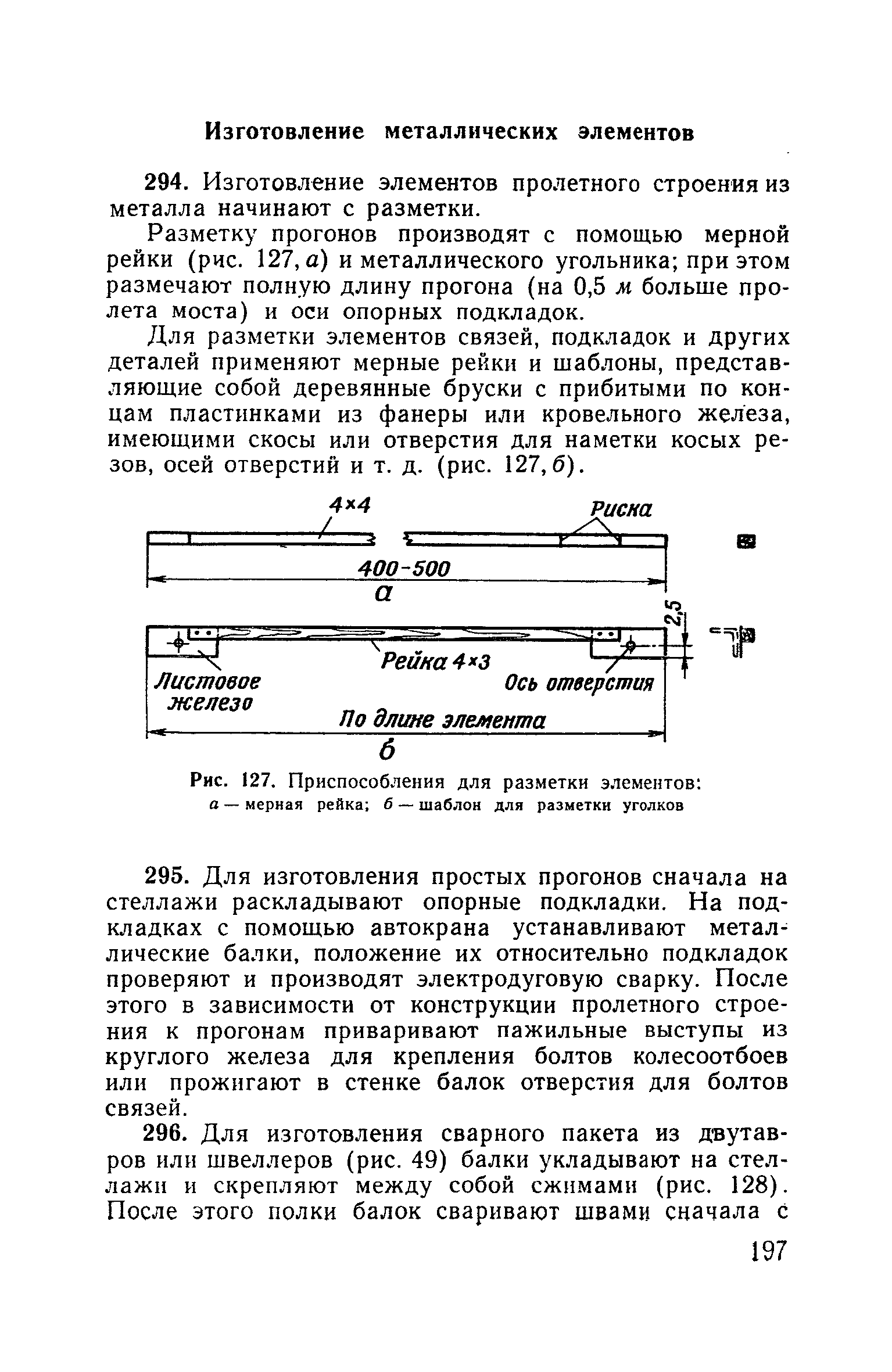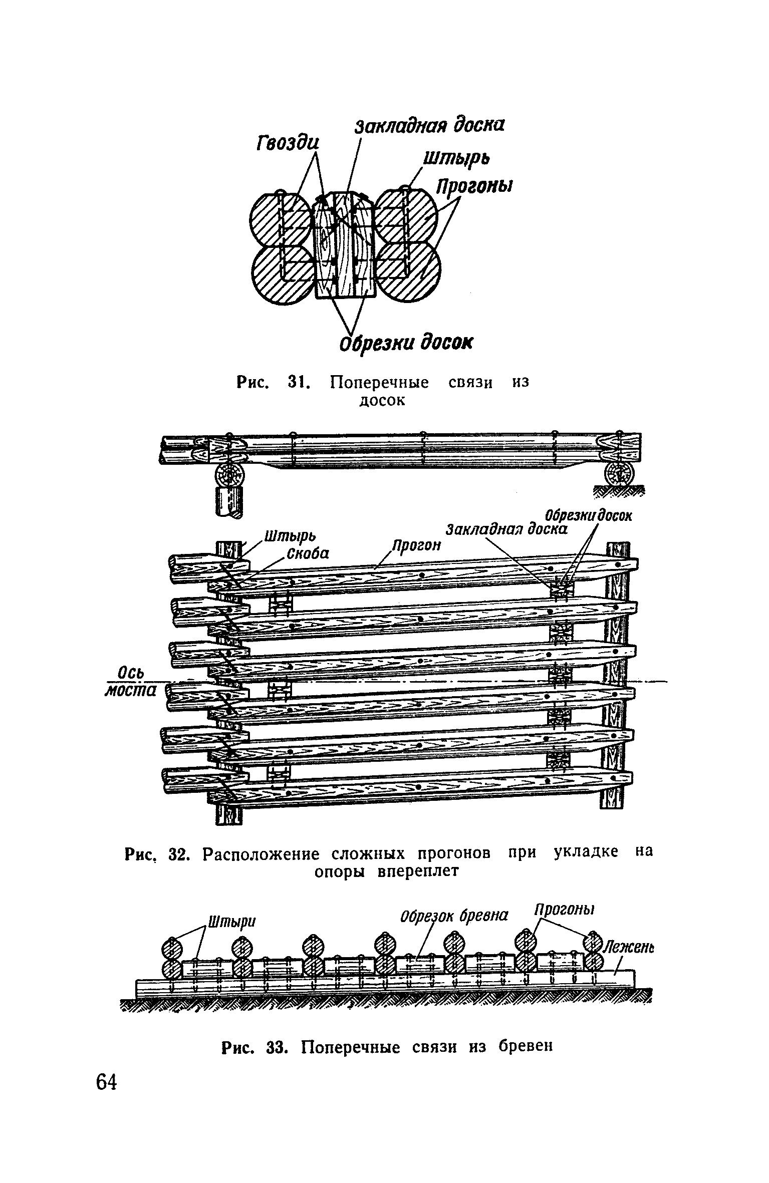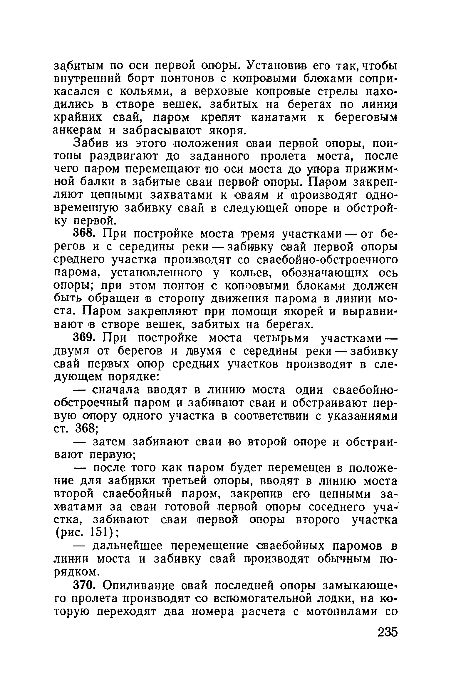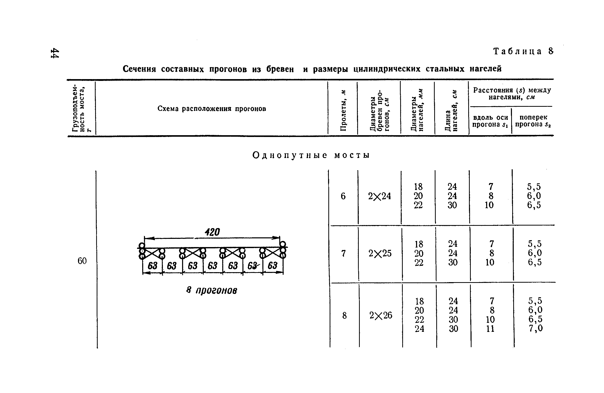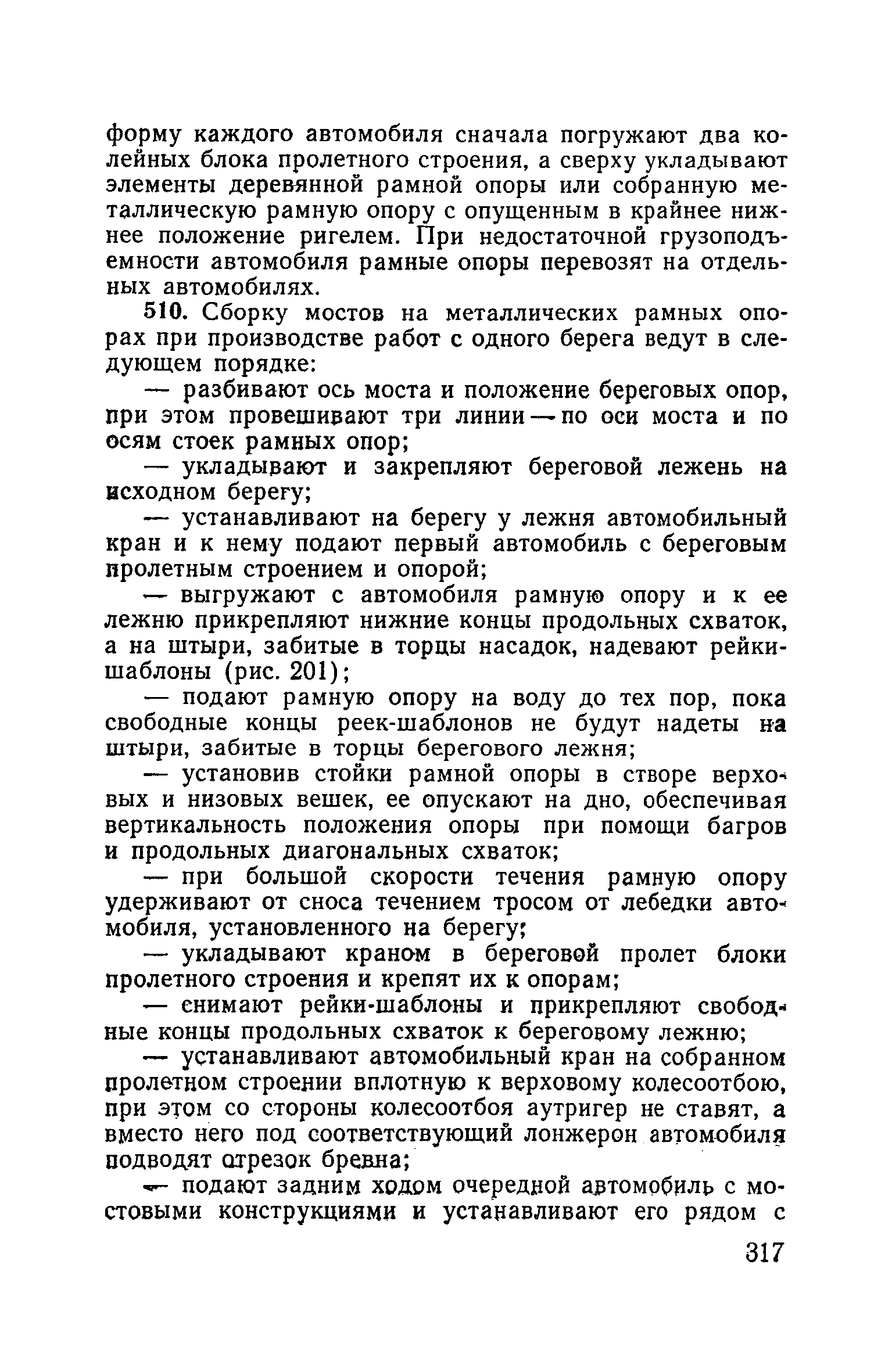 | Оглавление: | Глава 1. Общие положения Глава 2. Инженерная разведка района постройки моста Глава 3. Конструкции деревянных пролетных строений низководных мостов 1. Блочные пролетные строения Пролетные строения из колейных блоков Пролетные строения из блоков прогонов и щитов проезжей части а) Блоки простых прогонов б) Блоки сложных прогонов в) Блоки составных прогонов 2. Пролетные строения из отдельных элементов с простыми и сложными прогонами Проезжая часть Простые прогоны Сложные прогоны Глава 4. Конструкции металлических пролетных строений низководных мостов 1. Блочные пролетные строения Блоки из четырех прогонов Блоки из двух прогонов Проезжая часть 2. Пролетные строения из отдельных элементов Несущая конструкция с простыми прогонами и пакетами Несущая конструкция с составными прогонами Проезжая часть Глава 5. Промежуточные опоры низководных мостов 1. Свайные опоры 2. Рамные деревянные опоры 3. Клеточные опоры 4. Обеспечение продольной устойчивости моста Глава 6. Береговые опоры и сопряжение моста с берегами Глава 7. Изготовление и транспортировка мостовых конструкций 1. Общие положения 2. Изготовление конструкций низководных деревянных мостов Лесозаготовительные работы Лесопильные работы Работы по изготовлению деревянных мостовых конструкций Изготовление колейных блоков Сборка блоков прогонов Изготовление конструкций пролетного строения из блоков прогонов и щитов проезжей части Особенности сборки блоков сложных прогонов Изготовление составных прогонов на стальных цилиндрических нагелях и сборка блоков из двух прогонов Изготовление свай Изготовление насадок и лежней опор Изготовление элементов и сборка рамных опор Особенности изготовления элементов мостовых конструкций при постройке мостов из отдельных элементов 3. Изготовление конструкций металлических мостов Общие положения Изготовление металлических элементов Изготовление элементов проезжей части Изготовление блоков прогонов Изготовление пролетных строений из отдельных элементов 4. Транспортировка мостовых конструкций Глава 8. Постройка низководных мостов 1. Общие положения 2. Разбивка оси моста и осей опор 3. Средства механизации работ при постройке мостов 4. Глубина забивки свай в опорах 5. Организация в производство работ при постройке низководных мостов Общие положения Постройка мостов на свайных опорах при помощи комплекта мостостроительных средств КМС Постройка мостов на свайных опорах при помощи дизель-молотов ДМ-150 с одностреловыми копрами ОСК и дизель-молотов ДБ-45 с приспособлениями ПУС-1 для установки свай Постройка мостов на рамных опорах при помощи паромов с домкратами из комплекта КМС Устройство береговых опор и сопряжений моста с берегами Постройка мостов из отдельных элементов Особенности постройки двухпутных мостов на свайных опорах Особенности постройки мостов на свайных опорах с увеличенными пролетами Глава 9. Подводные мосты 1. Общие положения 2. Особенности конструкции промежуточных опор 3. Береговые опоры и сопряжение подводного моста с берегами 4. Особенности конструкции пролетных строений подводных мостов 5. Особенности постройки подводных мостов на свайных опорах 6. Особенности постройки подводных мостов на рамных опорах 7. Особенности постройки подводных мостов с металлическими прогонами Глава 10. Особенности к