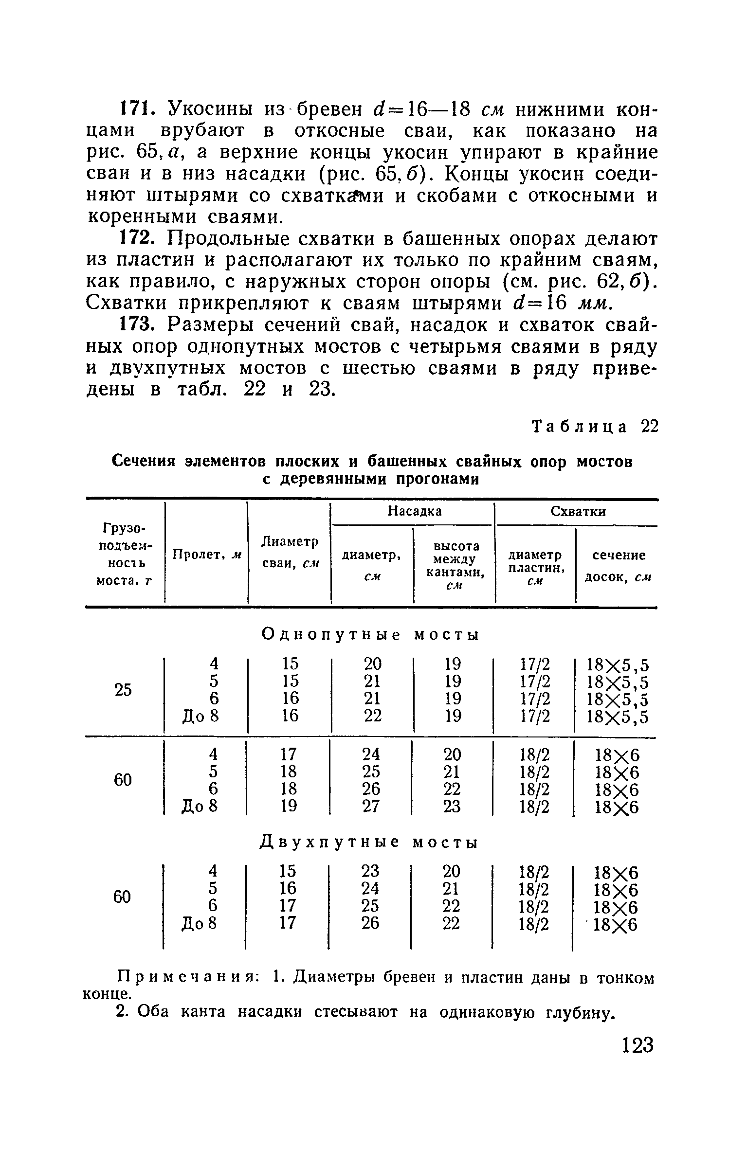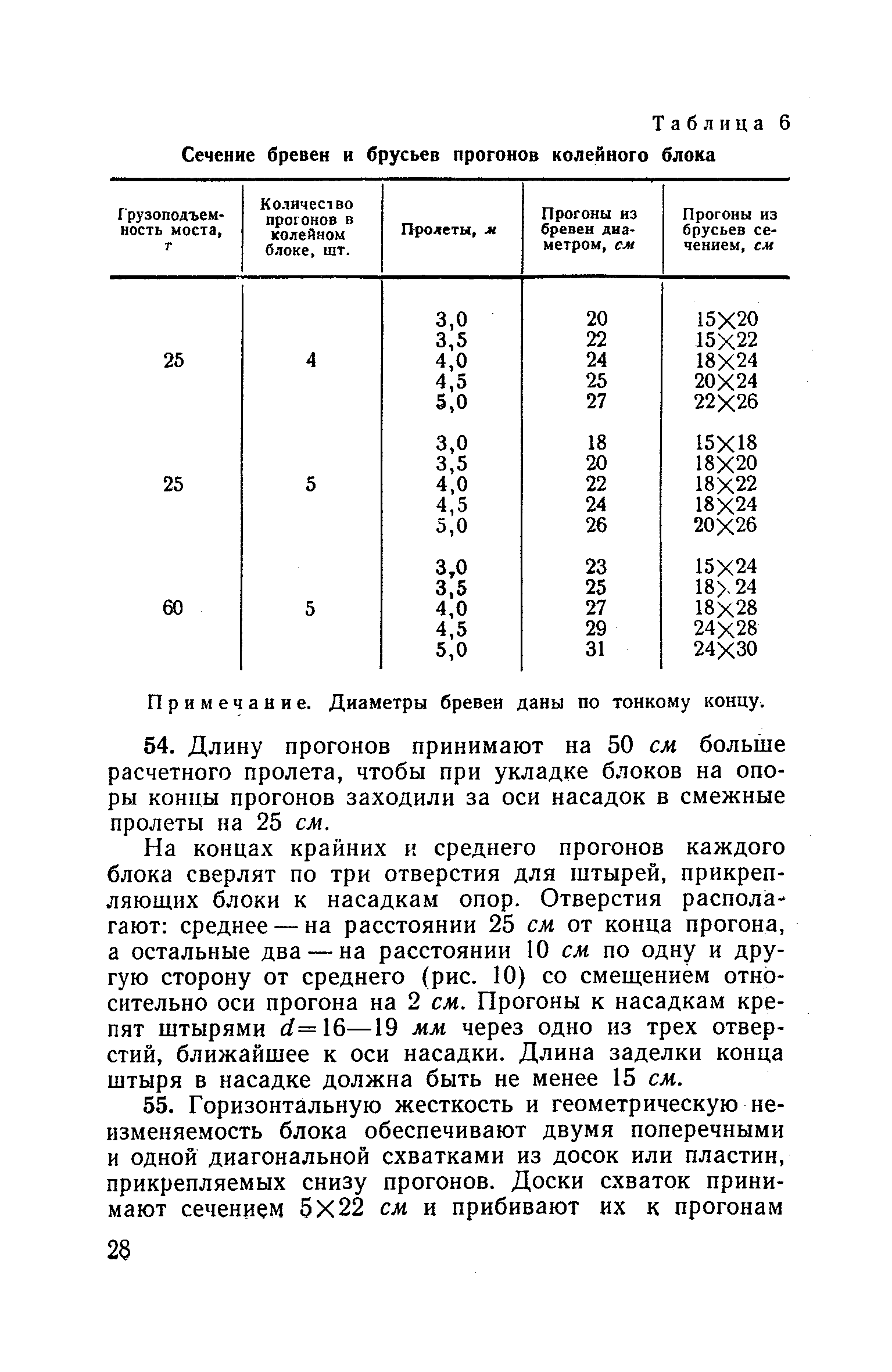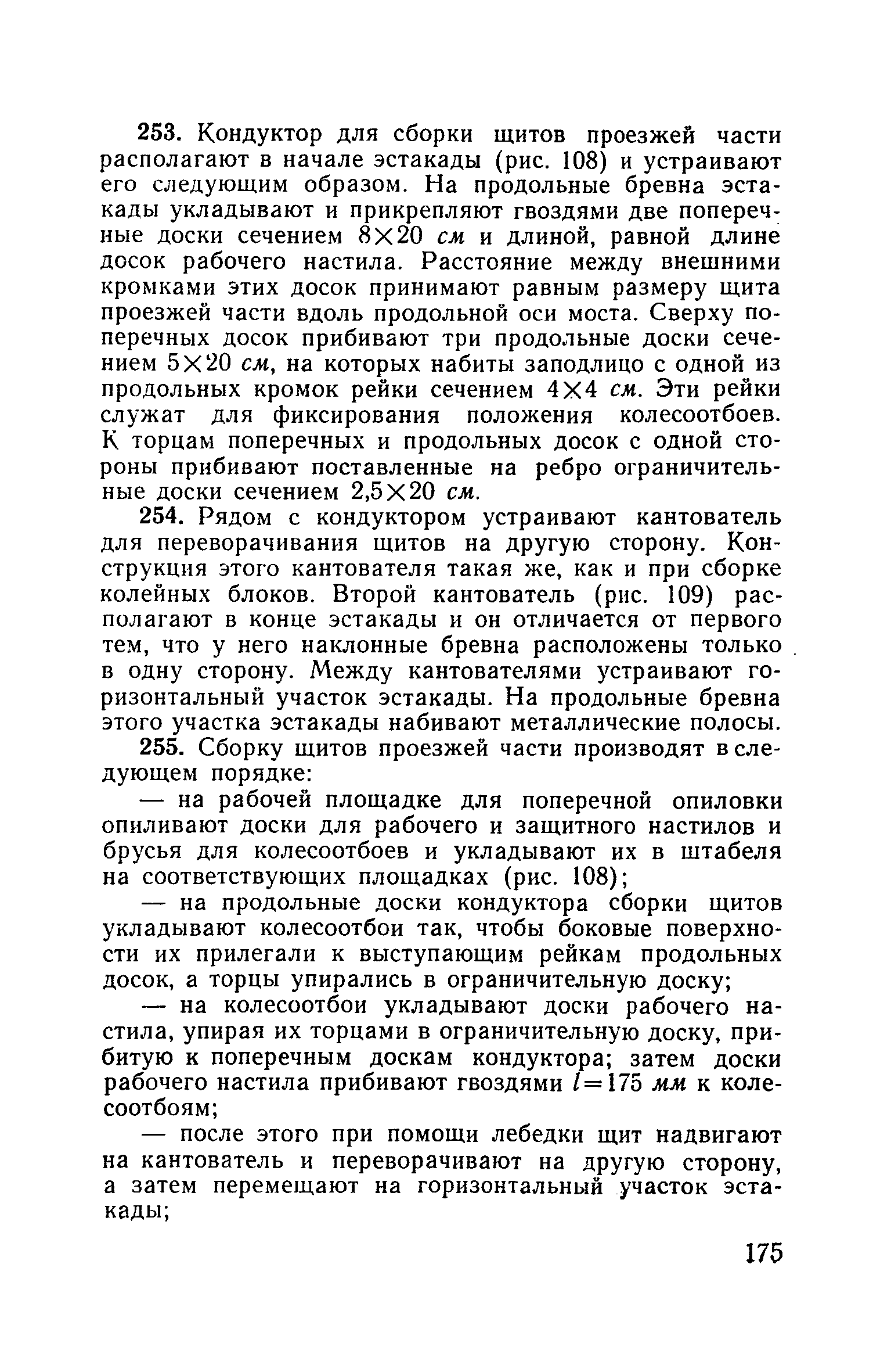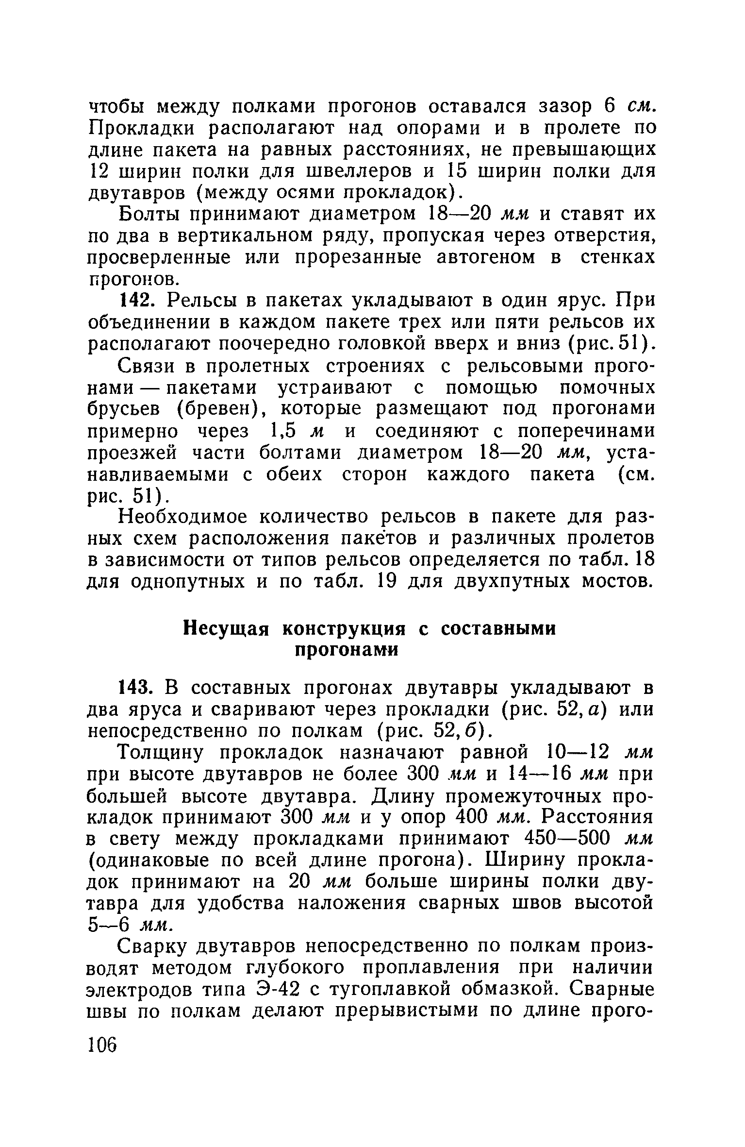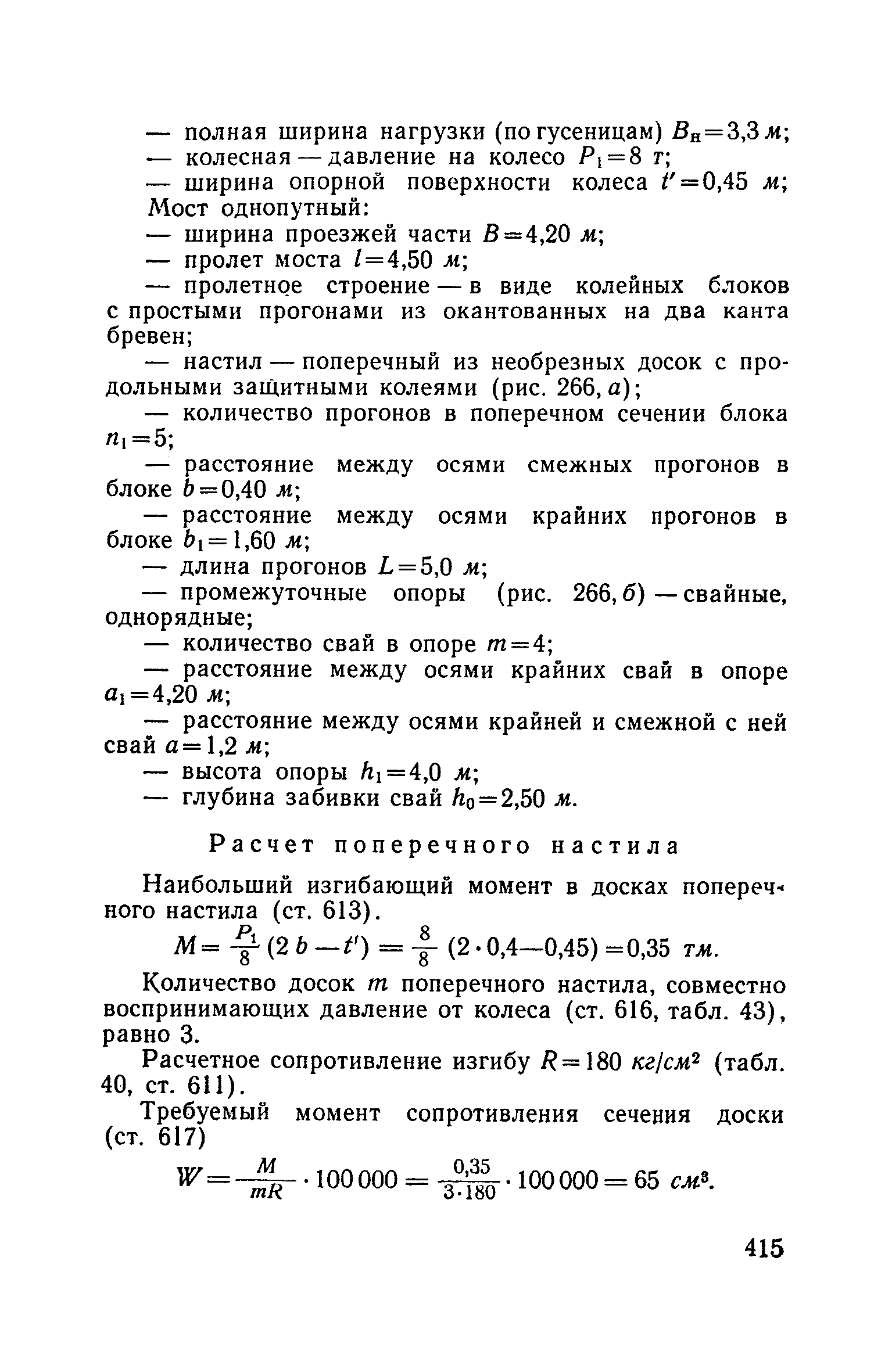 | Оглавление: | Глава 1. Общие положения Глава 2. Инженерная разведка района постройки моста Глава 3. Конструкции деревянных пролетных строений низководных мостов 1. Блочные пролетные строения Пролетные строения из колейных блоков Пролетные строения из блоков прогонов и щитов проезжей части а) Блоки простых прогонов б) Блоки сложных прогонов в) Блоки составных прогонов 2. Пролетные строения из отдельных элементов с простыми и сложными прогонами Проезжая часть Простые прогоны Сложные прогоны Глава 4. Конструкции металлических пролетных строений низководных мостов 1. Блочные пролетные строения Блоки из четырех прогонов Блоки из двух прогонов Проезжая часть 2. Пролетные строения из отдельных элементов Несущая конструкция с простыми прогонами и пакетами Несущая конструкция с составными прогонами Проезжая часть Глава 5. Промежуточные опоры низководных мостов 1. Свайные опоры 2. Рамные деревянные опоры 3. Клеточные опоры 4. Обеспечение продольной устойчивости моста Глава 6. Береговые опоры и сопряжение моста с берегами Глава 7. Изготовление и транспортировка мостовых конструкций 1. Общие положения 2. Изготовление конструкций низководных деревянных мостов Лесозаготовительные работы Лесопильные работы Работы по изготовлению деревянных мостовых конструкций Изготовление колейных блоков Сборка блоков прогонов Изготовление конструкций пролетного строения из блоков прогонов и щитов проезжей части Особенности сборки блоков сложных прогонов Изготовление составных прогонов на стальных цилиндрических нагелях и сборка блоков из двух прогонов Изготовление свай Изготовление насадок и лежней опор Изготовление элементов и сборка рамных опор Особенности изготовления элементов мостовых конструкций при постройке мостов из отдельных элементов 3. Изготовление конструкций металлических мостов Общие положения Изготовление металлических элементов Изготовление элементов проезжей части Изготовление блоков прогонов Изготовление пролетных строений из отдельных элементов 4. Транспортировка мостовых конструкций Глава 8. Постройка низководных мостов 1. Общие положения 2. Разбивка оси моста и осей опор 3. Средства механизации работ при постройке мостов 4. Глубина забивки свай в опорах 5. Организация в производство работ при постройке низководных мостов Общие положения Постройка мостов на свайных опорах при помощи комплекта мостостроительных средств КМС Постройка мостов на свайных опорах при помощи дизель-молотов ДМ-150 с одностреловыми копрами ОСК и дизель-молотов ДБ-45 с приспособлениями ПУС-1 для установки свай Постройка мостов на рамных опорах при помощи паромов с домкратами из комплекта КМС Устройство береговых опор и сопряжений моста с берегами Постройка мостов из отдельных элементов Особенности постройки двухпутных мостов на свайных опорах Особенности постройки мостов на свайных опорах с увеличенными пролетами Глава 9. Подводные мосты 1. Общие положения 2. Особенности конструкции промежуточных опор 3. Береговые опоры и сопряжение подводного моста с берегами 4. Особенности конструкции пролетных строений подводных мостов 5. Особенности постройки подводных мостов на свайных опорах 6. Особенности постройки подводных мостов на рамных опорах 7. Особенности постройки подводных мостов с металлическими прогонами Глава 10. Особенности к