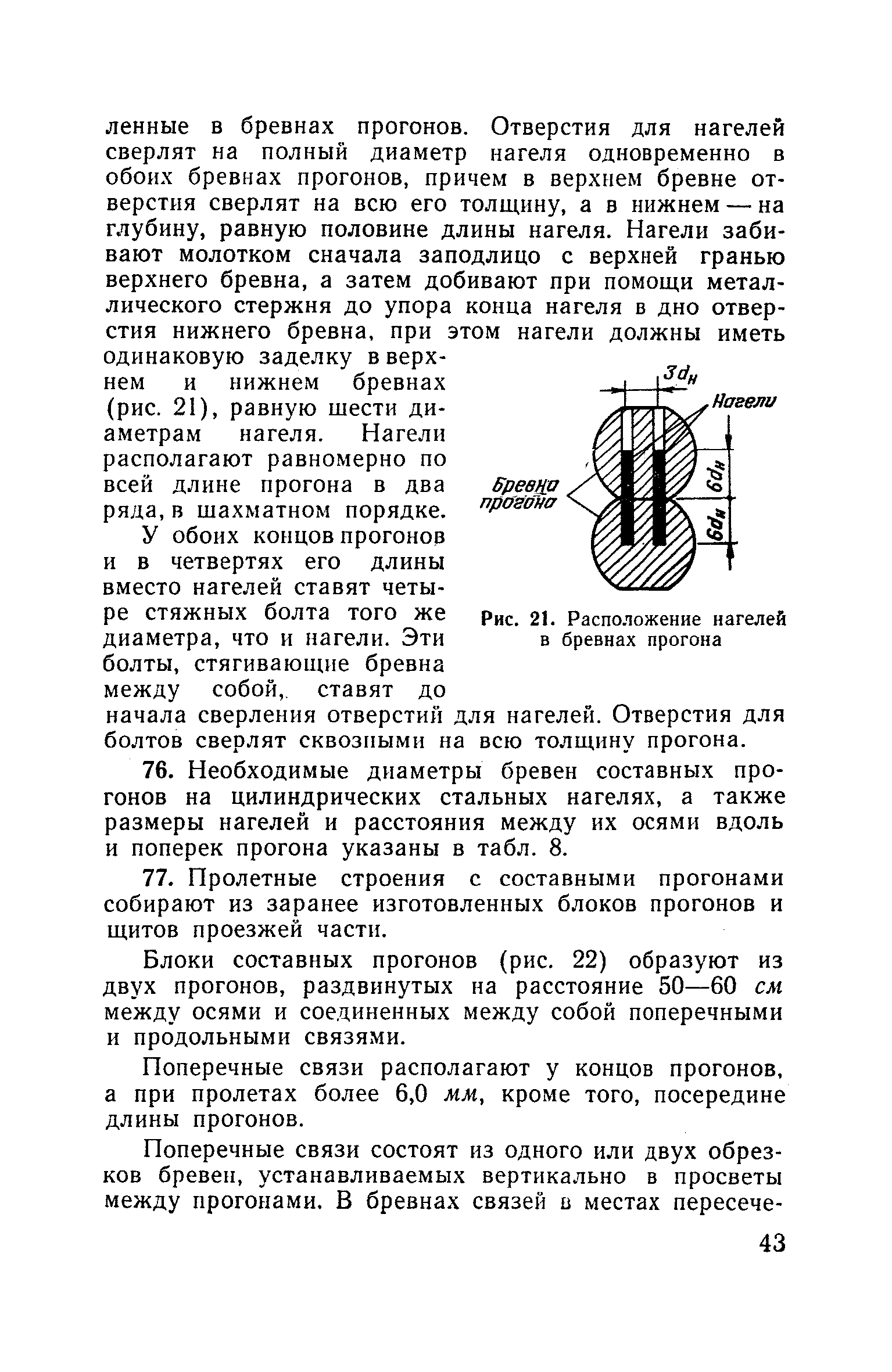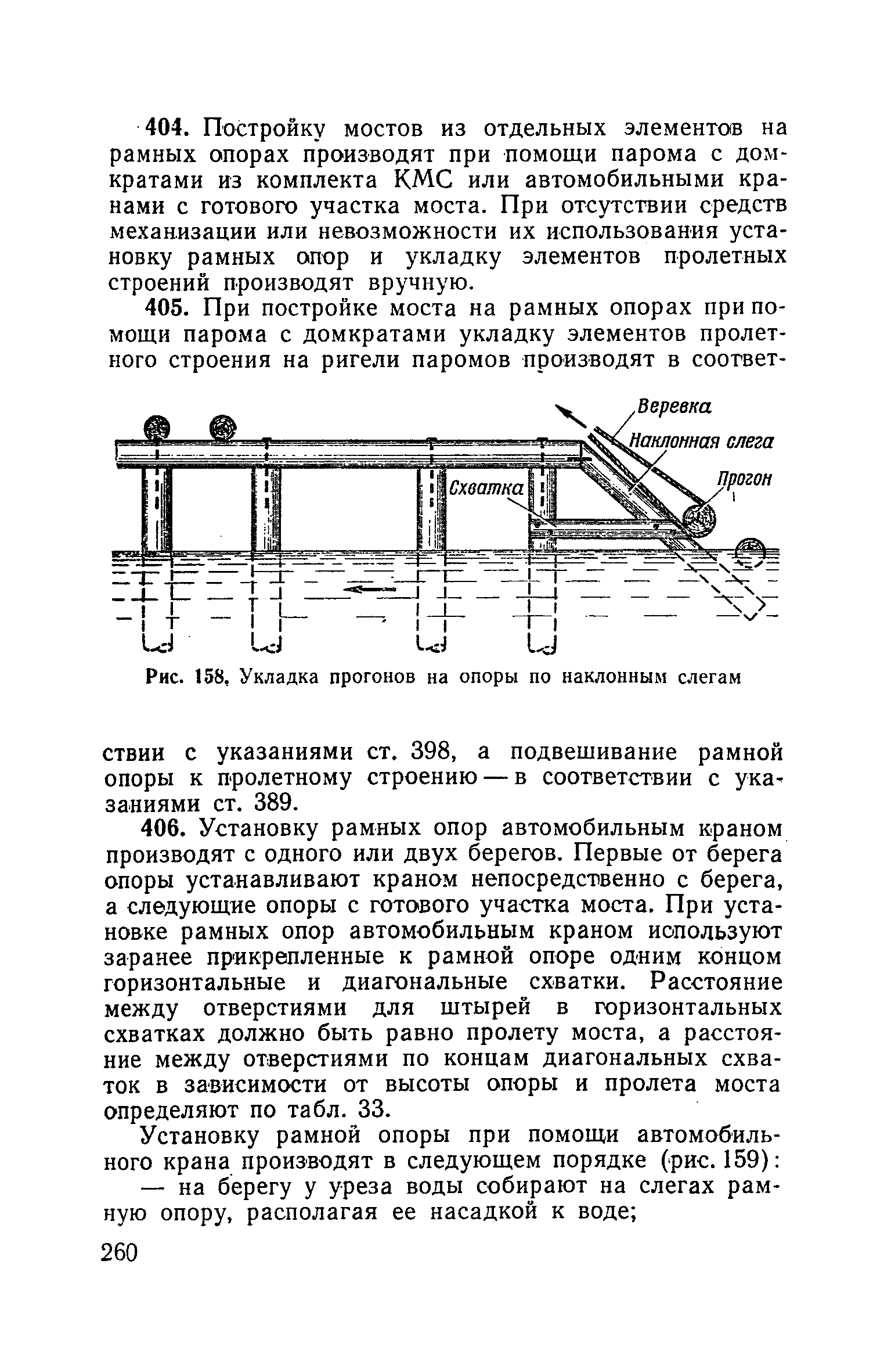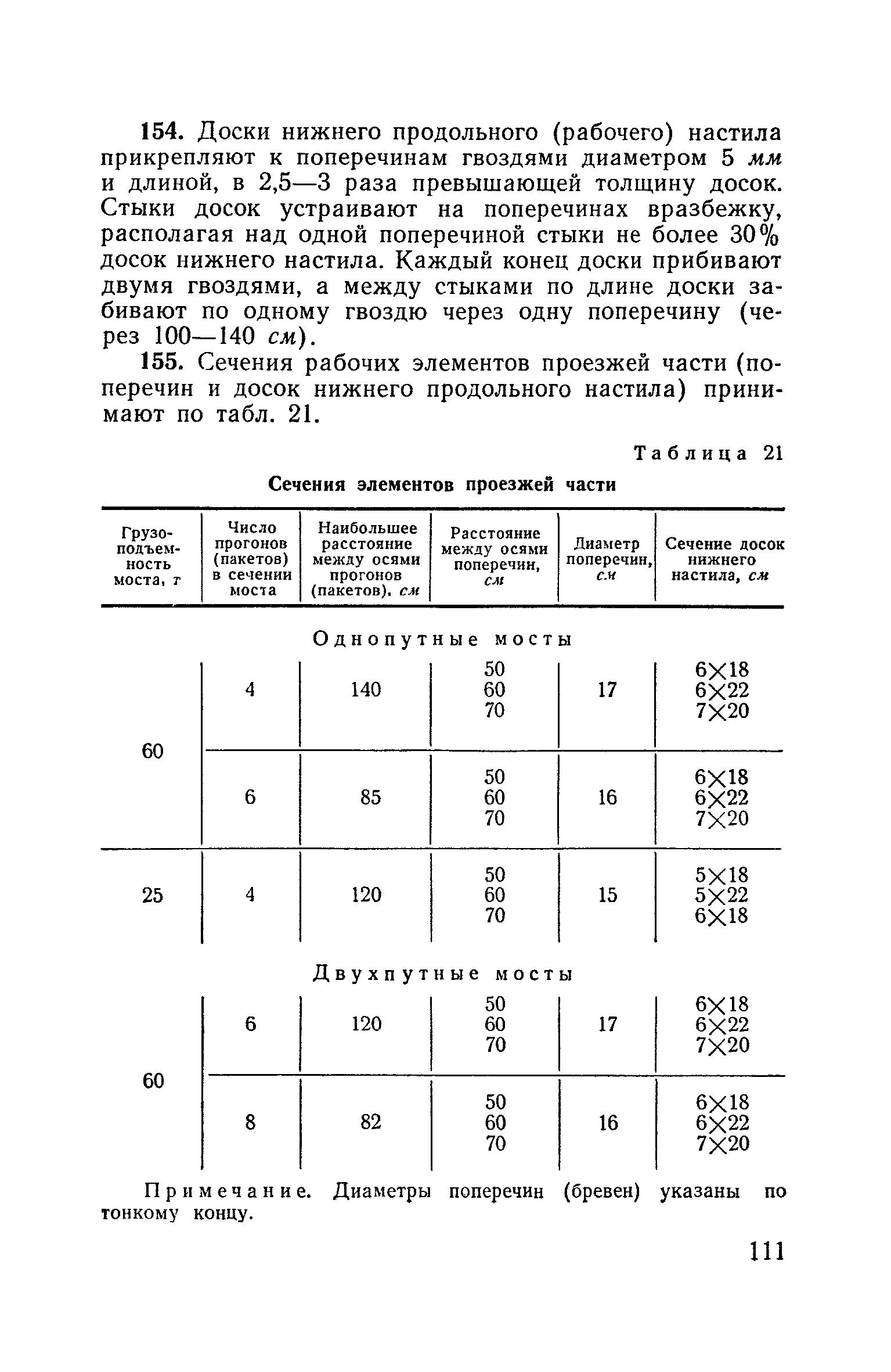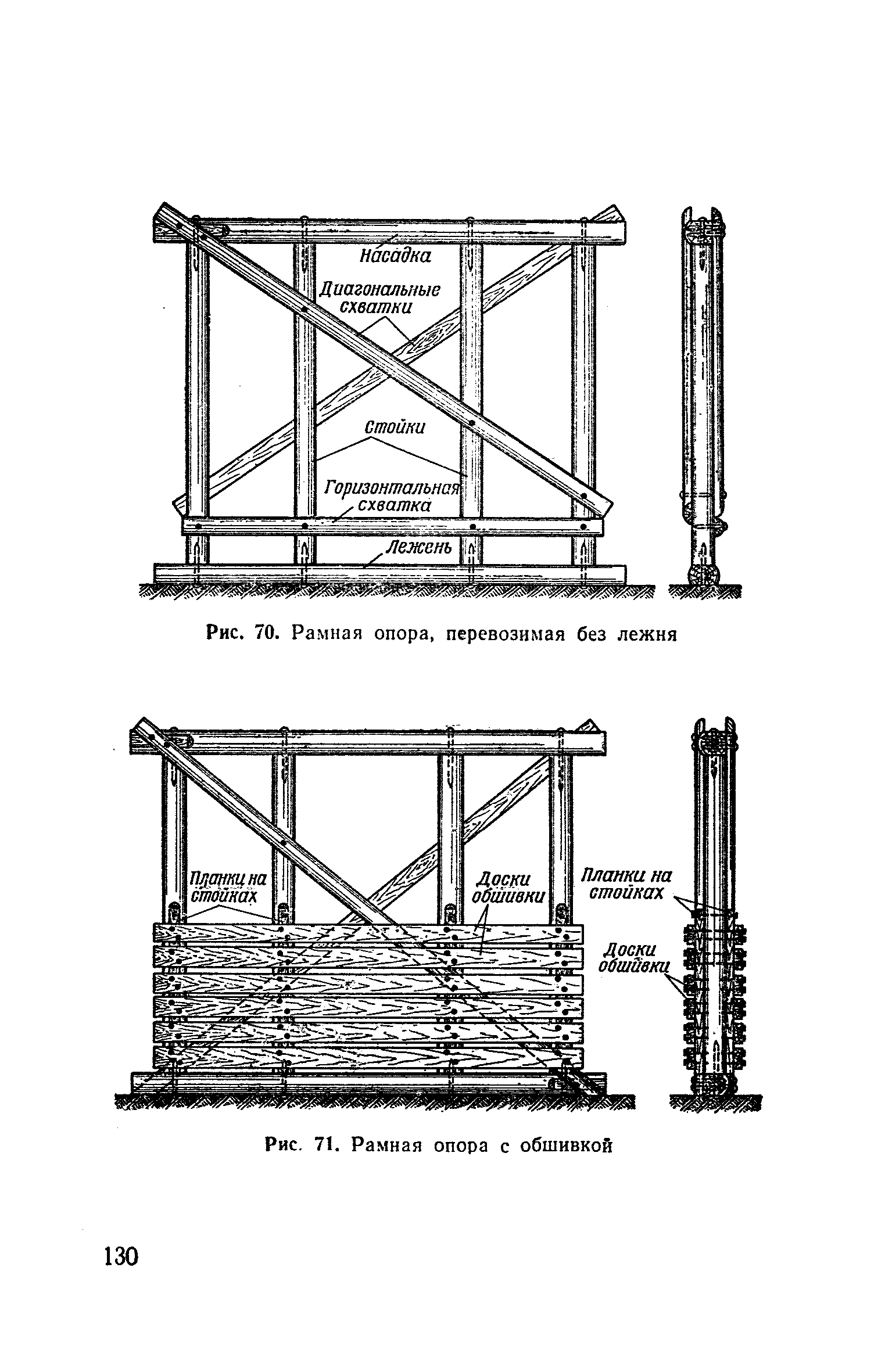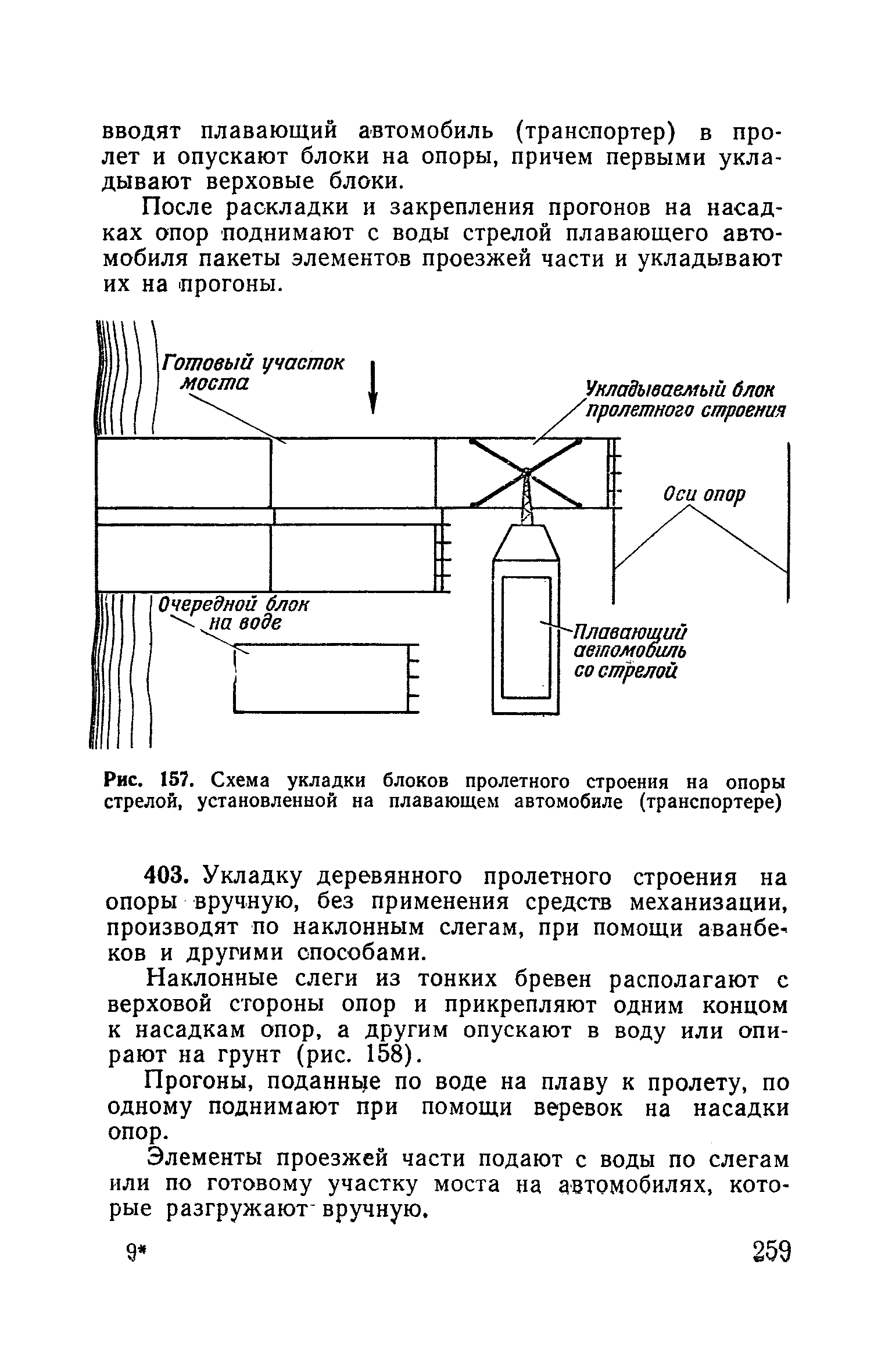 | Оглавление: | Глава 1. Общие положения Глава 2. Инженерная разведка района постройки моста Глава 3. Конструкции деревянных пролетных строений низководных мостов 1. Блочные пролетные строения Пролетные строения из колейных блоков Пролетные строения из блоков прогонов и щитов проезжей части а) Блоки простых прогонов б) Блоки сложных прогонов в) Блоки составных прогонов 2. Пролетные строения из отдельных элементов с простыми и сложными прогонами Проезжая часть Простые прогоны Сложные прогоны Глава 4. Конструкции металлических пролетных строений низководных мостов 1. Блочные пролетные строения Блоки из четырех прогонов Блоки из двух прогонов Проезжая часть 2. Пролетные строения из отдельных элементов Несущая конструкция с простыми прогонами и пакетами Несущая конструкция с составными прогонами Проезжая часть Глава 5. Промежуточные опоры низководных мостов 1. Свайные опоры 2. Рамные деревянные опоры 3. Клеточные опоры 4. Обеспечение продольной устойчивости моста Глава 6. Береговые опоры и сопряжение моста с берегами Глава 7. Изготовление и транспортировка мостовых конструкций 1. Общие положения 2. Изготовление конструкций низководных деревянных мостов Лесозаготовительные работы Лесопильные работы Работы по изготовлению деревянных мостовых конструкций Изготовление колейных блоков Сборка блоков прогонов Изготовление конструкций пролетного строения из блоков прогонов и щитов проезжей части Особенности сборки блоков сложных прогонов Изготовление составных прогонов на стальных цилиндрических нагелях и сборка блоков из двух прогонов Изготовление свай Изготовление насадок и лежней опор Изготовление элементов и сборка рамных опор Особенности изготовления элементов мостовых конструкций при постройке мостов из отдельных элементов 3. Изготовление конструкций металлических мостов Общие положения Изготовление металлических элементов Изготовление элементов проезжей части Изготовление блоков прогонов Изготовление пролетных строений из отдельных элементов 4. Транспортировка мостовых конструкций Глава 8. Постройка низководных мостов 1. Общие положения 2. Разбивка оси моста и осей опор 3. Средства механизации работ при постройке мостов 4. Глубина забивки свай в опорах 5. Организация в производство работ при постройке низководных мостов Общие положения Постройка мостов на свайных опорах при помощи комплекта мостостроительных средств КМС Постройка мостов на свайных опорах при помощи дизель-молотов ДМ-150 с одностреловыми копрами ОСК и дизель-молотов ДБ-45 с приспособлениями ПУС-1 для установки свай Постройка мостов на рамных опорах при помощи паромов с домкратами из комплекта КМС Устройство береговых опор и сопряжений моста с берегами Постройка мостов из отдельных элементов Особенности постройки двухпутных мостов на свайных опорах Особенности постройки мостов на свайных опорах с увеличенными пролетами Глава 9. Подводные мосты 1. Общие положения 2. Особенности конструкции промежуточных опор 3. Береговые опоры и сопряжение подводного моста с берегами 4. Особенности конструкции пролетных строений подводных мостов 5. Особенности постройки подводных мостов на свайных опорах 6. Особенности постройки подводных мостов на рамных опорах 7. Особенности постройки подводных мостов с металлическими прогонами Глава 10. Особенности к