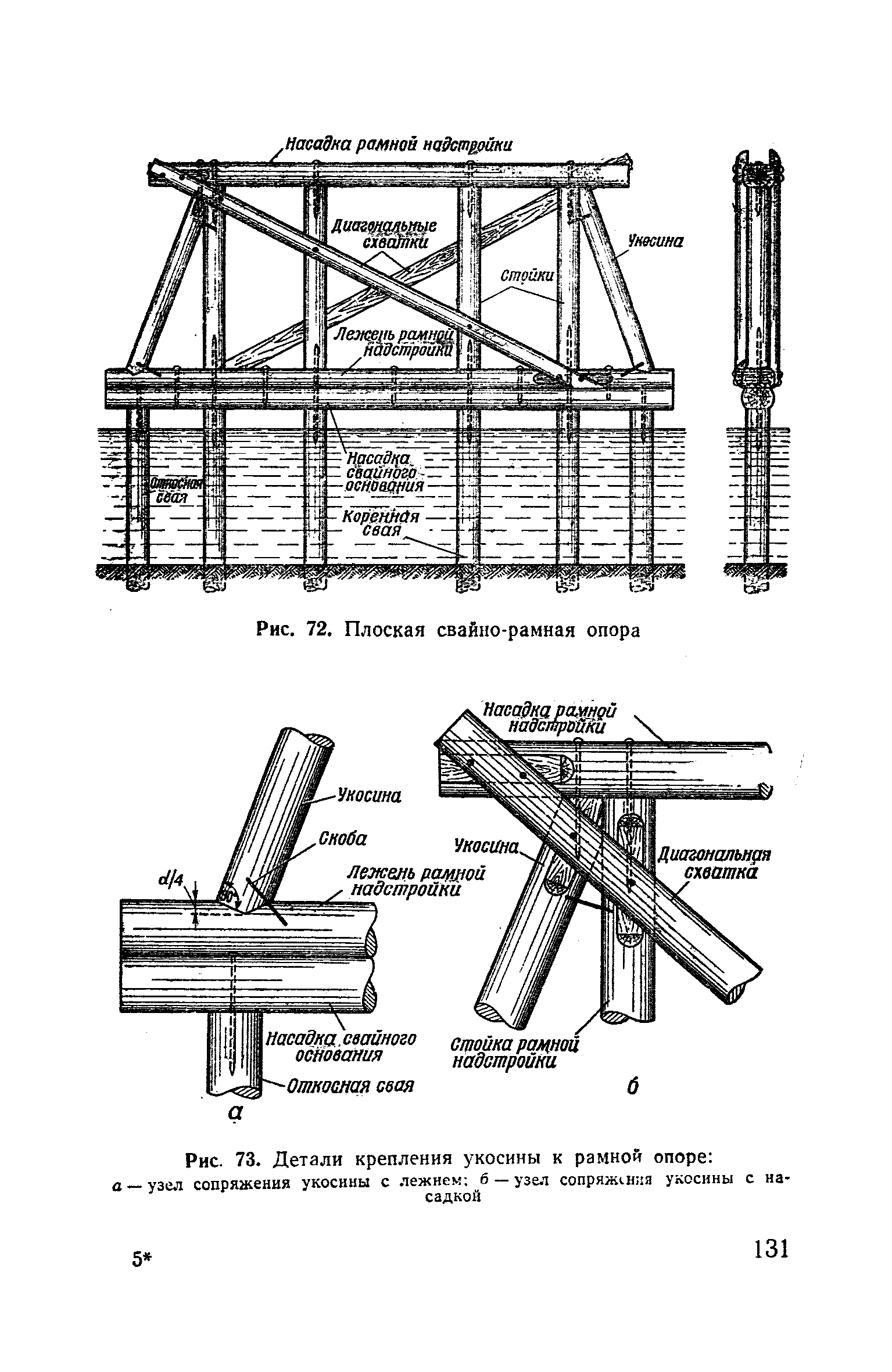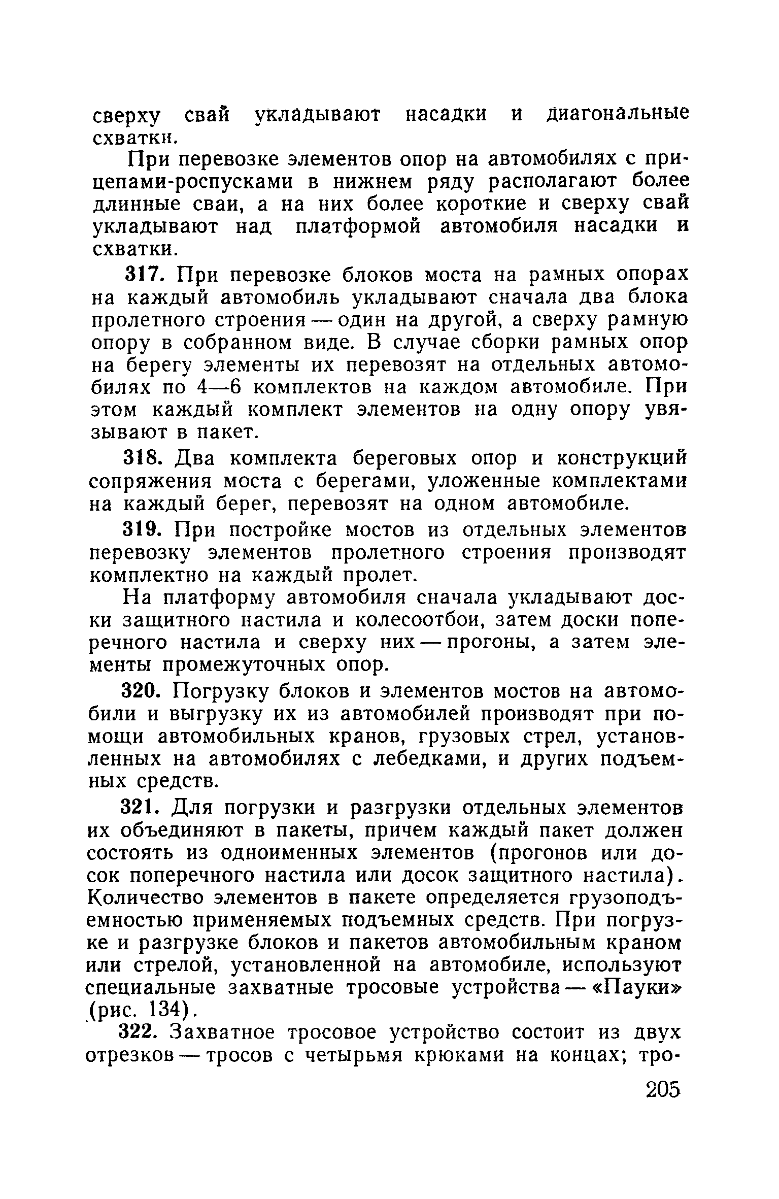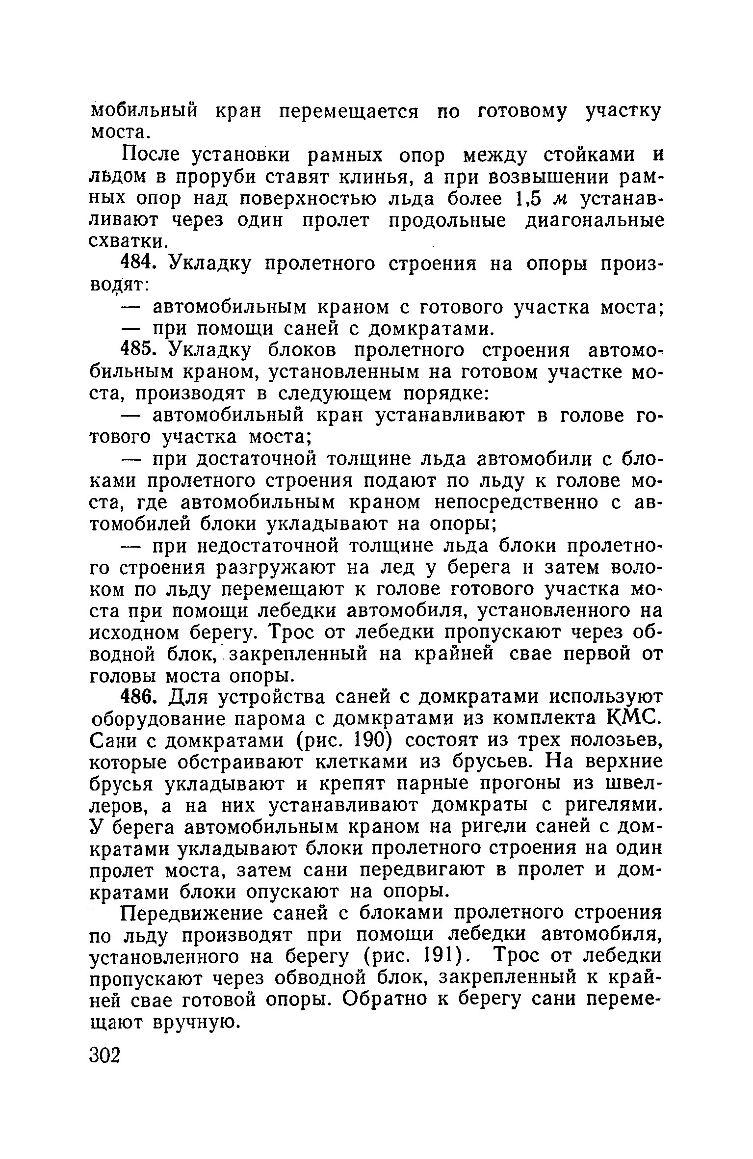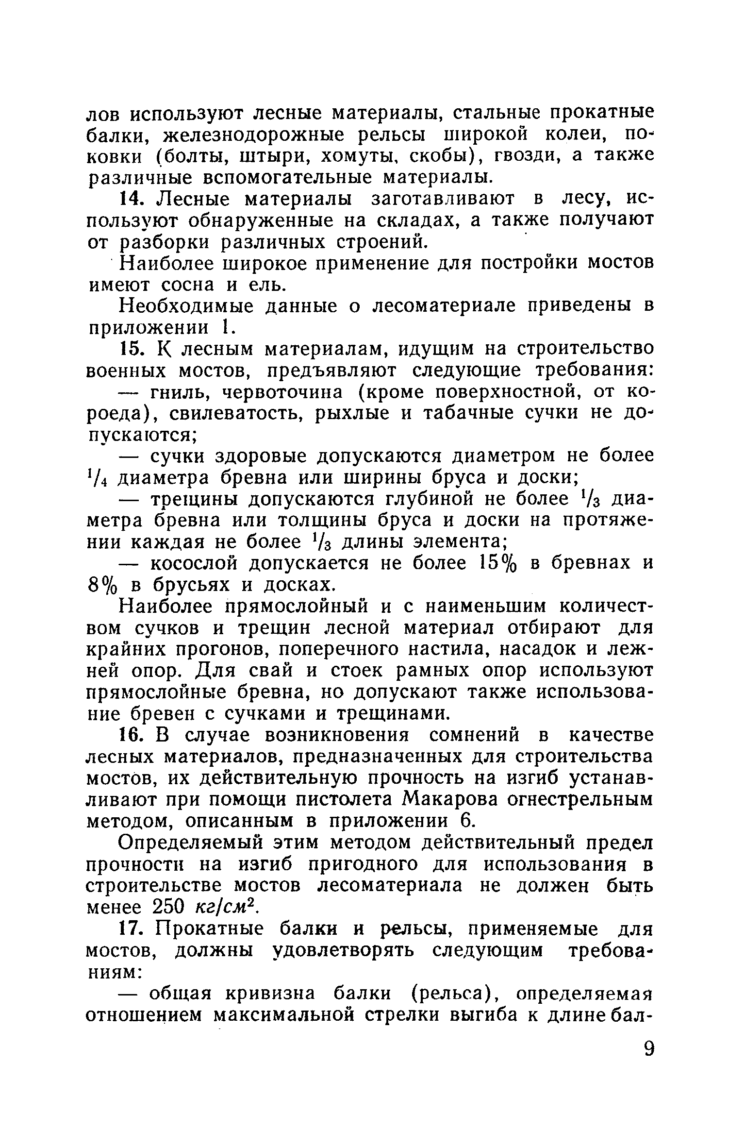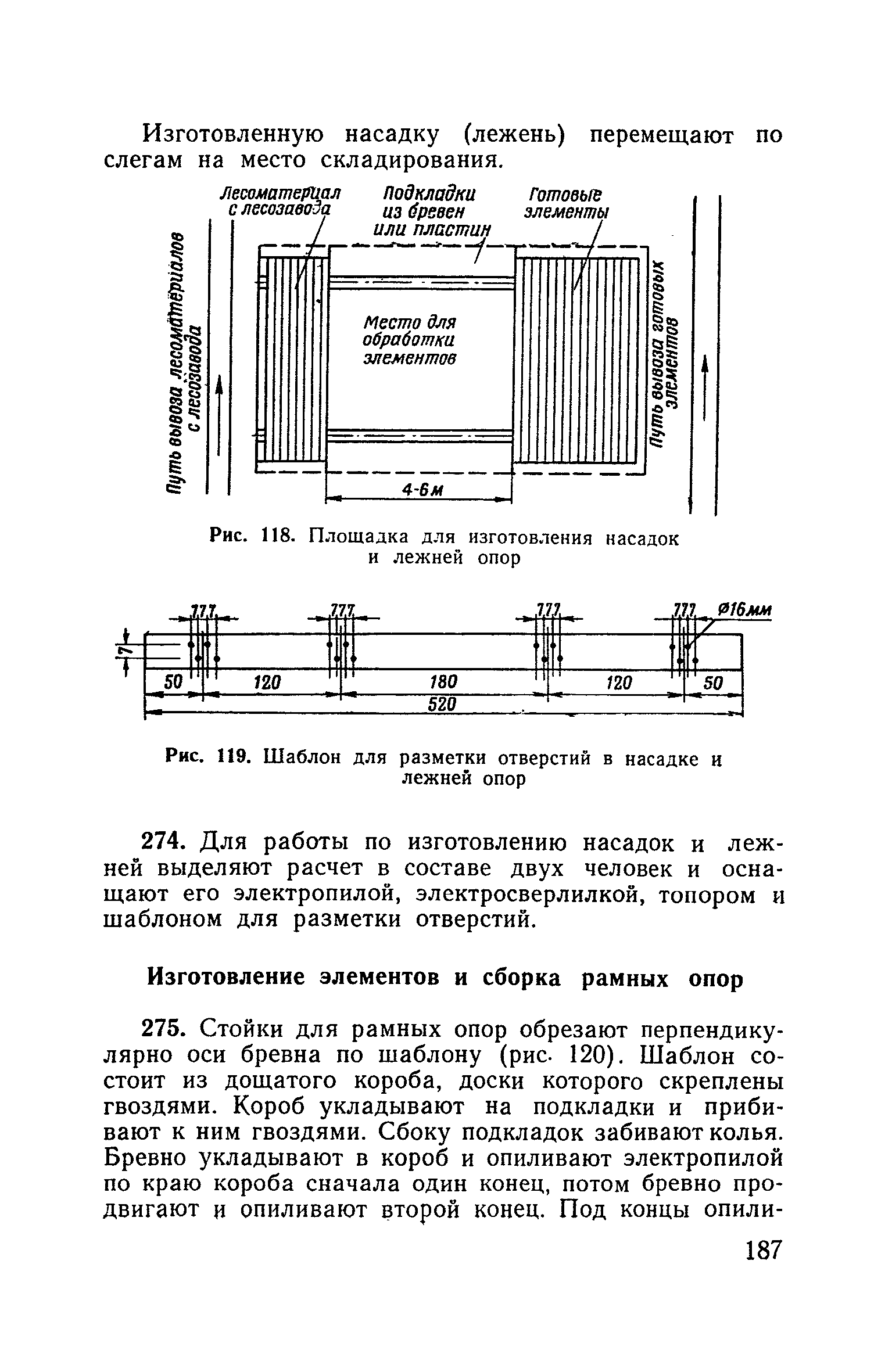 | Оглавление: | Глава 1. Общие положения Глава 2. Инженерная разведка района постройки моста Глава 3. Конструкции деревянных пролетных строений низководных мостов 1. Блочные пролетные строения Пролетные строения из колейных блоков Пролетные строения из блоков прогонов и щитов проезжей части а) Блоки простых прогонов б) Блоки сложных прогонов в) Блоки составных прогонов 2. Пролетные строения из отдельных элементов с простыми и сложными прогонами Проезжая часть Простые прогоны Сложные прогоны Глава 4. Конструкции металлических пролетных строений низководных мостов 1. Блочные пролетные строения Блоки из четырех прогонов Блоки из двух прогонов Проезжая часть 2. Пролетные строения из отдельных элементов Несущая конструкция с простыми прогонами и пакетами Несущая конструкция с составными прогонами Проезжая часть Глава 5. Промежуточные опоры низководных мостов 1. Свайные опоры 2. Рамные деревянные опоры 3. Клеточные опоры 4. Обеспечение продольной устойчивости моста Глава 6. Береговые опоры и сопряжение моста с берегами Глава 7. Изготовление и транспортировка мостовых конструкций 1. Общие положения 2. Изготовление конструкций низководных деревянных мостов Лесозаготовительные работы Лесопильные работы Работы по изготовлению деревянных мостовых конструкций Изготовление колейных блоков Сборка блоков прогонов Изготовление конструкций пролетного строения из блоков прогонов и щитов проезжей части Особенности сборки блоков сложных прогонов Изготовление составных прогонов на стальных цилиндрических нагелях и сборка блоков из двух прогонов Изготовление свай Изготовление насадок и лежней опор Изготовление элементов и сборка рамных опор Особенности изготовления элементов мостовых конструкций при постройке мостов из отдельных элементов 3. Изготовление конструкций металлических мостов Общие положения Изготовление металлических элементов Изготовление элементов проезжей части Изготовление блоков прогонов Изготовление пролетных строений из отдельных элементов 4. Транспортировка мостовых конструкций Глава 8. Постройка низководных мостов 1. Общие положения 2. Разбивка оси моста и осей опор 3. Средства механизации работ при постройке мостов 4. Глубина забивки свай в опорах 5. Организация в производство работ при постройке низководных мостов Общие положения Постройка мостов на свайных опорах при помощи комплекта мостостроительных средств КМС Постройка мостов на свайных опорах при помощи дизель-молотов ДМ-150 с одностреловыми копрами ОСК и дизель-молотов ДБ-45 с приспособлениями ПУС-1 для установки свай Постройка мостов на рамных опорах при помощи паромов с домкратами из комплекта КМС Устройство береговых опор и сопряжений моста с берегами Постройка мостов из отдельных элементов Особенности постройки двухпутных мостов на свайных опорах Особенности постройки мостов на свайных опорах с увеличенными пролетами Глава 9. Подводные мосты 1. Общие положения 2. Особенности конструкции промежуточных опор 3. Береговые опоры и сопряжение подводного моста с берегами 4. Особенности конструкции пролетных строений подводных мостов 5. Особенности постройки подводных мостов на свайных опорах 6. Особенности постройки подводных мостов на рамных опорах 7. Особенности постройки подводных мостов с металлическими прогонами Глава 10. Особенности к