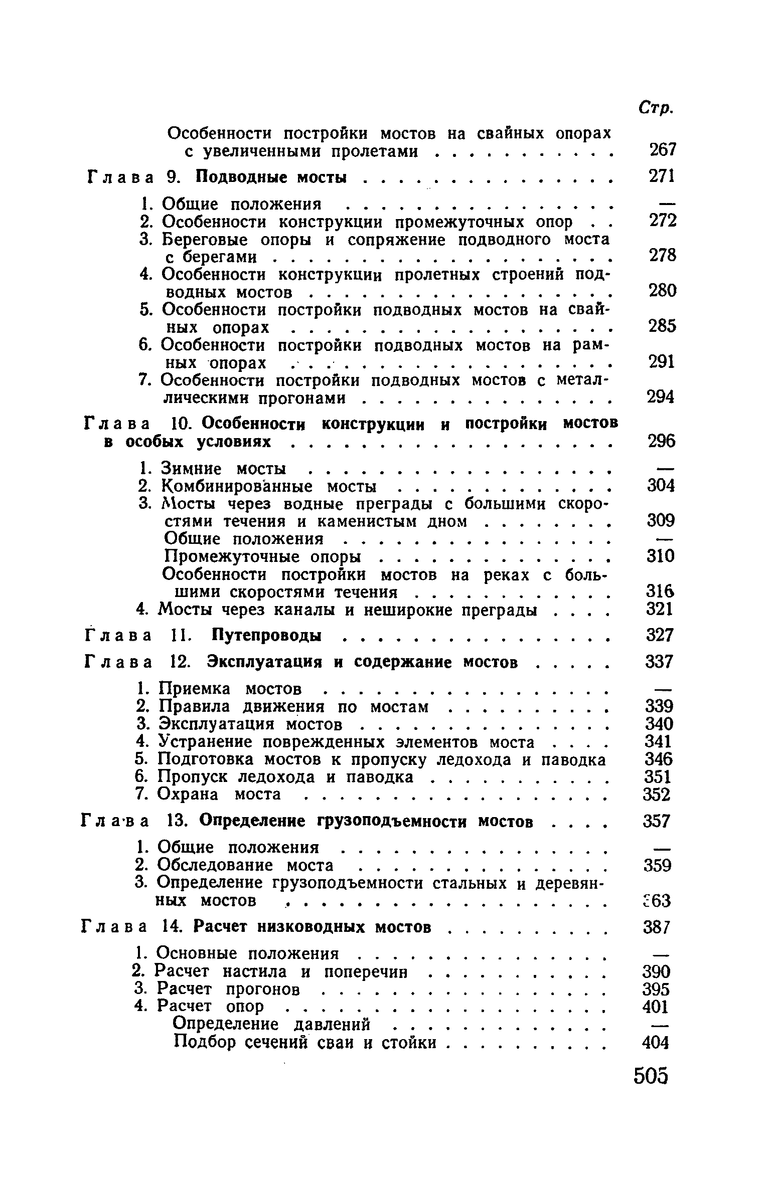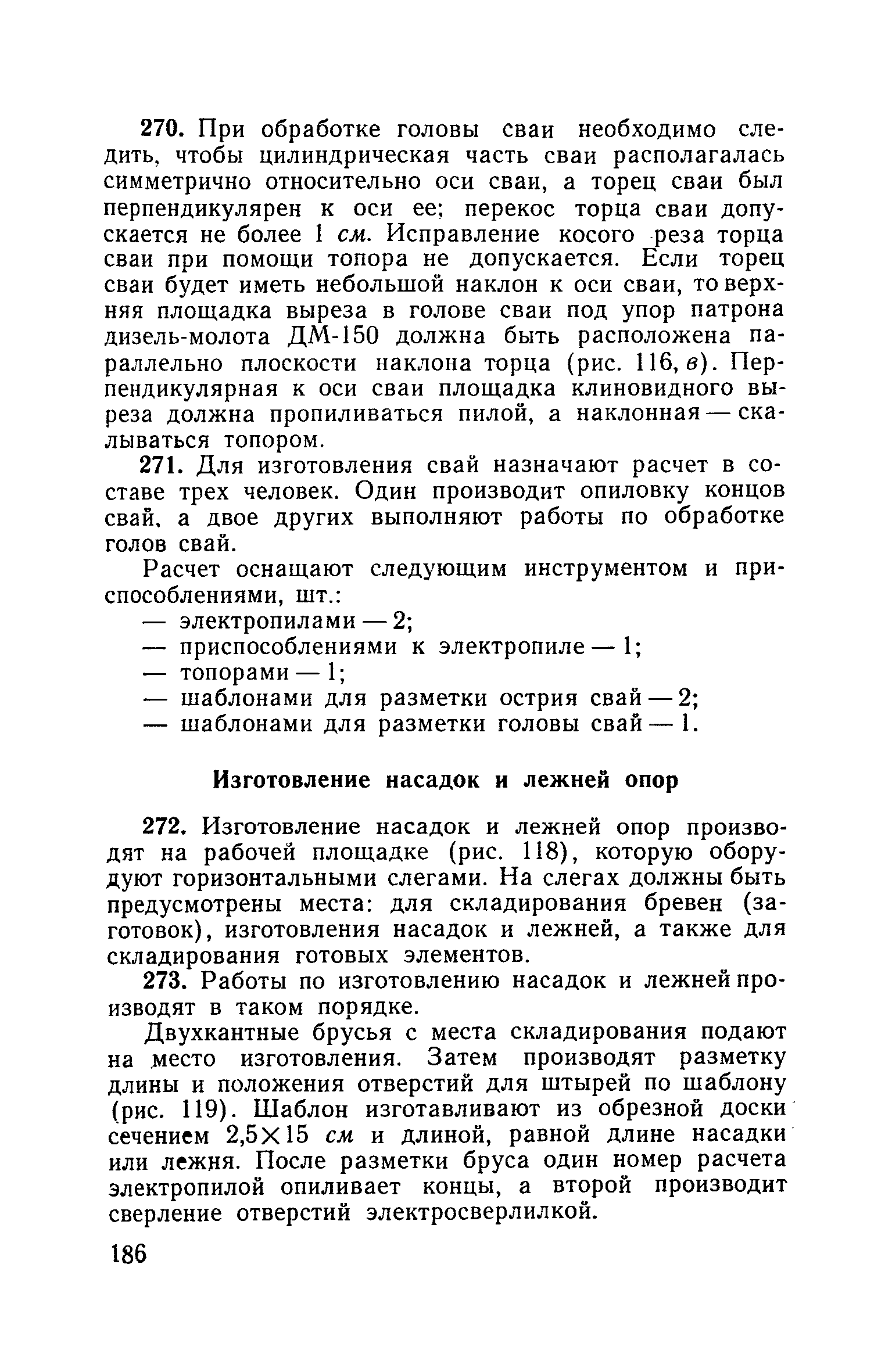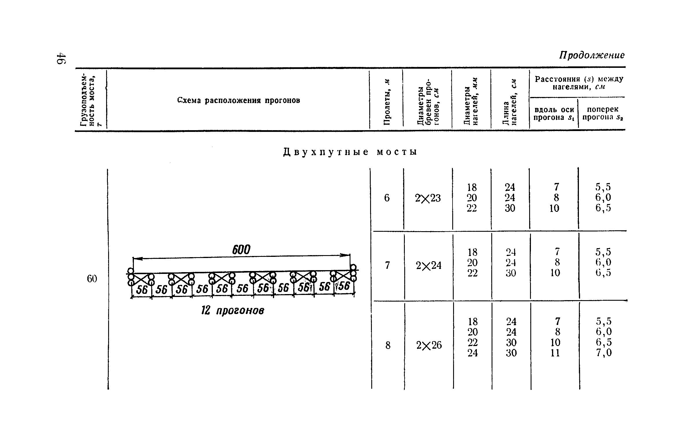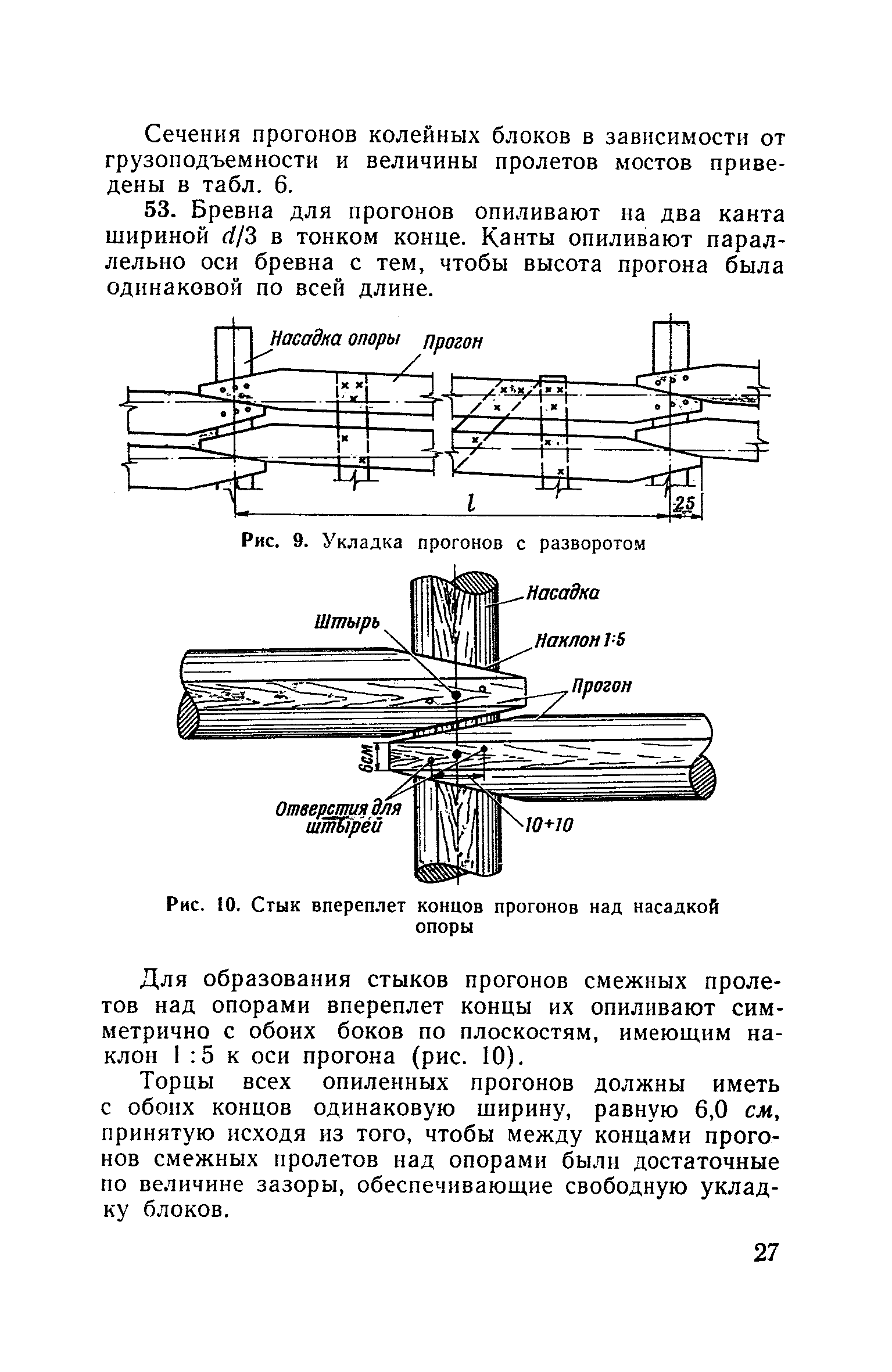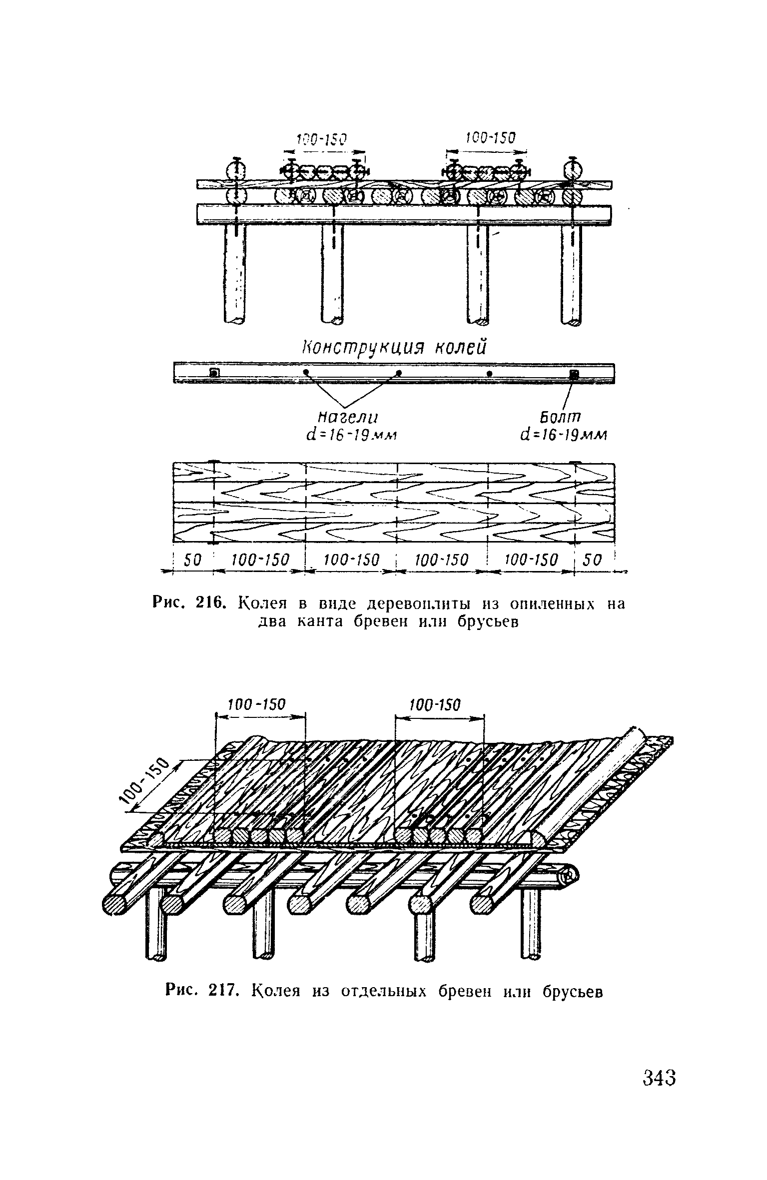 | Оглавление: | Глава 1. Общие положения Глава 2. Инженерная разведка района постройки моста Глава 3. Конструкции деревянных пролетных строений низководных мостов 1. Блочные пролетные строения Пролетные строения из колейных блоков Пролетные строения из блоков прогонов и щитов проезжей части а) Блоки простых прогонов б) Блоки сложных прогонов в) Блоки составных прогонов 2. Пролетные строения из отдельных элементов с простыми и сложными прогонами Проезжая часть Простые прогоны Сложные прогоны Глава 4. Конструкции металлических пролетных строений низководных мостов 1. Блочные пролетные строения Блоки из четырех прогонов Блоки из двух прогонов Проезжая часть 2. Пролетные строения из отдельных элементов Несущая конструкция с простыми прогонами и пакетами Несущая конструкция с составными прогонами Проезжая часть Глава 5. Промежуточные опоры низководных мостов 1. Свайные опоры 2. Рамные деревянные опоры 3. Клеточные опоры 4. Обеспечение продольной устойчивости моста Глава 6. Береговые опоры и сопряжение моста с берегами Глава 7. Изготовление и транспортировка мостовых конструкций 1. Общие положения 2. Изготовление конструкций низководных деревянных мостов Лесозаготовительные работы Лесопильные работы Работы по изготовлению деревянных мостовых конструкций Изготовление колейных блоков Сборка блоков прогонов Изготовление конструкций пролетного строения из блоков прогонов и щитов проезжей части Особенности сборки блоков сложных прогонов Изготовление составных прогонов на стальных цилиндрических нагелях и сборка блоков из двух прогонов Изготовление свай Изготовление насадок и лежней опор Изготовление элементов и сборка рамных опор Особенности изготовления элементов мостовых конструкций при постройке мостов из отдельных элементов 3. Изготовление конструкций металлических мостов Общие положения Изготовление металлических элементов Изготовление элементов проезжей части Изготовление блоков прогонов Изготовление пролетных строений из отдельных элементов 4. Транспортировка мостовых конструкций Глава 8. Постройка низководных мостов 1. Общие положения 2. Разбивка оси моста и осей опор 3. Средства механизации работ при постройке мостов 4. Глубина забивки свай в опорах 5. Организация в производство работ при постройке низководных мостов Общие положения Постройка мостов на свайных опорах при помощи комплекта мостостроительных средств КМС Постройка мостов на свайных опорах при помощи дизель-молотов ДМ-150 с одностреловыми копрами ОСК и дизель-молотов ДБ-45 с приспособлениями ПУС-1 для установки свай Постройка мостов на рамных опорах при помощи паромов с домкратами из комплекта КМС Устройство береговых опор и сопряжений моста с берегами Постройка мостов из отдельных элементов Особенности постройки двухпутных мостов на свайных опорах Особенности постройки мостов на свайных опорах с увеличенными пролетами Глава 9. Подводные мосты 1. Общие положения 2. Особенности конструкции промежуточных опор 3. Береговые опоры и сопряжение подводного моста с берегами 4. Особенности конструкции пролетных строений подводных мостов 5. Особенности постройки подводных мостов на свайных опорах 6. Особенности постройки подводных мостов на рамных опорах 7. Особенности постройки подводных мостов с металлическими прогонами Глава 10. Особенности к