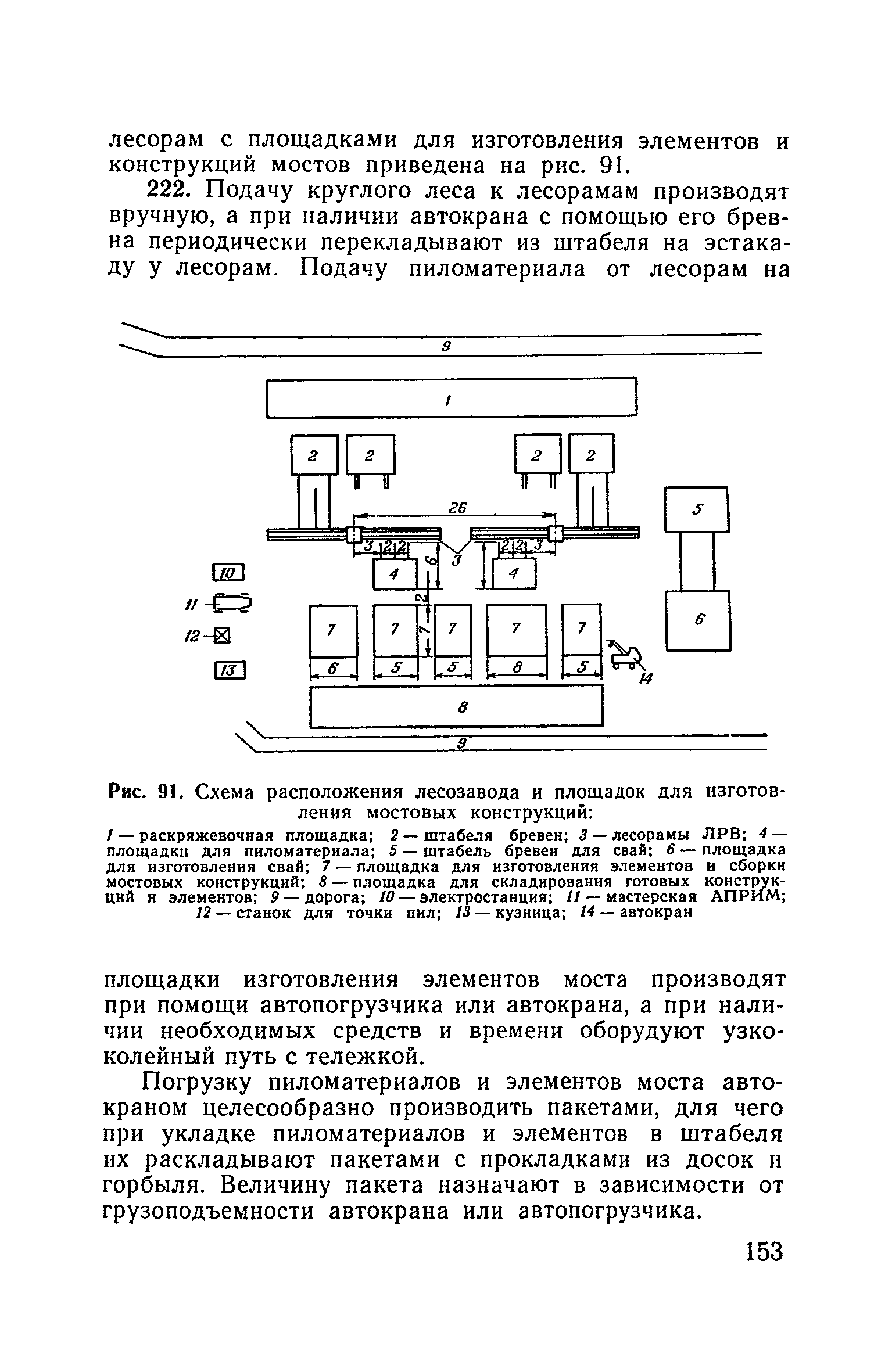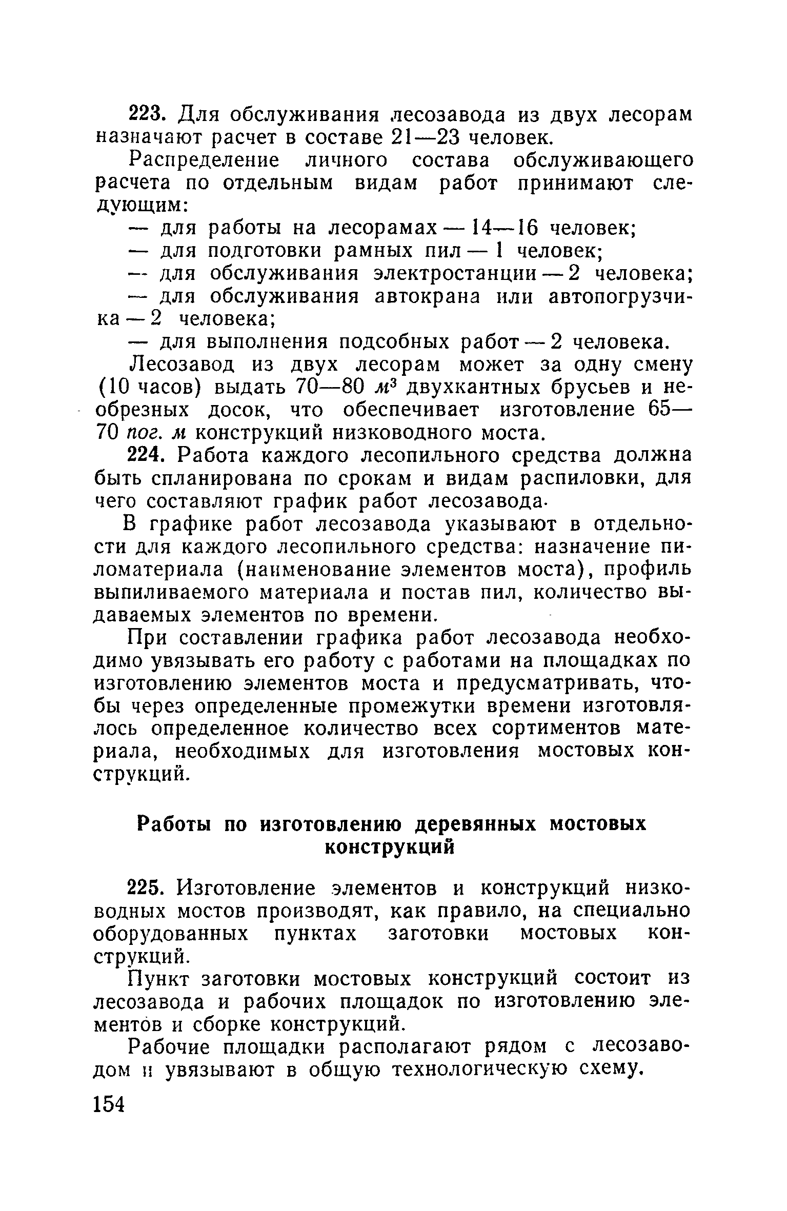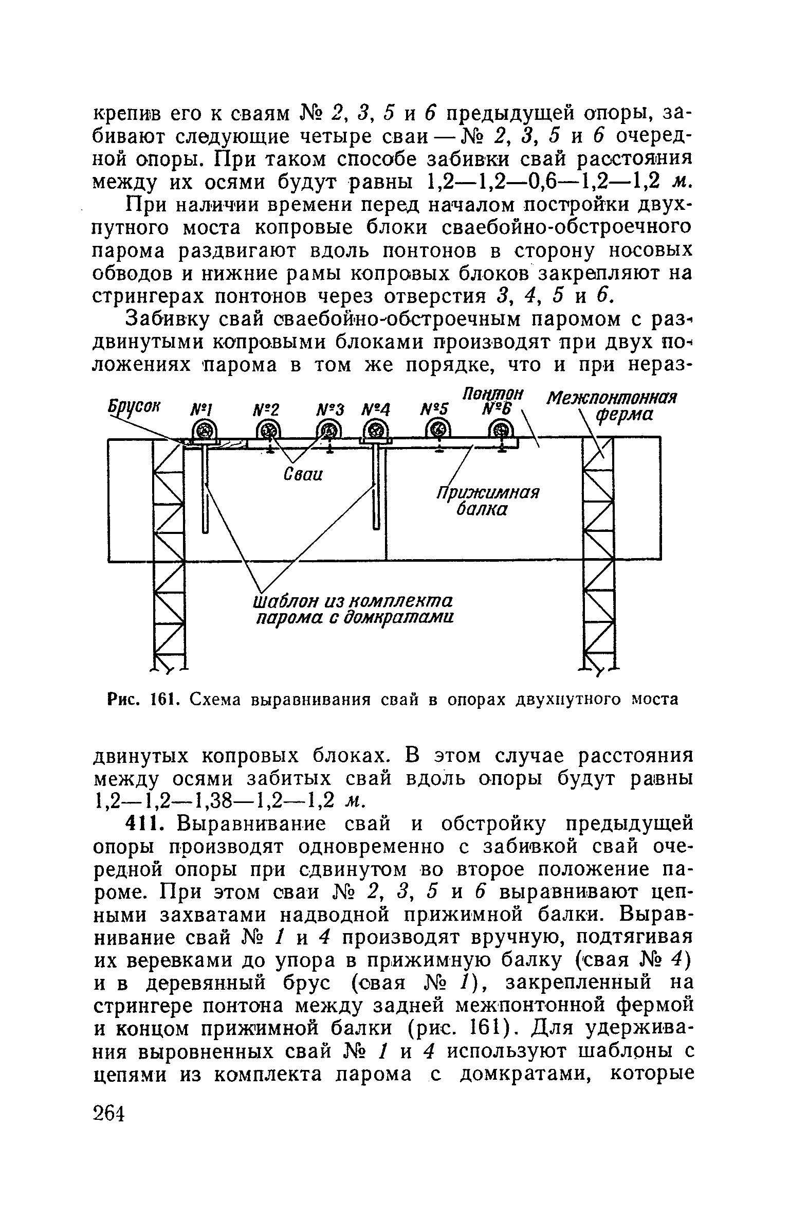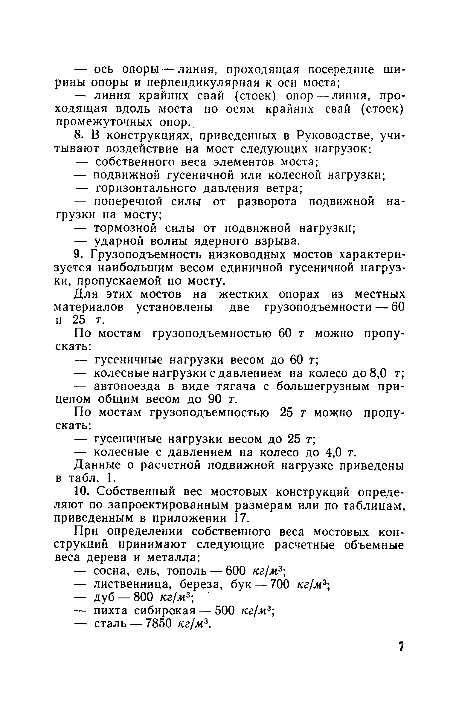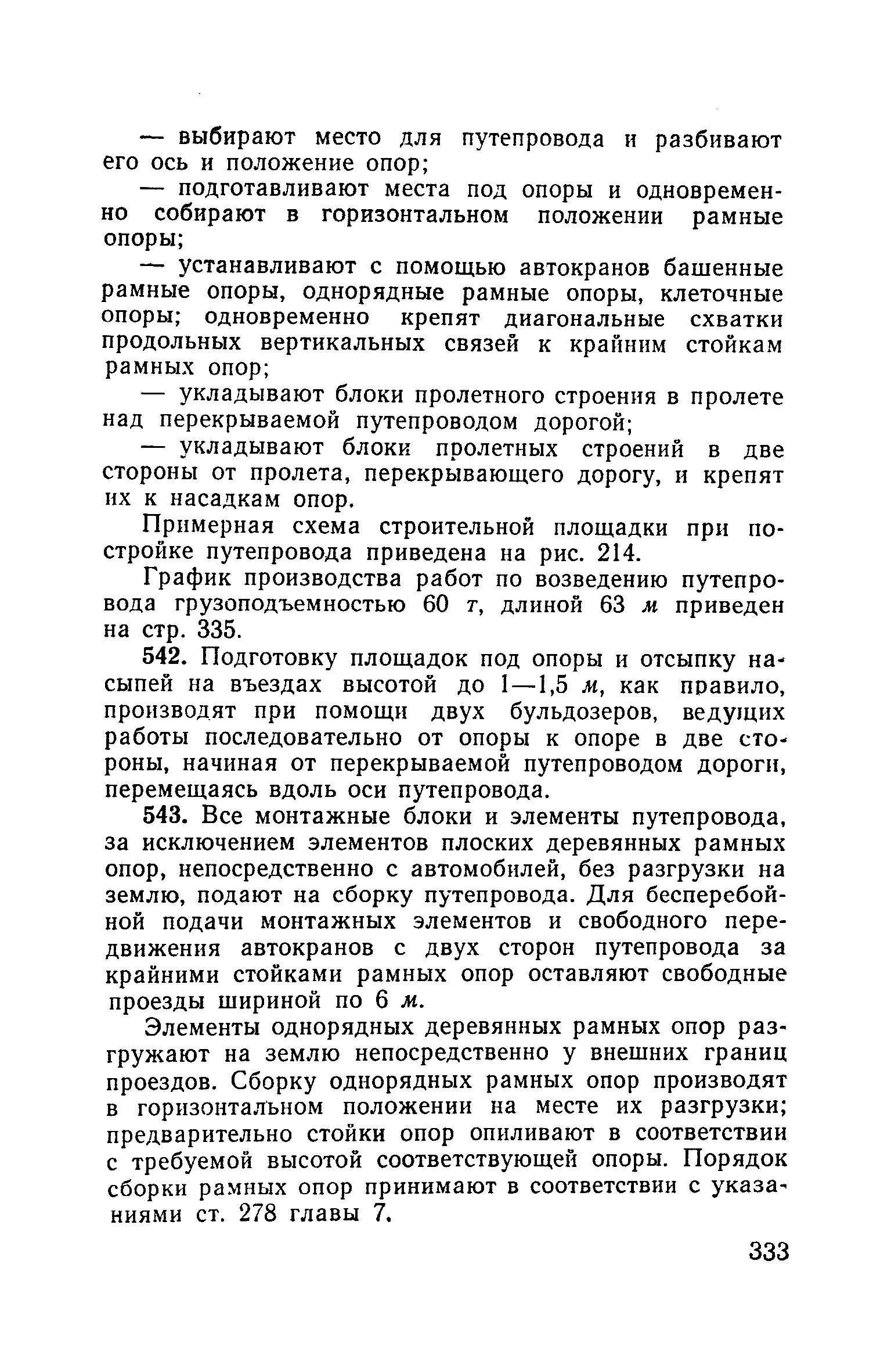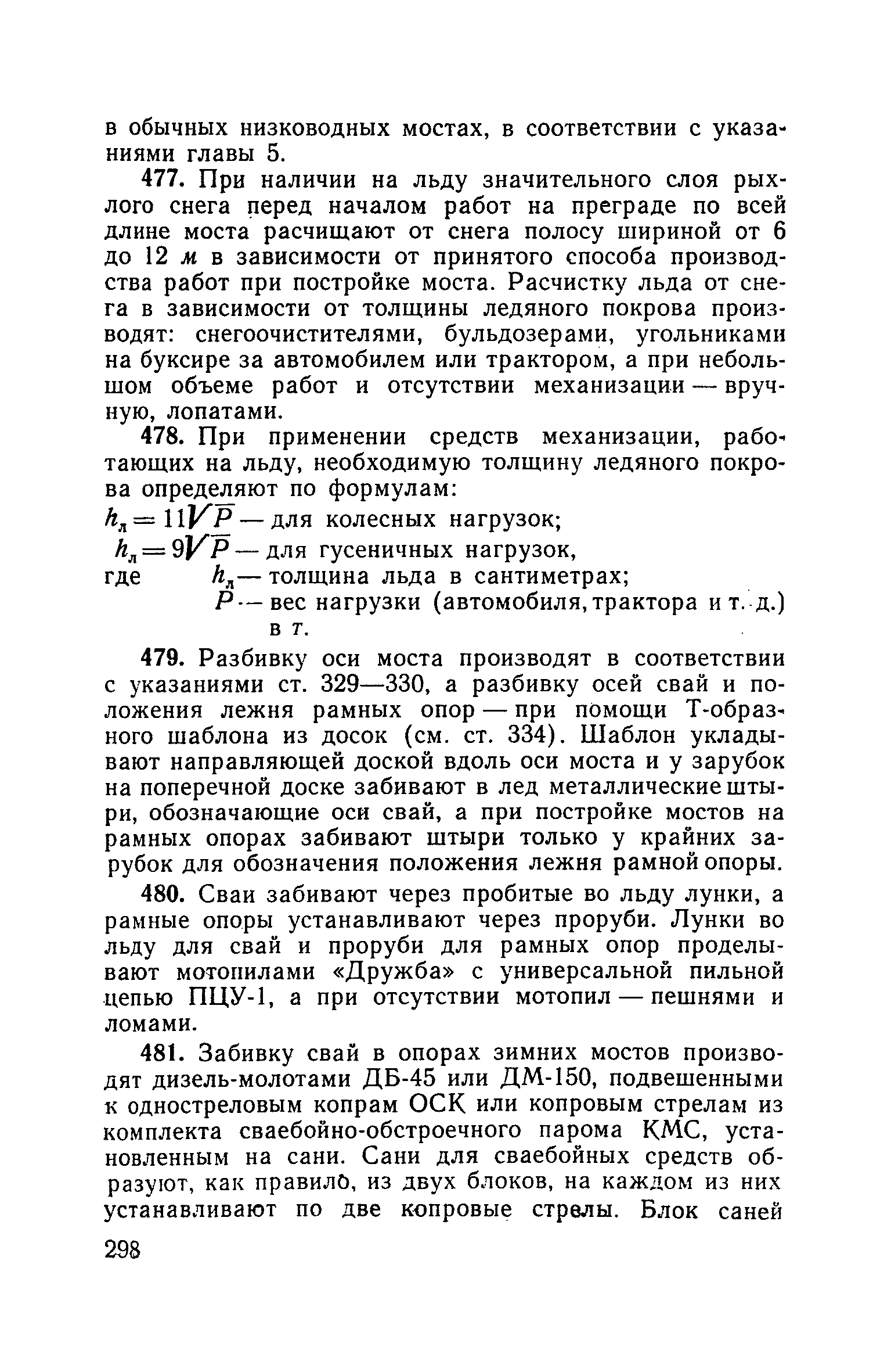 | Оглавление: | Глава 1. Общие положения Глава 2. Инженерная разведка района постройки моста Глава 3. Конструкции деревянных пролетных строений низководных мостов 1. Блочные пролетные строения Пролетные строения из колейных блоков Пролетные строения из блоков прогонов и щитов проезжей части а) Блоки простых прогонов б) Блоки сложных прогонов в) Блоки составных прогонов 2. Пролетные строения из отдельных элементов с простыми и сложными прогонами Проезжая часть Простые прогоны Сложные прогоны Глава 4. Конструкции металлических пролетных строений низководных мостов 1. Блочные пролетные строения Блоки из четырех прогонов Блоки из двух прогонов Проезжая часть 2. Пролетные строения из отдельных элементов Несущая конструкция с простыми прогонами и пакетами Несущая конструкция с составными прогонами Проезжая часть Глава 5. Промежуточные опоры низководных мостов 1. Свайные опоры 2. Рамные деревянные опоры 3. Клеточные опоры 4. Обеспечение продольной устойчивости моста Глава 6. Береговые опоры и сопряжение моста с берегами Глава 7. Изготовление и транспортировка мостовых конструкций 1. Общие положения 2. Изготовление конструкций низководных деревянных мостов Лесозаготовительные работы Лесопильные работы Работы по изготовлению деревянных мостовых конструкций Изготовление колейных блоков Сборка блоков прогонов Изготовление конструкций пролетного строения из блоков прогонов и щитов проезжей части Особенности сборки блоков сложных прогонов Изготовление составных прогонов на стальных цилиндрических нагелях и сборка блоков из двух прогонов Изготовление свай Изготовление насадок и лежней опор Изготовление элементов и сборка рамных опор Особенности изготовления элементов мостовых конструкций при постройке мостов из отдельных элементов 3. Изготовление конструкций металлических мостов Общие положения Изготовление металлических элементов Изготовление элементов проезжей части Изготовление блоков прогонов Изготовление пролетных строений из отдельных элементов 4. Транспортировка мостовых конструкций Глава 8. Постройка низководных мостов 1. Общие положения 2. Разбивка оси моста и осей опор 3. Средства механизации работ при постройке мостов 4. Глубина забивки свай в опорах 5. Организация в производство работ при постройке низководных мостов Общие положения Постройка мостов на свайных опорах при помощи комплекта мостостроительных средств КМС Постройка мостов на свайных опорах при помощи дизель-молотов ДМ-150 с одностреловыми копрами ОСК и дизель-молотов ДБ-45 с приспособлениями ПУС-1 для установки свай Постройка мостов на рамных опорах при помощи паромов с домкратами из комплекта КМС Устройство береговых опор и сопряжений моста с берегами Постройка мостов из отдельных элементов Особенности постройки двухпутных мостов на свайных опорах Особенности постройки мостов на свайных опорах с увеличенными пролетами Глава 9. Подводные мосты 1. Общие положения 2. Особенности конструкции промежуточных опор 3. Береговые опоры и сопряжение подводного моста с берегами 4. Особенности конструкции пролетных строений подводных мостов 5. Особенности постройки подводных мостов на свайных опорах 6. Особенности постройки подводных мостов на рамных опорах 7. Особенности постройки подводных мостов с металлическими прогонами Глава 10. Особенности к