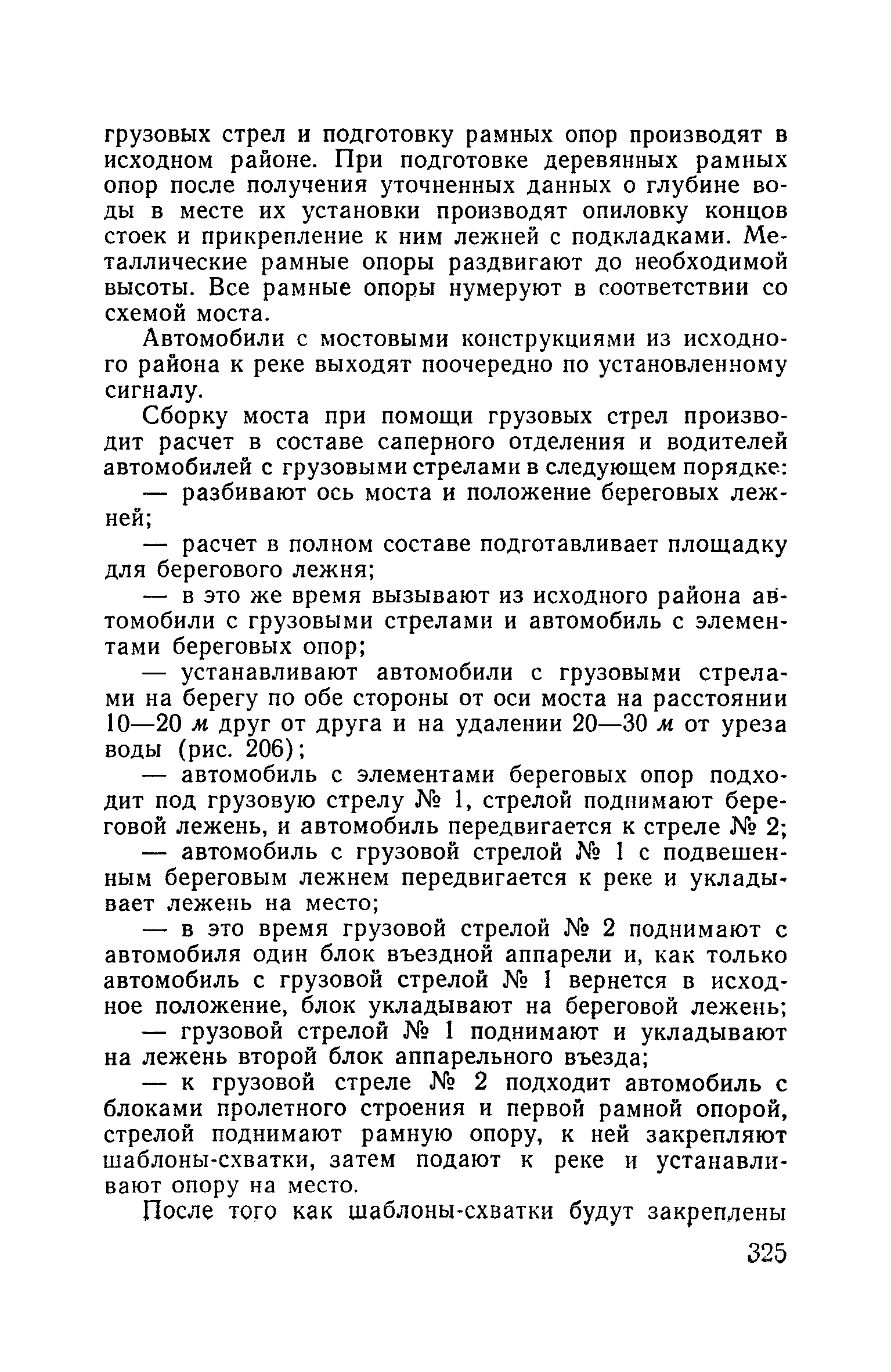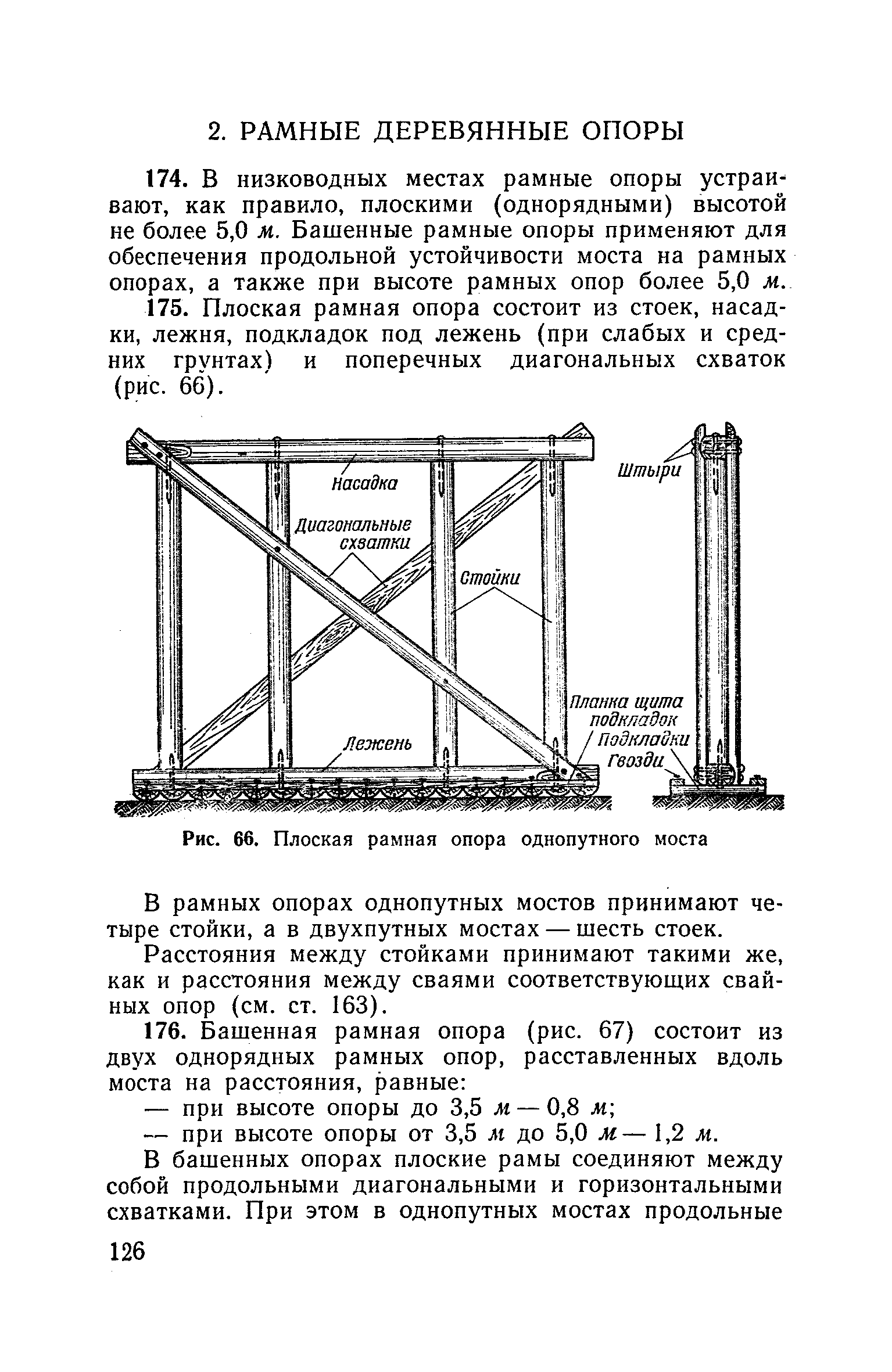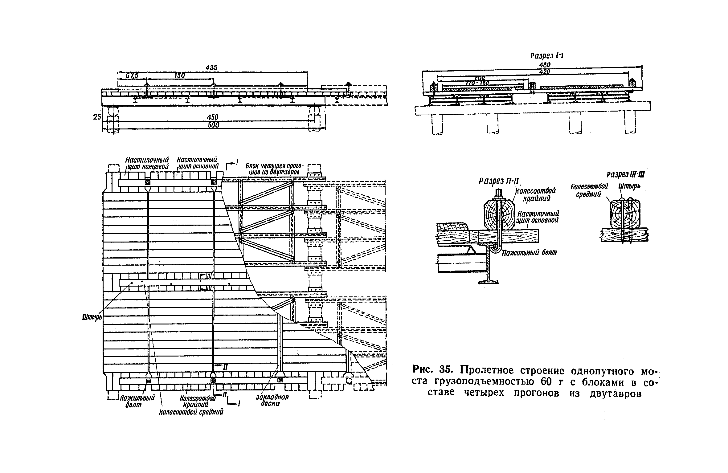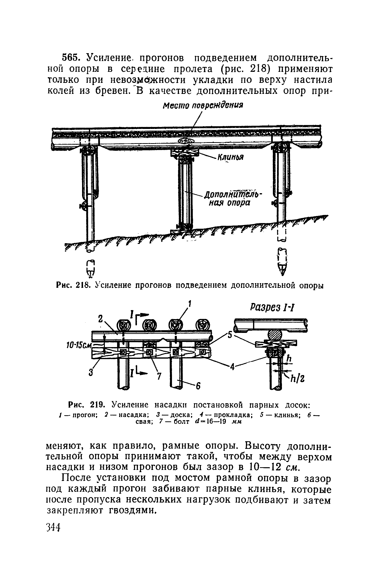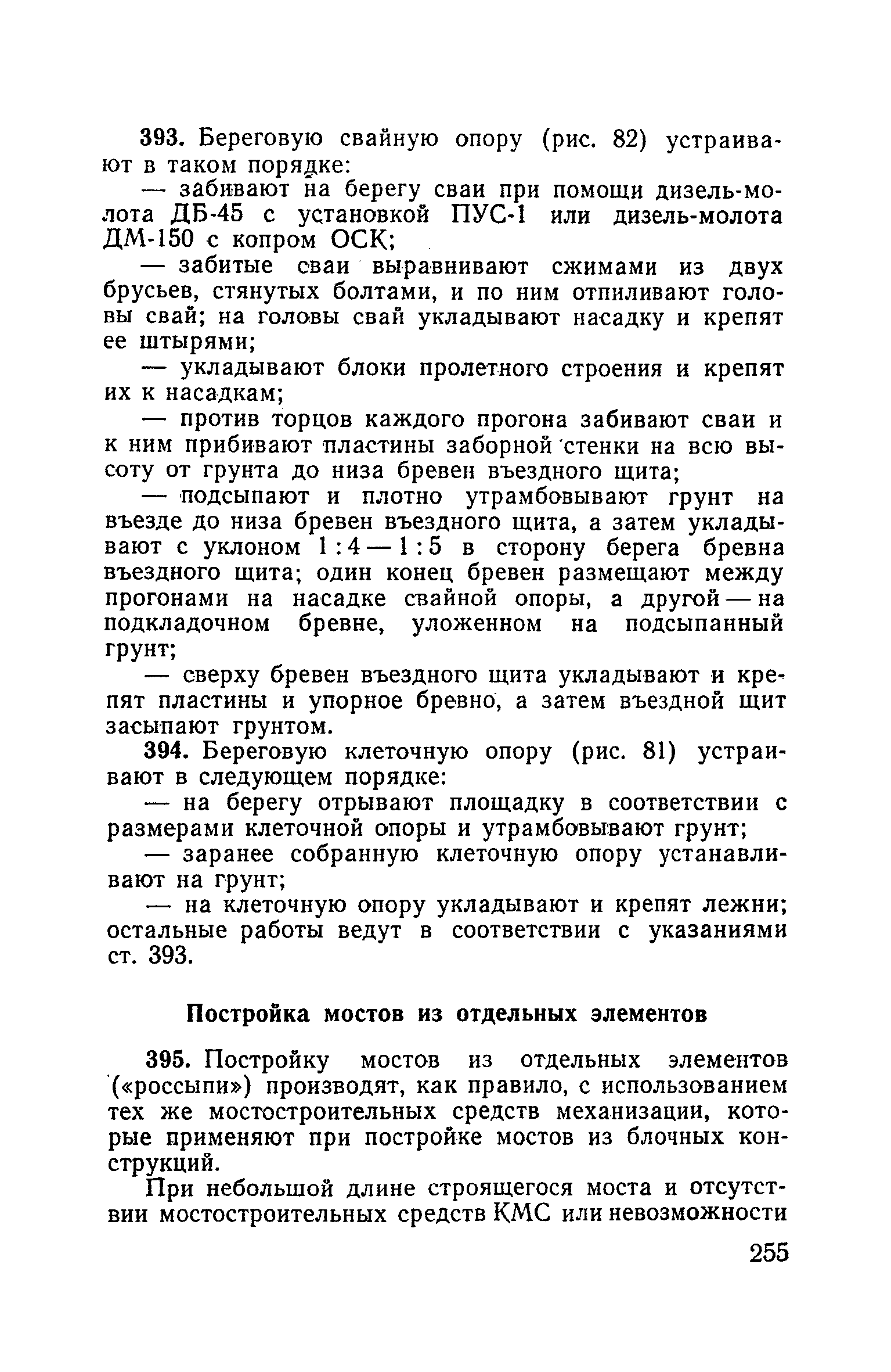 | Оглавление: | Глава 1. Общие положения Глава 2. Инженерная разведка района постройки моста Глава 3. Конструкции деревянных пролетных строений низководных мостов 1. Блочные пролетные строения Пролетные строения из колейных блоков Пролетные строения из блоков прогонов и щитов проезжей части а) Блоки простых прогонов б) Блоки сложных прогонов в) Блоки составных прогонов 2. Пролетные строения из отдельных элементов с простыми и сложными прогонами Проезжая часть Простые прогоны Сложные прогоны Глава 4. Конструкции металлических пролетных строений низководных мостов 1. Блочные пролетные строения Блоки из четырех прогонов Блоки из двух прогонов Проезжая часть 2. Пролетные строения из отдельных элементов Несущая конструкция с простыми прогонами и пакетами Несущая конструкция с составными прогонами Проезжая часть Глава 5. Промежуточные опоры низководных мостов 1. Свайные опоры 2. Рамные деревянные опоры 3. Клеточные опоры 4. Обеспечение продольной устойчивости моста Глава 6. Береговые опоры и сопряжение моста с берегами Глава 7. Изготовление и транспортировка мостовых конструкций 1. Общие положения 2. Изготовление конструкций низководных деревянных мостов Лесозаготовительные работы Лесопильные работы Работы по изготовлению деревянных мостовых конструкций Изготовление колейных блоков Сборка блоков прогонов Изготовление конструкций пролетного строения из блоков прогонов и щитов проезжей части Особенности сборки блоков сложных прогонов Изготовление составных прогонов на стальных цилиндрических нагелях и сборка блоков из двух прогонов Изготовление свай Изготовление насадок и лежней опор Изготовление элементов и сборка рамных опор Особенности изготовления элементов мостовых конструкций при постройке мостов из отдельных элементов 3. Изготовление конструкций металлических мостов Общие положения Изготовление металлических элементов Изготовление элементов проезжей части Изготовление блоков прогонов Изготовление пролетных строений из отдельных элементов 4. Транспортировка мостовых конструкций Глава 8. Постройка низководных мостов 1. Общие положения 2. Разбивка оси моста и осей опор 3. Средства механизации работ при постройке мостов 4. Глубина забивки свай в опорах 5. Организация в производство работ при постройке низководных мостов Общие положения Постройка мостов на свайных опорах при помощи комплекта мостостроительных средств КМС Постройка мостов на свайных опорах при помощи дизель-молотов ДМ-150 с одностреловыми копрами ОСК и дизель-молотов ДБ-45 с приспособлениями ПУС-1 для установки свай Постройка мостов на рамных опорах при помощи паромов с домкратами из комплекта КМС Устройство береговых опор и сопряжений моста с берегами Постройка мостов из отдельных элементов Особенности постройки двухпутных мостов на свайных опорах Особенности постройки мостов на свайных опорах с увеличенными пролетами Глава 9. Подводные мосты 1. Общие положения 2. Особенности конструкции промежуточных опор 3. Береговые опоры и сопряжение подводного моста с берегами 4. Особенности конструкции пролетных строений подводных мостов 5. Особенности постройки подводных мостов на свайных опорах 6. Особенности постройки подводных мостов на рамных опорах 7. Особенности постройки подводных мостов с металлическими прогонами Глава 10. Особенности к
