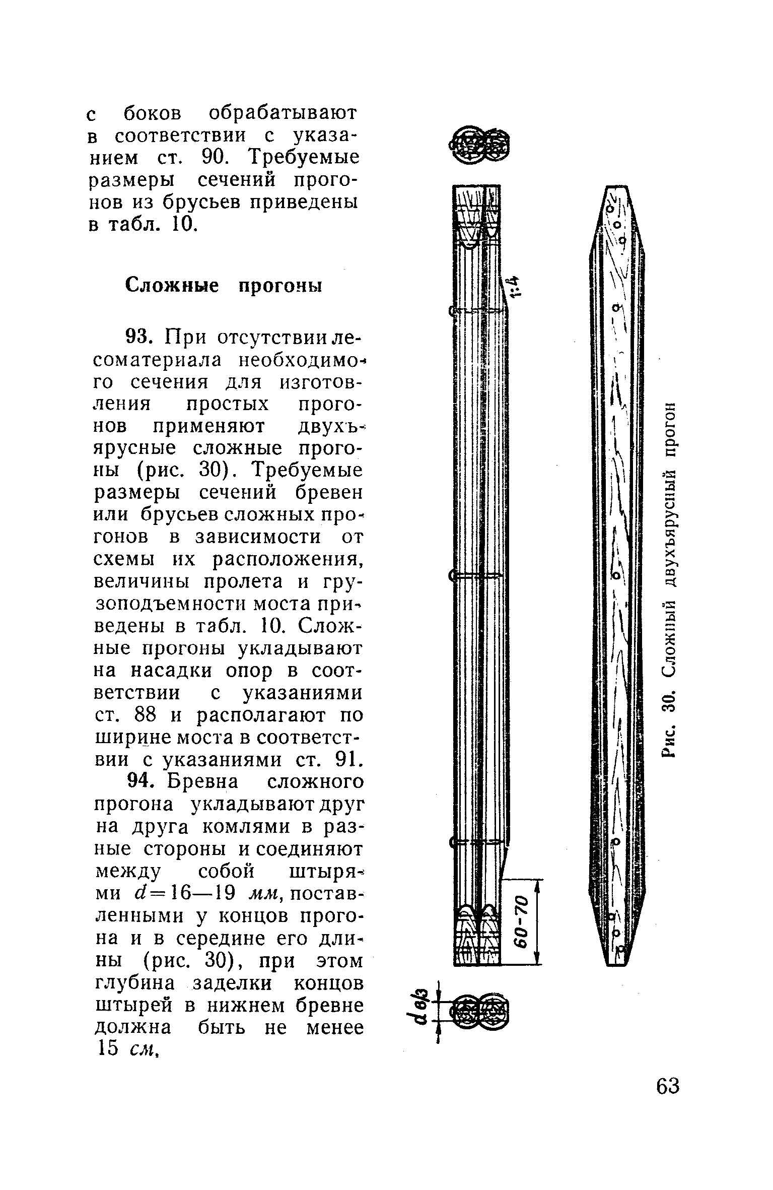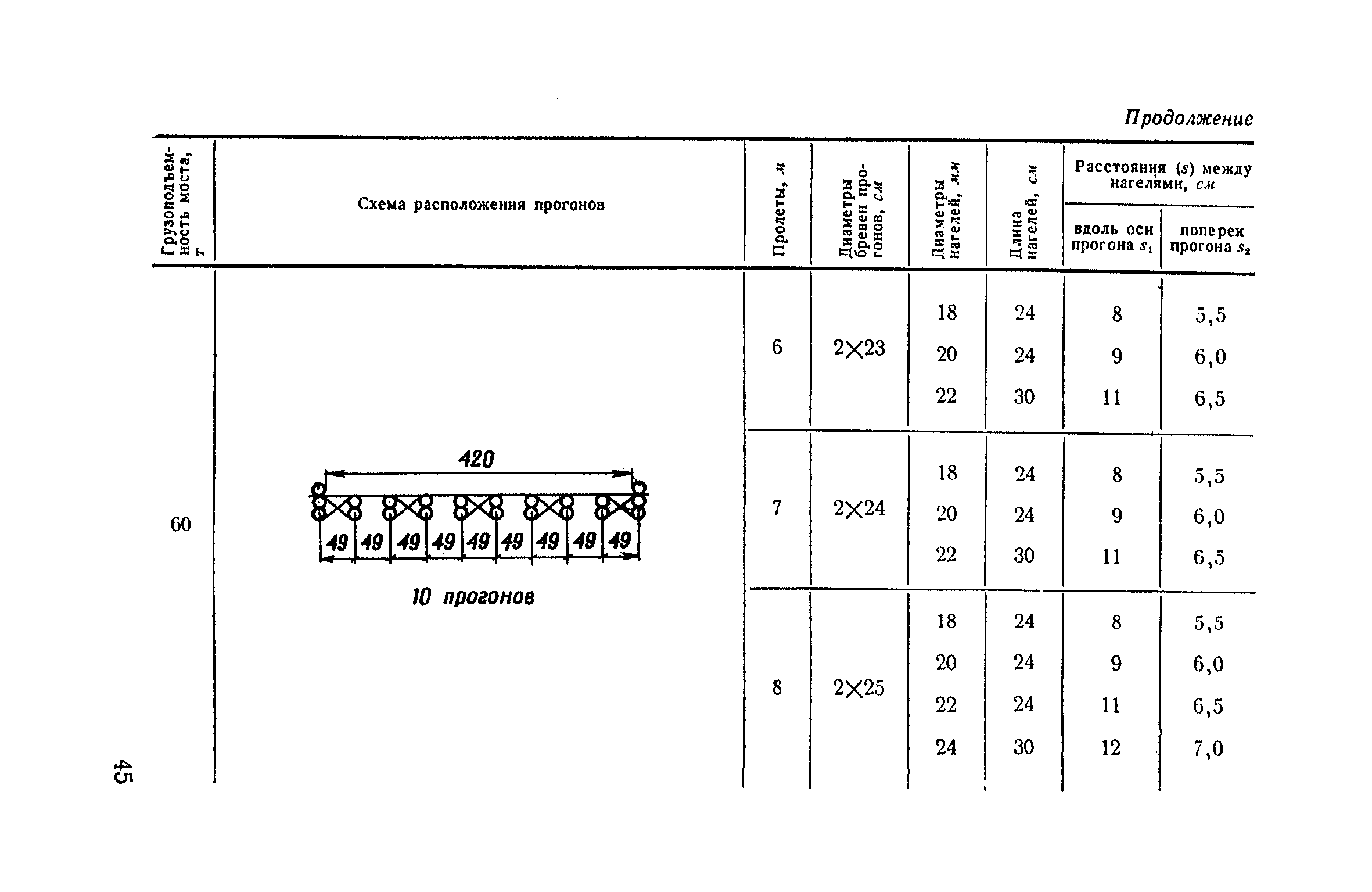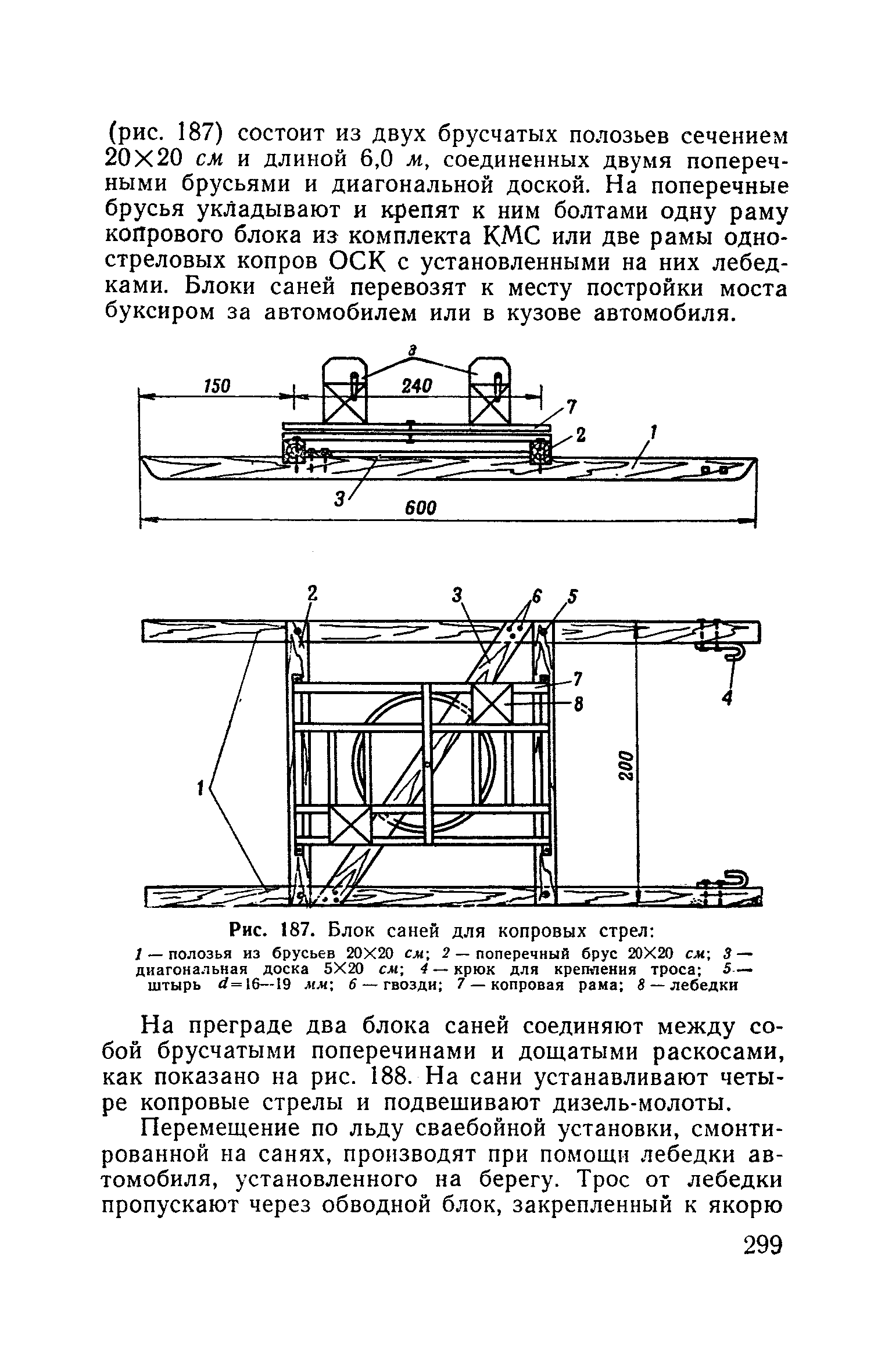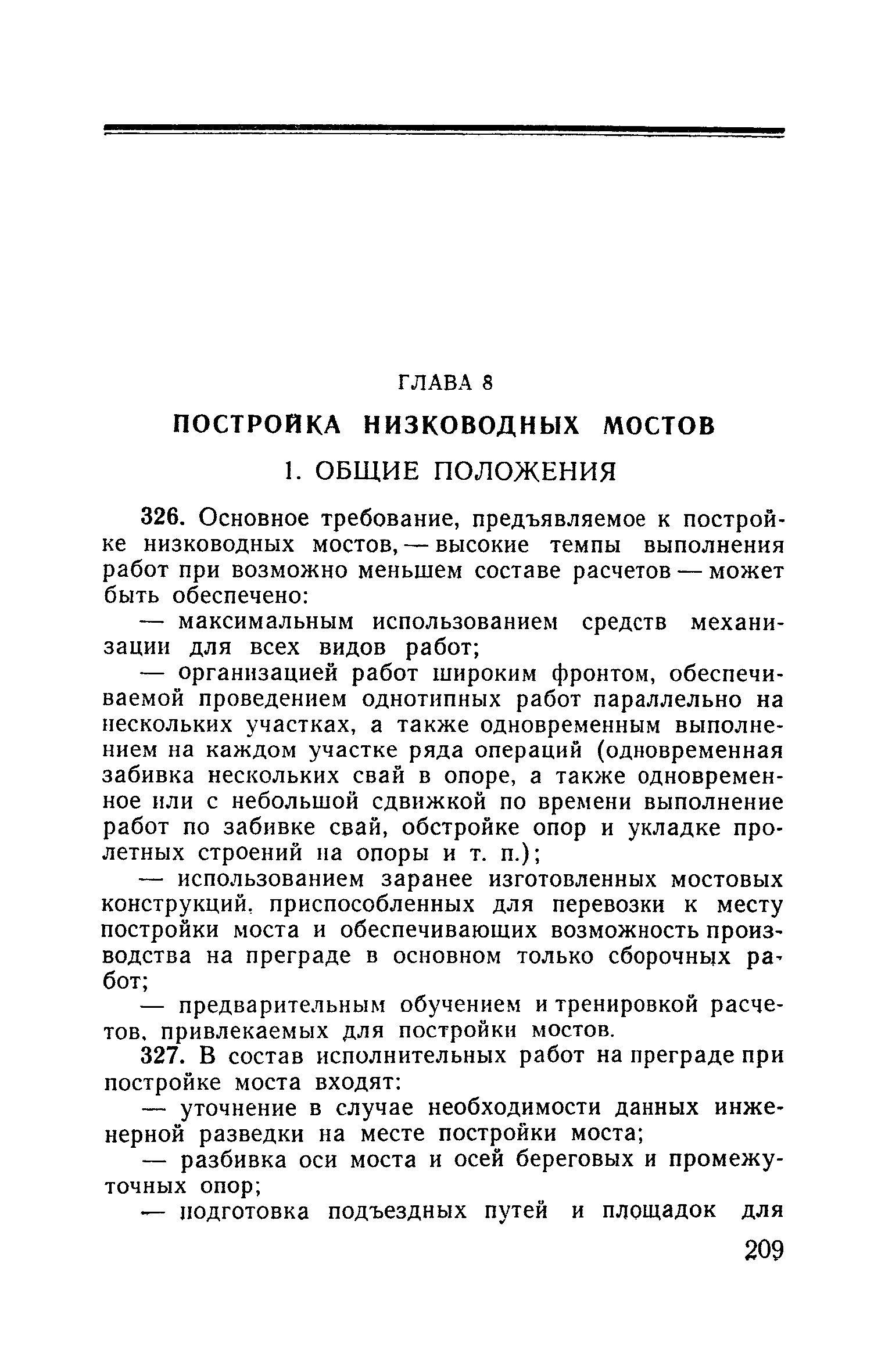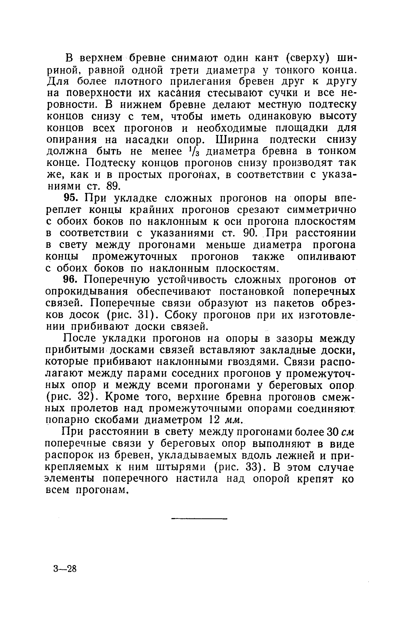 | Оглавление: | Глава 1. Общие положения Глава 2. Инженерная разведка района постройки моста Глава 3. Конструкции деревянных пролетных строений низководных мостов 1. Блочные пролетные строения Пролетные строения из колейных блоков Пролетные строения из блоков прогонов и щитов проезжей части а) Блоки простых прогонов б) Блоки сложных прогонов в) Блоки составных прогонов 2. Пролетные строения из отдельных элементов с простыми и сложными прогонами Проезжая часть Простые прогоны Сложные прогоны Глава 4. Конструкции металлических пролетных строений низководных мостов 1. Блочные пролетные строения Блоки из четырех прогонов Блоки из двух прогонов Проезжая часть 2. Пролетные строения из отдельных элементов Несущая конструкция с простыми прогонами и пакетами Несущая конструкция с составными прогонами Проезжая часть Глава 5. Промежуточные опоры низководных мостов 1. Свайные опоры 2. Рамные деревянные опоры 3. Клеточные опоры 4. Обеспечение продольной устойчивости моста Глава 6. Береговые опоры и сопряжение моста с берегами Глава 7. Изготовление и транспортировка мостовых конструкций 1. Общие положения 2. Изготовление конструкций низководных деревянных мостов Лесозаготовительные работы Лесопильные работы Работы по изготовлению деревянных мостовых конструкций Изготовление колейных блоков Сборка блоков прогонов Изготовление конструкций пролетного строения из блоков прогонов и щитов проезжей части Особенности сборки блоков сложных прогонов Изготовление составных прогонов на стальных цилиндрических нагелях и сборка блоков из двух прогонов Изготовление свай Изготовление насадок и лежней опор Изготовление элементов и сборка рамных опор Особенности изготовления элементов мостовых конструкций при постройке мостов из отдельных элементов 3. Изготовление конструкций металлических мостов Общие положения Изготовление металлических элементов Изготовление элементов проезжей части Изготовление блоков прогонов Изготовление пролетных строений из отдельных элементов 4. Транспортировка мостовых конструкций Глава 8. Постройка низководных мостов 1. Общие положения 2. Разбивка оси моста и осей опор 3. Средства механизации работ при постройке мостов 4. Глубина забивки свай в опорах 5. Организация в производство работ при постройке низководных мостов Общие положения Постройка мостов на свайных опорах при помощи комплекта мостостроительных средств КМС Постройка мостов на свайных опорах при помощи дизель-молотов ДМ-150 с одностреловыми копрами ОСК и дизель-молотов ДБ-45 с приспособлениями ПУС-1 для установки свай Постройка мостов на рамных опорах при помощи паромов с домкратами из комплекта КМС Устройство береговых опор и сопряжений моста с берегами Постройка мостов из отдельных элементов Особенности постройки двухпутных мостов на свайных опорах Особенности постройки мостов на свайных опорах с увеличенными пролетами Глава 9. Подводные мосты 1. Общие положения 2. Особенности конструкции промежуточных опор 3. Береговые опоры и сопряжение подводного моста с берегами 4. Особенности конструкции пролетных строений подводных мостов 5. Особенности постройки подводных мостов на свайных опорах 6. Особенности постройки подводных мостов на рамных опорах 7. Особенности постройки подводных мостов с металлическими прогонами Глава 10. Особенности к