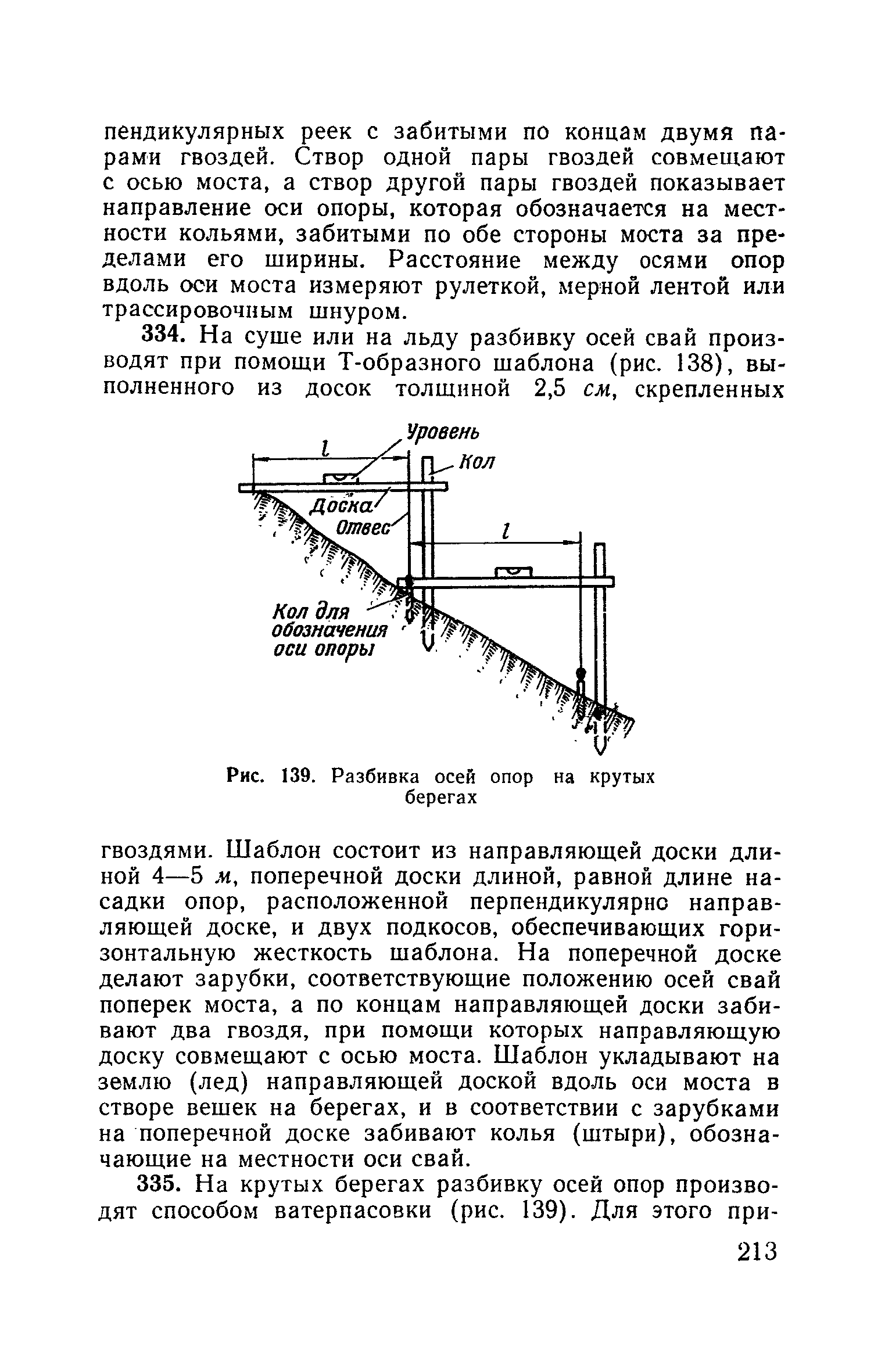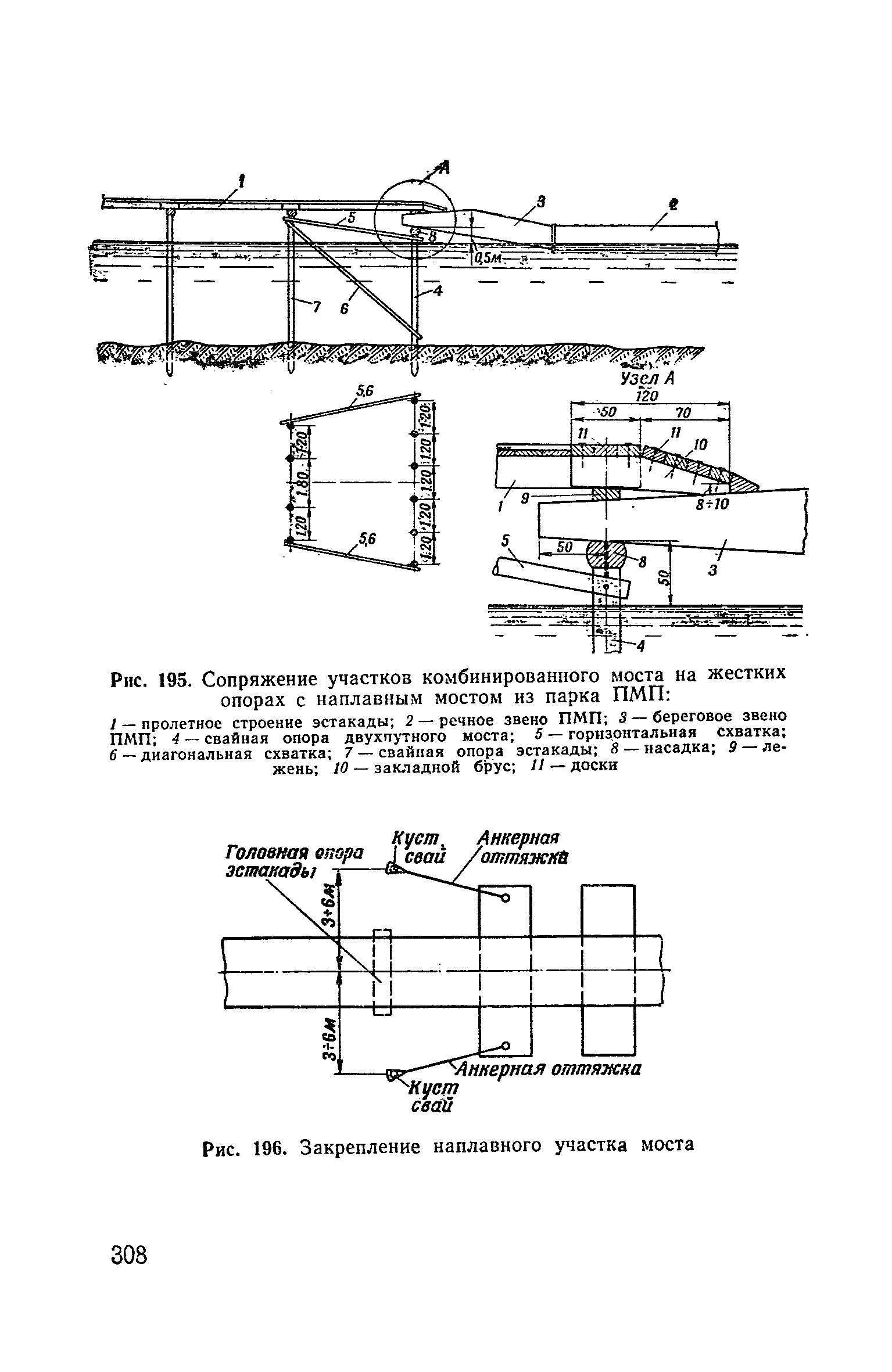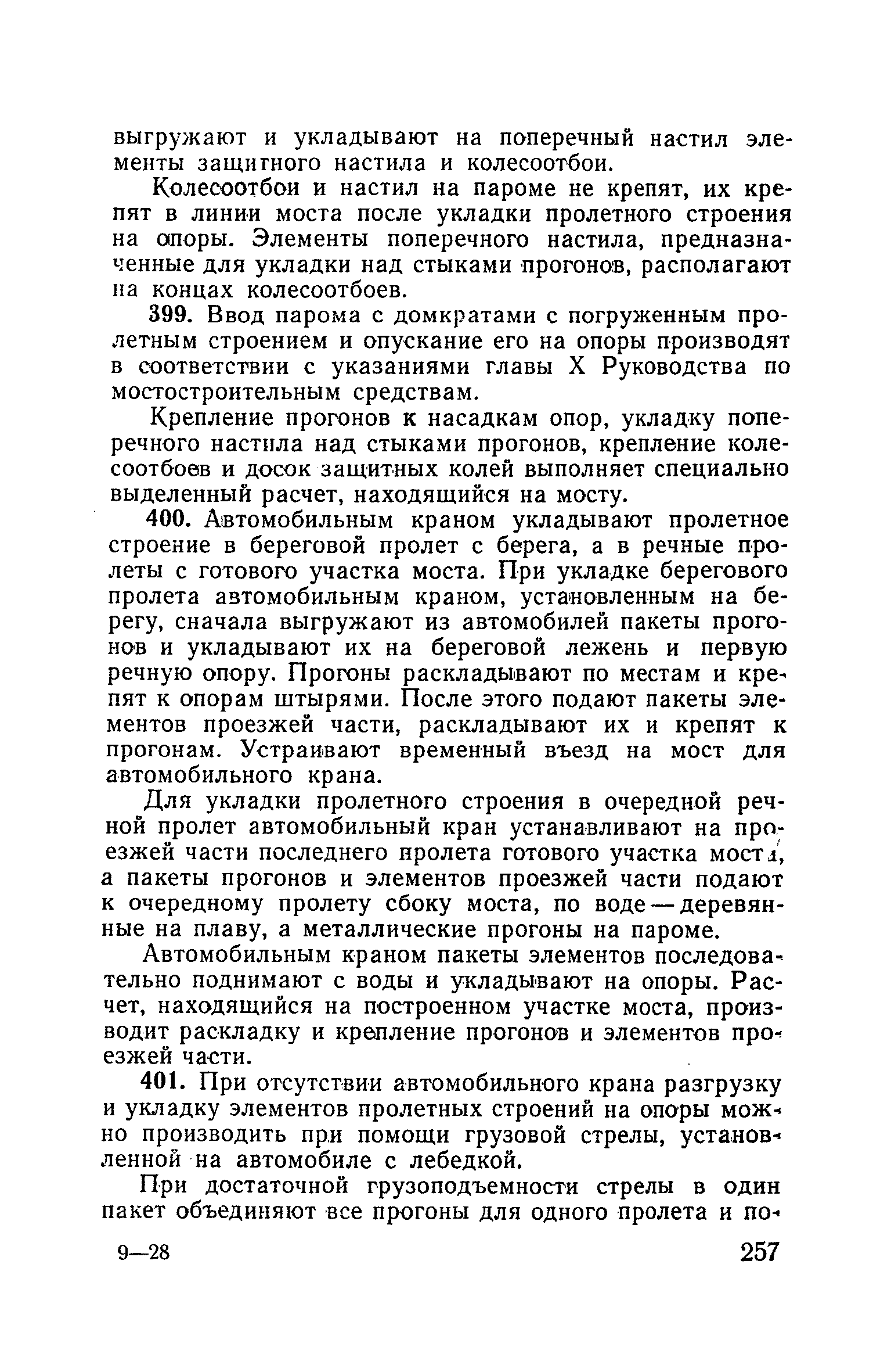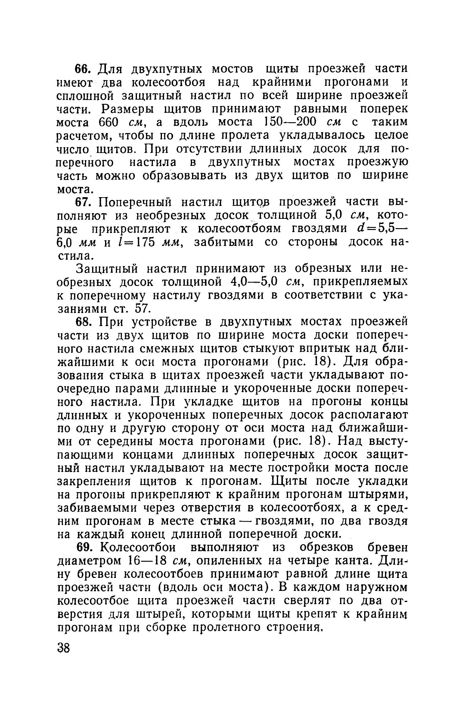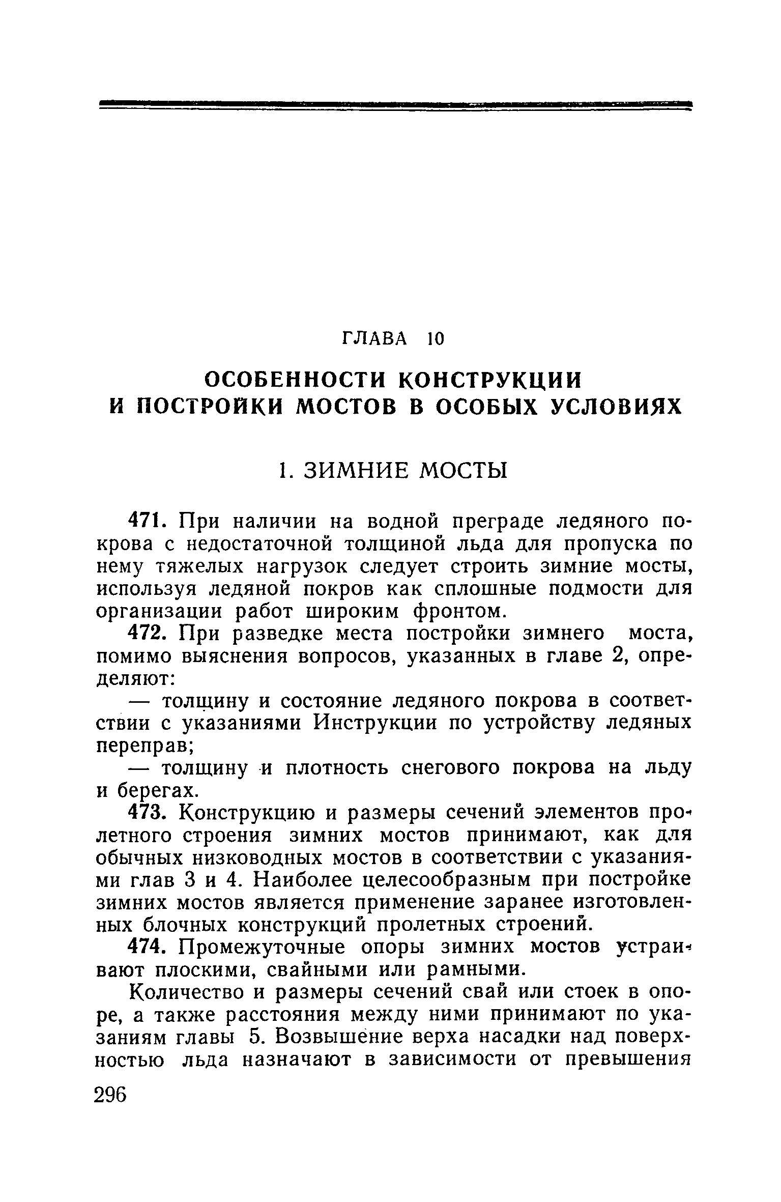 | Оглавление: | Глава 1. Общие положения Глава 2. Инженерная разведка района постройки моста Глава 3. Конструкции деревянных пролетных строений низководных мостов 1. Блочные пролетные строения Пролетные строения из колейных блоков Пролетные строения из блоков прогонов и щитов проезжей части а) Блоки простых прогонов б) Блоки сложных прогонов в) Блоки составных прогонов 2. Пролетные строения из отдельных элементов с простыми и сложными прогонами Проезжая часть Простые прогоны Сложные прогоны Глава 4. Конструкции металлических пролетных строений низководных мостов 1. Блочные пролетные строения Блоки из четырех прогонов Блоки из двух прогонов Проезжая часть 2. Пролетные строения из отдельных элементов Несущая конструкция с простыми прогонами и пакетами Несущая конструкция с составными прогонами Проезжая часть Глава 5. Промежуточные опоры низководных мостов 1. Свайные опоры 2. Рамные деревянные опоры 3. Клеточные опоры 4. Обеспечение продольной устойчивости моста Глава 6. Береговые опоры и сопряжение моста с берегами Глава 7. Изготовление и транспортировка мостовых конструкций 1. Общие положения 2. Изготовление конструкций низководных деревянных мостов Лесозаготовительные работы Лесопильные работы Работы по изготовлению деревянных мостовых конструкций Изготовление колейных блоков Сборка блоков прогонов Изготовление конструкций пролетного строения из блоков прогонов и щитов проезжей части Особенности сборки блоков сложных прогонов Изготовление составных прогонов на стальных цилиндрических нагелях и сборка блоков из двух прогонов Изготовление свай Изготовление насадок и лежней опор Изготовление элементов и сборка рамных опор Особенности изготовления элементов мостовых конструкций при постройке мостов из отдельных элементов 3. Изготовление конструкций металлических мостов Общие положения Изготовление металлических элементов Изготовление элементов проезжей части Изготовление блоков прогонов Изготовление пролетных строений из отдельных элементов 4. Транспортировка мостовых конструкций Глава 8. Постройка низководных мостов 1. Общие положения 2. Разбивка оси моста и осей опор 3. Средства механизации работ при постройке мостов 4. Глубина забивки свай в опорах 5. Организация в производство работ при постройке низководных мостов Общие положения Постройка мостов на свайных опорах при помощи комплекта мостостроительных средств КМС Постройка мостов на свайных опорах при помощи дизель-молотов ДМ-150 с одностреловыми копрами ОСК и дизель-молотов ДБ-45 с приспособлениями ПУС-1 для установки свай Постройка мостов на рамных опорах при помощи паромов с домкратами из комплекта КМС Устройство береговых опор и сопряжений моста с берегами Постройка мостов из отдельных элементов Особенности постройки двухпутных мостов на свайных опорах Особенности постройки мостов на свайных опорах с увеличенными пролетами Глава 9. Подводные мосты 1. Общие положения 2. Особенности конструкции промежуточных опор 3. Береговые опоры и сопряжение подводного моста с берегами 4. Особенности конструкции пролетных строений подводных мостов 5. Особенности постройки подводных мостов на свайных опорах 6. Особенности постройки подводных мостов на рамных опорах 7. Особенности постройки подводных мостов с металлическими прогонами Глава 10. Особенности к