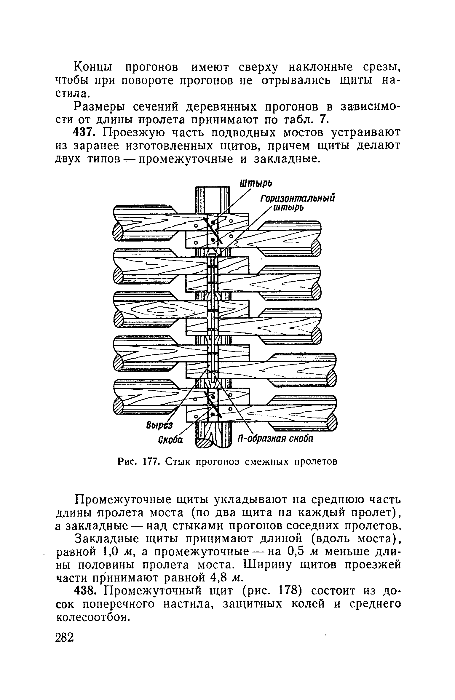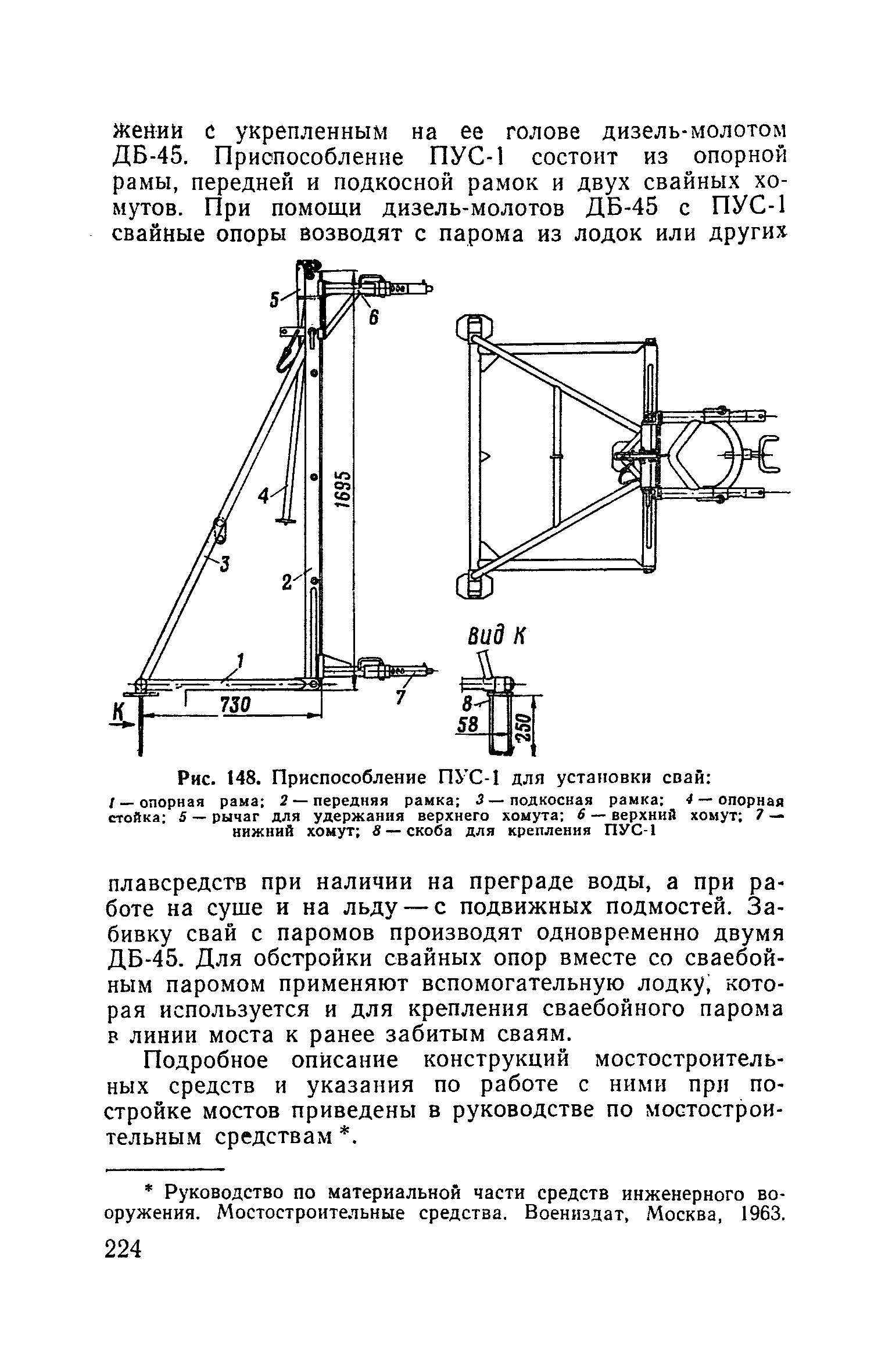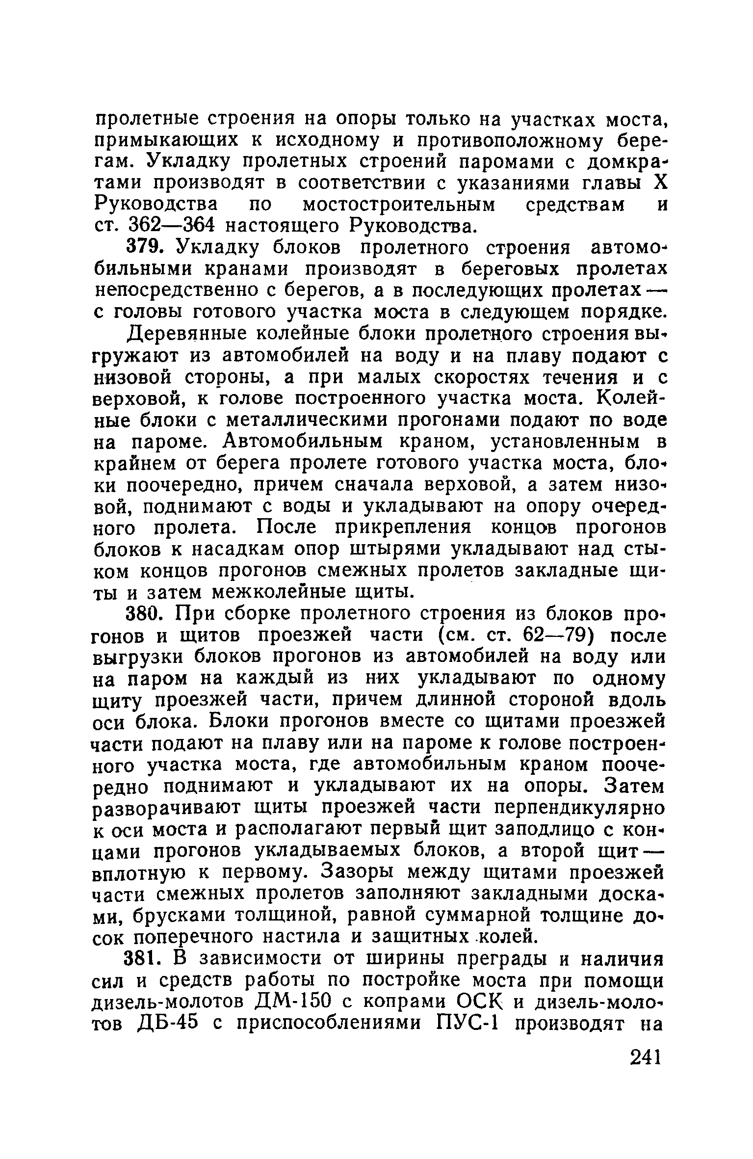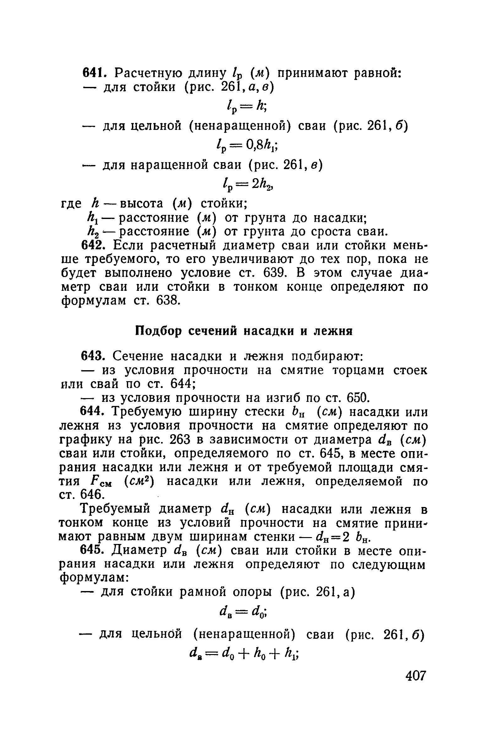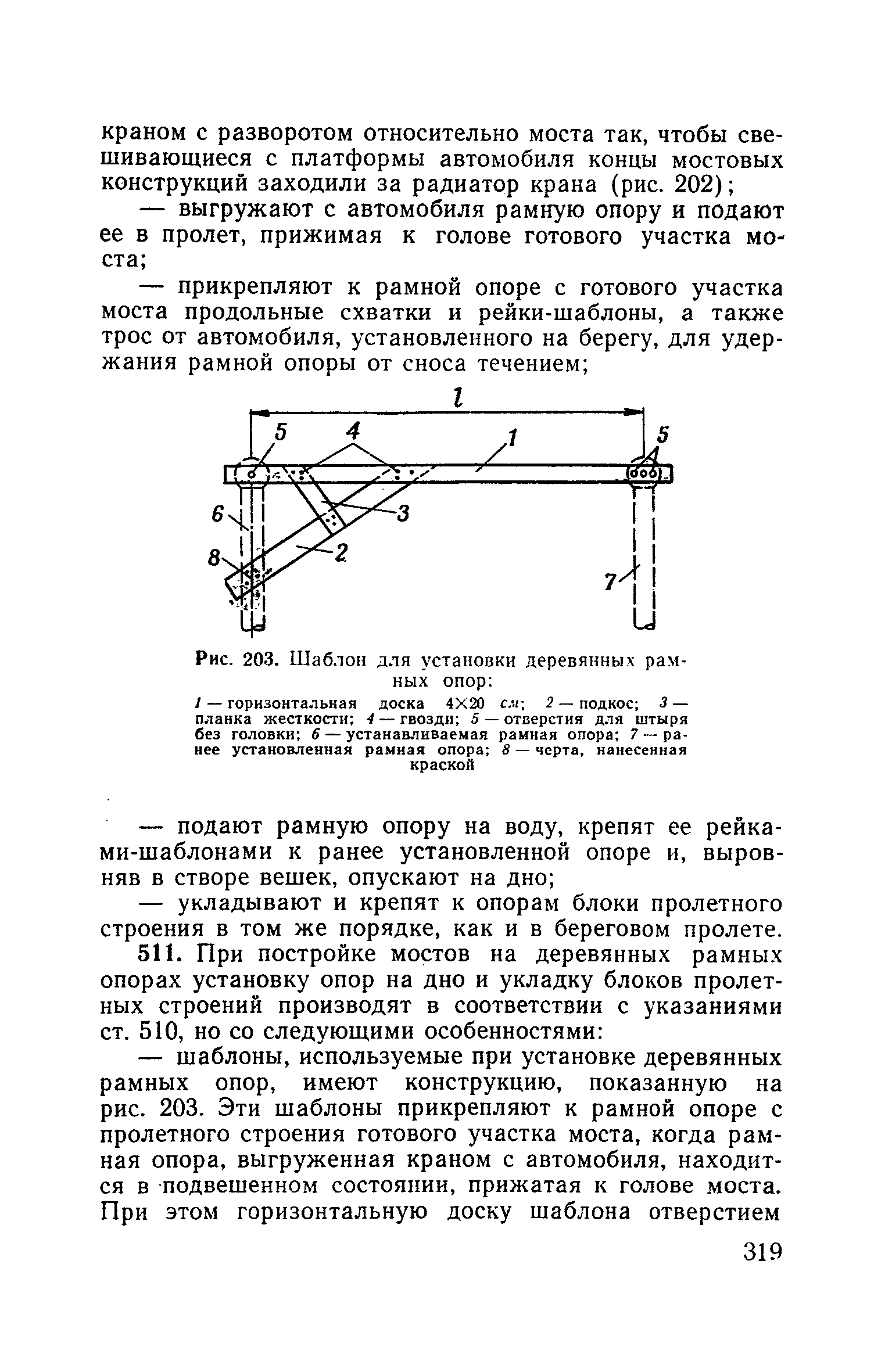 | Оглавление: | Глава 1. Общие положения Глава 2. Инженерная разведка района постройки моста Глава 3. Конструкции деревянных пролетных строений низководных мостов 1. Блочные пролетные строения Пролетные строения из колейных блоков Пролетные строения из блоков прогонов и щитов проезжей части а) Блоки простых прогонов б) Блоки сложных прогонов в) Блоки составных прогонов 2. Пролетные строения из отдельных элементов с простыми и сложными прогонами Проезжая часть Простые прогоны Сложные прогоны Глава 4. Конструкции металлических пролетных строений низководных мостов 1. Блочные пролетные строения Блоки из четырех прогонов Блоки из двух прогонов Проезжая часть 2. Пролетные строения из отдельных элементов Несущая конструкция с простыми прогонами и пакетами Несущая конструкция с составными прогонами Проезжая часть Глава 5. Промежуточные опоры низководных мостов 1. Свайные опоры 2. Рамные деревянные опоры 3. Клеточные опоры 4. Обеспечение продольной устойчивости моста Глава 6. Береговые опоры и сопряжение моста с берегами Глава 7. Изготовление и транспортировка мостовых конструкций 1. Общие положения 2. Изготовление конструкций низководных деревянных мостов Лесозаготовительные работы Лесопильные работы Работы по изготовлению деревянных мостовых конструкций Изготовление колейных блоков Сборка блоков прогонов Изготовление конструкций пролетного строения из блоков прогонов и щитов проезжей части Особенности сборки блоков сложных прогонов Изготовление составных прогонов на стальных цилиндрических нагелях и сборка блоков из двух прогонов Изготовление свай Изготовление насадок и лежней опор Изготовление элементов и сборка рамных опор Особенности изготовления элементов мостовых конструкций при постройке мостов из отдельных элементов 3. Изготовление конструкций металлических мостов Общие положения Изготовление металлических элементов Изготовление элементов проезжей части Изготовление блоков прогонов Изготовление пролетных строений из отдельных элементов 4. Транспортировка мостовых конструкций Глава 8. Постройка низководных мостов 1. Общие положения 2. Разбивка оси моста и осей опор 3. Средства механизации работ при постройке мостов 4. Глубина забивки свай в опорах 5. Организация в производство работ при постройке низководных мостов Общие положения Постройка мостов на свайных опорах при помощи комплекта мостостроительных средств КМС Постройка мостов на свайных опорах при помощи дизель-молотов ДМ-150 с одностреловыми копрами ОСК и дизель-молотов ДБ-45 с приспособлениями ПУС-1 для установки свай Постройка мостов на рамных опорах при помощи паромов с домкратами из комплекта КМС Устройство береговых опор и сопряжений моста с берегами Постройка мостов из отдельных элементов Особенности постройки двухпутных мостов на свайных опорах Особенности постройки мостов на свайных опорах с увеличенными пролетами Глава 9. Подводные мосты 1. Общие положения 2. Особенности конструкции промежуточных опор 3. Береговые опоры и сопряжение подводного моста с берегами 4. Особенности конструкции пролетных строений подводных мостов 5. Особенности постройки подводных мостов на свайных опорах 6. Особенности постройки подводных мостов на рамных опорах 7. Особенности постройки подводных мостов с металлическими прогонами Глава 10. Особенности к