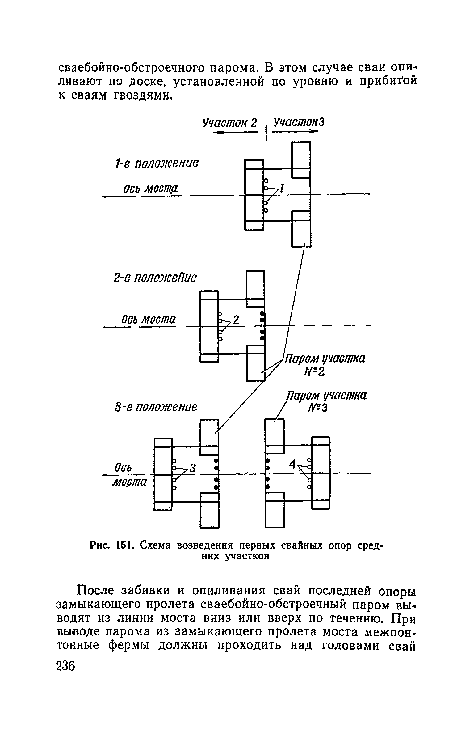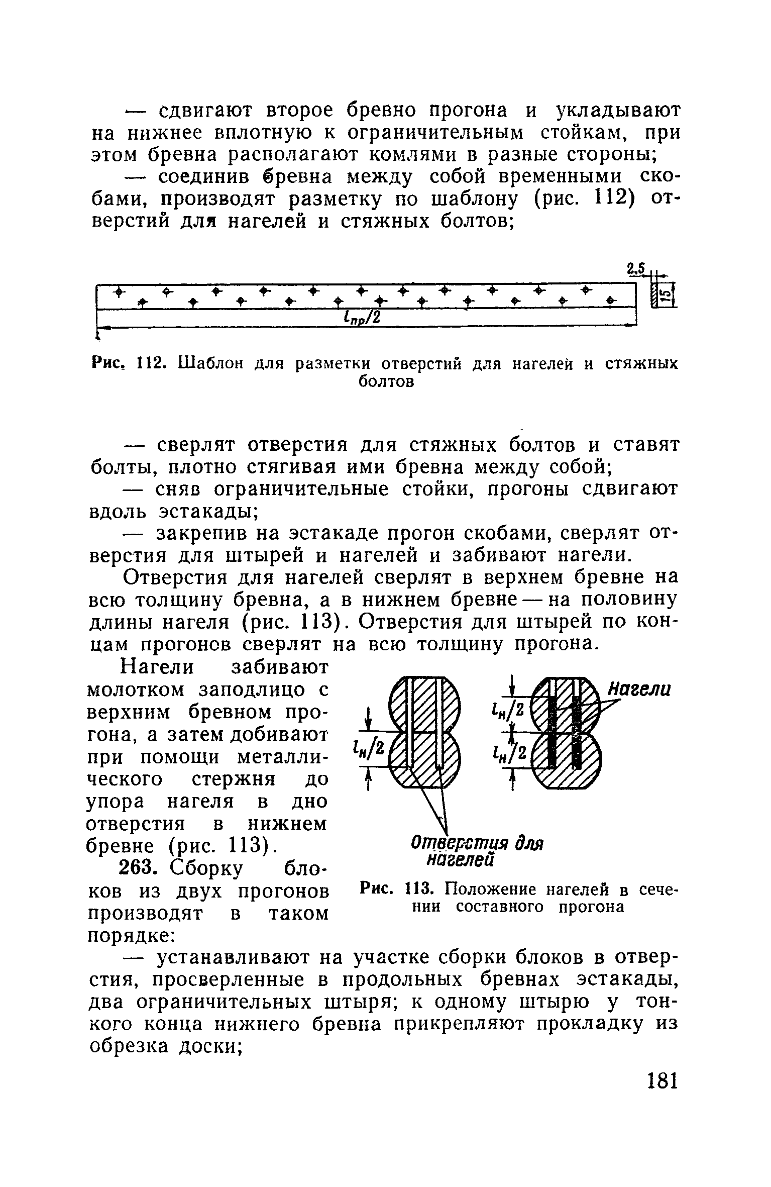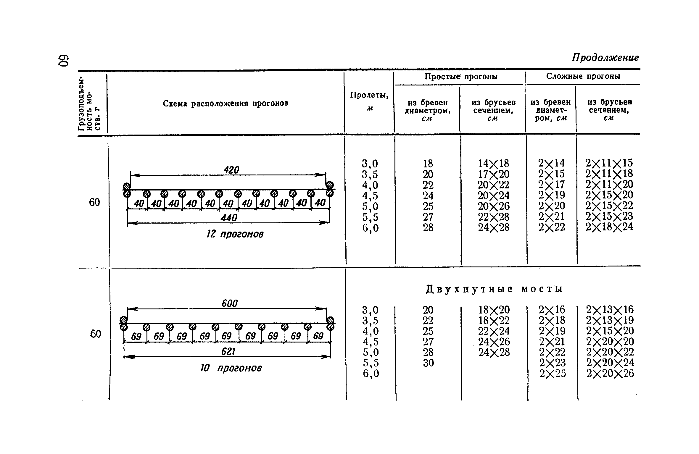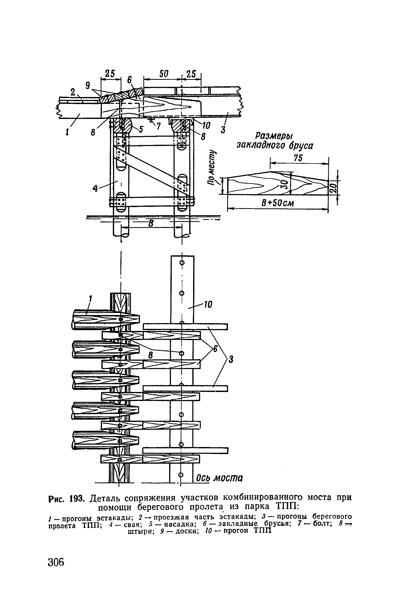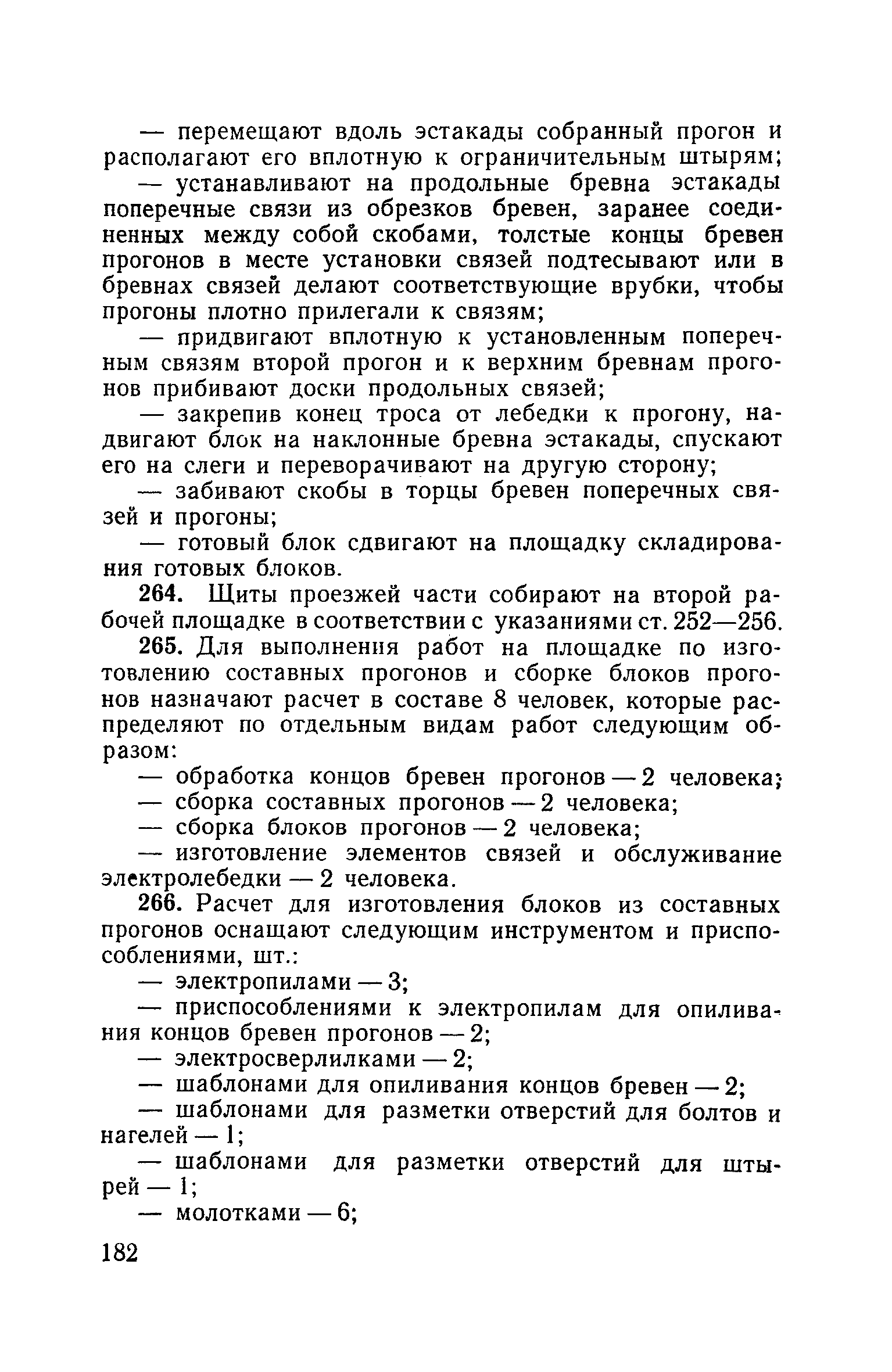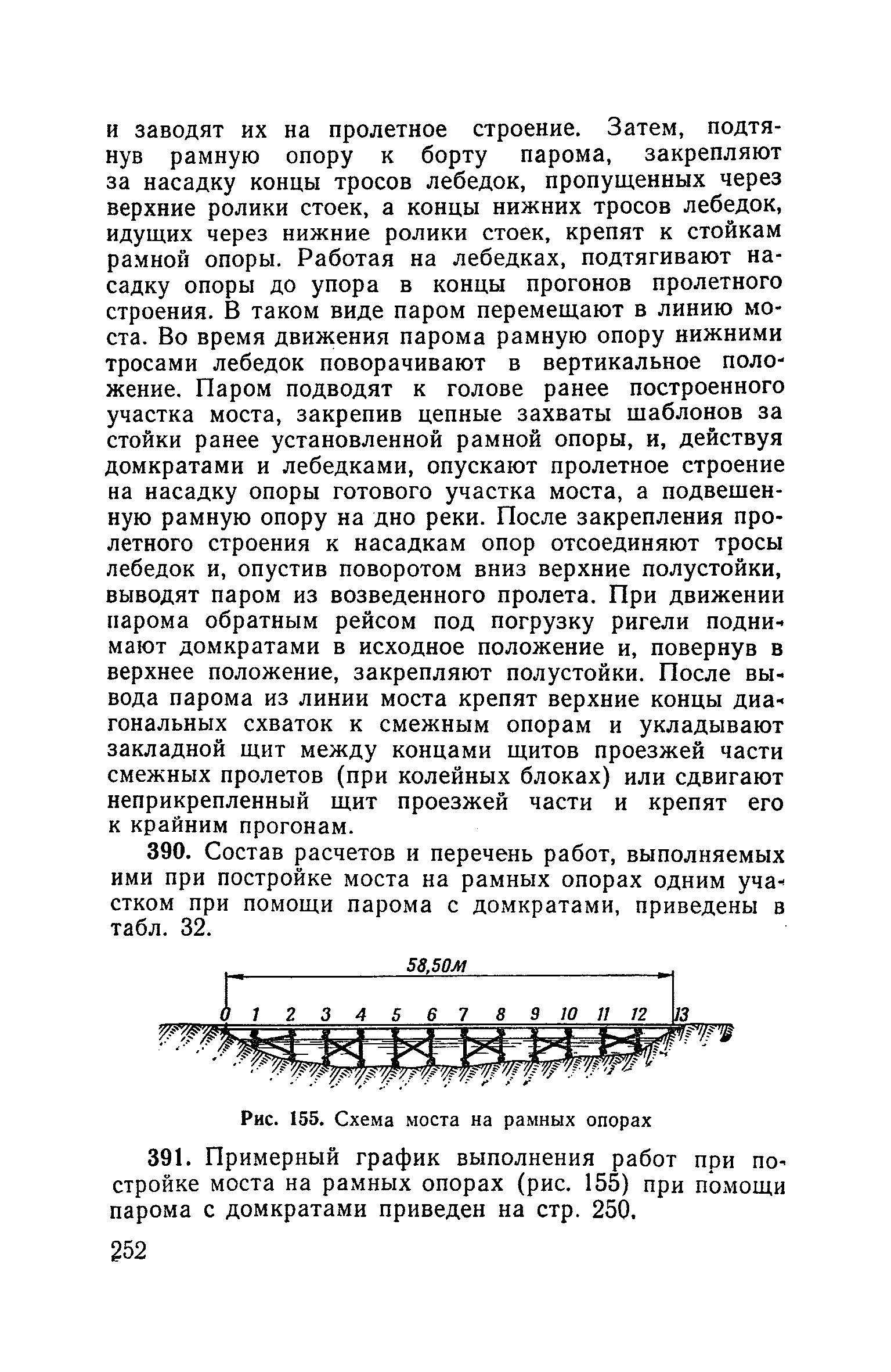 | Оглавление: | Глава 1. Общие положения Глава 2. Инженерная разведка района постройки моста Глава 3. Конструкции деревянных пролетных строений низководных мостов 1. Блочные пролетные строения Пролетные строения из колейных блоков Пролетные строения из блоков прогонов и щитов проезжей части а) Блоки простых прогонов б) Блоки сложных прогонов в) Блоки составных прогонов 2. Пролетные строения из отдельных элементов с простыми и сложными прогонами Проезжая часть Простые прогоны Сложные прогоны Глава 4. Конструкции металлических пролетных строений низководных мостов 1. Блочные пролетные строения Блоки из четырех прогонов Блоки из двух прогонов Проезжая часть 2. Пролетные строения из отдельных элементов Несущая конструкция с простыми прогонами и пакетами Несущая конструкция с составными прогонами Проезжая часть Глава 5. Промежуточные опоры низководных мостов 1. Свайные опоры 2. Рамные деревянные опоры 3. Клеточные опоры 4. Обеспечение продольной устойчивости моста Глава 6. Береговые опоры и сопряжение моста с берегами Глава 7. Изготовление и транспортировка мостовых конструкций 1. Общие положения 2. Изготовление конструкций низководных деревянных мостов Лесозаготовительные работы Лесопильные работы Работы по изготовлению деревянных мостовых конструкций Изготовление колейных блоков Сборка блоков прогонов Изготовление конструкций пролетного строения из блоков прогонов и щитов проезжей части Особенности сборки блоков сложных прогонов Изготовление составных прогонов на стальных цилиндрических нагелях и сборка блоков из двух прогонов Изготовление свай Изготовление насадок и лежней опор Изготовление элементов и сборка рамных опор Особенности изготовления элементов мостовых конструкций при постройке мостов из отдельных элементов 3. Изготовление конструкций металлических мостов Общие положения Изготовление металлических элементов Изготовление элементов проезжей части Изготовление блоков прогонов Изготовление пролетных строений из отдельных элементов 4. Транспортировка мостовых конструкций Глава 8. Постройка низководных мостов 1. Общие положения 2. Разбивка оси моста и осей опор 3. Средства механизации работ при постройке мостов 4. Глубина забивки свай в опорах 5. Организация в производство работ при постройке низководных мостов Общие положения Постройка мостов на свайных опорах при помощи комплекта мостостроительных средств КМС Постройка мостов на свайных опорах при помощи дизель-молотов ДМ-150 с одностреловыми копрами ОСК и дизель-молотов ДБ-45 с приспособлениями ПУС-1 для установки свай Постройка мостов на рамных опорах при помощи паромов с домкратами из комплекта КМС Устройство береговых опор и сопряжений моста с берегами Постройка мостов из отдельных элементов Особенности постройки двухпутных мостов на свайных опорах Особенности постройки мостов на свайных опорах с увеличенными пролетами Глава 9. Подводные мосты 1. Общие положения 2. Особенности конструкции промежуточных опор 3. Береговые опоры и сопряжение подводного моста с берегами 4. Особенности конструкции пролетных строений подводных мостов 5. Особенности постройки подводных мостов на свайных опорах 6. Особенности постройки подводных мостов на рамных опорах 7. Особенности постройки подводных мостов с металлическими прогонами Глава 10. Особенности к
