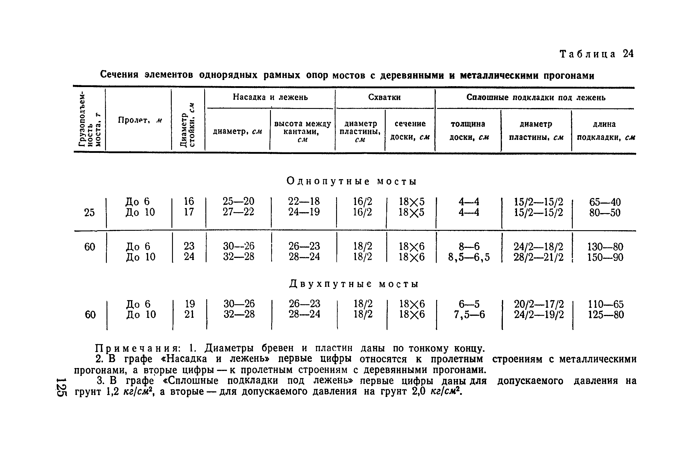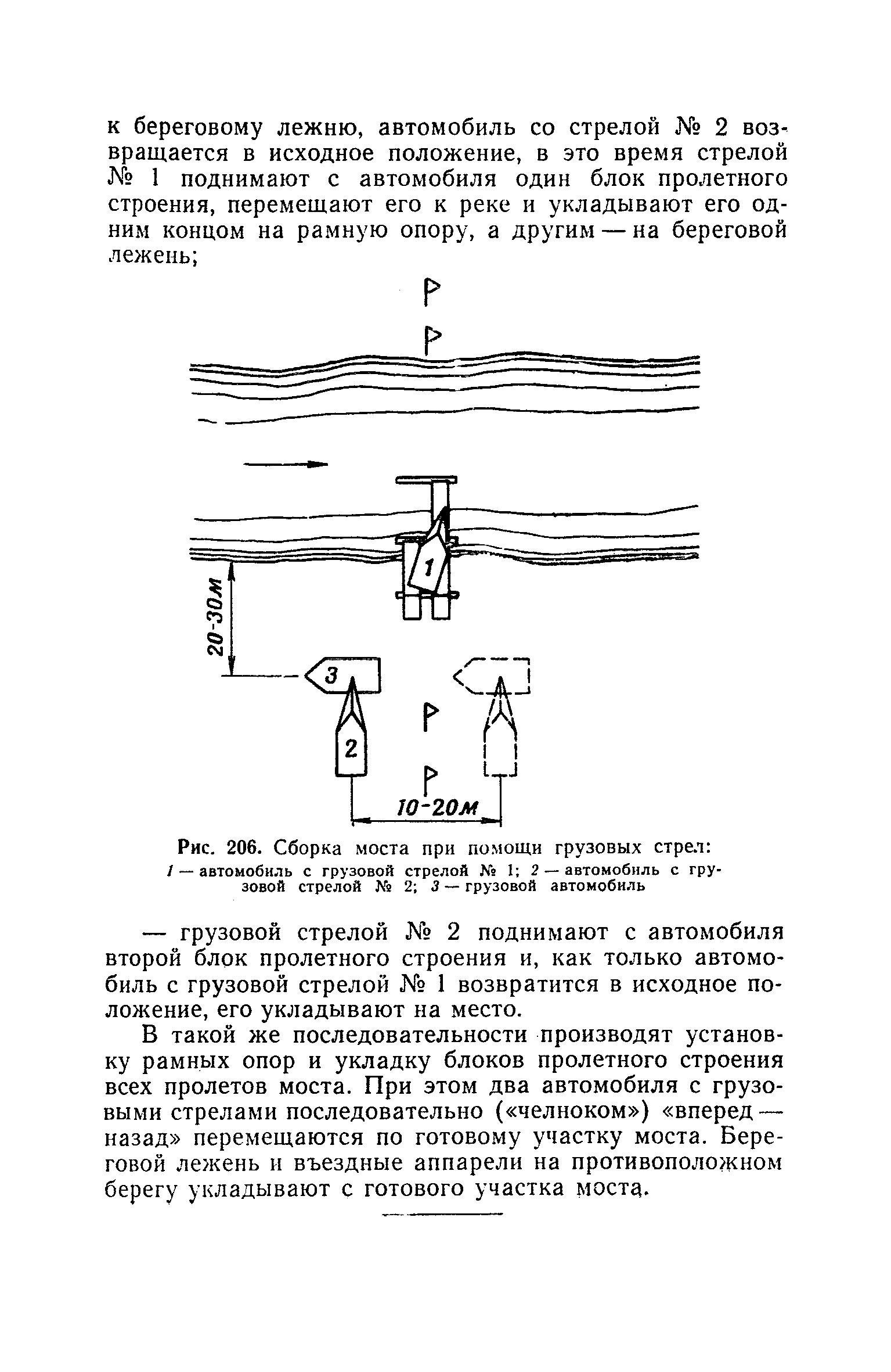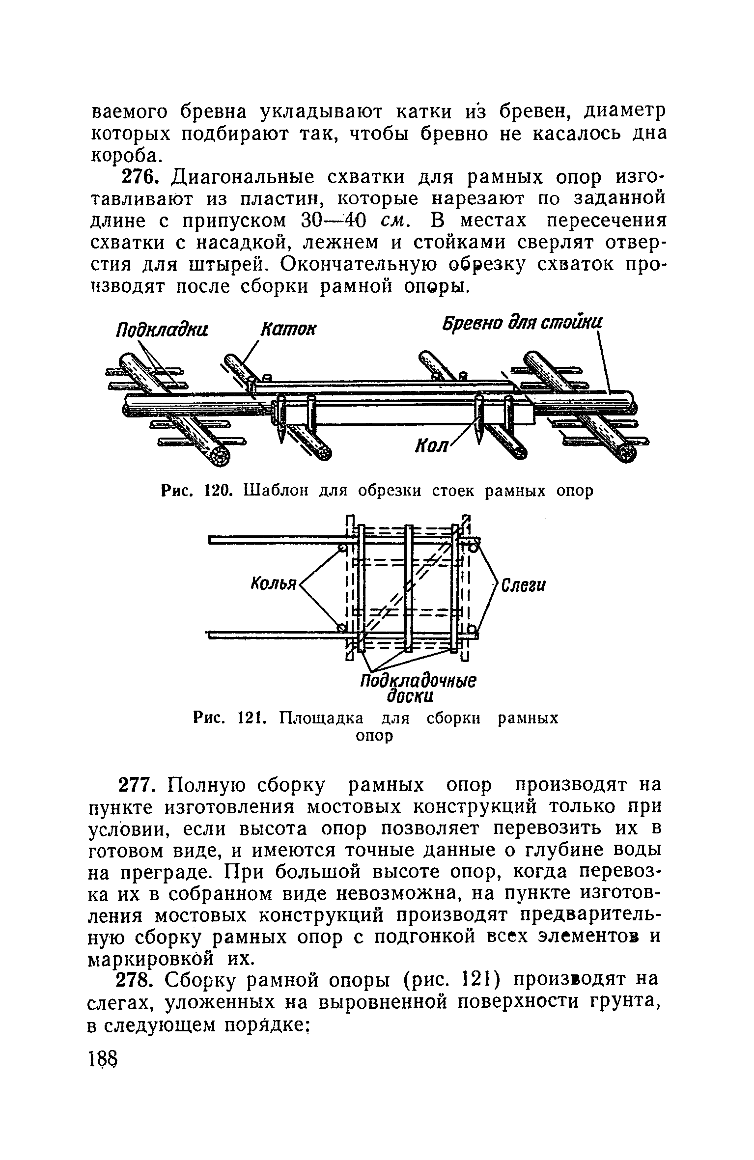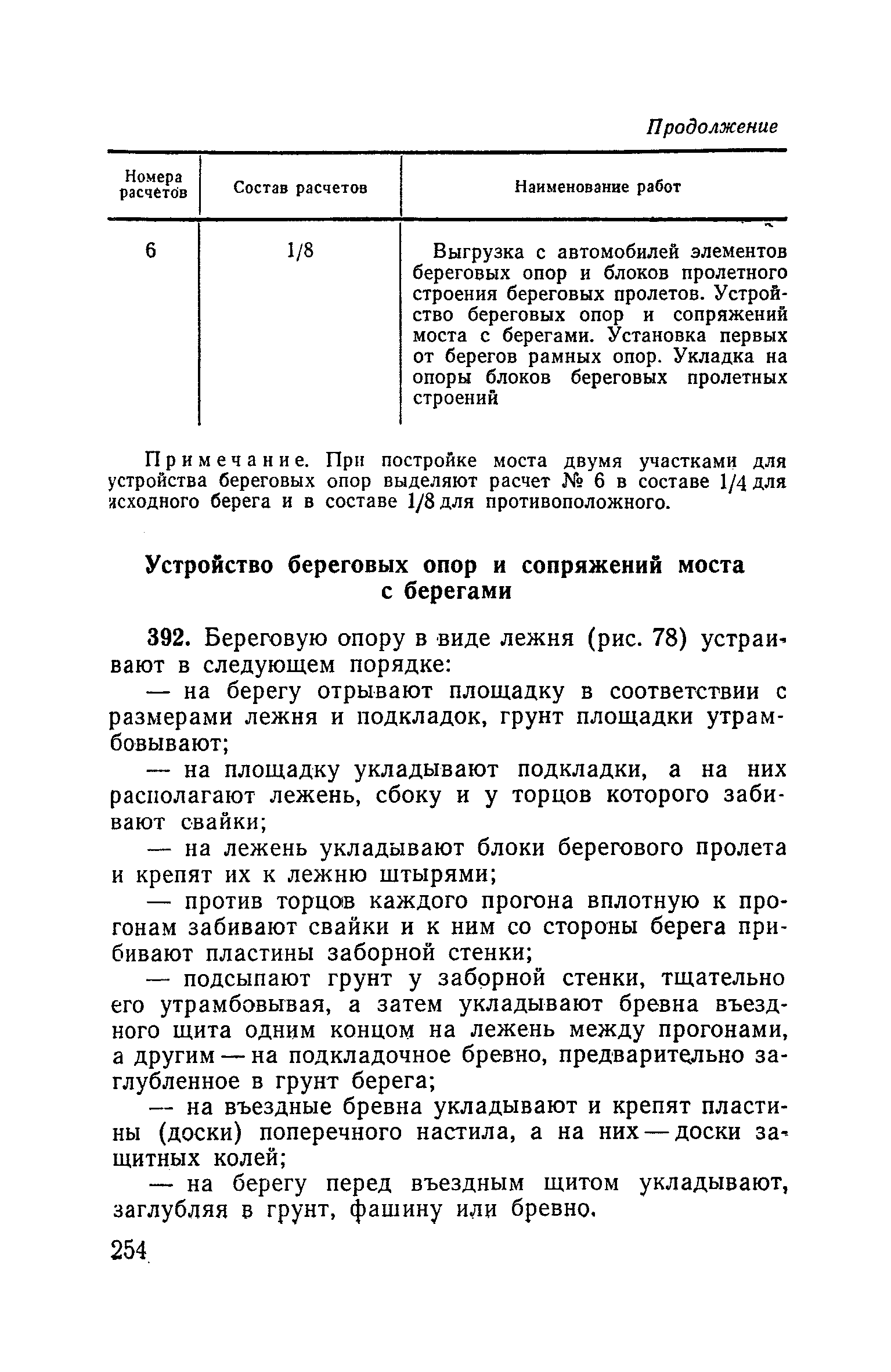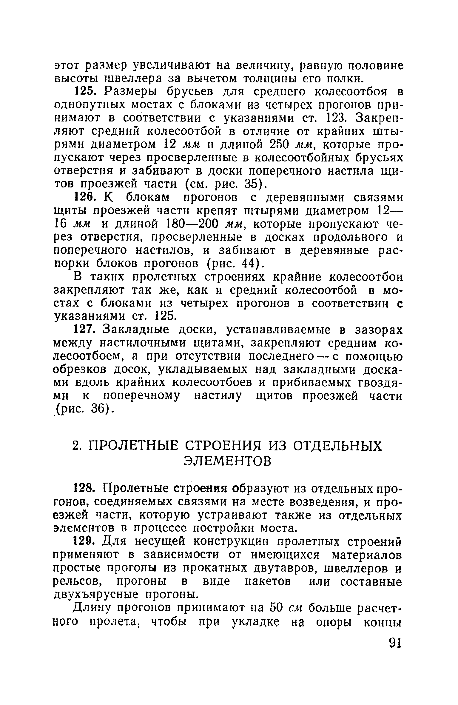 | Оглавление: | Глава 1. Общие положения Глава 2. Инженерная разведка района постройки моста Глава 3. Конструкции деревянных пролетных строений низководных мостов 1. Блочные пролетные строения Пролетные строения из колейных блоков Пролетные строения из блоков прогонов и щитов проезжей части а) Блоки простых прогонов б) Блоки сложных прогонов в) Блоки составных прогонов 2. Пролетные строения из отдельных элементов с простыми и сложными прогонами Проезжая часть Простые прогоны Сложные прогоны Глава 4. Конструкции металлических пролетных строений низководных мостов 1. Блочные пролетные строения Блоки из четырех прогонов Блоки из двух прогонов Проезжая часть 2. Пролетные строения из отдельных элементов Несущая конструкция с простыми прогонами и пакетами Несущая конструкция с составными прогонами Проезжая часть Глава 5. Промежуточные опоры низководных мостов 1. Свайные опоры 2. Рамные деревянные опоры 3. Клеточные опоры 4. Обеспечение продольной устойчивости моста Глава 6. Береговые опоры и сопряжение моста с берегами Глава 7. Изготовление и транспортировка мостовых конструкций 1. Общие положения 2. Изготовление конструкций низководных деревянных мостов Лесозаготовительные работы Лесопильные работы Работы по изготовлению деревянных мостовых конструкций Изготовление колейных блоков Сборка блоков прогонов Изготовление конструкций пролетного строения из блоков прогонов и щитов проезжей части Особенности сборки блоков сложных прогонов Изготовление составных прогонов на стальных цилиндрических нагелях и сборка блоков из двух прогонов Изготовление свай Изготовление насадок и лежней опор Изготовление элементов и сборка рамных опор Особенности изготовления элементов мостовых конструкций при постройке мостов из отдельных элементов 3. Изготовление конструкций металлических мостов Общие положения Изготовление металлических элементов Изготовление элементов проезжей части Изготовление блоков прогонов Изготовление пролетных строений из отдельных элементов 4. Транспортировка мостовых конструкций Глава 8. Постройка низководных мостов 1. Общие положения 2. Разбивка оси моста и осей опор 3. Средства механизации работ при постройке мостов 4. Глубина забивки свай в опорах 5. Организация в производство работ при постройке низководных мостов Общие положения Постройка мостов на свайных опорах при помощи комплекта мостостроительных средств КМС Постройка мостов на свайных опорах при помощи дизель-молотов ДМ-150 с одностреловыми копрами ОСК и дизель-молотов ДБ-45 с приспособлениями ПУС-1 для установки свай Постройка мостов на рамных опорах при помощи паромов с домкратами из комплекта КМС Устройство береговых опор и сопряжений моста с берегами Постройка мостов из отдельных элементов Особенности постройки двухпутных мостов на свайных опорах Особенности постройки мостов на свайных опорах с увеличенными пролетами Глава 9. Подводные мосты 1. Общие положения 2. Особенности конструкции промежуточных опор 3. Береговые опоры и сопряжение подводного моста с берегами 4. Особенности конструкции пролетных строений подводных мостов 5. Особенности постройки подводных мостов на свайных опорах 6. Особенности постройки подводных мостов на рамных опорах 7. Особенности постройки подводных мостов с металлическими прогонами Глава 10. Особенности к