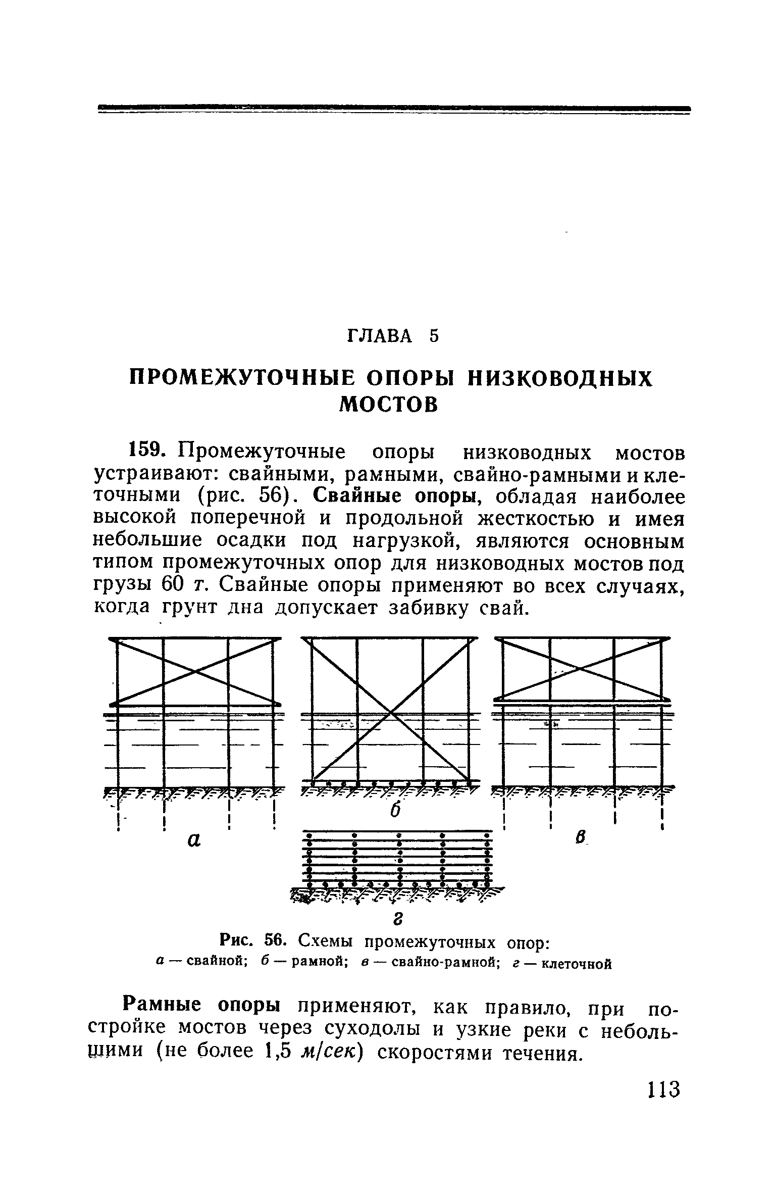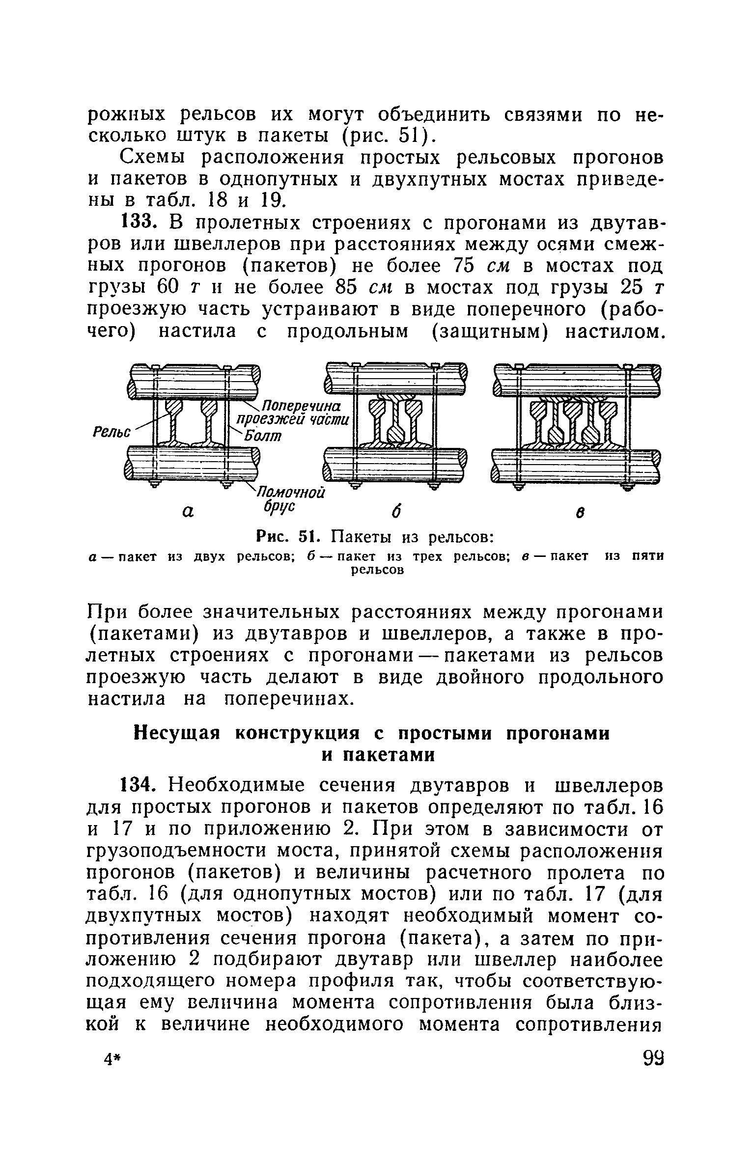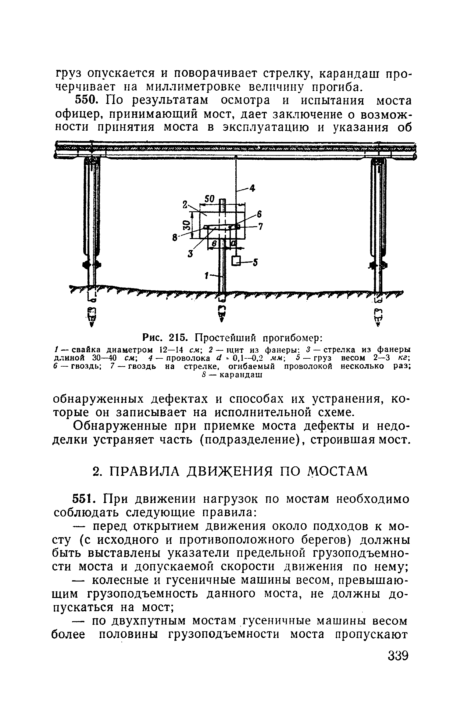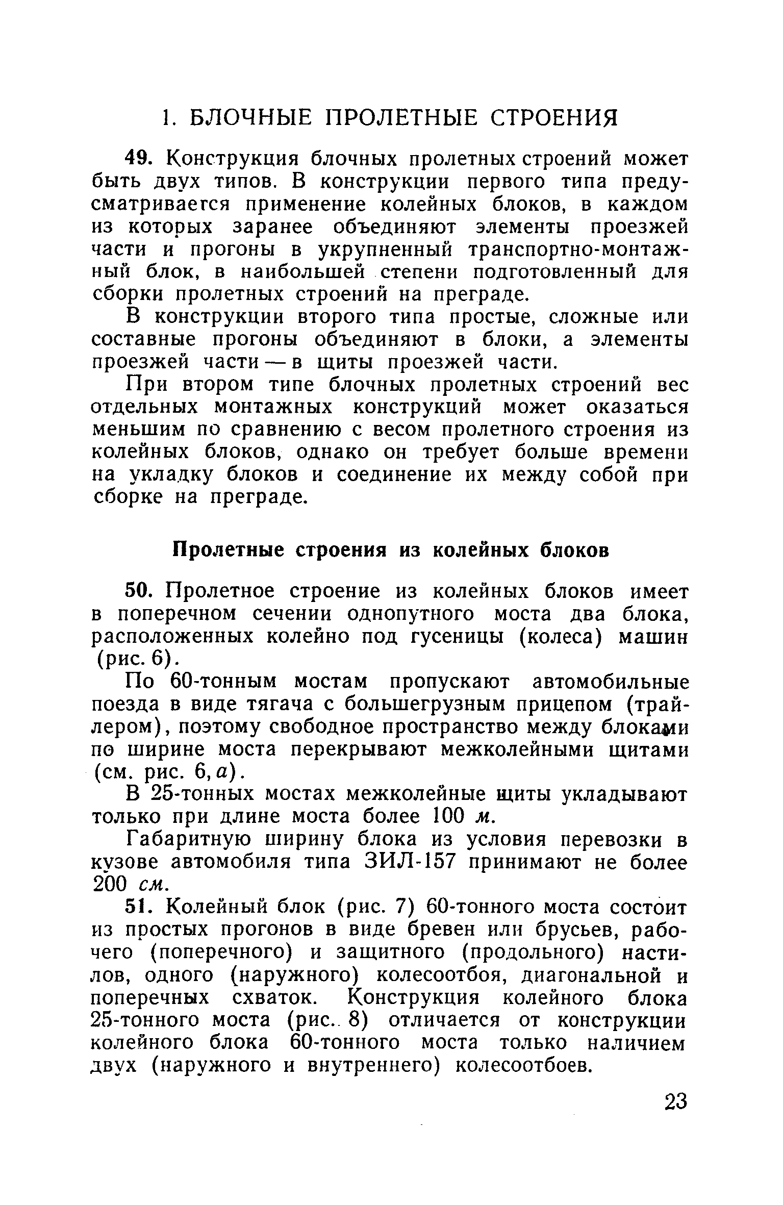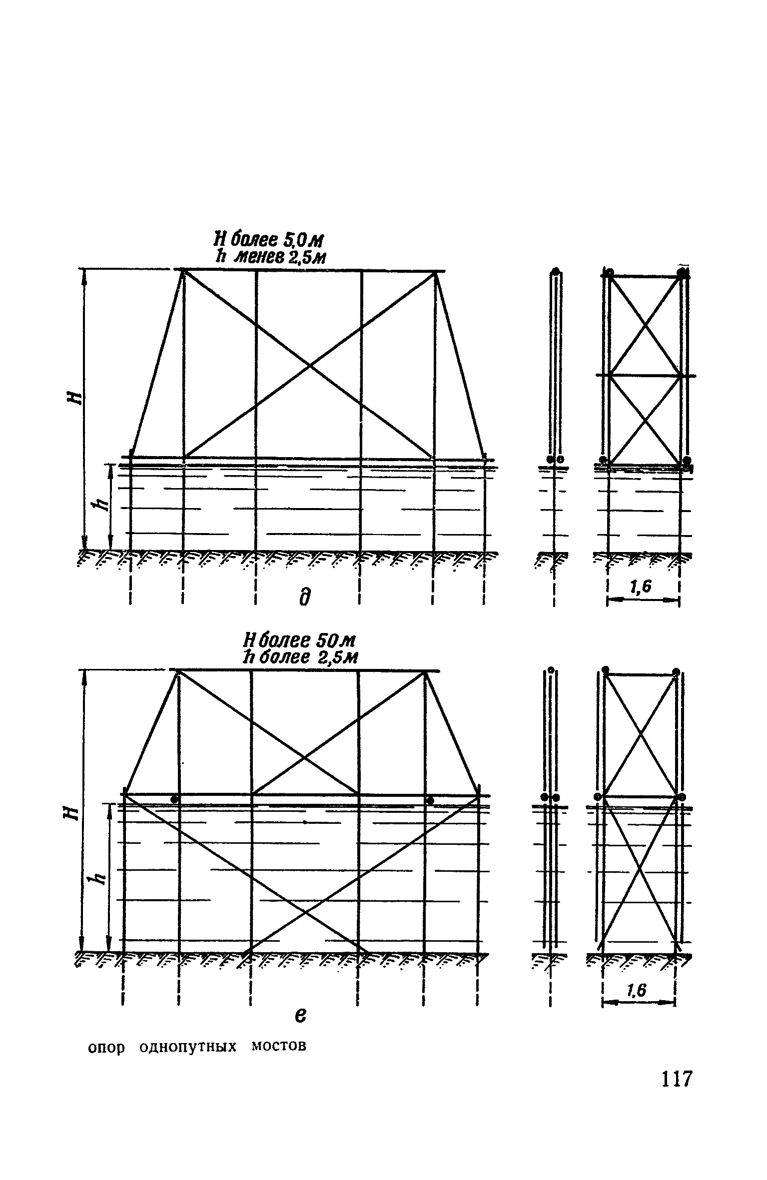 | Оглавление: | Глава 1. Общие положения Глава 2. Инженерная разведка района постройки моста Глава 3. Конструкции деревянных пролетных строений низководных мостов 1. Блочные пролетные строения Пролетные строения из колейных блоков Пролетные строения из блоков прогонов и щитов проезжей части а) Блоки простых прогонов б) Блоки сложных прогонов в) Блоки составных прогонов 2. Пролетные строения из отдельных элементов с простыми и сложными прогонами Проезжая часть Простые прогоны Сложные прогоны Глава 4. Конструкции металлических пролетных строений низководных мостов 1. Блочные пролетные строения Блоки из четырех прогонов Блоки из двух прогонов Проезжая часть 2. Пролетные строения из отдельных элементов Несущая конструкция с простыми прогонами и пакетами Несущая конструкция с составными прогонами Проезжая часть Глава 5. Промежуточные опоры низководных мостов 1. Свайные опоры 2. Рамные деревянные опоры 3. Клеточные опоры 4. Обеспечение продольной устойчивости моста Глава 6. Береговые опоры и сопряжение моста с берегами Глава 7. Изготовление и транспортировка мостовых конструкций 1. Общие положения 2. Изготовление конструкций низководных деревянных мостов Лесозаготовительные работы Лесопильные работы Работы по изготовлению деревянных мостовых конструкций Изготовление колейных блоков Сборка блоков прогонов Изготовление конструкций пролетного строения из блоков прогонов и щитов проезжей части Особенности сборки блоков сложных прогонов Изготовление составных прогонов на стальных цилиндрических нагелях и сборка блоков из двух прогонов Изготовление свай Изготовление насадок и лежней опор Изготовление элементов и сборка рамных опор Особенности изготовления элементов мостовых конструкций при постройке мостов из отдельных элементов 3. Изготовление конструкций металлических мостов Общие положения Изготовление металлических элементов Изготовление элементов проезжей части Изготовление блоков прогонов Изготовление пролетных строений из отдельных элементов 4. Транспортировка мостовых конструкций Глава 8. Постройка низководных мостов 1. Общие положения 2. Разбивка оси моста и осей опор 3. Средства механизации работ при постройке мостов 4. Глубина забивки свай в опорах 5. Организация в производство работ при постройке низководных мостов Общие положения Постройка мостов на свайных опорах при помощи комплекта мостостроительных средств КМС Постройка мостов на свайных опорах при помощи дизель-молотов ДМ-150 с одностреловыми копрами ОСК и дизель-молотов ДБ-45 с приспособлениями ПУС-1 для установки свай Постройка мостов на рамных опорах при помощи паромов с домкратами из комплекта КМС Устройство береговых опор и сопряжений моста с берегами Постройка мостов из отдельных элементов Особенности постройки двухпутных мостов на свайных опорах Особенности постройки мостов на свайных опорах с увеличенными пролетами Глава 9. Подводные мосты 1. Общие положения 2. Особенности конструкции промежуточных опор 3. Береговые опоры и сопряжение подводного моста с берегами 4. Особенности конструкции пролетных строений подводных мостов 5. Особенности постройки подводных мостов на свайных опорах 6. Особенности постройки подводных мостов на рамных опорах 7. Особенности постройки подводных мостов с металлическими прогонами Глава 10. Особенности к