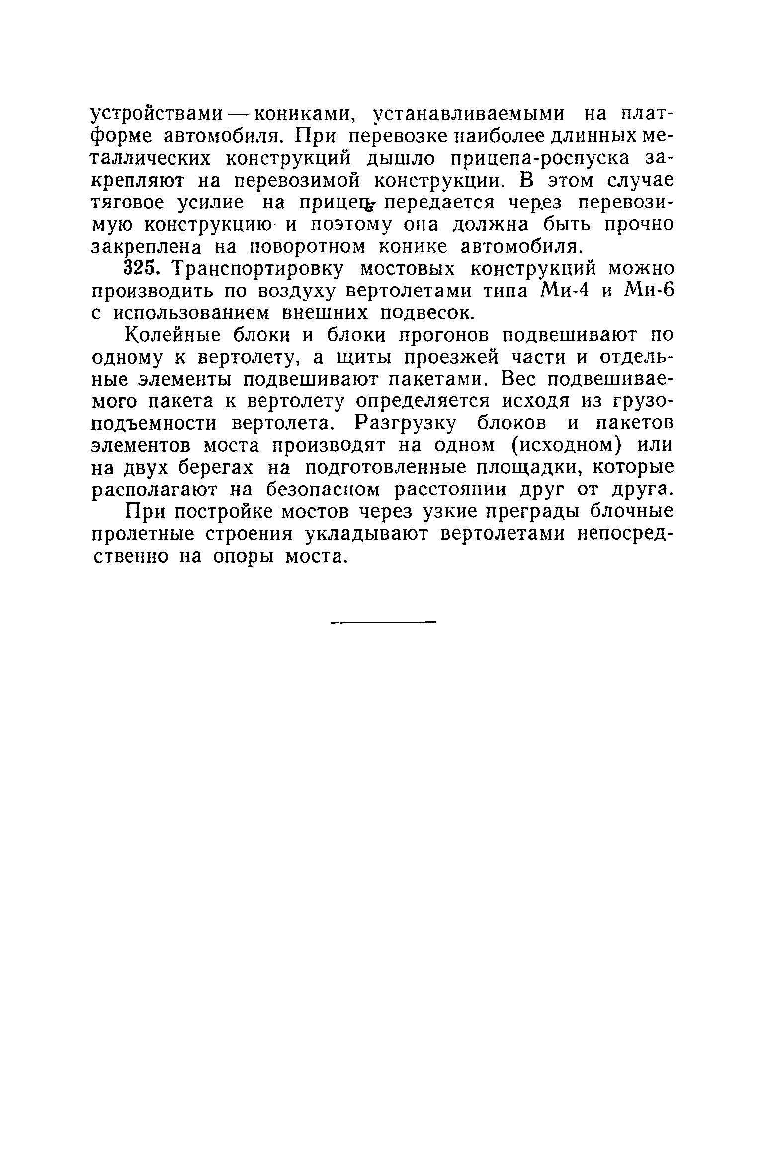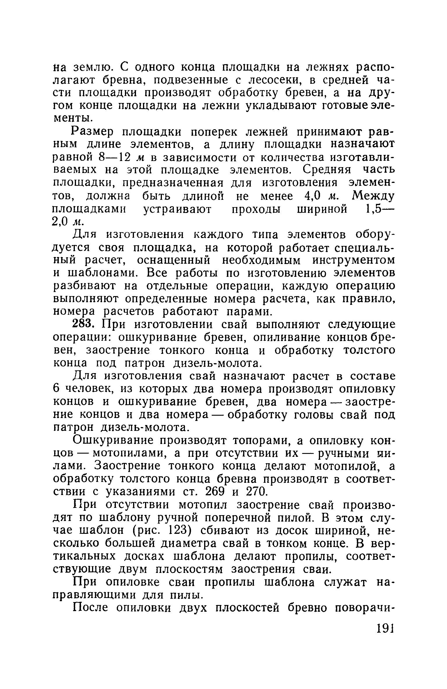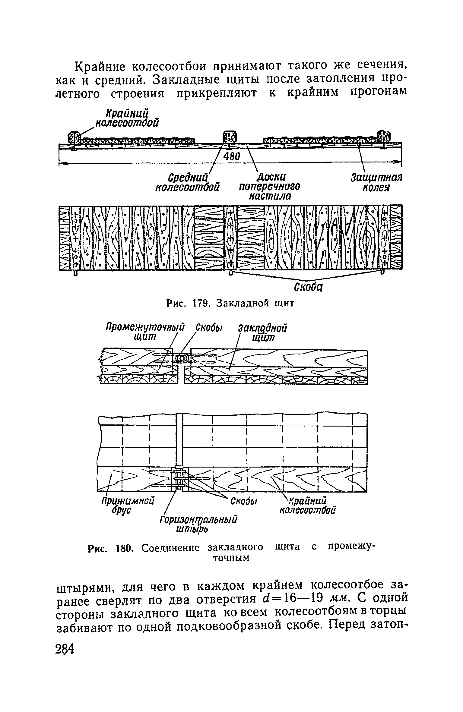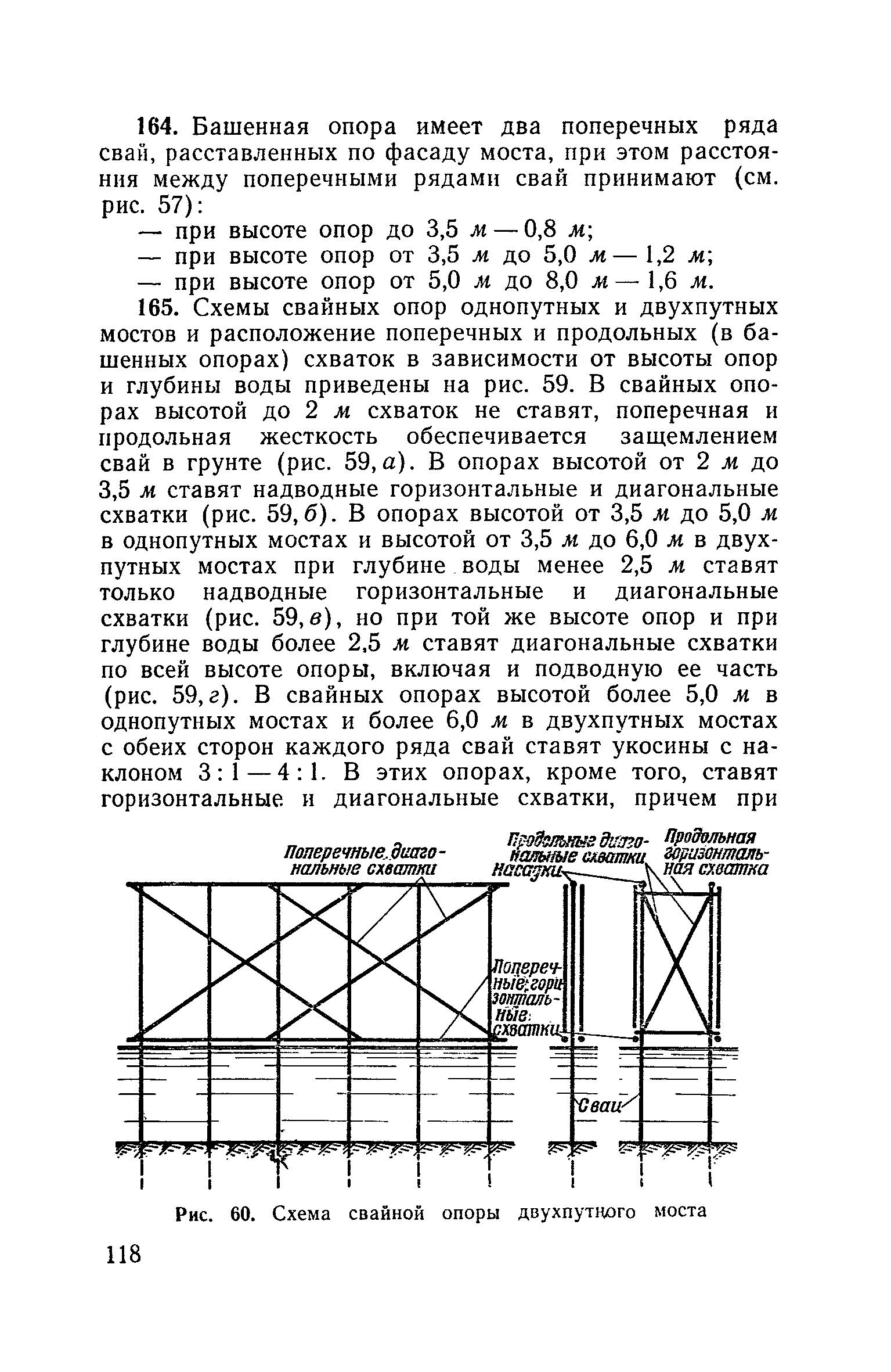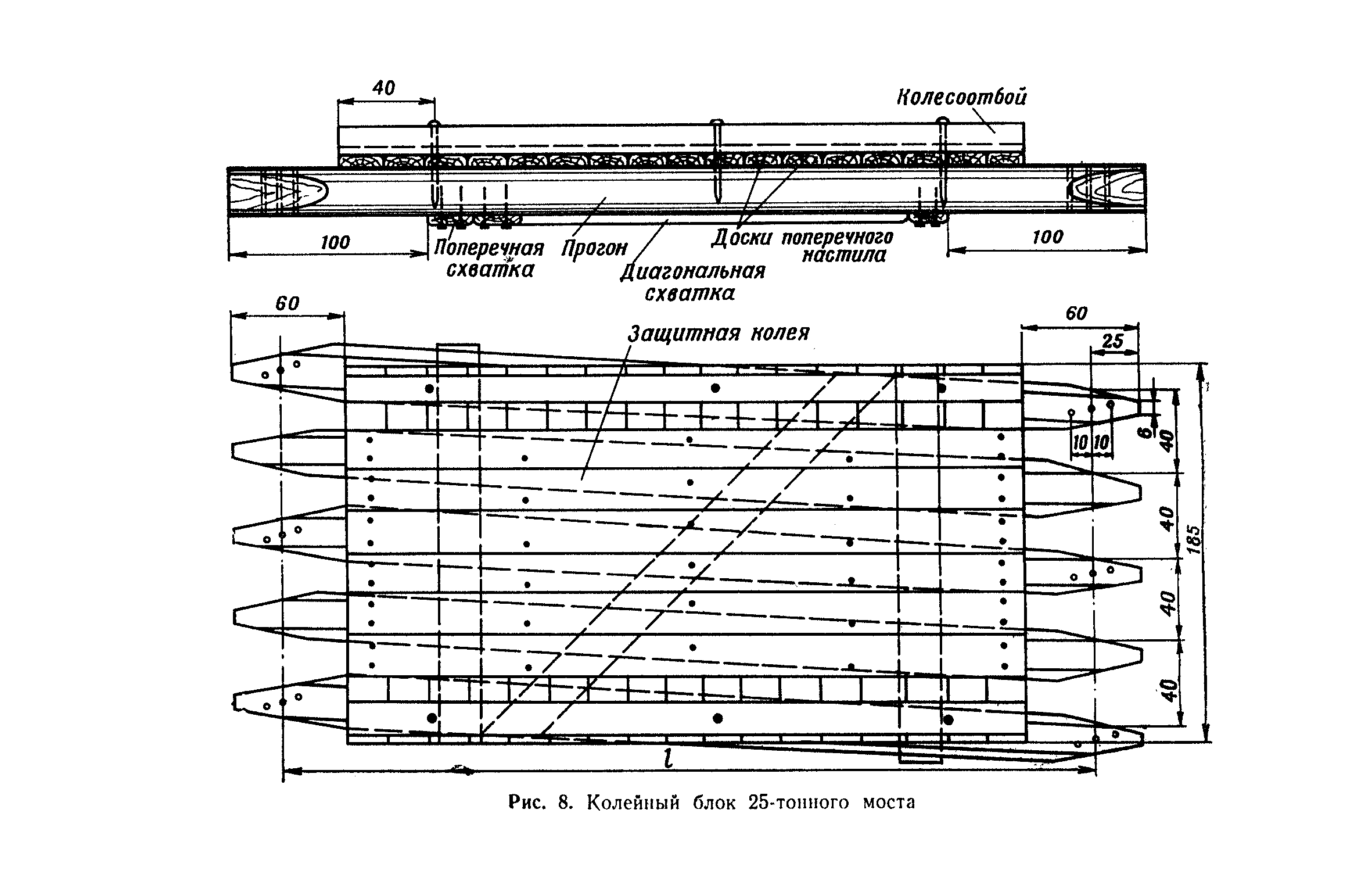 | Оглавление: | Глава 1. Общие положения Глава 2. Инженерная разведка района постройки моста Глава 3. Конструкции деревянных пролетных строений низководных мостов 1. Блочные пролетные строения Пролетные строения из колейных блоков Пролетные строения из блоков прогонов и щитов проезжей части а) Блоки простых прогонов б) Блоки сложных прогонов в) Блоки составных прогонов 2. Пролетные строения из отдельных элементов с простыми и сложными прогонами Проезжая часть Простые прогоны Сложные прогоны Глава 4. Конструкции металлических пролетных строений низководных мостов 1. Блочные пролетные строения Блоки из четырех прогонов Блоки из двух прогонов Проезжая часть 2. Пролетные строения из отдельных элементов Несущая конструкция с простыми прогонами и пакетами Несущая конструкция с составными прогонами Проезжая часть Глава 5. Промежуточные опоры низководных мостов 1. Свайные опоры 2. Рамные деревянные опоры 3. Клеточные опоры 4. Обеспечение продольной устойчивости моста Глава 6. Береговые опоры и сопряжение моста с берегами Глава 7. Изготовление и транспортировка мостовых конструкций 1. Общие положения 2. Изготовление конструкций низководных деревянных мостов Лесозаготовительные работы Лесопильные работы Работы по изготовлению деревянных мостовых конструкций Изготовление колейных блоков Сборка блоков прогонов Изготовление конструкций пролетного строения из блоков прогонов и щитов проезжей части Особенности сборки блоков сложных прогонов Изготовление составных прогонов на стальных цилиндрических нагелях и сборка блоков из двух прогонов Изготовление свай Изготовление насадок и лежней опор Изготовление элементов и сборка рамных опор Особенности изготовления элементов мостовых конструкций при постройке мостов из отдельных элементов 3. Изготовление конструкций металлических мостов Общие положения Изготовление металлических элементов Изготовление элементов проезжей части Изготовление блоков прогонов Изготовление пролетных строений из отдельных элементов 4. Транспортировка мостовых конструкций Глава 8. Постройка низководных мостов 1. Общие положения 2. Разбивка оси моста и осей опор 3. Средства механизации работ при постройке мостов 4. Глубина забивки свай в опорах 5. Организация в производство работ при постройке низководных мостов Общие положения Постройка мостов на свайных опорах при помощи комплекта мостостроительных средств КМС Постройка мостов на свайных опорах при помощи дизель-молотов ДМ-150 с одностреловыми копрами ОСК и дизель-молотов ДБ-45 с приспособлениями ПУС-1 для установки свай Постройка мостов на рамных опорах при помощи паромов с домкратами из комплекта КМС Устройство береговых опор и сопряжений моста с берегами Постройка мостов из отдельных элементов Особенности постройки двухпутных мостов на свайных опорах Особенности постройки мостов на свайных опорах с увеличенными пролетами Глава 9. Подводные мосты 1. Общие положения 2. Особенности конструкции промежуточных опор 3. Береговые опоры и сопряжение подводного моста с берегами 4. Особенности конструкции пролетных строений подводных мостов 5. Особенности постройки подводных мостов на свайных опорах 6. Особенности постройки подводных мостов на рамных опорах 7. Особенности постройки подводных мостов с металлическими прогонами Глава 10. Особенности к