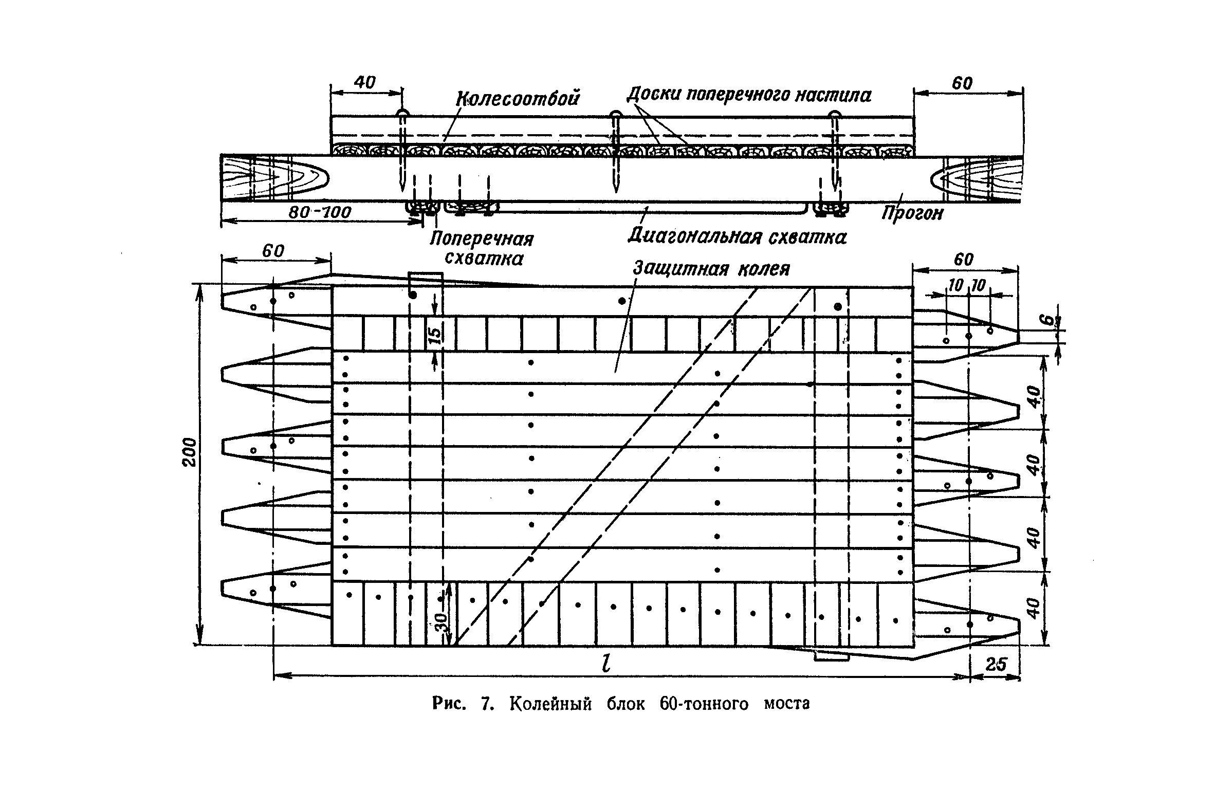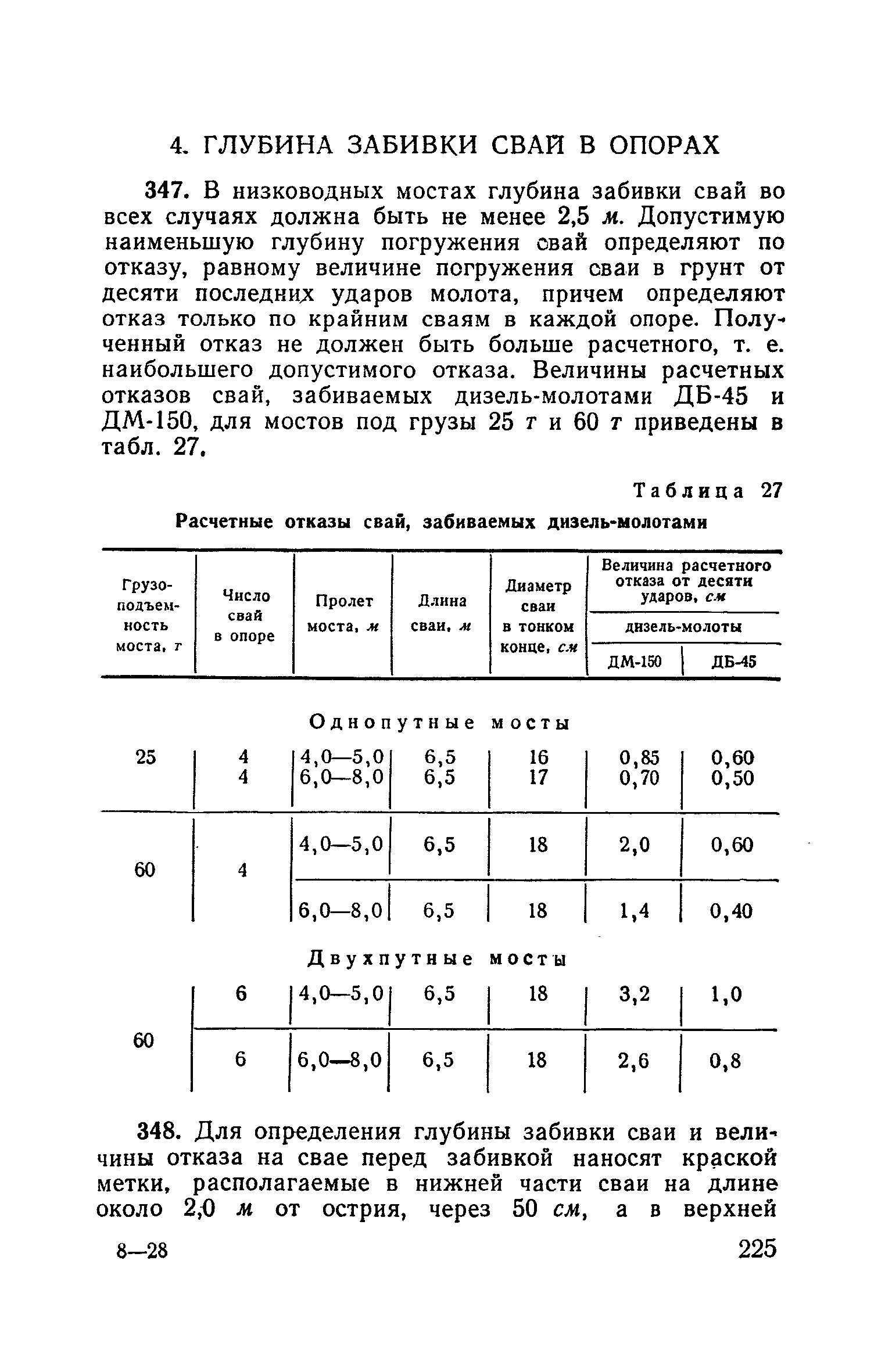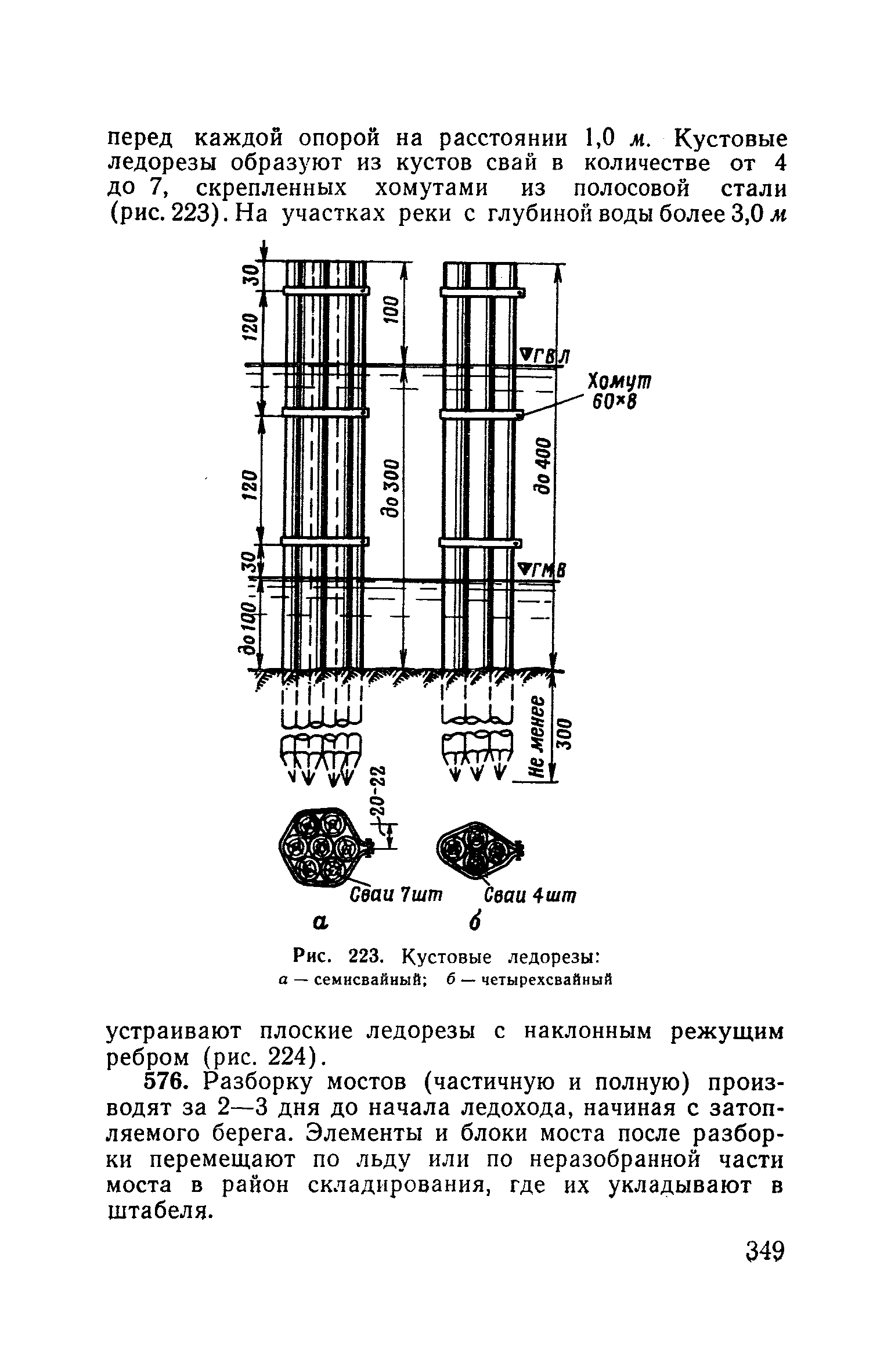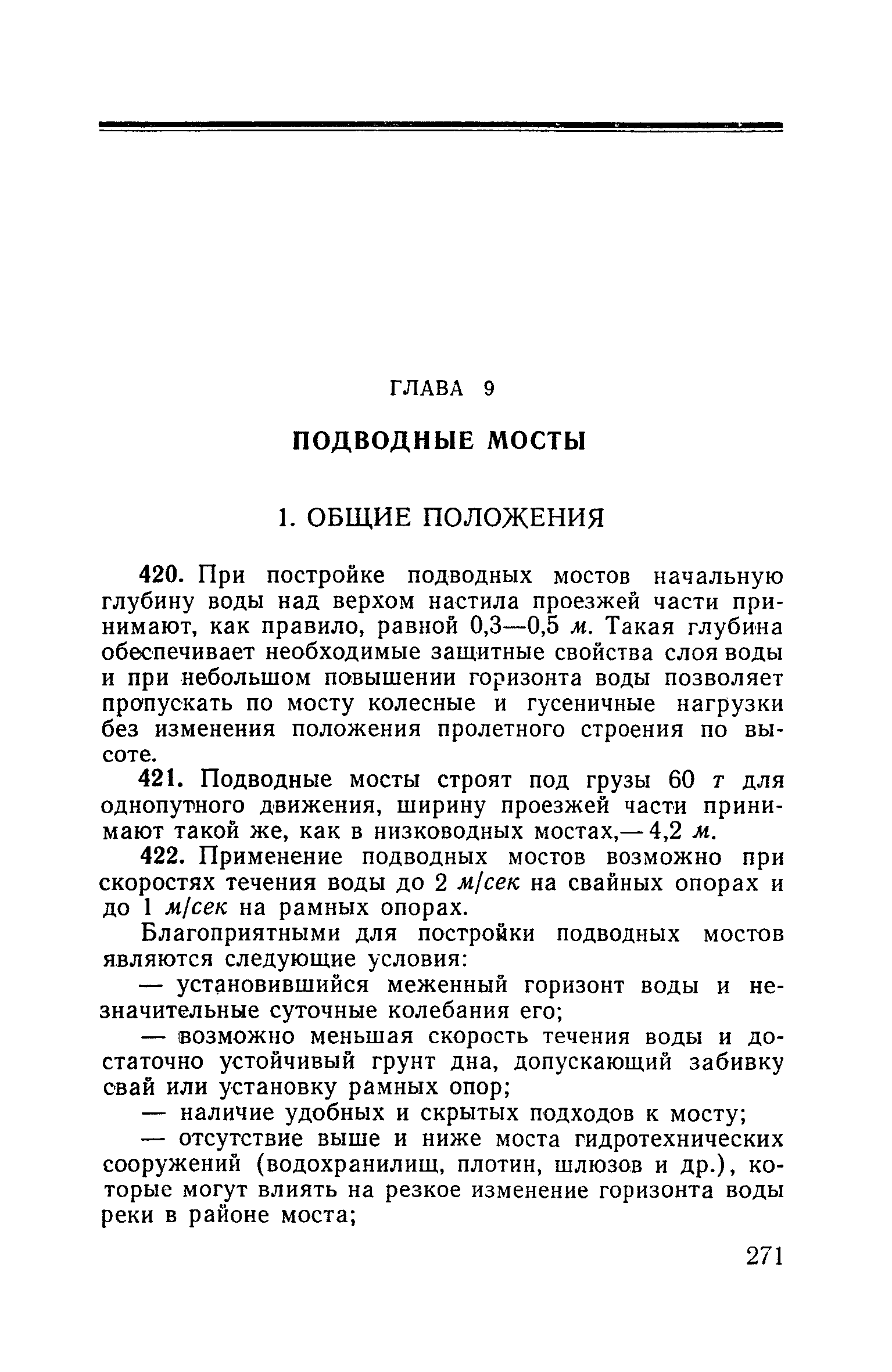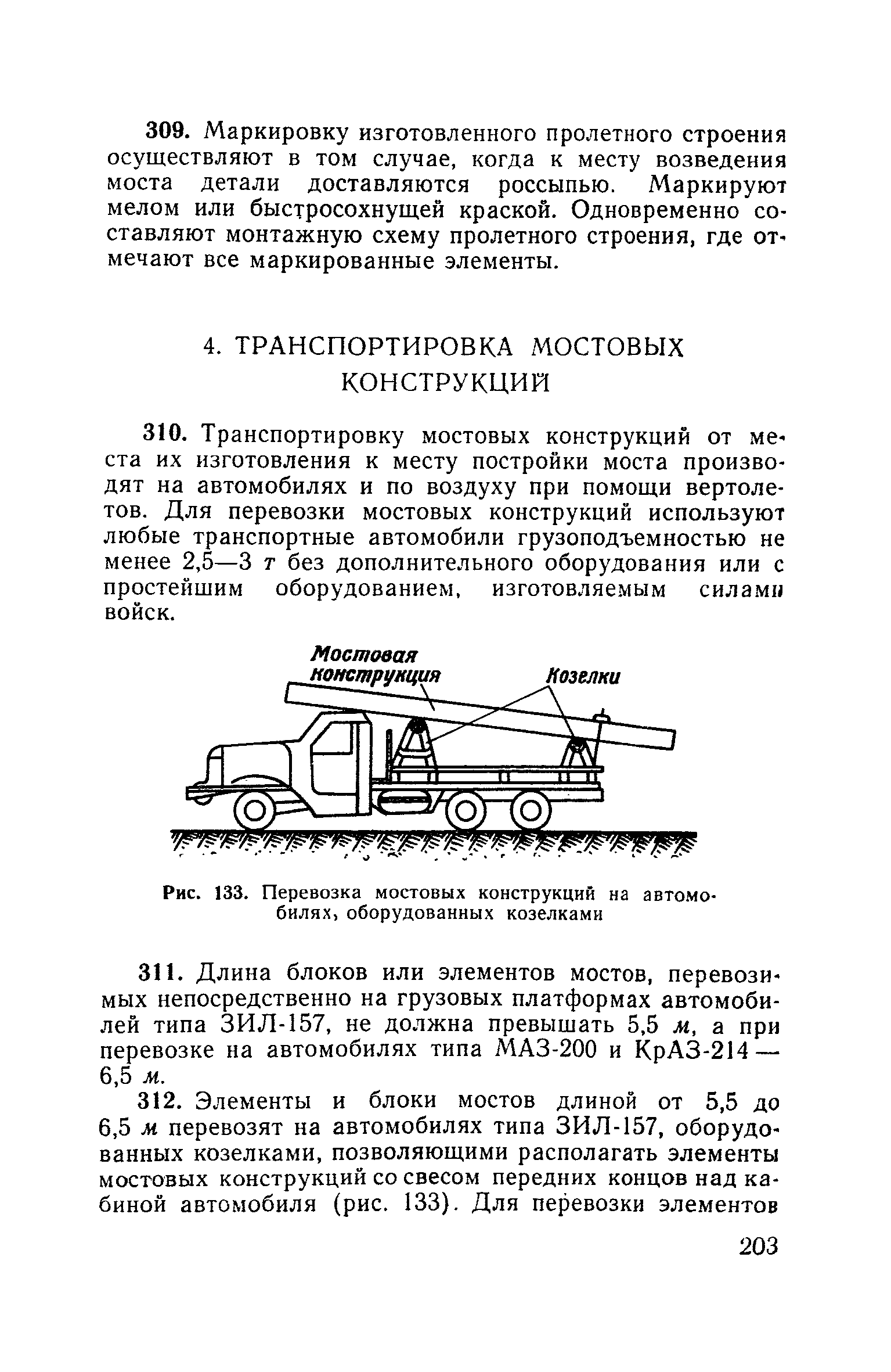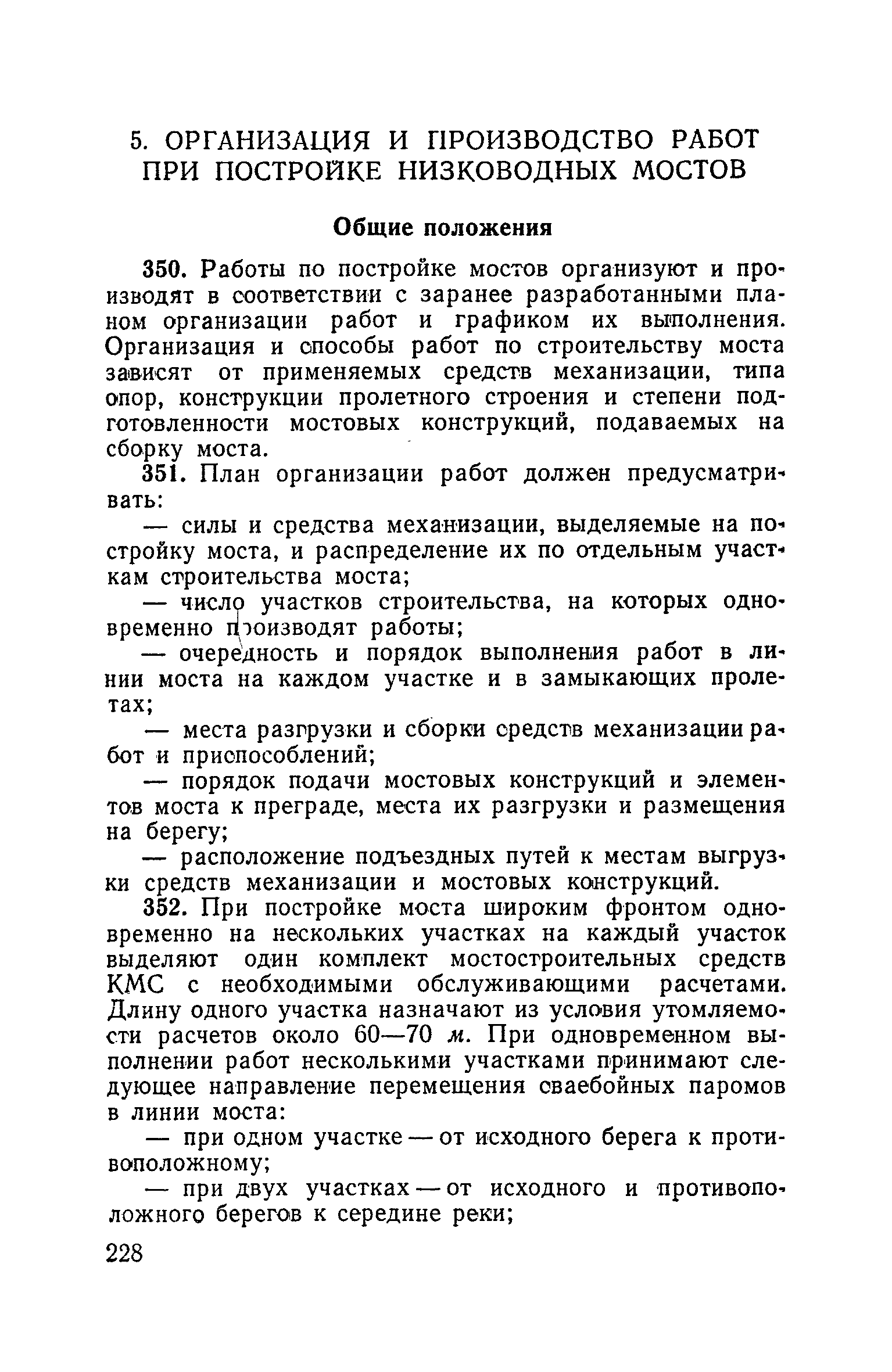 | Оглавление: | Глава 1. Общие положения Глава 2. Инженерная разведка района постройки моста Глава 3. Конструкции деревянных пролетных строений низководных мостов 1. Блочные пролетные строения Пролетные строения из колейных блоков Пролетные строения из блоков прогонов и щитов проезжей части а) Блоки простых прогонов б) Блоки сложных прогонов в) Блоки составных прогонов 2. Пролетные строения из отдельных элементов с простыми и сложными прогонами Проезжая часть Простые прогоны Сложные прогоны Глава 4. Конструкции металлических пролетных строений низководных мостов 1. Блочные пролетные строения Блоки из четырех прогонов Блоки из двух прогонов Проезжая часть 2. Пролетные строения из отдельных элементов Несущая конструкция с простыми прогонами и пакетами Несущая конструкция с составными прогонами Проезжая часть Глава 5. Промежуточные опоры низководных мостов 1. Свайные опоры 2. Рамные деревянные опоры 3. Клеточные опоры 4. Обеспечение продольной устойчивости моста Глава 6. Береговые опоры и сопряжение моста с берегами Глава 7. Изготовление и транспортировка мостовых конструкций 1. Общие положения 2. Изготовление конструкций низководных деревянных мостов Лесозаготовительные работы Лесопильные работы Работы по изготовлению деревянных мостовых конструкций Изготовление колейных блоков Сборка блоков прогонов Изготовление конструкций пролетного строения из блоков прогонов и щитов проезжей части Особенности сборки блоков сложных прогонов Изготовление составных прогонов на стальных цилиндрических нагелях и сборка блоков из двух прогонов Изготовление свай Изготовление насадок и лежней опор Изготовление элементов и сборка рамных опор Особенности изготовления элементов мостовых конструкций при постройке мостов из отдельных элементов 3. Изготовление конструкций металлических мостов Общие положения Изготовление металлических элементов Изготовление элементов проезжей части Изготовление блоков прогонов Изготовление пролетных строений из отдельных элементов 4. Транспортировка мостовых конструкций Глава 8. Постройка низководных мостов 1. Общие положения 2. Разбивка оси моста и осей опор 3. Средства механизации работ при постройке мостов 4. Глубина забивки свай в опорах 5. Организация в производство работ при постройке низководных мостов Общие положения Постройка мостов на свайных опорах при помощи комплекта мостостроительных средств КМС Постройка мостов на свайных опорах при помощи дизель-молотов ДМ-150 с одностреловыми копрами ОСК и дизель-молотов ДБ-45 с приспособлениями ПУС-1 для установки свай Постройка мостов на рамных опорах при помощи паромов с домкратами из комплекта КМС Устройство береговых опор и сопряжений моста с берегами Постройка мостов из отдельных элементов Особенности постройки двухпутных мостов на свайных опорах Особенности постройки мостов на свайных опорах с увеличенными пролетами Глава 9. Подводные мосты 1. Общие положения 2. Особенности конструкции промежуточных опор 3. Береговые опоры и сопряжение подводного моста с берегами 4. Особенности конструкции пролетных строений подводных мостов 5. Особенности постройки подводных мостов на свайных опорах 6. Особенности постройки подводных мостов на рамных опорах 7. Особенности постройки подводных мостов с металлическими прогонами Глава 10. Особенности к