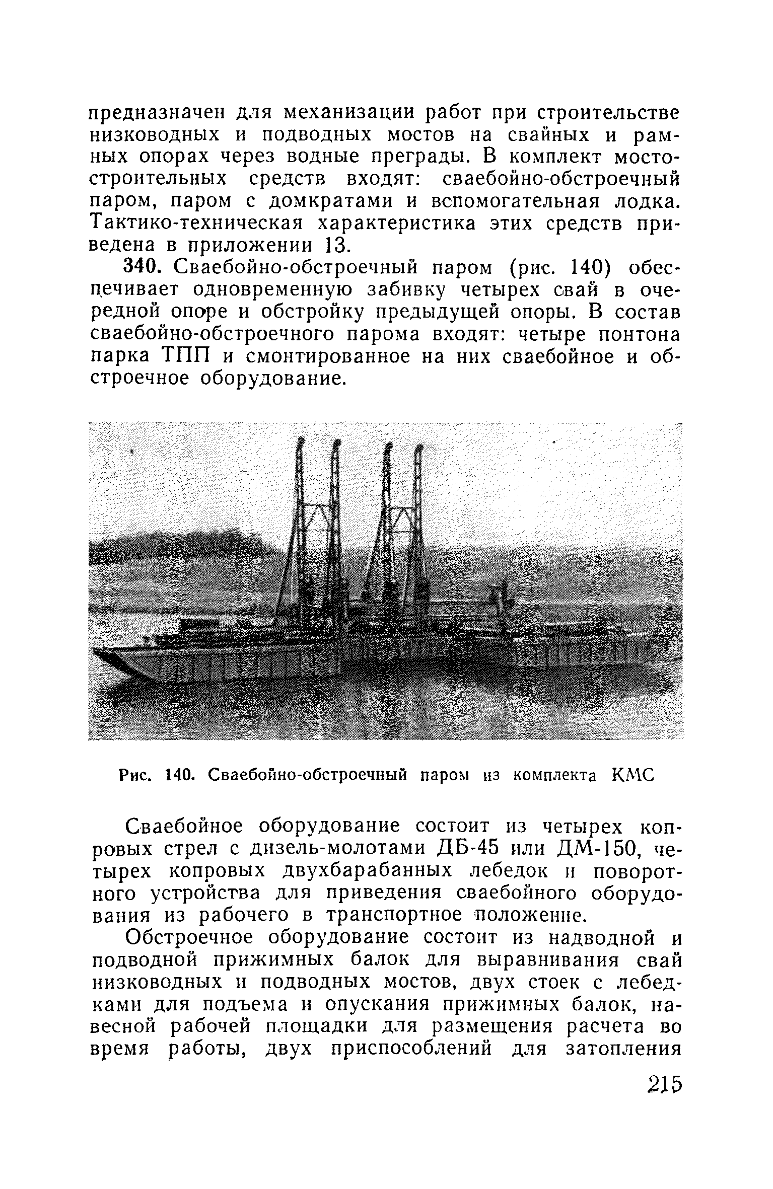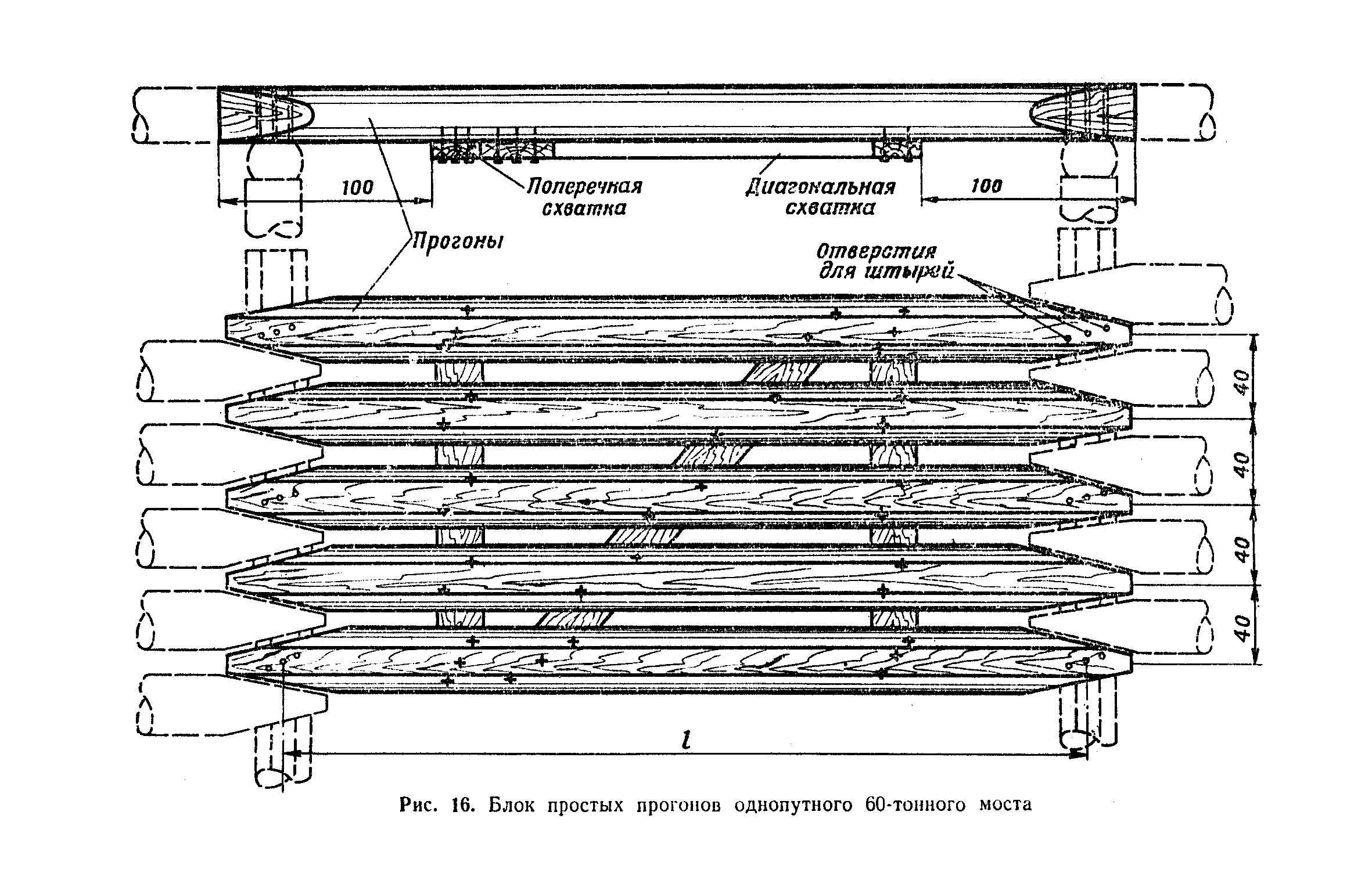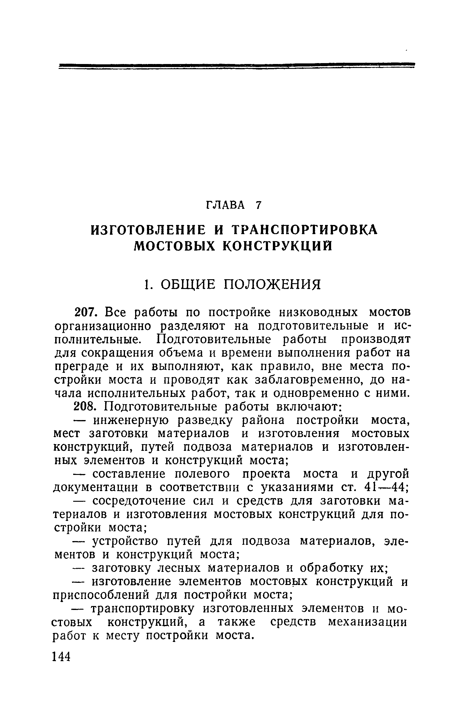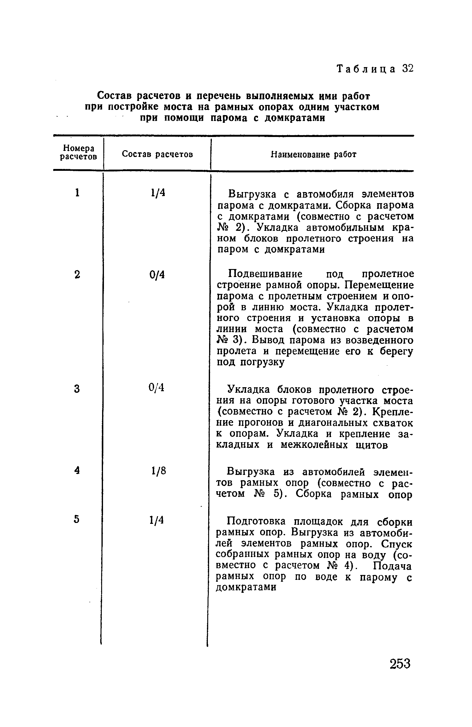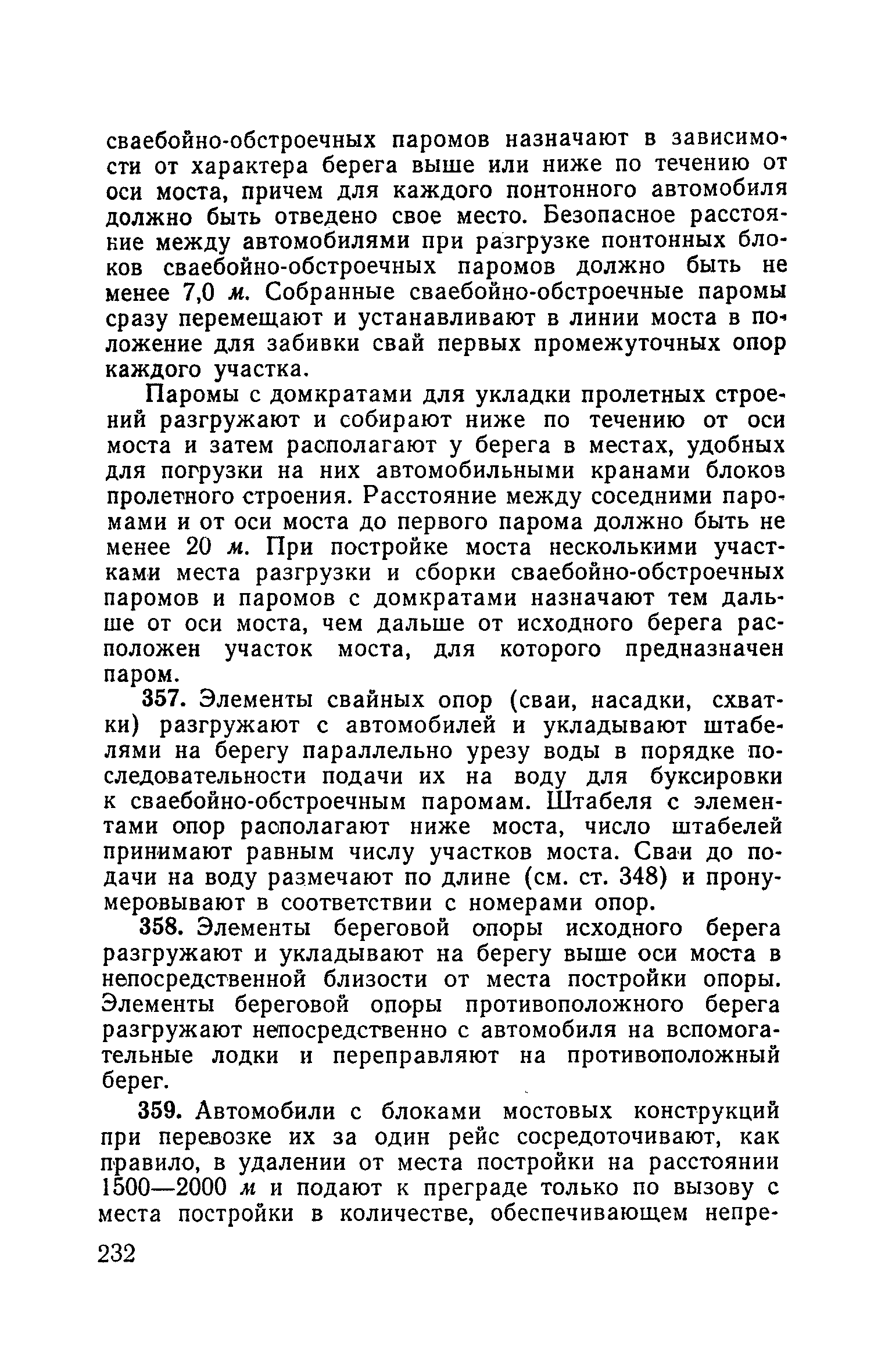 | Оглавление: | Глава 1. Общие положения Глава 2. Инженерная разведка района постройки моста Глава 3. Конструкции деревянных пролетных строений низководных мостов 1. Блочные пролетные строения Пролетные строения из колейных блоков Пролетные строения из блоков прогонов и щитов проезжей части а) Блоки простых прогонов б) Блоки сложных прогонов в) Блоки составных прогонов 2. Пролетные строения из отдельных элементов с простыми и сложными прогонами Проезжая часть Простые прогоны Сложные прогоны Глава 4. Конструкции металлических пролетных строений низководных мостов 1. Блочные пролетные строения Блоки из четырех прогонов Блоки из двух прогонов Проезжая часть 2. Пролетные строения из отдельных элементов Несущая конструкция с простыми прогонами и пакетами Несущая конструкция с составными прогонами Проезжая часть Глава 5. Промежуточные опоры низководных мостов 1. Свайные опоры 2. Рамные деревянные опоры 3. Клеточные опоры 4. Обеспечение продольной устойчивости моста Глава 6. Береговые опоры и сопряжение моста с берегами Глава 7. Изготовление и транспортировка мостовых конструкций 1. Общие положения 2. Изготовление конструкций низководных деревянных мостов Лесозаготовительные работы Лесопильные работы Работы по изготовлению деревянных мостовых конструкций Изготовление колейных блоков Сборка блоков прогонов Изготовление конструкций пролетного строения из блоков прогонов и щитов проезжей части Особенности сборки блоков сложных прогонов Изготовление составных прогонов на стальных цилиндрических нагелях и сборка блоков из двух прогонов Изготовление свай Изготовление насадок и лежней опор Изготовление элементов и сборка рамных опор Особенности изготовления элементов мостовых конструкций при постройке мостов из отдельных элементов 3. Изготовление конструкций металлических мостов Общие положения Изготовление металлических элементов Изготовление элементов проезжей части Изготовление блоков прогонов Изготовление пролетных строений из отдельных элементов 4. Транспортировка мостовых конструкций Глава 8. Постройка низководных мостов 1. Общие положения 2. Разбивка оси моста и осей опор 3. Средства механизации работ при постройке мостов 4. Глубина забивки свай в опорах 5. Организация в производство работ при постройке низководных мостов Общие положения Постройка мостов на свайных опорах при помощи комплекта мостостроительных средств КМС Постройка мостов на свайных опорах при помощи дизель-молотов ДМ-150 с одностреловыми копрами ОСК и дизель-молотов ДБ-45 с приспособлениями ПУС-1 для установки свай Постройка мостов на рамных опорах при помощи паромов с домкратами из комплекта КМС Устройство береговых опор и сопряжений моста с берегами Постройка мостов из отдельных элементов Особенности постройки двухпутных мостов на свайных опорах Особенности постройки мостов на свайных опорах с увеличенными пролетами Глава 9. Подводные мосты 1. Общие положения 2. Особенности конструкции промежуточных опор 3. Береговые опоры и сопряжение подводного моста с берегами 4. Особенности конструкции пролетных строений подводных мостов 5. Особенности постройки подводных мостов на свайных опорах 6. Особенности постройки подводных мостов на рамных опорах 7. Особенности постройки подводных мостов с металлическими прогонами Глава 10. Особенности к