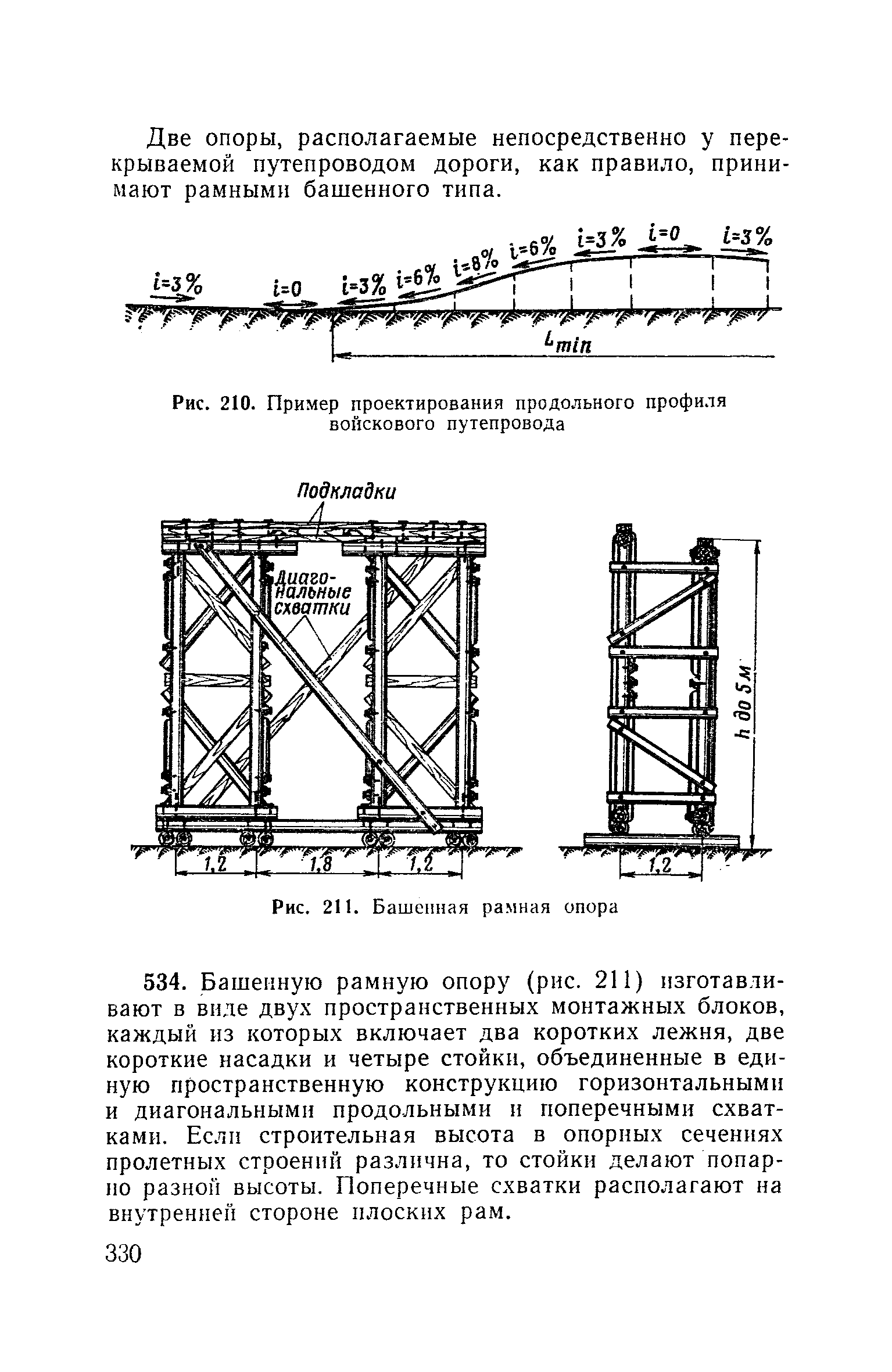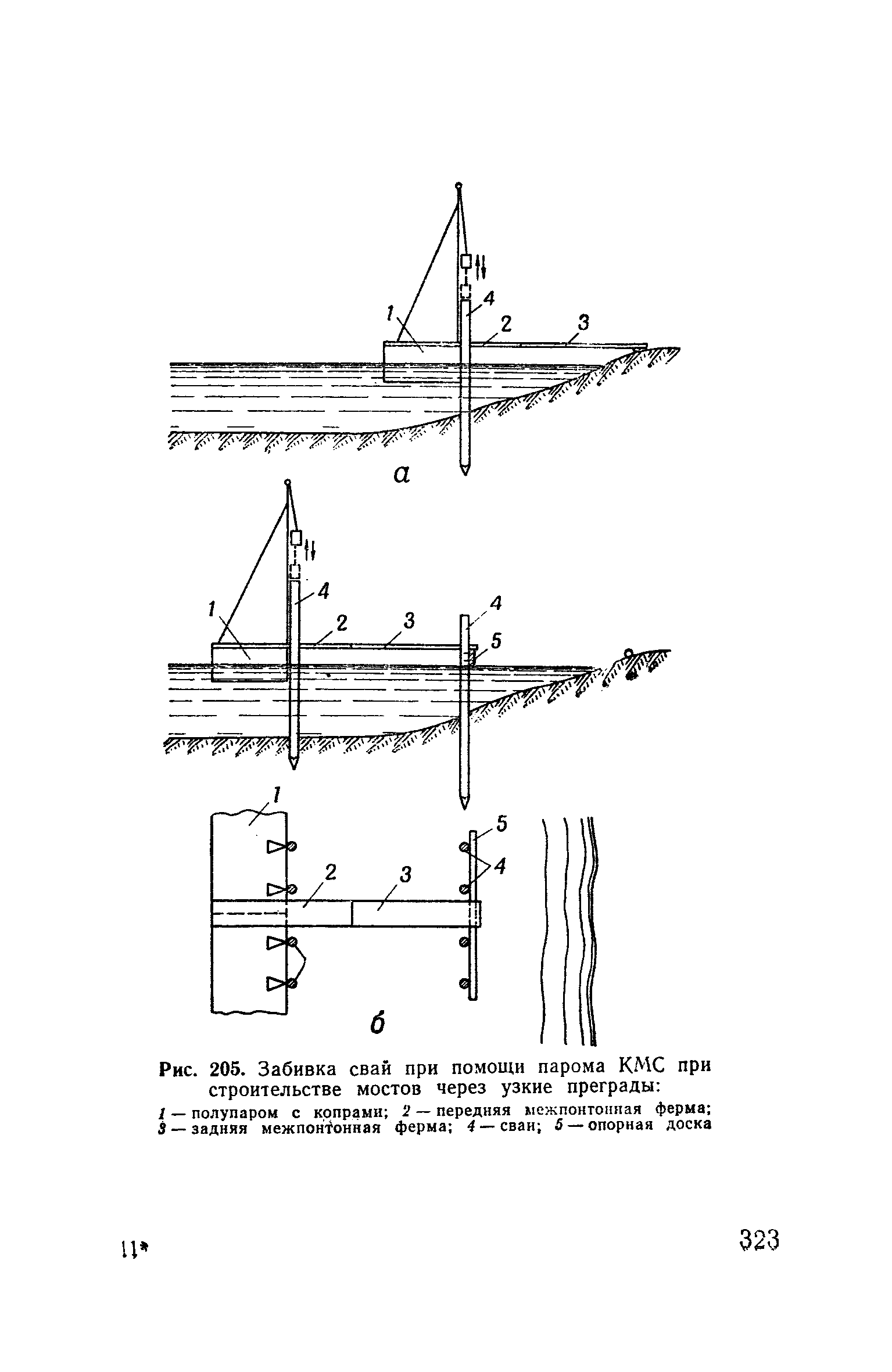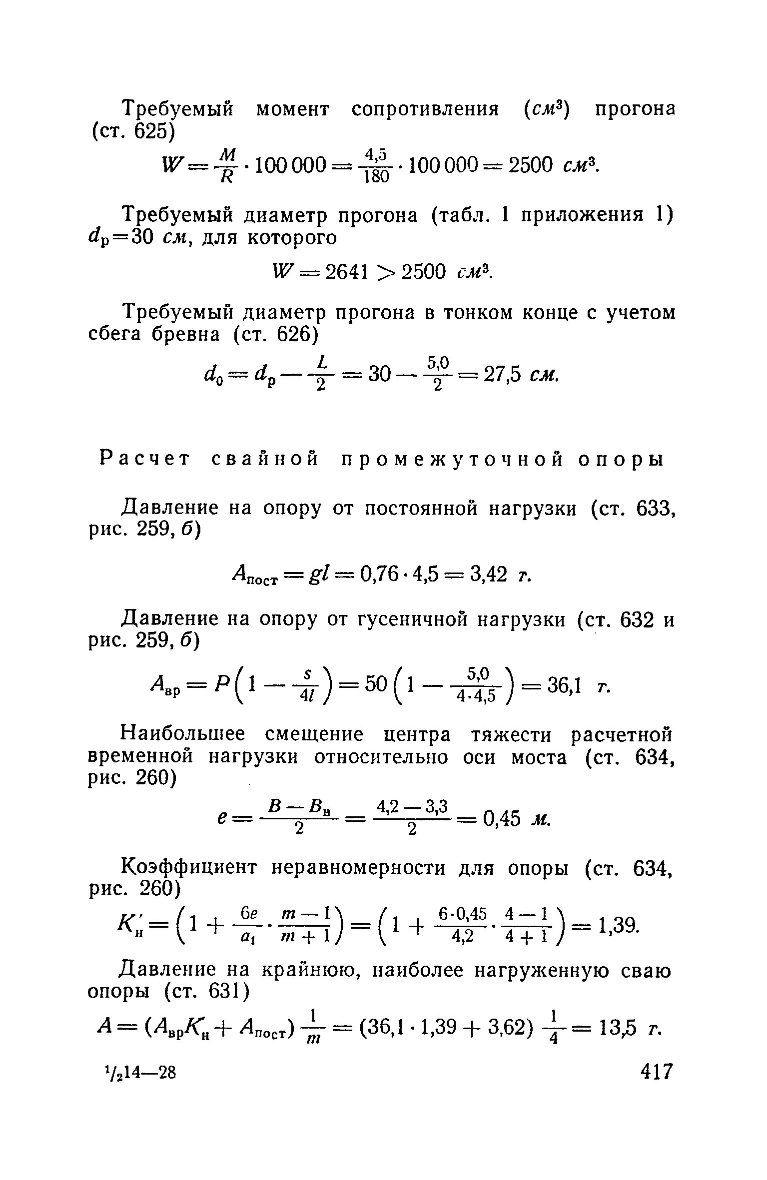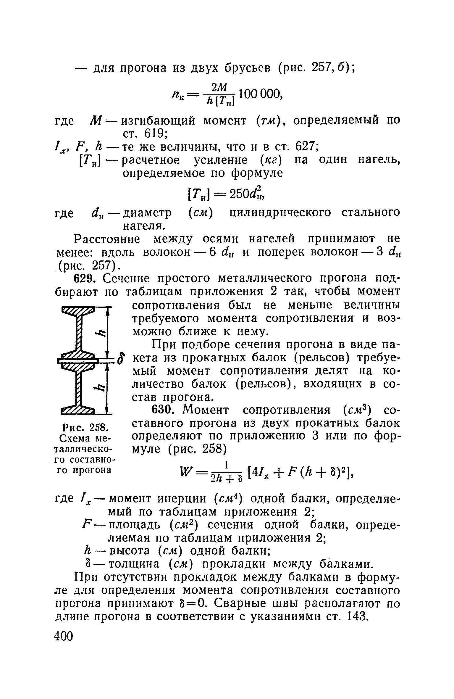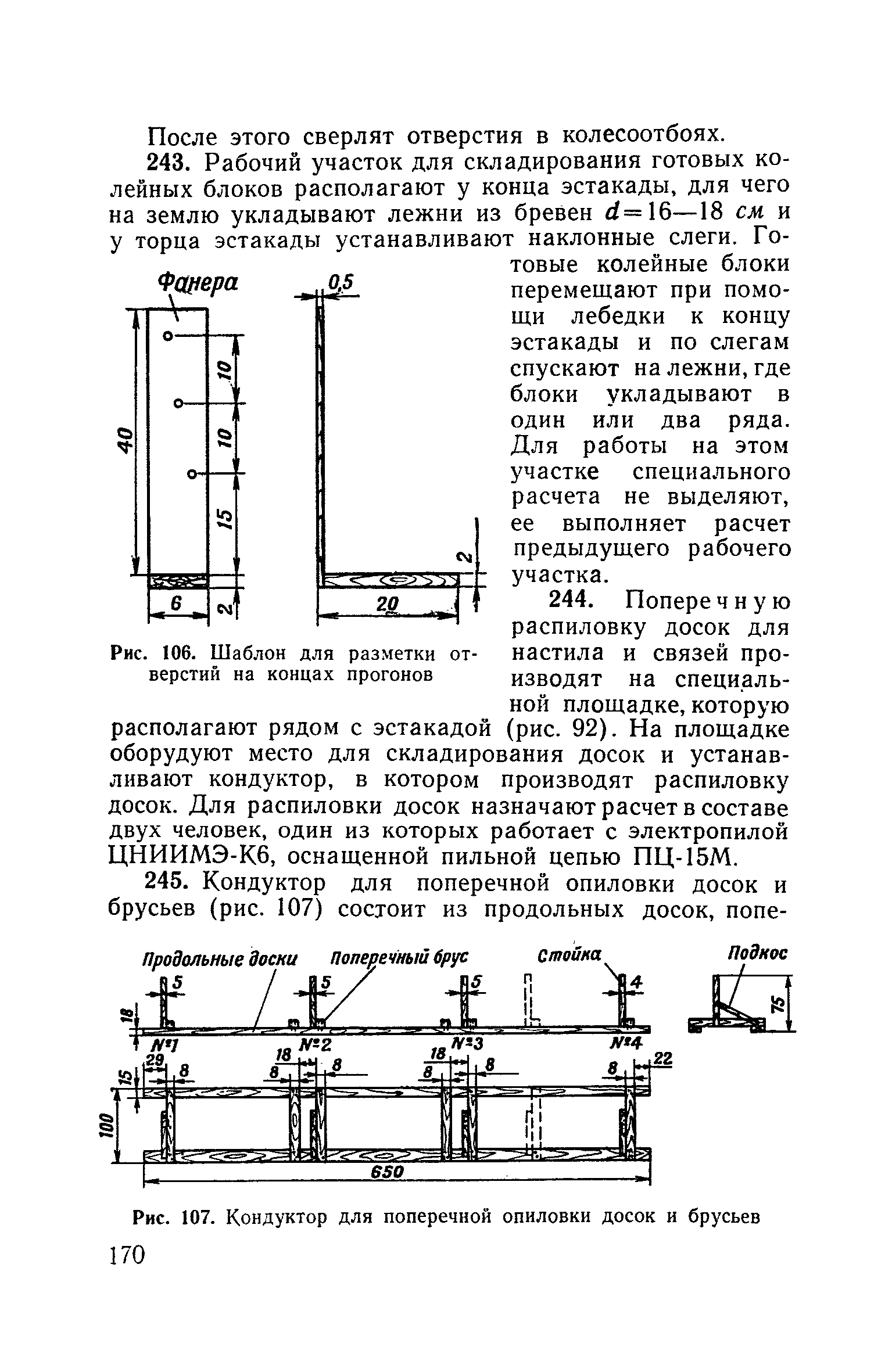 | Оглавление: | Глава 1. Общие положения Глава 2. Инженерная разведка района постройки моста Глава 3. Конструкции деревянных пролетных строений низководных мостов 1. Блочные пролетные строения Пролетные строения из колейных блоков Пролетные строения из блоков прогонов и щитов проезжей части а) Блоки простых прогонов б) Блоки сложных прогонов в) Блоки составных прогонов 2. Пролетные строения из отдельных элементов с простыми и сложными прогонами Проезжая часть Простые прогоны Сложные прогоны Глава 4. Конструкции металлических пролетных строений низководных мостов 1. Блочные пролетные строения Блоки из четырех прогонов Блоки из двух прогонов Проезжая часть 2. Пролетные строения из отдельных элементов Несущая конструкция с простыми прогонами и пакетами Несущая конструкция с составными прогонами Проезжая часть Глава 5. Промежуточные опоры низководных мостов 1. Свайные опоры 2. Рамные деревянные опоры 3. Клеточные опоры 4. Обеспечение продольной устойчивости моста Глава 6. Береговые опоры и сопряжение моста с берегами Глава 7. Изготовление и транспортировка мостовых конструкций 1. Общие положения 2. Изготовление конструкций низководных деревянных мостов Лесозаготовительные работы Лесопильные работы Работы по изготовлению деревянных мостовых конструкций Изготовление колейных блоков Сборка блоков прогонов Изготовление конструкций пролетного строения из блоков прогонов и щитов проезжей части Особенности сборки блоков сложных прогонов Изготовление составных прогонов на стальных цилиндрических нагелях и сборка блоков из двух прогонов Изготовление свай Изготовление насадок и лежней опор Изготовление элементов и сборка рамных опор Особенности изготовления элементов мостовых конструкций при постройке мостов из отдельных элементов 3. Изготовление конструкций металлических мостов Общие положения Изготовление металлических элементов Изготовление элементов проезжей части Изготовление блоков прогонов Изготовление пролетных строений из отдельных элементов 4. Транспортировка мостовых конструкций Глава 8. Постройка низководных мостов 1. Общие положения 2. Разбивка оси моста и осей опор 3. Средства механизации работ при постройке мостов 4. Глубина забивки свай в опорах 5. Организация в производство работ при постройке низководных мостов Общие положения Постройка мостов на свайных опорах при помощи комплекта мостостроительных средств КМС Постройка мостов на свайных опорах при помощи дизель-молотов ДМ-150 с одностреловыми копрами ОСК и дизель-молотов ДБ-45 с приспособлениями ПУС-1 для установки свай Постройка мостов на рамных опорах при помощи паромов с домкратами из комплекта КМС Устройство береговых опор и сопряжений моста с берегами Постройка мостов из отдельных элементов Особенности постройки двухпутных мостов на свайных опорах Особенности постройки мостов на свайных опорах с увеличенными пролетами Глава 9. Подводные мосты 1. Общие положения 2. Особенности конструкции промежуточных опор 3. Береговые опоры и сопряжение подводного моста с берегами 4. Особенности конструкции пролетных строений подводных мостов 5. Особенности постройки подводных мостов на свайных опорах 6. Особенности постройки подводных мостов на рамных опорах 7. Особенности постройки подводных мостов с металлическими прогонами Глава 10. Особенности к