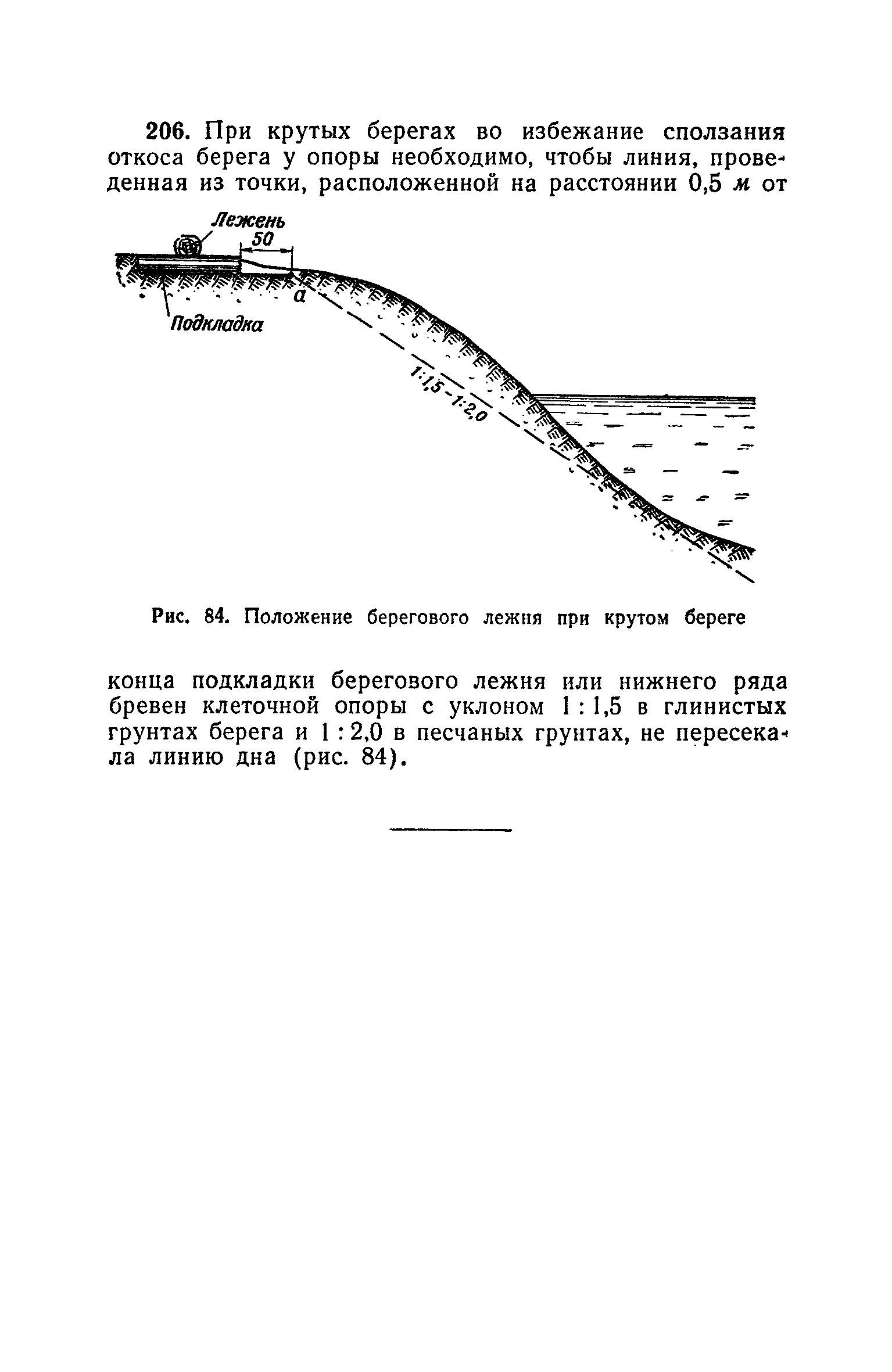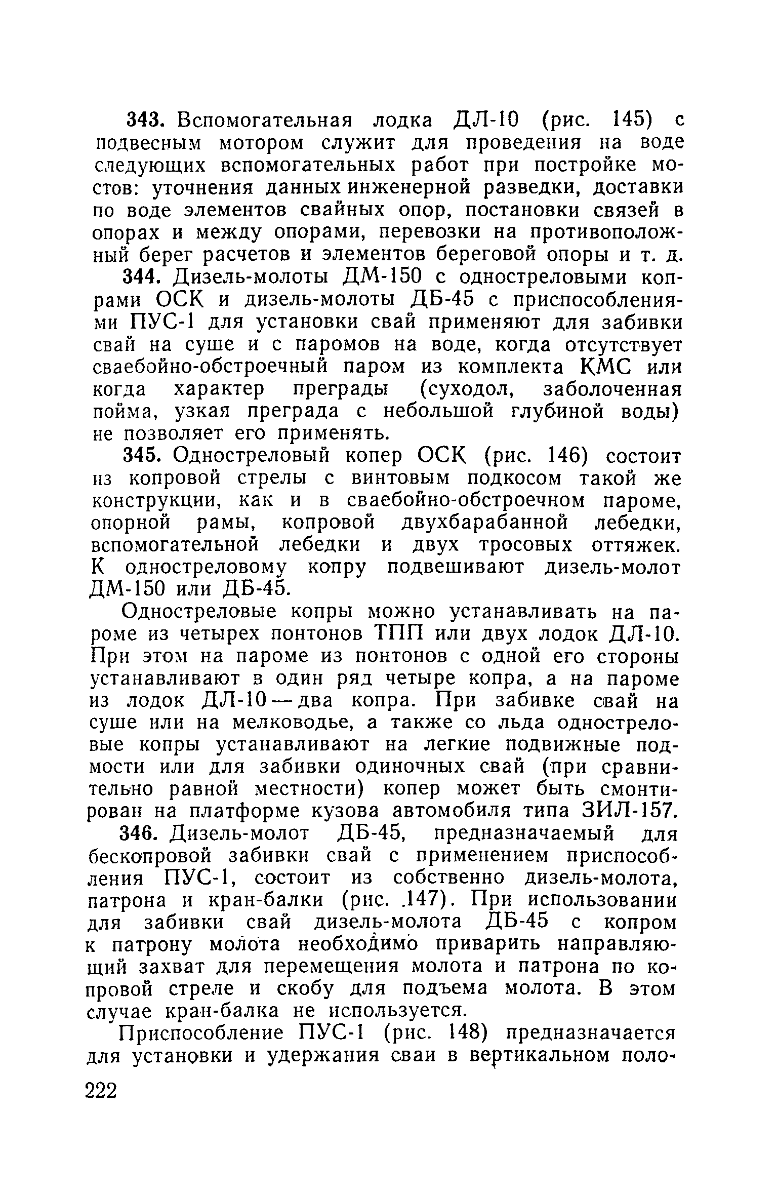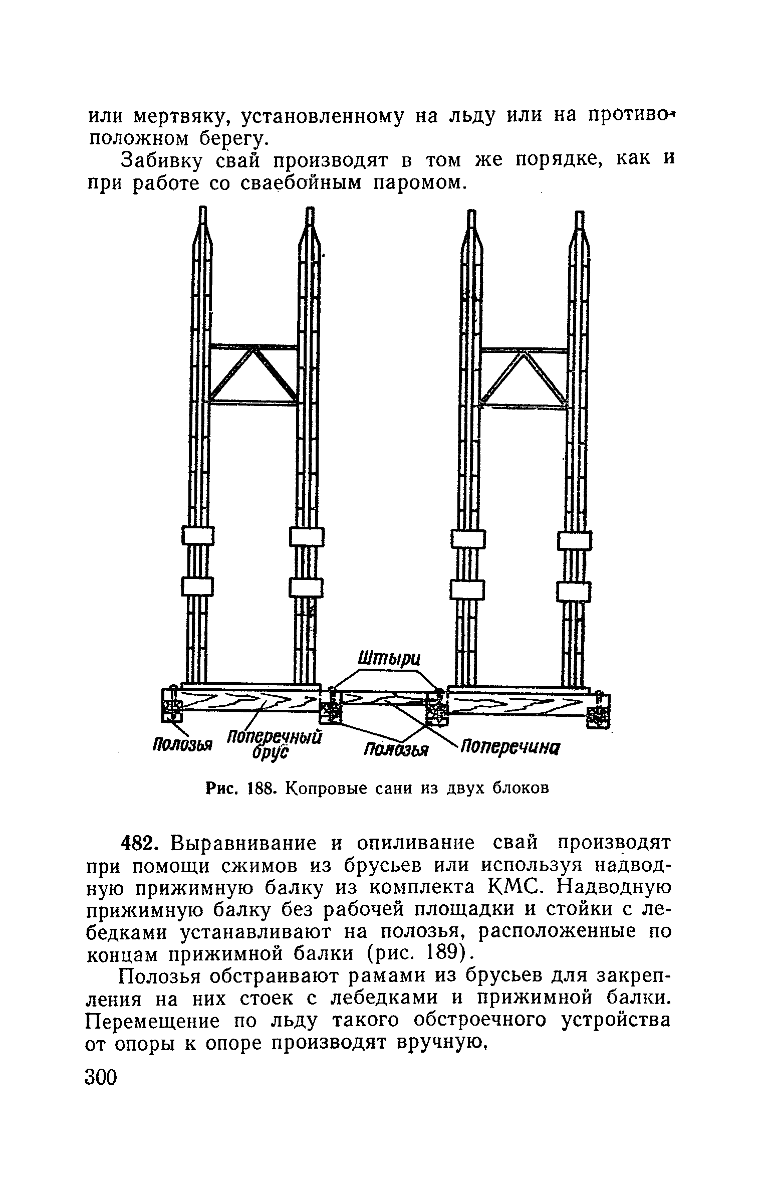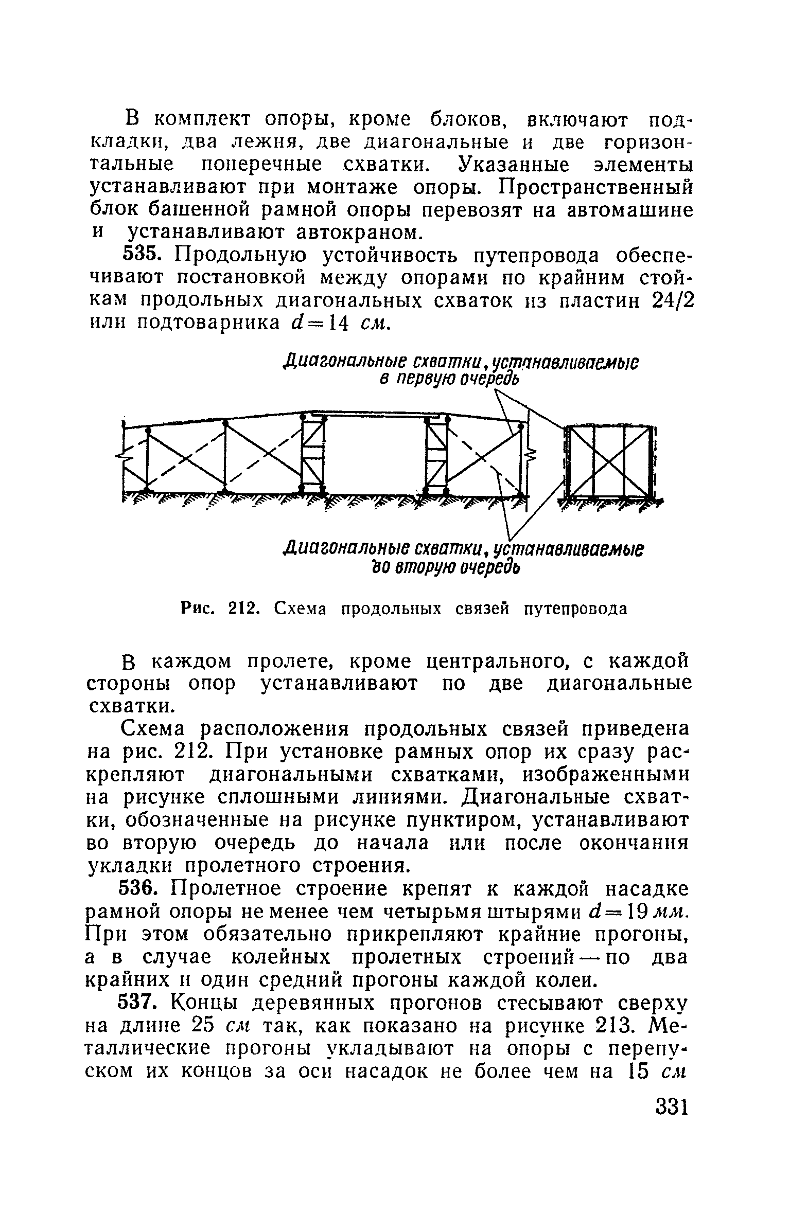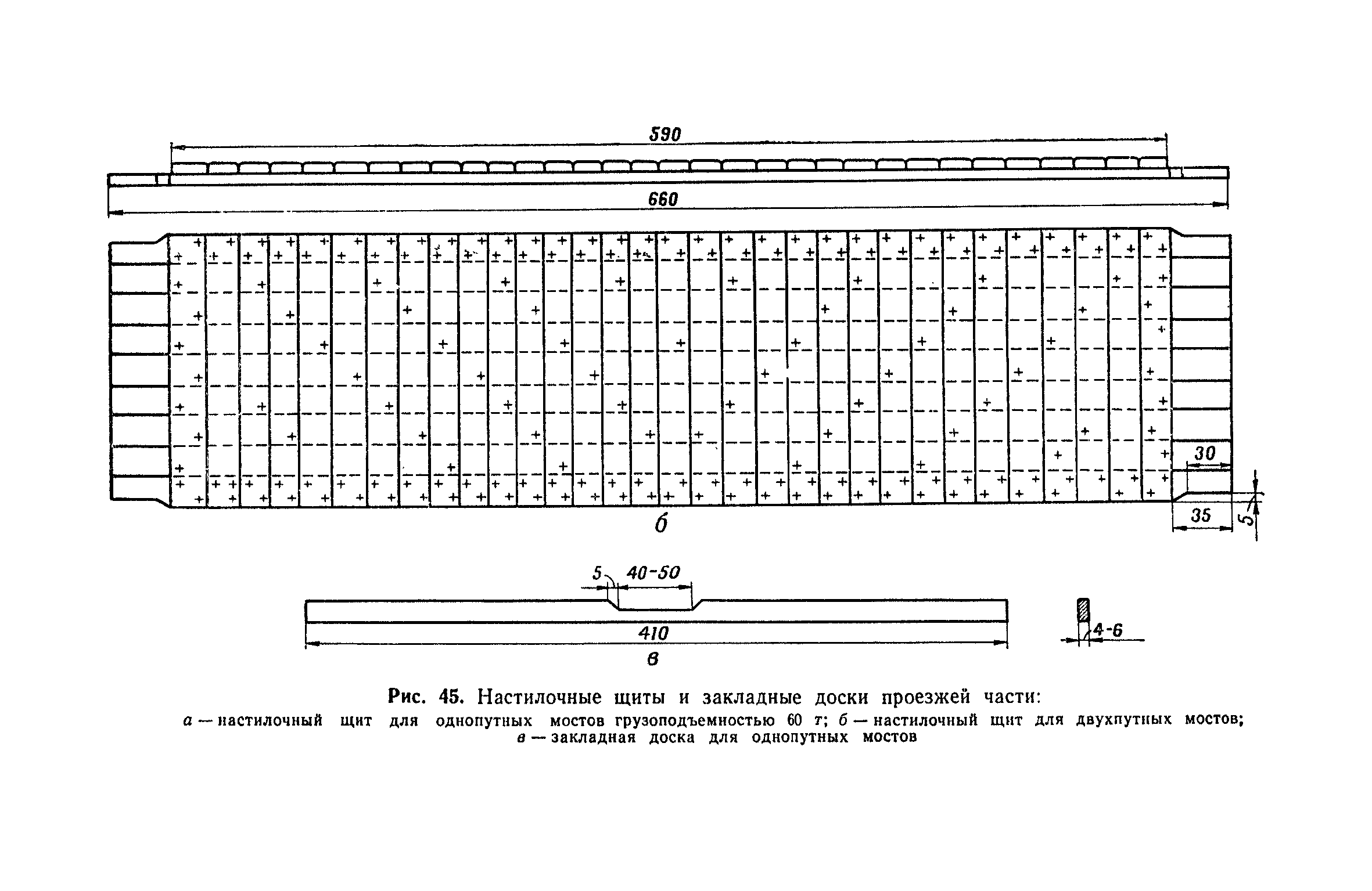 | Оглавление: | Глава 1. Общие положения Глава 2. Инженерная разведка района постройки моста Глава 3. Конструкции деревянных пролетных строений низководных мостов 1. Блочные пролетные строения Пролетные строения из колейных блоков Пролетные строения из блоков прогонов и щитов проезжей части а) Блоки простых прогонов б) Блоки сложных прогонов в) Блоки составных прогонов 2. Пролетные строения из отдельных элементов с простыми и сложными прогонами Проезжая часть Простые прогоны Сложные прогоны Глава 4. Конструкции металлических пролетных строений низководных мостов 1. Блочные пролетные строения Блоки из четырех прогонов Блоки из двух прогонов Проезжая часть 2. Пролетные строения из отдельных элементов Несущая конструкция с простыми прогонами и пакетами Несущая конструкция с составными прогонами Проезжая часть Глава 5. Промежуточные опоры низководных мостов 1. Свайные опоры 2. Рамные деревянные опоры 3. Клеточные опоры 4. Обеспечение продольной устойчивости моста Глава 6. Береговые опоры и сопряжение моста с берегами Глава 7. Изготовление и транспортировка мостовых конструкций 1. Общие положения 2. Изготовление конструкций низководных деревянных мостов Лесозаготовительные работы Лесопильные работы Работы по изготовлению деревянных мостовых конструкций Изготовление колейных блоков Сборка блоков прогонов Изготовление конструкций пролетного строения из блоков прогонов и щитов проезжей части Особенности сборки блоков сложных прогонов Изготовление составных прогонов на стальных цилиндрических нагелях и сборка блоков из двух прогонов Изготовление свай Изготовление насадок и лежней опор Изготовление элементов и сборка рамных опор Особенности изготовления элементов мостовых конструкций при постройке мостов из отдельных элементов 3. Изготовление конструкций металлических мостов Общие положения Изготовление металлических элементов Изготовление элементов проезжей части Изготовление блоков прогонов Изготовление пролетных строений из отдельных элементов 4. Транспортировка мостовых конструкций Глава 8. Постройка низководных мостов 1. Общие положения 2. Разбивка оси моста и осей опор 3. Средства механизации работ при постройке мостов 4. Глубина забивки свай в опорах 5. Организация в производство работ при постройке низководных мостов Общие положения Постройка мостов на свайных опорах при помощи комплекта мостостроительных средств КМС Постройка мостов на свайных опорах при помощи дизель-молотов ДМ-150 с одностреловыми копрами ОСК и дизель-молотов ДБ-45 с приспособлениями ПУС-1 для установки свай Постройка мостов на рамных опорах при помощи паромов с домкратами из комплекта КМС Устройство береговых опор и сопряжений моста с берегами Постройка мостов из отдельных элементов Особенности постройки двухпутных мостов на свайных опорах Особенности постройки мостов на свайных опорах с увеличенными пролетами Глава 9. Подводные мосты 1. Общие положения 2. Особенности конструкции промежуточных опор 3. Береговые опоры и сопряжение подводного моста с берегами 4. Особенности конструкции пролетных строений подводных мостов 5. Особенности постройки подводных мостов на свайных опорах 6. Особенности постройки подводных мостов на рамных опорах 7. Особенности постройки подводных мостов с металлическими прогонами Глава 10. Особенности к