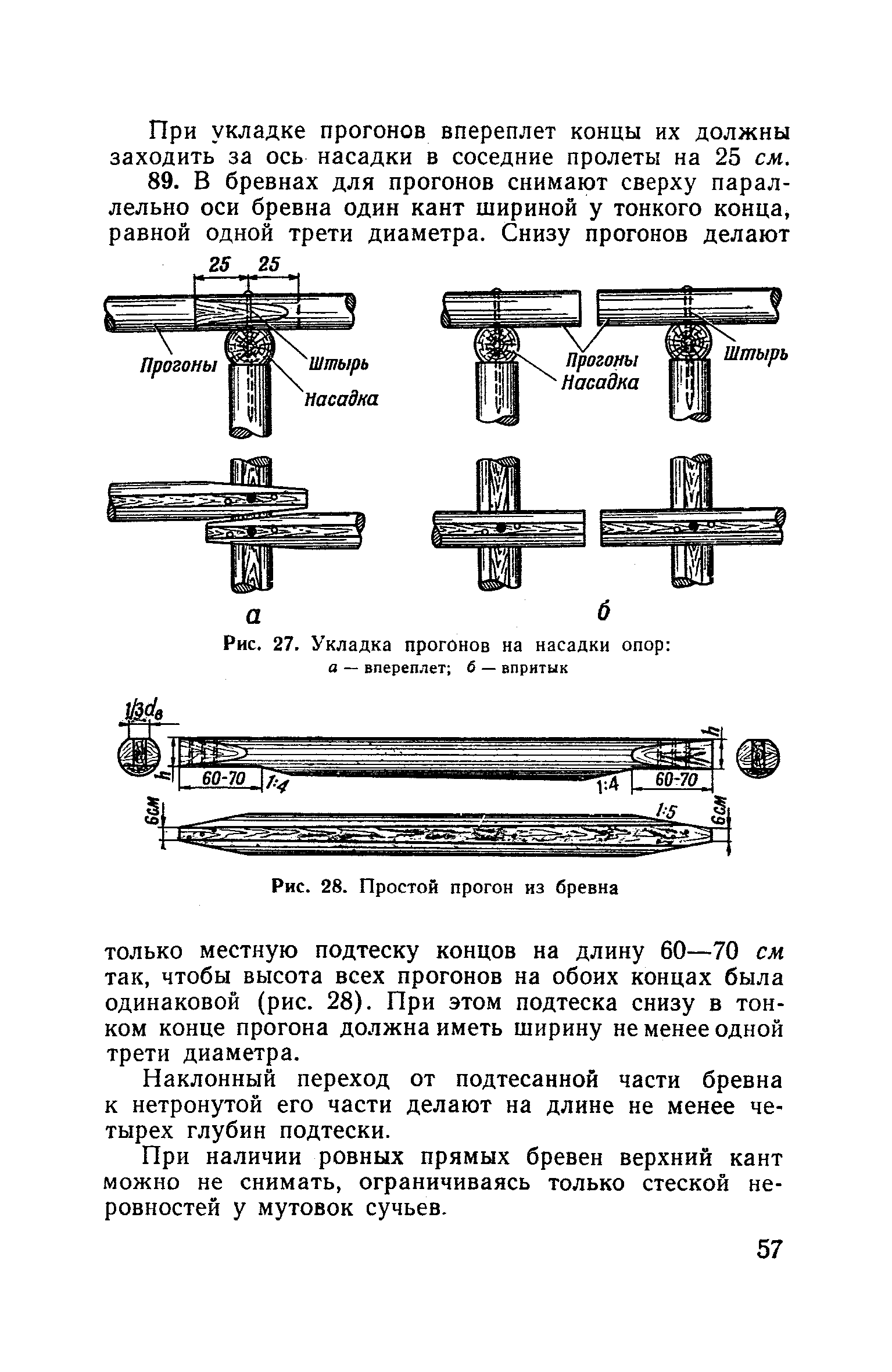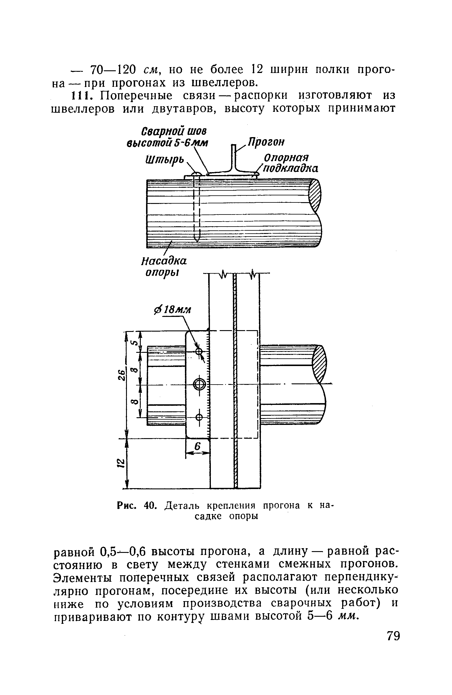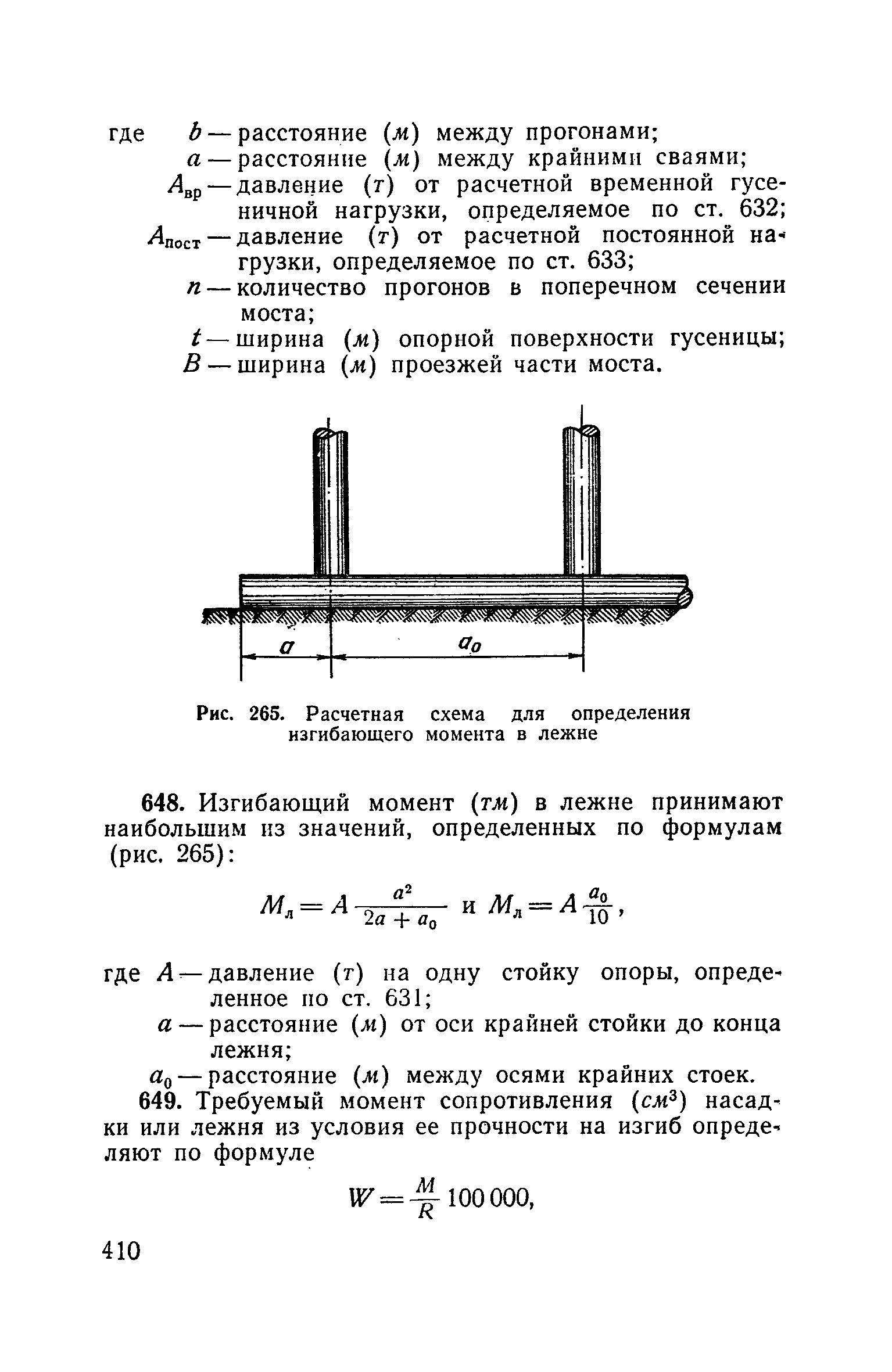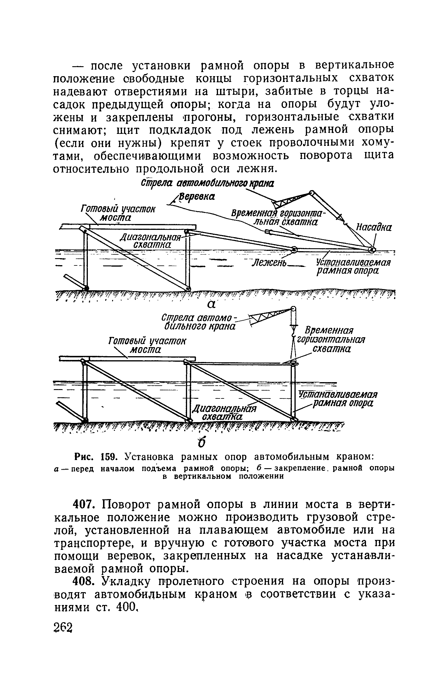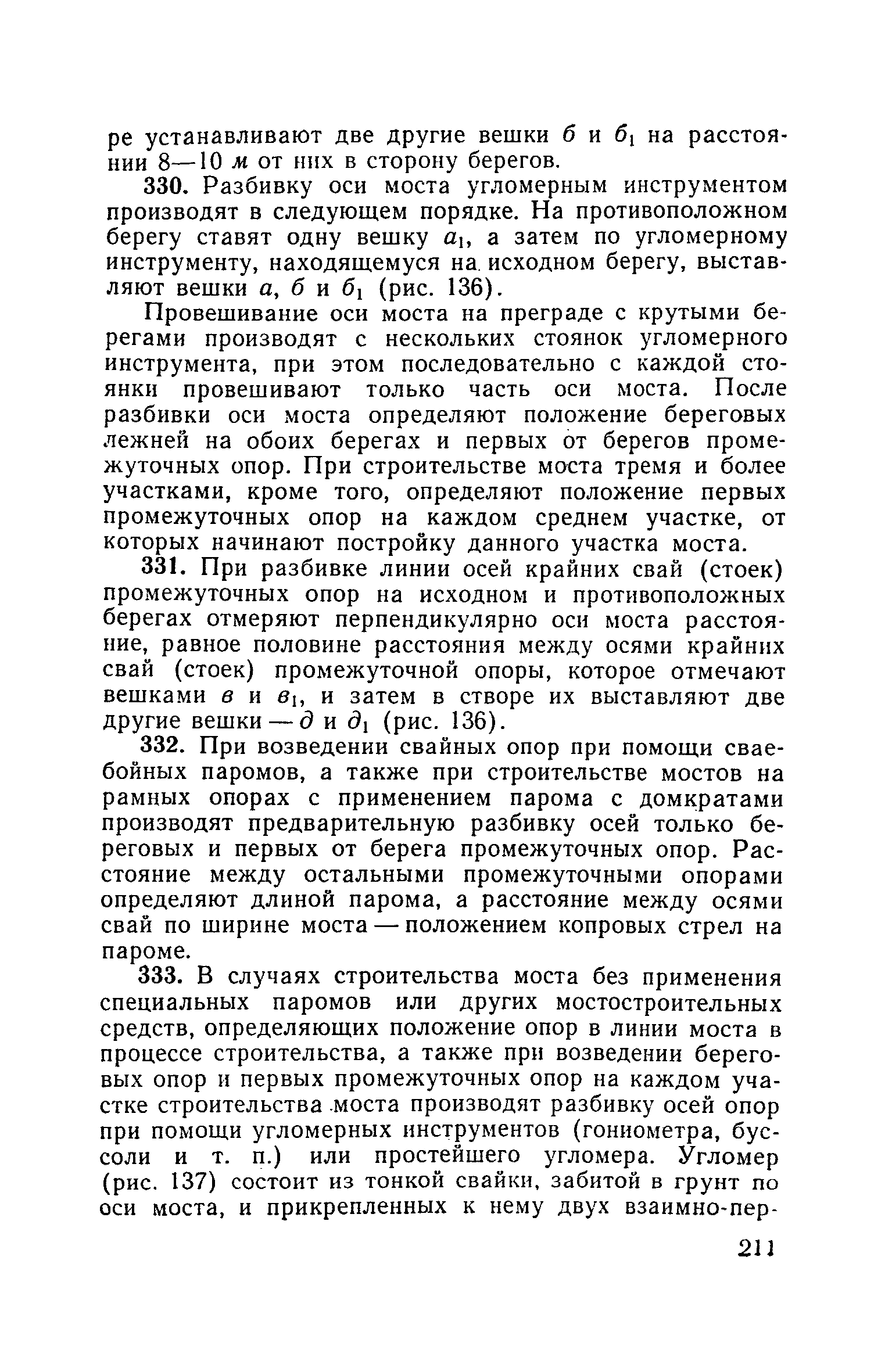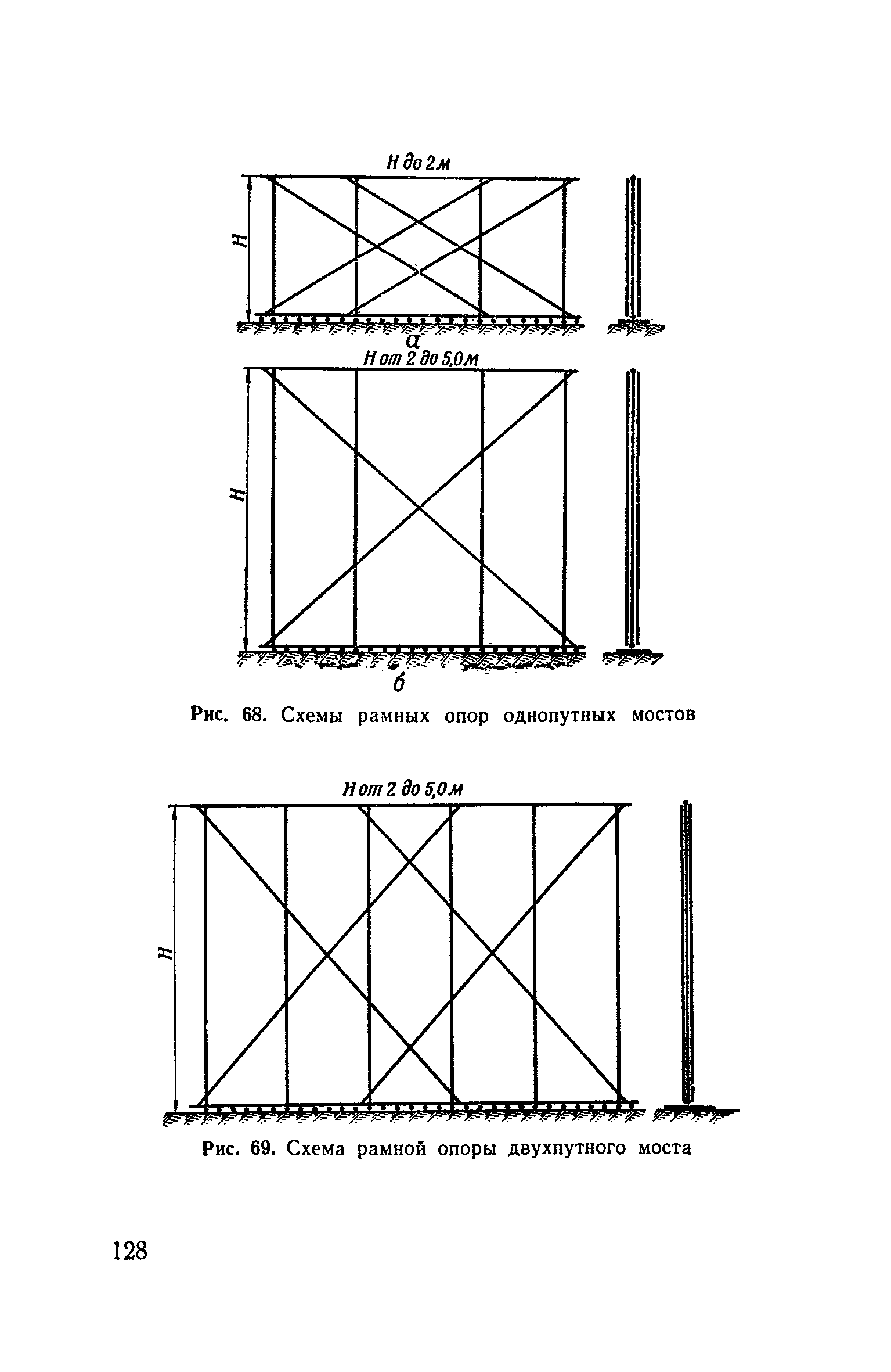 | Оглавление: | Глава 1. Общие положения Глава 2. Инженерная разведка района постройки моста Глава 3. Конструкции деревянных пролетных строений низководных мостов 1. Блочные пролетные строения Пролетные строения из колейных блоков Пролетные строения из блоков прогонов и щитов проезжей части а) Блоки простых прогонов б) Блоки сложных прогонов в) Блоки составных прогонов 2. Пролетные строения из отдельных элементов с простыми и сложными прогонами Проезжая часть Простые прогоны Сложные прогоны Глава 4. Конструкции металлических пролетных строений низководных мостов 1. Блочные пролетные строения Блоки из четырех прогонов Блоки из двух прогонов Проезжая часть 2. Пролетные строения из отдельных элементов Несущая конструкция с простыми прогонами и пакетами Несущая конструкция с составными прогонами Проезжая часть Глава 5. Промежуточные опоры низководных мостов 1. Свайные опоры 2. Рамные деревянные опоры 3. Клеточные опоры 4. Обеспечение продольной устойчивости моста Глава 6. Береговые опоры и сопряжение моста с берегами Глава 7. Изготовление и транспортировка мостовых конструкций 1. Общие положения 2. Изготовление конструкций низководных деревянных мостов Лесозаготовительные работы Лесопильные работы Работы по изготовлению деревянных мостовых конструкций Изготовление колейных блоков Сборка блоков прогонов Изготовление конструкций пролетного строения из блоков прогонов и щитов проезжей части Особенности сборки блоков сложных прогонов Изготовление составных прогонов на стальных цилиндрических нагелях и сборка блоков из двух прогонов Изготовление свай Изготовление насадок и лежней опор Изготовление элементов и сборка рамных опор Особенности изготовления элементов мостовых конструкций при постройке мостов из отдельных элементов 3. Изготовление конструкций металлических мостов Общие положения Изготовление металлических элементов Изготовление элементов проезжей части Изготовление блоков прогонов Изготовление пролетных строений из отдельных элементов 4. Транспортировка мостовых конструкций Глава 8. Постройка низководных мостов 1. Общие положения 2. Разбивка оси моста и осей опор 3. Средства механизации работ при постройке мостов 4. Глубина забивки свай в опорах 5. Организация в производство работ при постройке низководных мостов Общие положения Постройка мостов на свайных опорах при помощи комплекта мостостроительных средств КМС Постройка мостов на свайных опорах при помощи дизель-молотов ДМ-150 с одностреловыми копрами ОСК и дизель-молотов ДБ-45 с приспособлениями ПУС-1 для установки свай Постройка мостов на рамных опорах при помощи паромов с домкратами из комплекта КМС Устройство береговых опор и сопряжений моста с берегами Постройка мостов из отдельных элементов Особенности постройки двухпутных мостов на свайных опорах Особенности постройки мостов на свайных опорах с увеличенными пролетами Глава 9. Подводные мосты 1. Общие положения 2. Особенности конструкции промежуточных опор 3. Береговые опоры и сопряжение подводного моста с берегами 4. Особенности конструкции пролетных строений подводных мостов 5. Особенности постройки подводных мостов на свайных опорах 6. Особенности постройки подводных мостов на рамных опорах 7. Особенности постройки подводных мостов с металлическими прогонами Глава 10. Особенности к