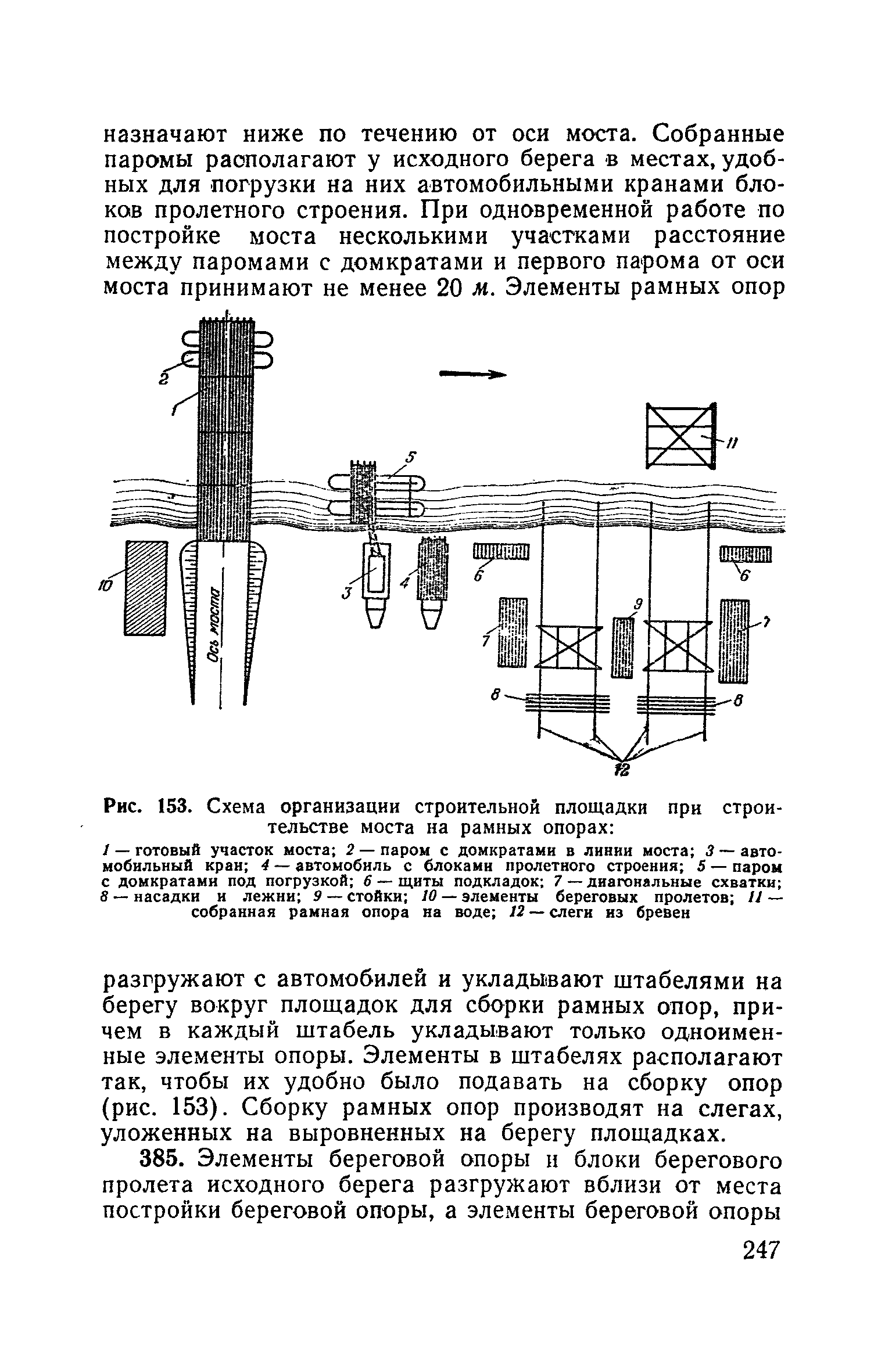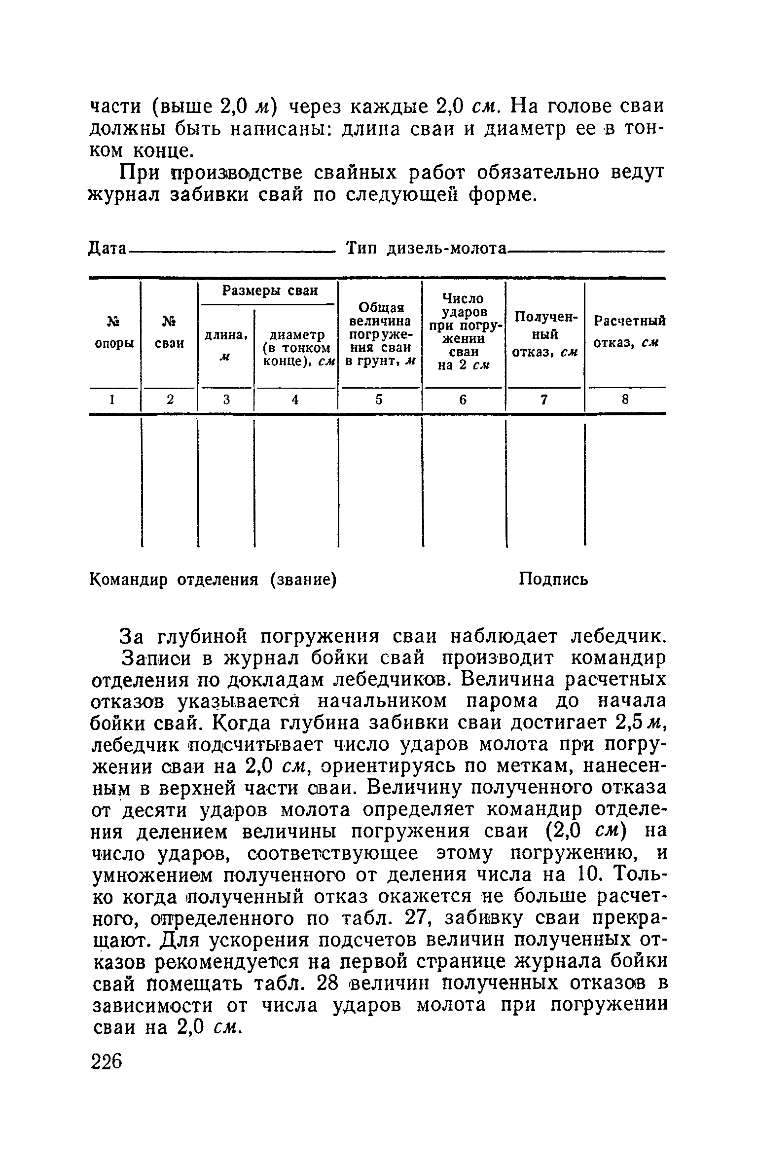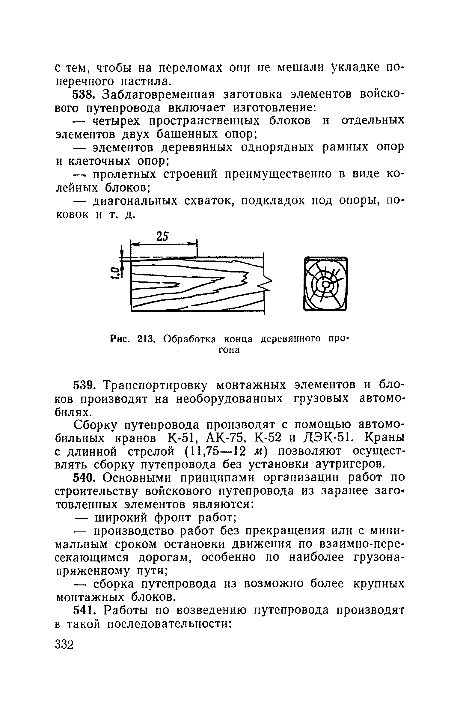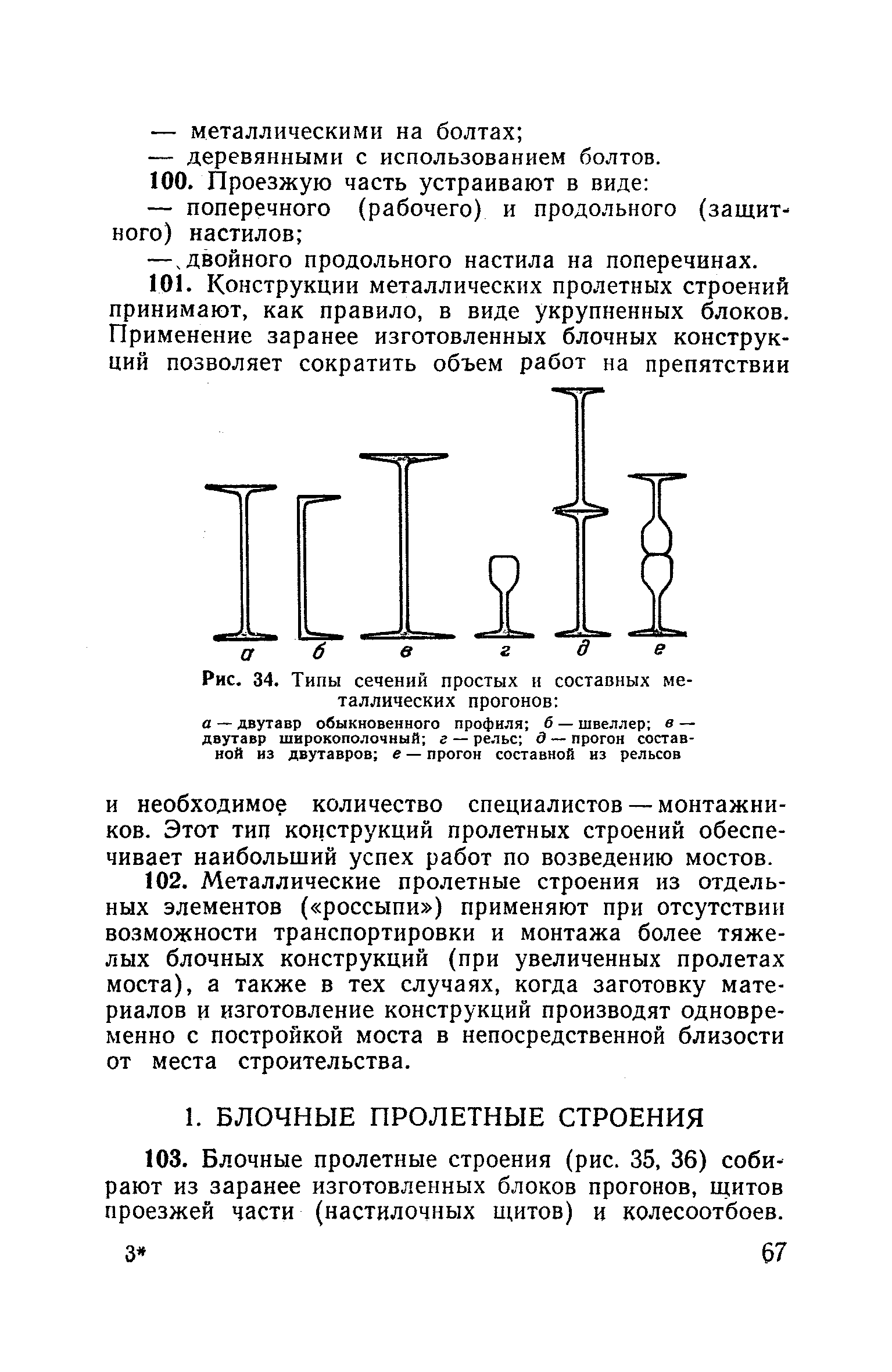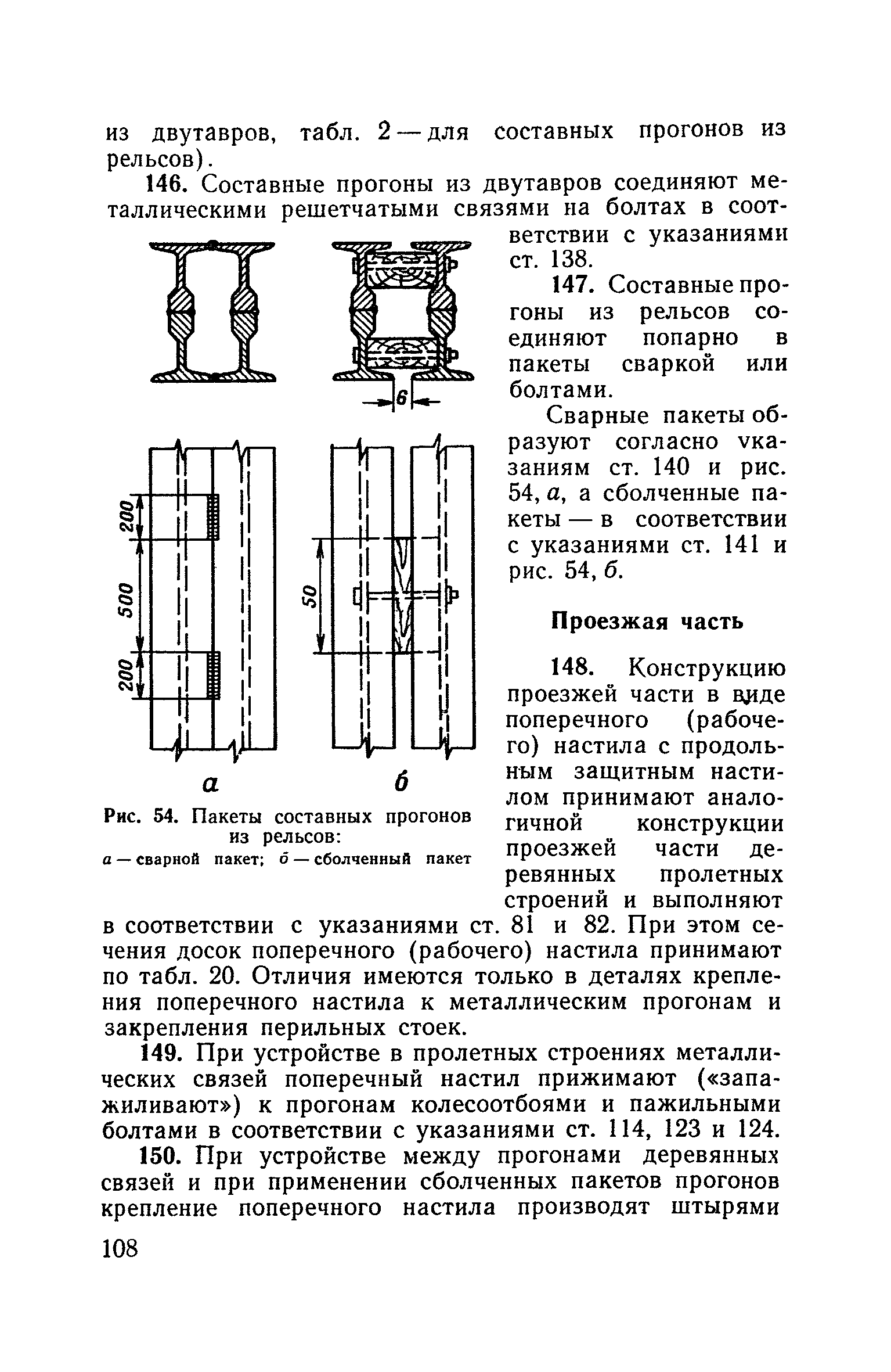 | Оглавление: | Глава 1. Общие положения Глава 2. Инженерная разведка района постройки моста Глава 3. Конструкции деревянных пролетных строений низководных мостов 1. Блочные пролетные строения Пролетные строения из колейных блоков Пролетные строения из блоков прогонов и щитов проезжей части а) Блоки простых прогонов б) Блоки сложных прогонов в) Блоки составных прогонов 2. Пролетные строения из отдельных элементов с простыми и сложными прогонами Проезжая часть Простые прогоны Сложные прогоны Глава 4. Конструкции металлических пролетных строений низководных мостов 1. Блочные пролетные строения Блоки из четырех прогонов Блоки из двух прогонов Проезжая часть 2. Пролетные строения из отдельных элементов Несущая конструкция с простыми прогонами и пакетами Несущая конструкция с составными прогонами Проезжая часть Глава 5. Промежуточные опоры низководных мостов 1. Свайные опоры 2. Рамные деревянные опоры 3. Клеточные опоры 4. Обеспечение продольной устойчивости моста Глава 6. Береговые опоры и сопряжение моста с берегами Глава 7. Изготовление и транспортировка мостовых конструкций 1. Общие положения 2. Изготовление конструкций низководных деревянных мостов Лесозаготовительные работы Лесопильные работы Работы по изготовлению деревянных мостовых конструкций Изготовление колейных блоков Сборка блоков прогонов Изготовление конструкций пролетного строения из блоков прогонов и щитов проезжей части Особенности сборки блоков сложных прогонов Изготовление составных прогонов на стальных цилиндрических нагелях и сборка блоков из двух прогонов Изготовление свай Изготовление насадок и лежней опор Изготовление элементов и сборка рамных опор Особенности изготовления элементов мостовых конструкций при постройке мостов из отдельных элементов 3. Изготовление конструкций металлических мостов Общие положения Изготовление металлических элементов Изготовление элементов проезжей части Изготовление блоков прогонов Изготовление пролетных строений из отдельных элементов 4. Транспортировка мостовых конструкций Глава 8. Постройка низководных мостов 1. Общие положения 2. Разбивка оси моста и осей опор 3. Средства механизации работ при постройке мостов 4. Глубина забивки свай в опорах 5. Организация в производство работ при постройке низководных мостов Общие положения Постройка мостов на свайных опорах при помощи комплекта мостостроительных средств КМС Постройка мостов на свайных опорах при помощи дизель-молотов ДМ-150 с одностреловыми копрами ОСК и дизель-молотов ДБ-45 с приспособлениями ПУС-1 для установки свай Постройка мостов на рамных опорах при помощи паромов с домкратами из комплекта КМС Устройство береговых опор и сопряжений моста с берегами Постройка мостов из отдельных элементов Особенности постройки двухпутных мостов на свайных опорах Особенности постройки мостов на свайных опорах с увеличенными пролетами Глава 9. Подводные мосты 1. Общие положения 2. Особенности конструкции промежуточных опор 3. Береговые опоры и сопряжение подводного моста с берегами 4. Особенности конструкции пролетных строений подводных мостов 5. Особенности постройки подводных мостов на свайных опорах 6. Особенности постройки подводных мостов на рамных опорах 7. Особенности постройки подводных мостов с металлическими прогонами Глава 10. Особенности к