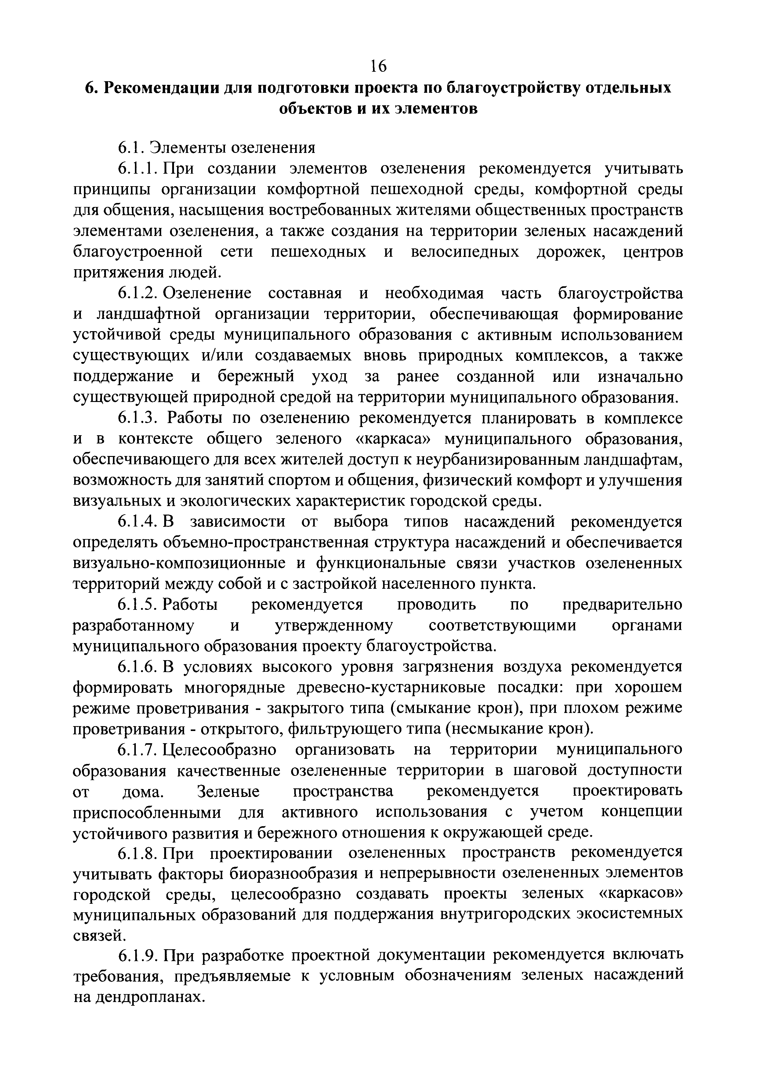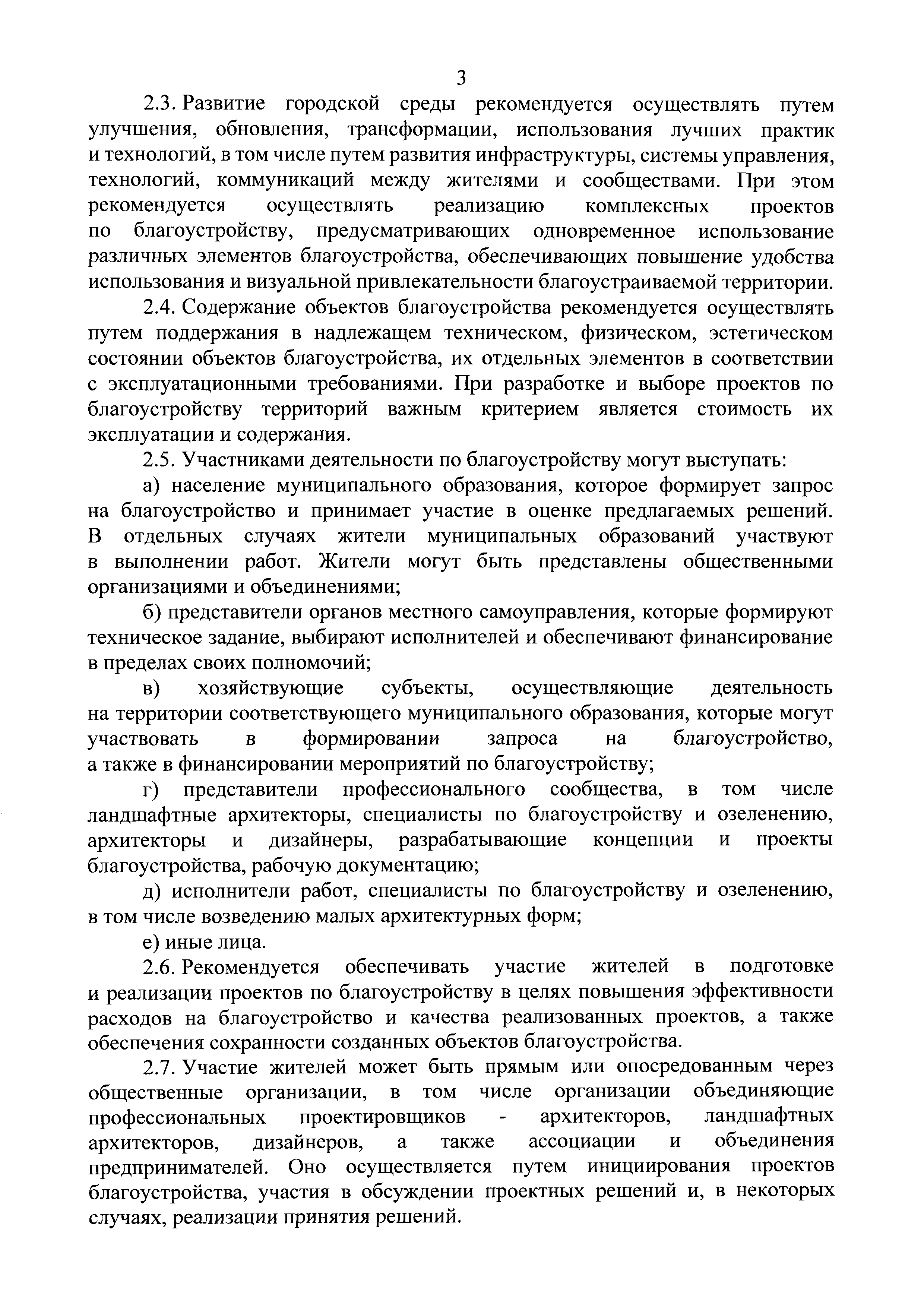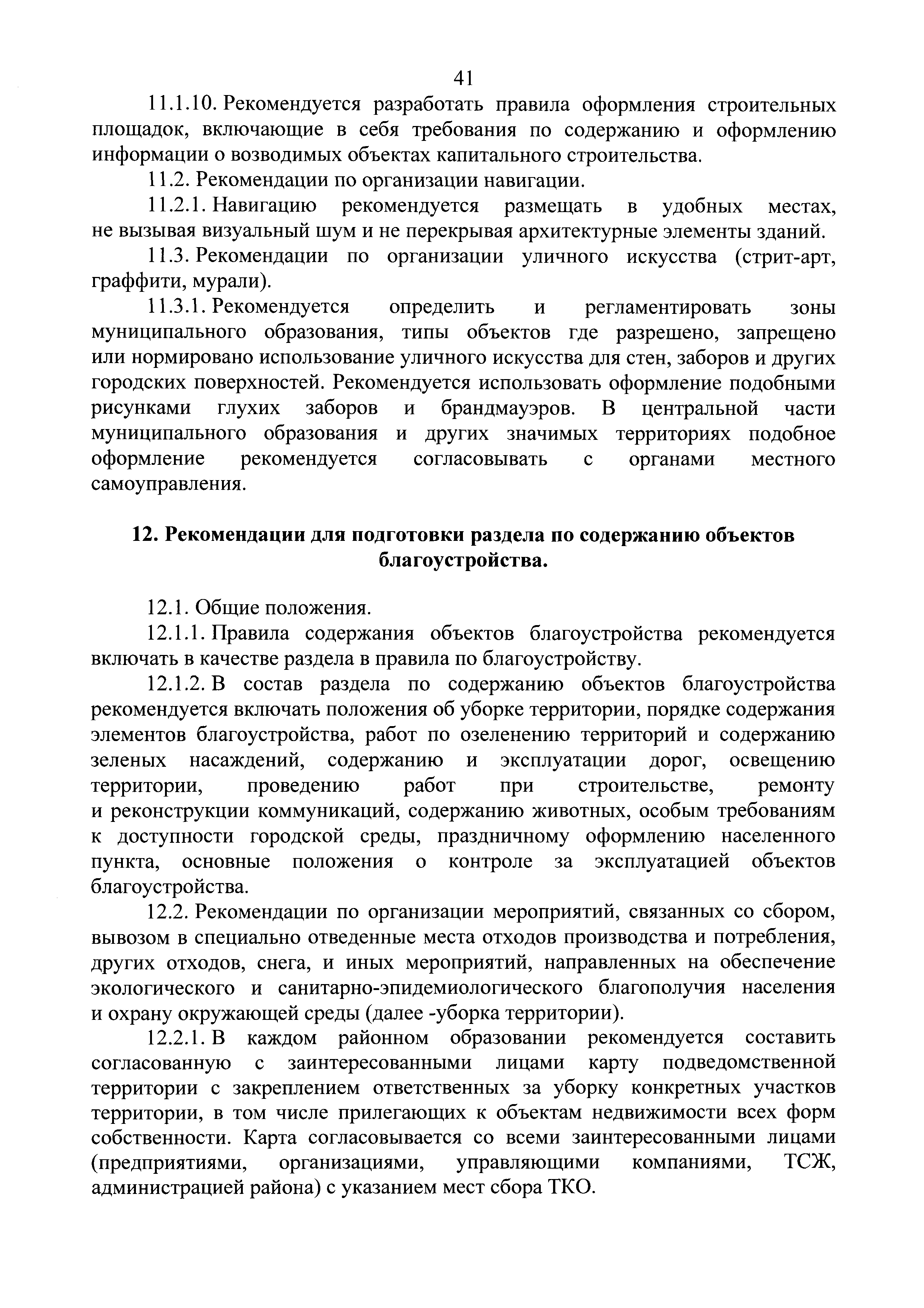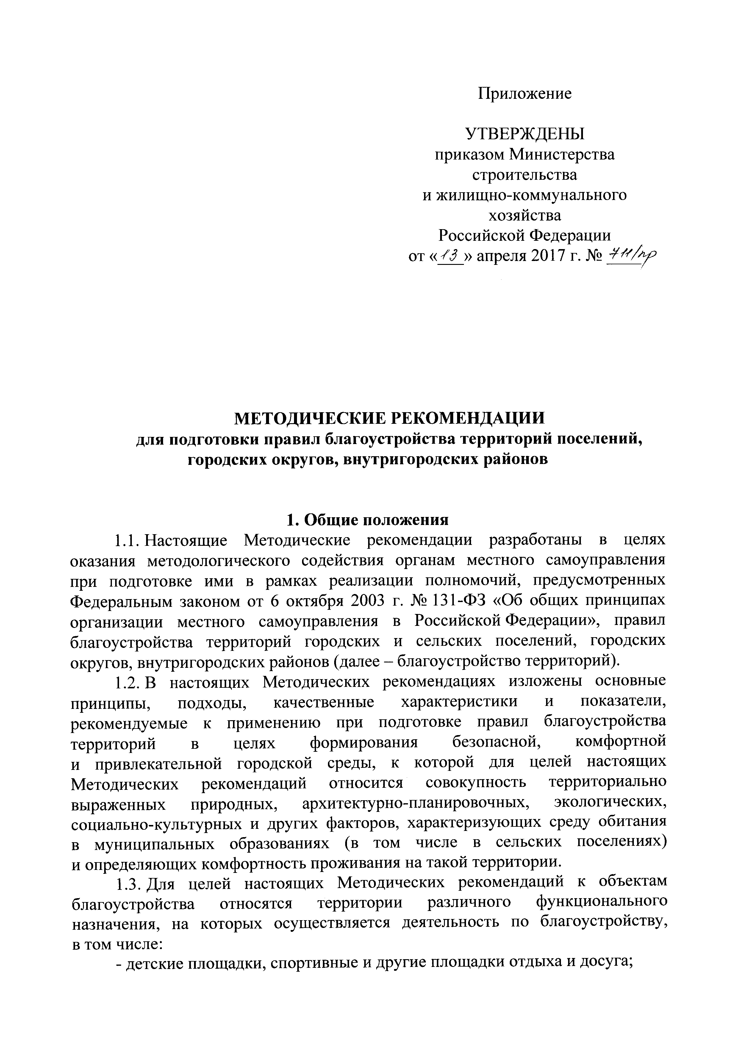 Методические рекомендации для подготовки правил благоустройства территорий поселений, городских округов, внутригородских районов| Статус: | действует | | Название рус.: | Методические рекомендации для подготовки правил благоустройства территорий поселений, городских округов, внутригородских районов | | Дата добавления в базу: | 05.05.2017 | | Дата актуализации: | 01.01.2021 | | Дата введения: | 13.04.2017 | | Оглавление: | 1. Общие положения 2. Общие принципы и подходы 3. Формы и механизмы общественного участия в принятии решений и реализации проектов комплексного благоустройства и развития городской среды 4. Перечень сводов правил и национальных стандартов, применяемых при осуществлении деятельности по благоустройству 5. Рекомендации для подготовки правил благоустройства 6. Рекомендации для подготовки проекта по благоустройству отдельных объектов и их элементов 7. Рекомендации для подготовки раздела правил благоустройства по благоустройству территорий общественного назначения 8. Рекомендации для подготовки раздела по благоустройству на территориях жилого назначения 9. Рекомендации для подготовки раздела по благоустройству территорий рекреационного назначения 10. Рекомендации для подготовки раздела по благоустройству на территориях транспортной и инженерной инфраструктуры 11. Рекомендации для подготовки раздела по оформлению муниципального образования и информации 12. Рекомендации для подготовки раздела по содержанию объектов благоустройства | | Утверждён: | 13.04.2017 Министерство строительства и жилищно-коммунального хозяйства Российской Федерации (711/пр)