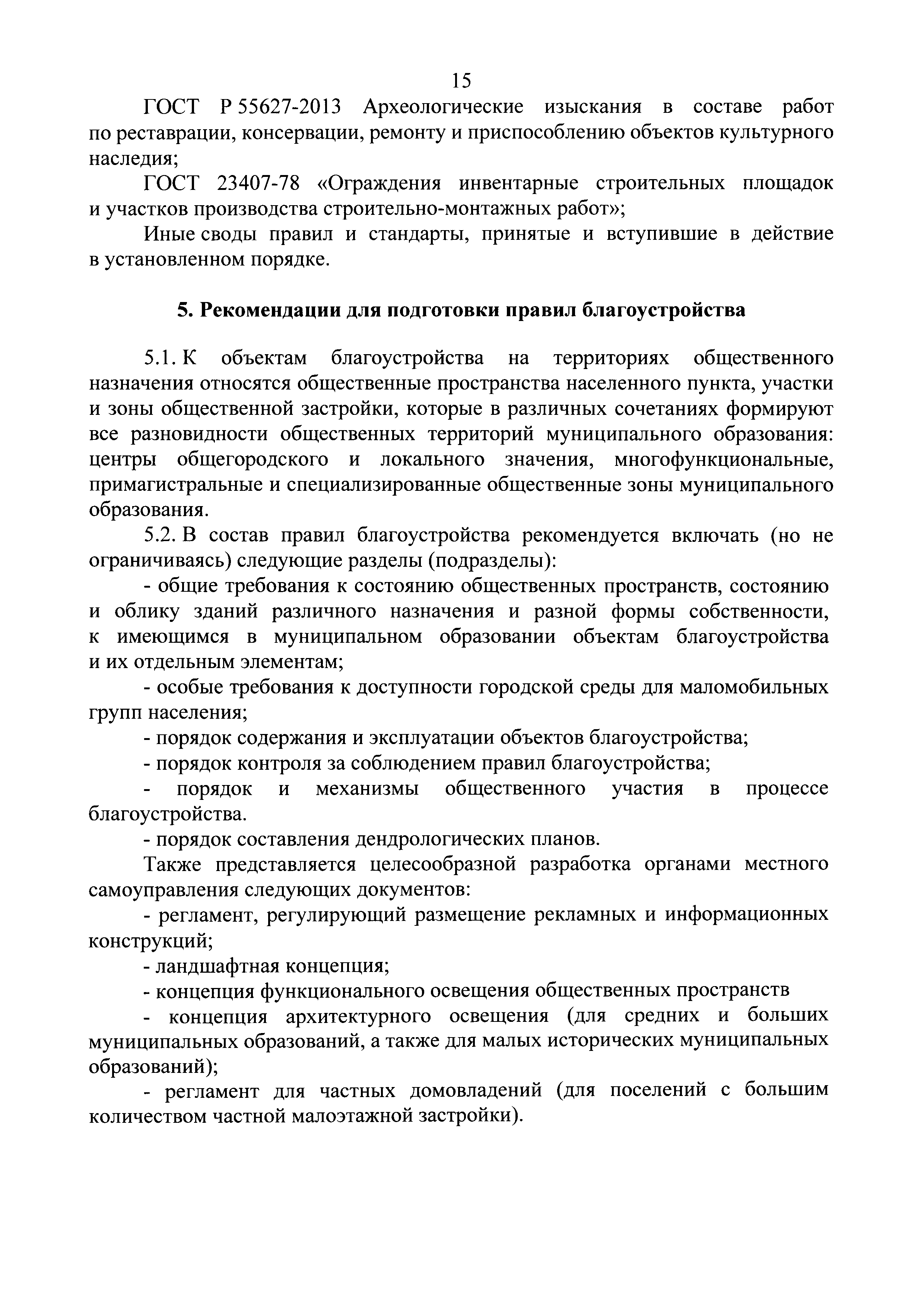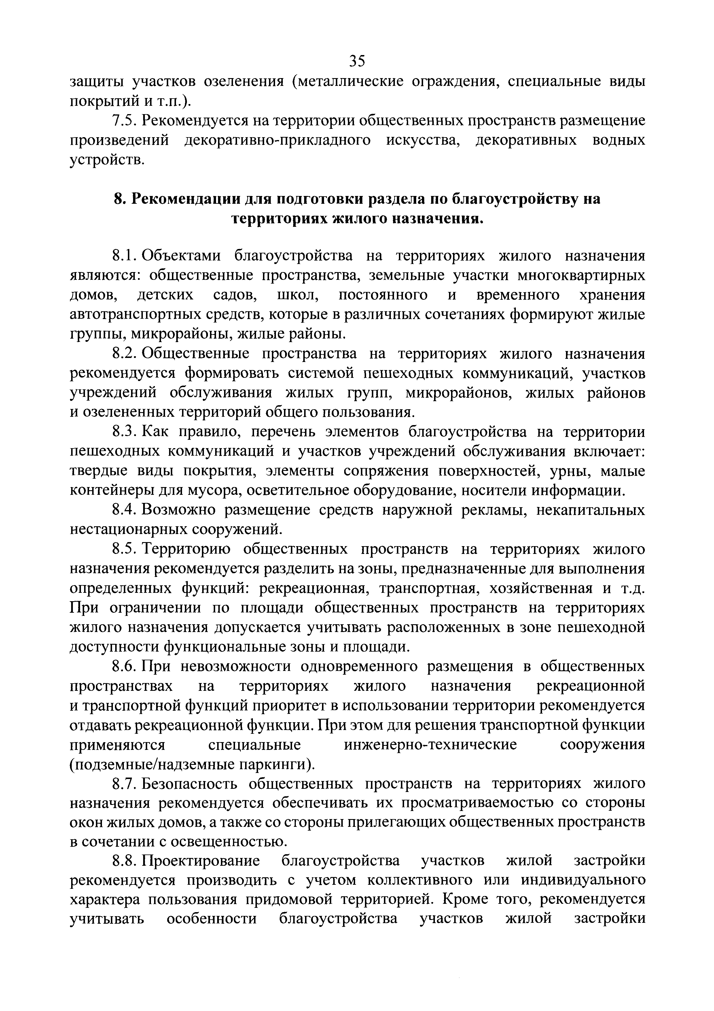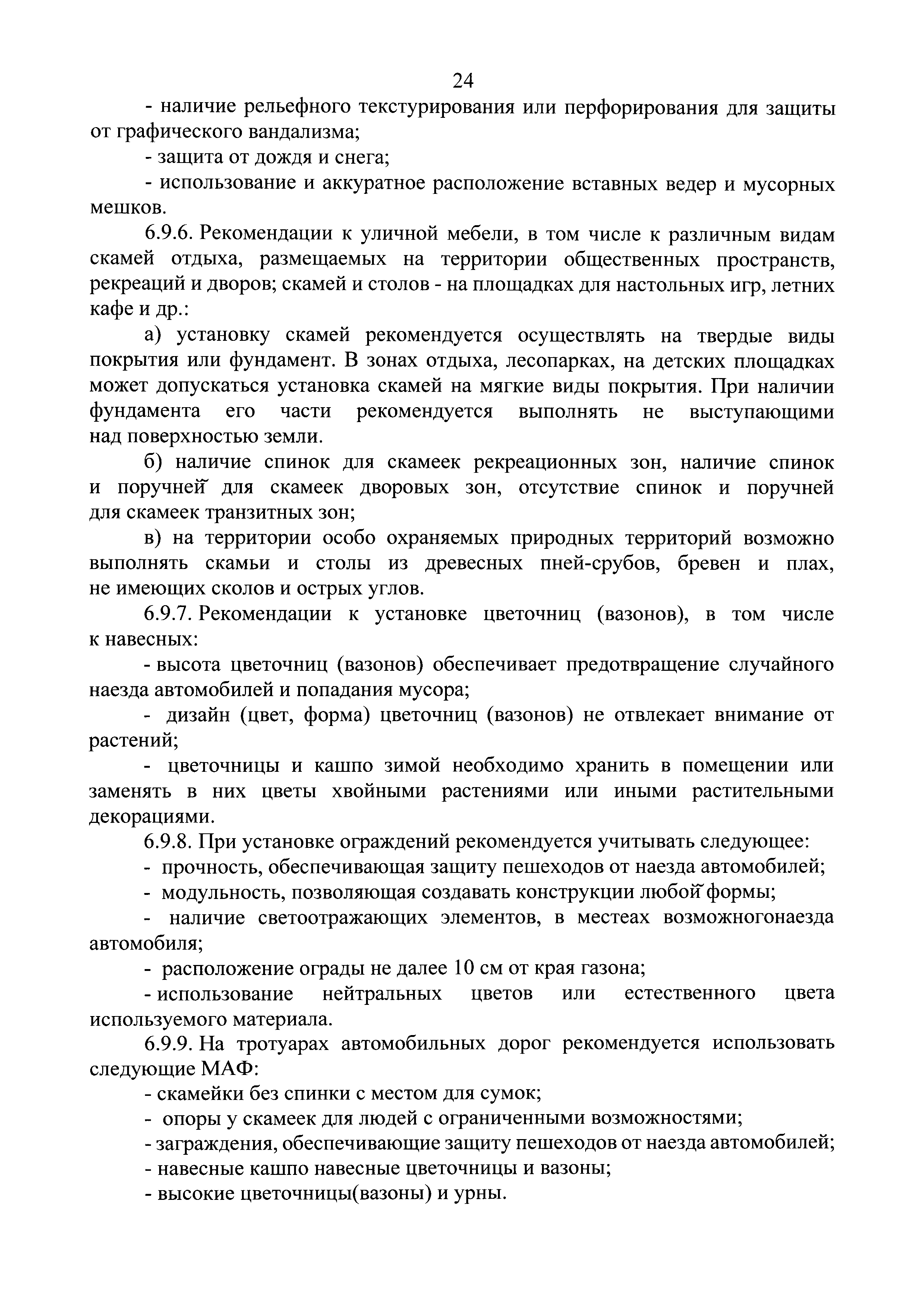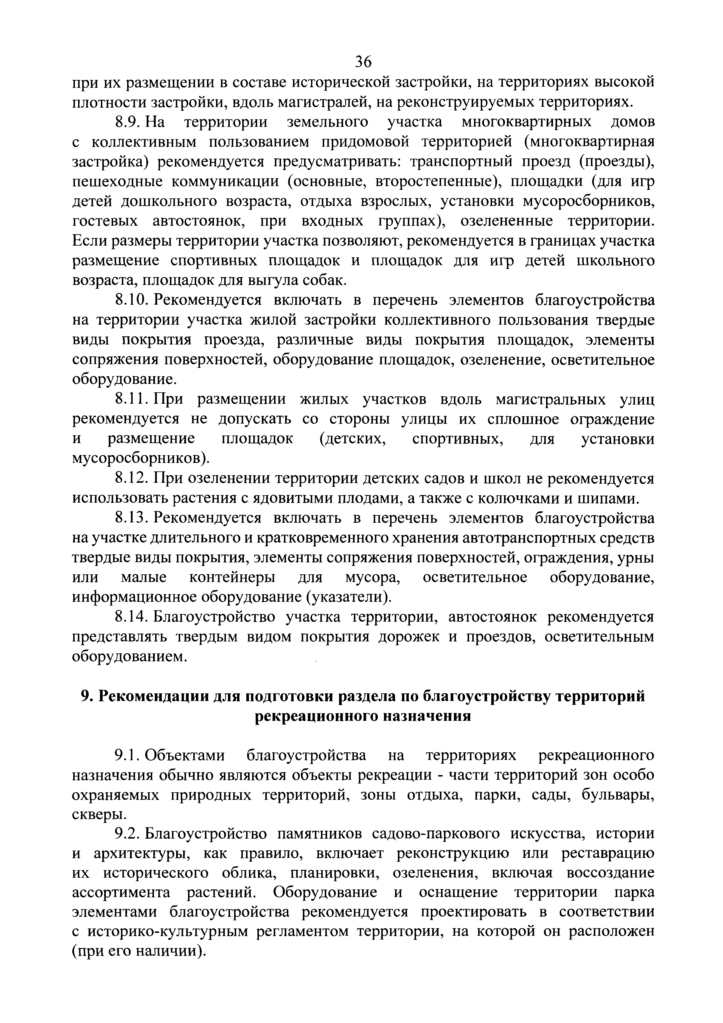 Методические рекомендации для подготовки правил благоустройства территорий поселений, городских округов, внутригородских районов| Статус: | действует | | Название рус.: | Методические рекомендации для подготовки правил благоустройства территорий поселений, городских округов, внутригородских районов | | Дата добавления в базу: | 05.05.2017 | | Дата актуализации: | 01.01.2021 | | Дата введения: | 13.04.2017 | | Оглавление: | 1. Общие положения 2. Общие принципы и подходы 3. Формы и механизмы общественного участия в принятии решений и реализации проектов комплексного благоустройства и развития городской среды 4. Перечень сводов правил и национальных стандартов, применяемых при осуществлении деятельности по благоустройству 5. Рекомендации для подготовки правил благоустройства 6. Рекомендации для подготовки проекта по благоустройству отдельных объектов и их элементов 7. Рекомендации для подготовки раздела правил благоустройства по благоустройству территорий общественного назначения 8. Рекомендации для подготовки раздела по благоустройству на территориях жилого назначения 9. Рекомендации для подготовки раздела по благоустройству территорий рекреационного назначения 10. Рекомендации для подготовки раздела по благоустройству на территориях транспортной и инженерной инфраструктуры 11. Рекомендации для подготовки раздела по оформлению муниципального образования и информации 12. Рекомендации для подготовки раздела по содержанию объектов благоустройства | | Утверждён: | 13.04.2017 Министерство строительства и жилищно-коммунального хозяйства Российской Федерации (711/пр)