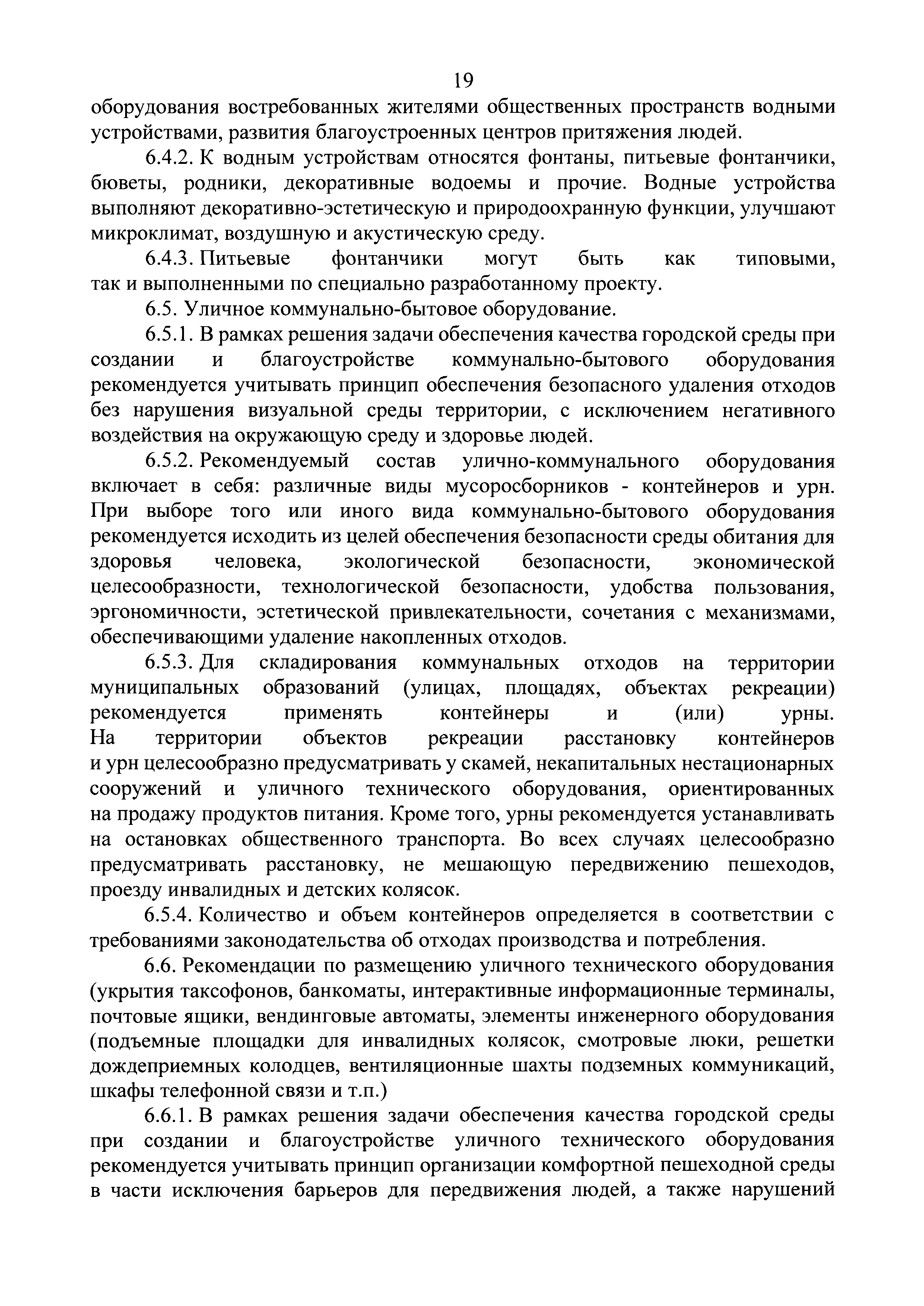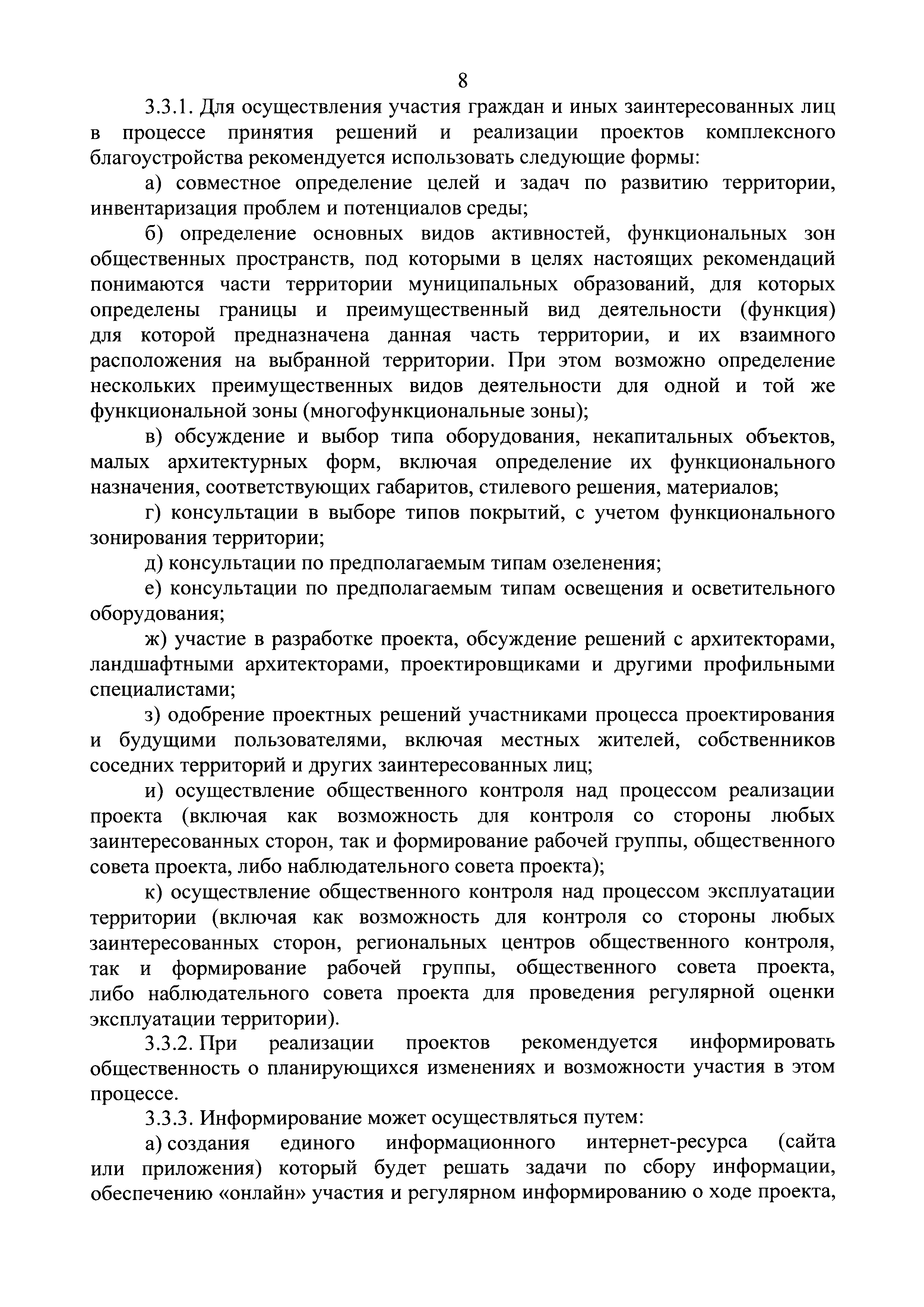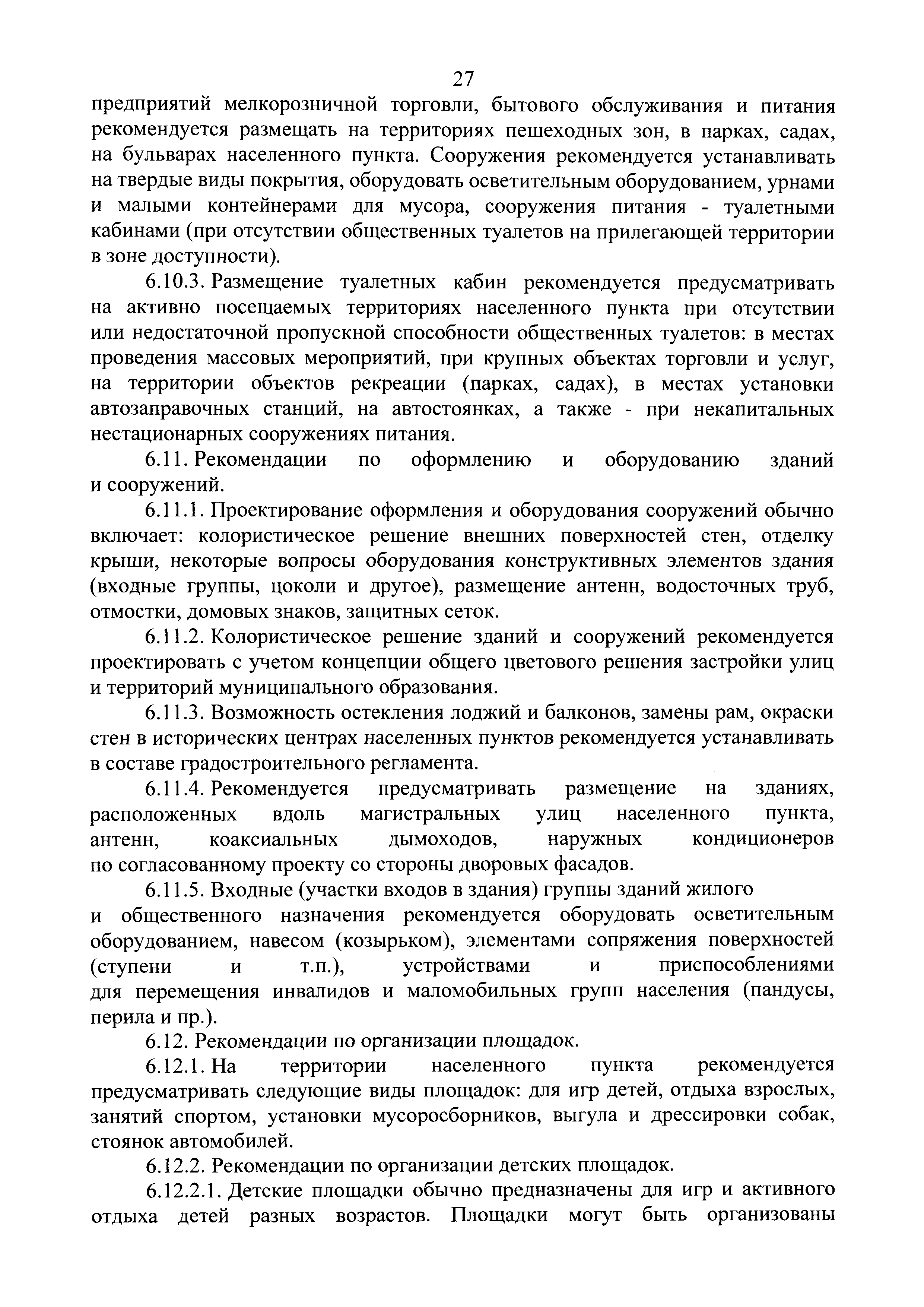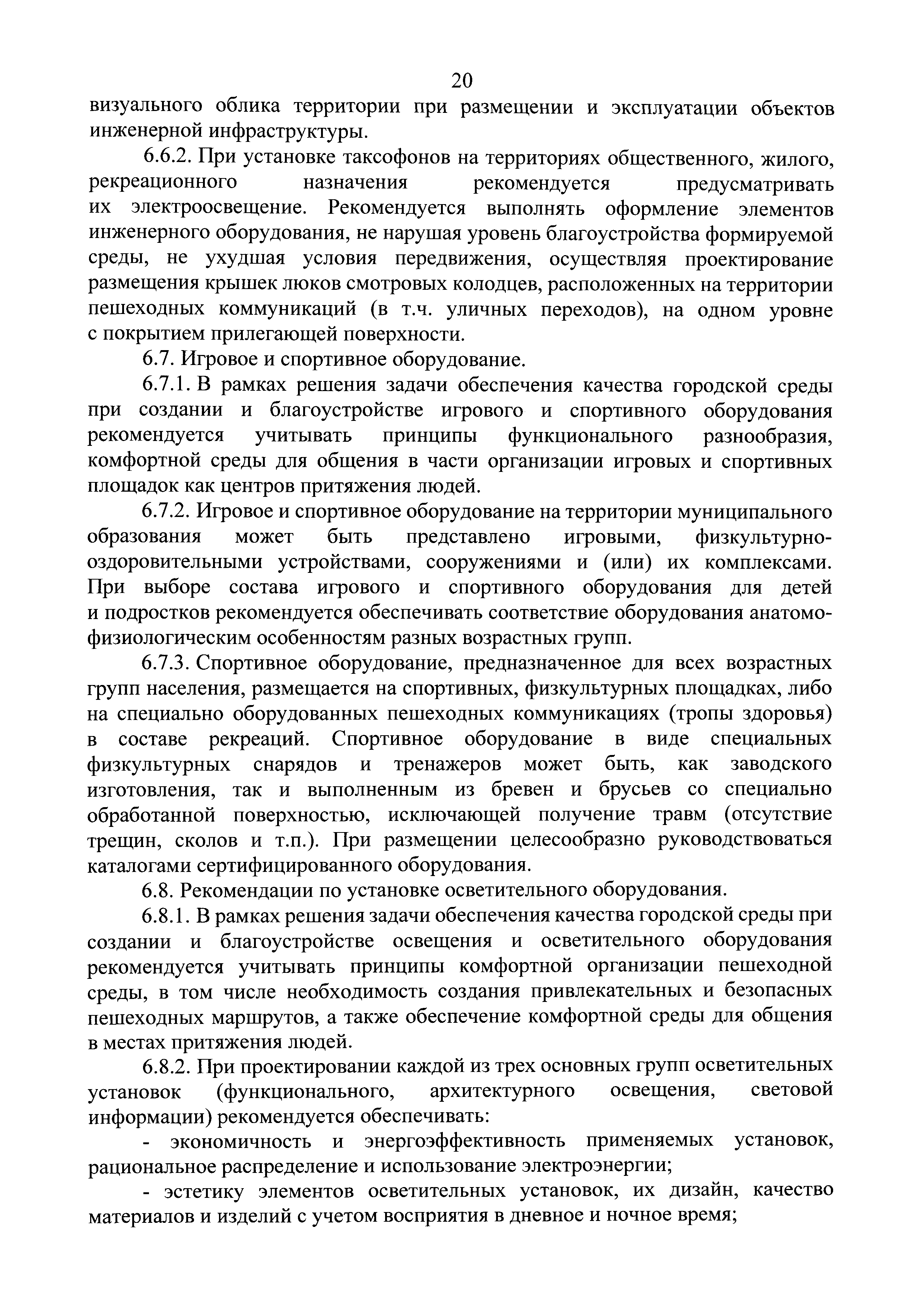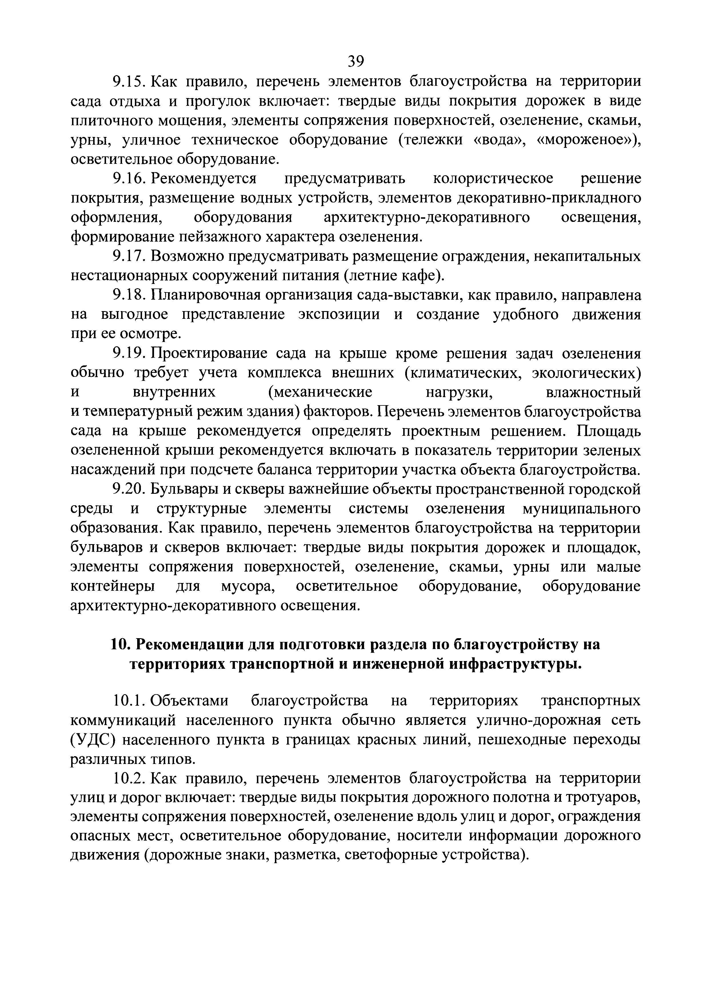 Методические рекомендации для подготовки правил благоустройства территорий поселений, городских округов, внутригородских районов| Статус: | действует | | Название рус.: | Методические рекомендации для подготовки правил благоустройства территорий поселений, городских округов, внутригородских районов | | Дата добавления в базу: | 05.05.2017 | | Дата актуализации: | 01.01.2021 | | Дата введения: | 13.04.2017 | | Оглавление: | 1. Общие положения 2. Общие принципы и подходы 3. Формы и механизмы общественного участия в принятии решений и реализации проектов комплексного благоустройства и развития городской среды 4. Перечень сводов правил и национальных стандартов, применяемых при осуществлении деятельности по благоустройству 5. Рекомендации для подготовки правил благоустройства 6. Рекомендации для подготовки проекта по благоустройству отдельных объектов и их элементов 7. Рекомендации для подготовки раздела правил благоустройства по благоустройству территорий общественного назначения 8. Рекомендации для подготовки раздела по благоустройству на территориях жилого назначения 9. Рекомендации для подготовки раздела по благоустройству территорий рекреационного назначения 10. Рекомендации для подготовки раздела по благоустройству на территориях транспортной и инженерной инфраструктуры 11. Рекомендации для подготовки раздела по оформлению муниципального образования и информации 12. Рекомендации для подготовки раздела по содержанию объектов благоустройства | | Утверждён: | 13.04.2017 Министерство строительства и жилищно-коммунального хозяйства Российской Федерации (711/пр)