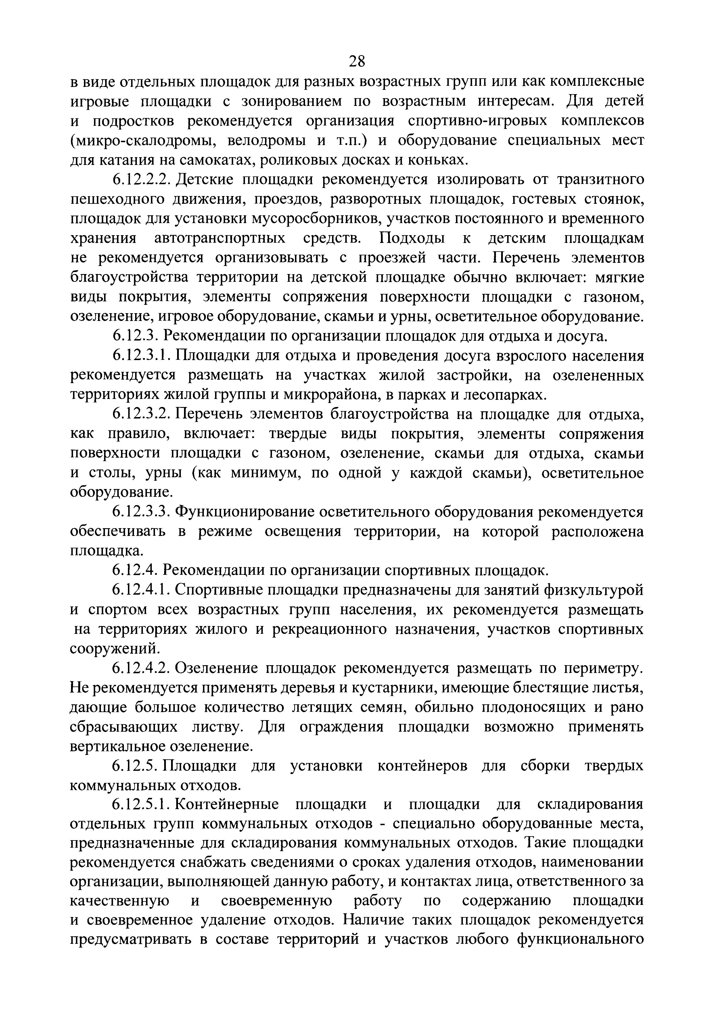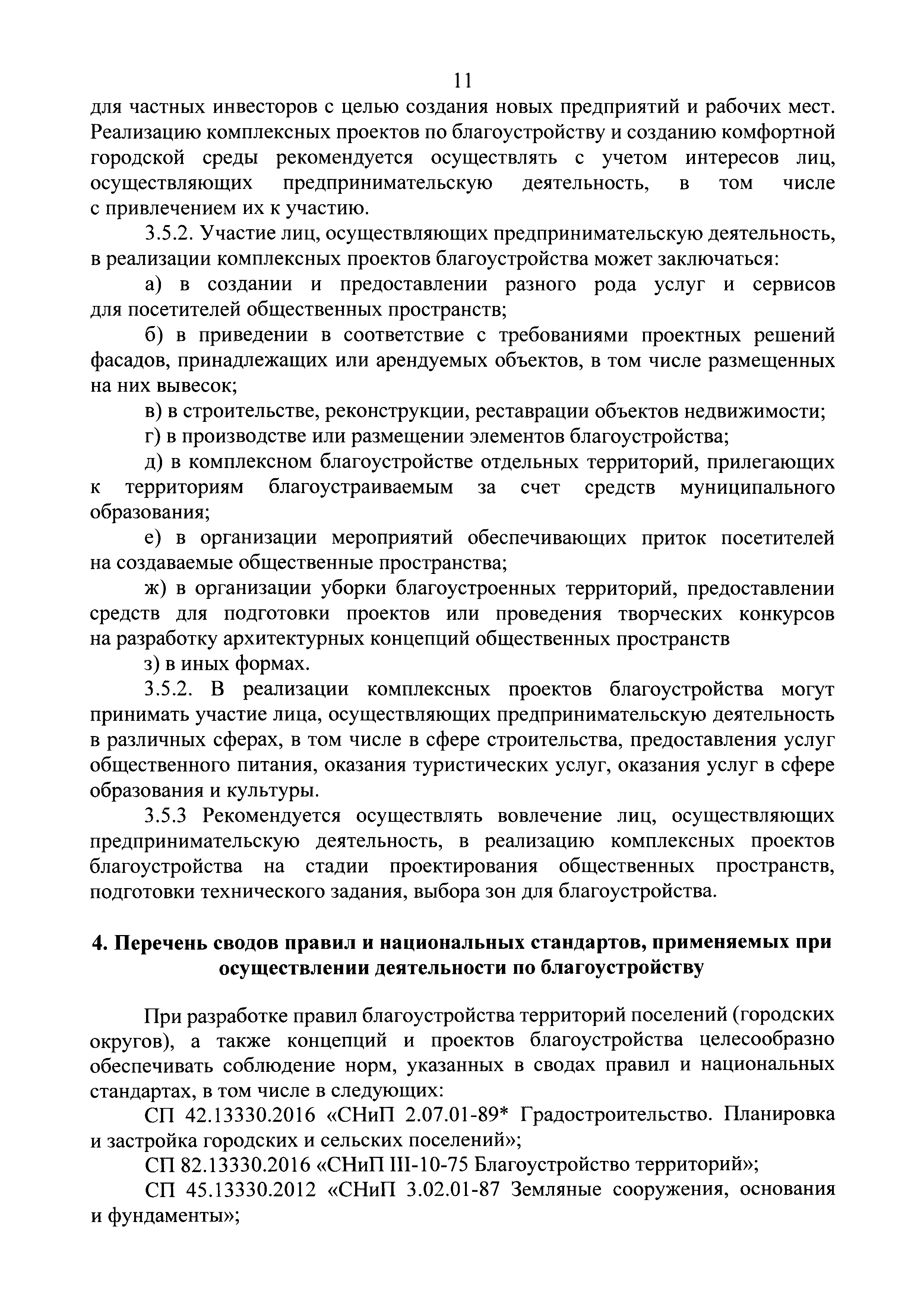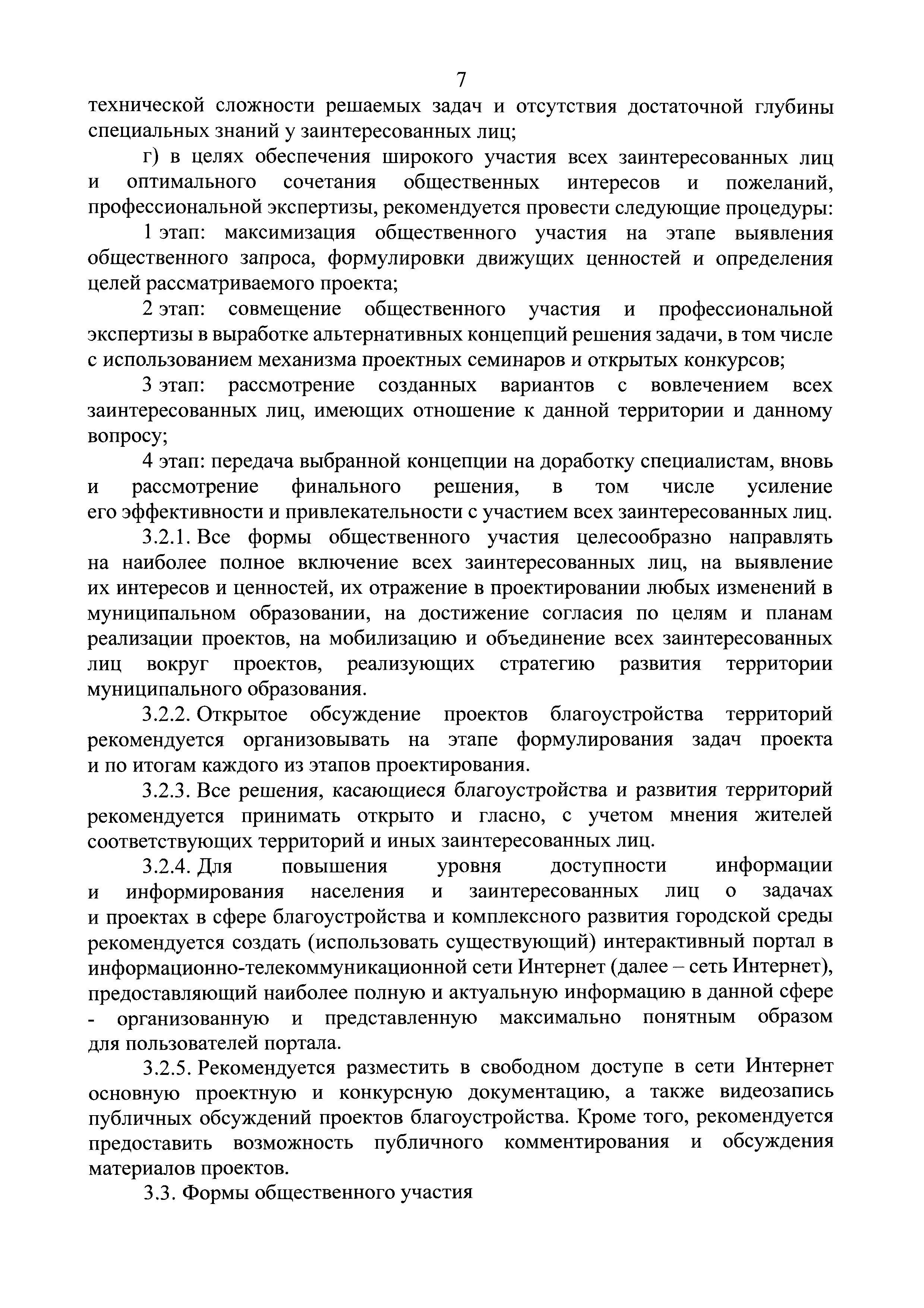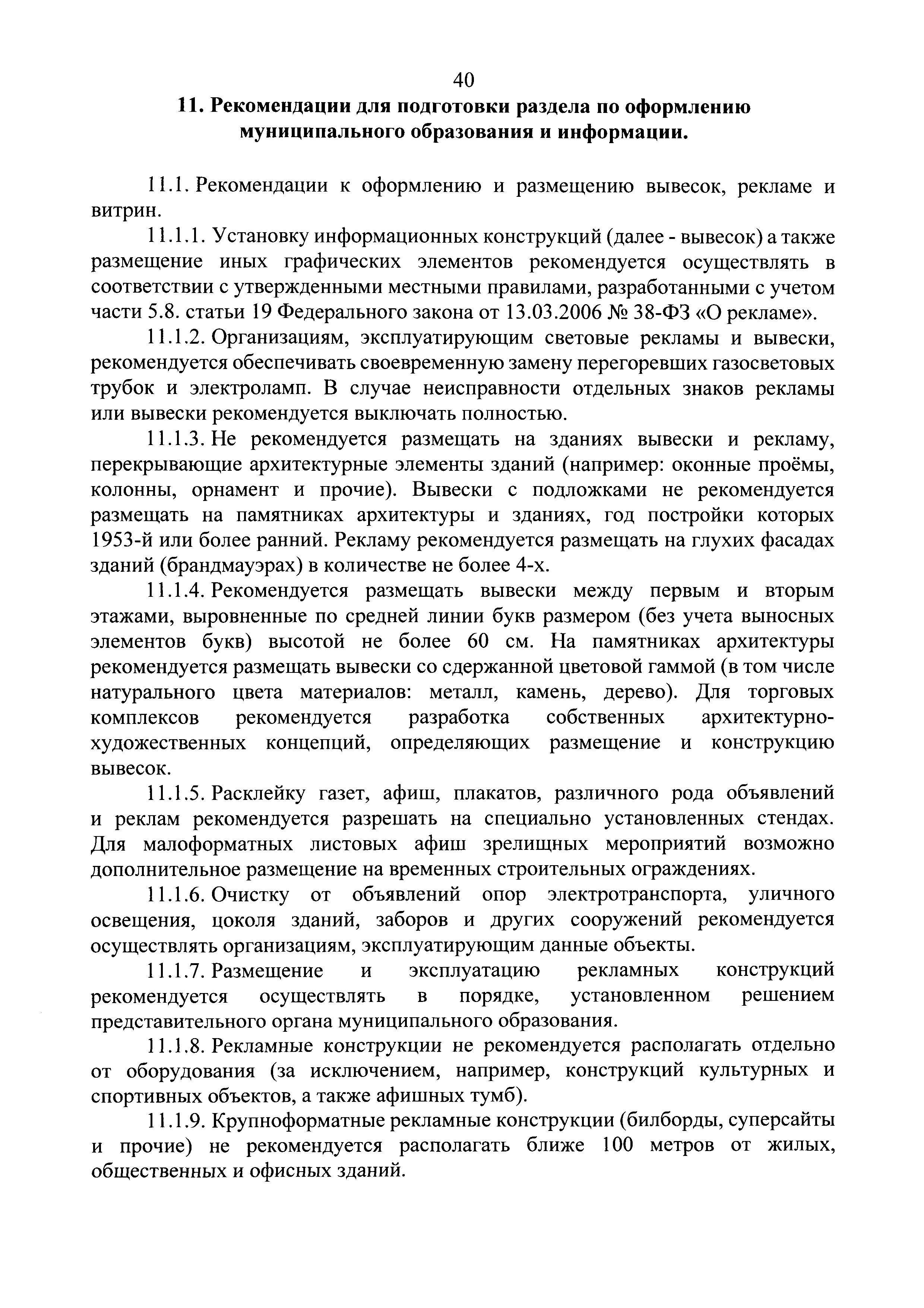 Методические рекомендации для подготовки правил благоустройства территорий поселений, городских округов, внутригородских районов| Статус: | действует | | Название рус.: | Методические рекомендации для подготовки правил благоустройства территорий поселений, городских округов, внутригородских районов | | Дата добавления в базу: | 05.05.2017 | | Дата актуализации: | 01.01.2021 | | Дата введения: | 13.04.2017 | | Оглавление: | 1. Общие положения 2. Общие принципы и подходы 3. Формы и механизмы общественного участия в принятии решений и реализации проектов комплексного благоустройства и развития городской среды 4. Перечень сводов правил и национальных стандартов, применяемых при осуществлении деятельности по благоустройству 5. Рекомендации для подготовки правил благоустройства 6. Рекомендации для подготовки проекта по благоустройству отдельных объектов и их элементов 7. Рекомендации для подготовки раздела правил благоустройства по благоустройству территорий общественного назначения 8. Рекомендации для подготовки раздела по благоустройству на территориях жилого назначения 9. Рекомендации для подготовки раздела по благоустройству территорий рекреационного назначения 10. Рекомендации для подготовки раздела по благоустройству на территориях транспортной и инженерной инфраструктуры 11. Рекомендации для подготовки раздела по оформлению муниципального образования и информации 12. Рекомендации для подготовки раздела по содержанию объектов благоустройства | | Утверждён: | 13.04.2017 Министерство строительства и жилищно-коммунального хозяйства Российской Федерации (711/пр)