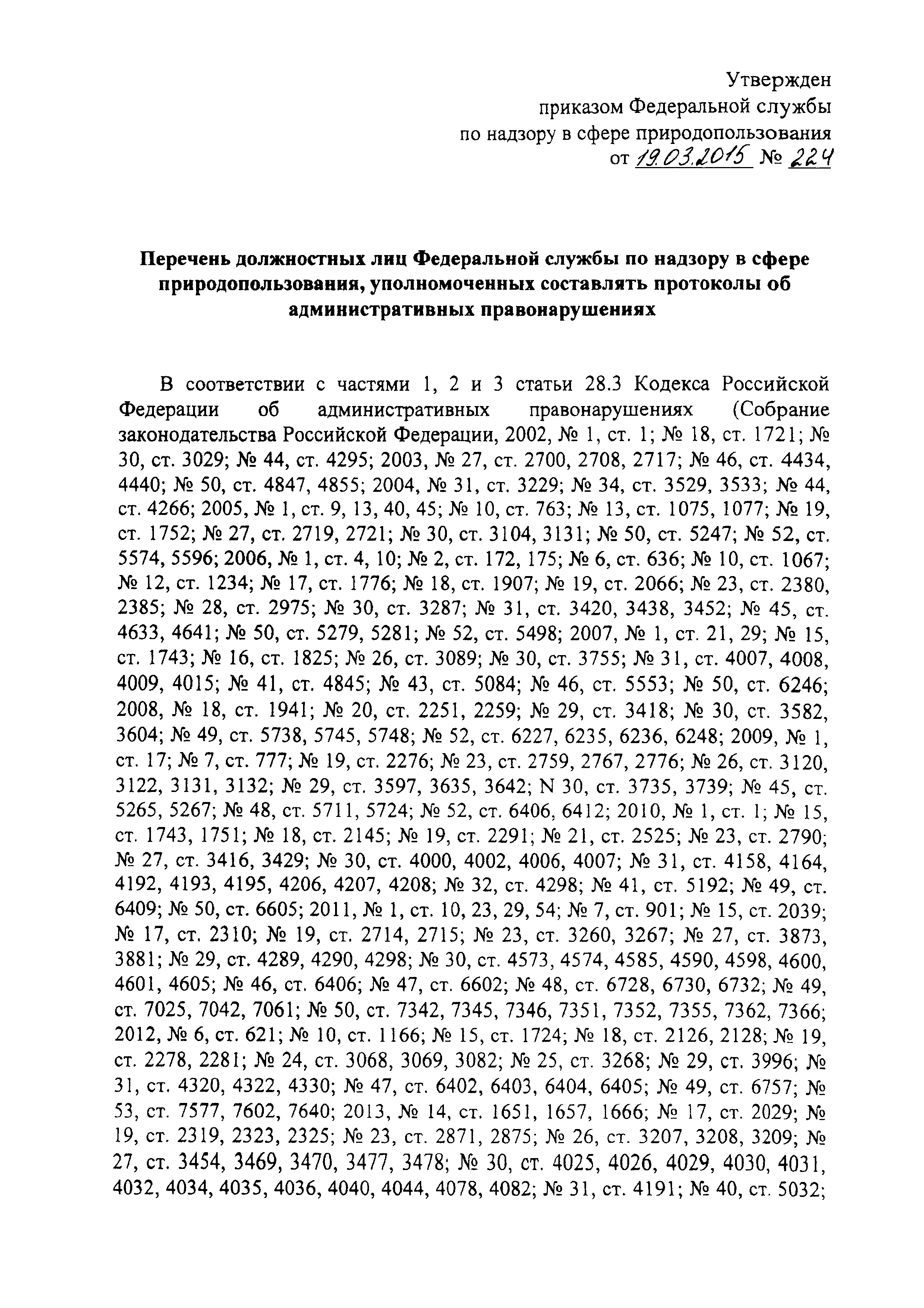 Перечень должностных лиц Федеральной службы по надзору в сфере природопользования, уполномоченных составлять протоколы об административных правонарушениях| Статус: | действует | | Название рус.: | Перечень должностных лиц Федеральной службы по надзору в сфере природопользования, уполномоченных составлять протоколы об административных правонарушениях | | Дата добавления в базу: | 05.05.2017 | | Дата актуализации: | 01.01.2021 | | Дата введения: | 26.04.2015 | | Утверждён: | 19.03.2015 Федеральная служба по надзору в сфере природопользования (224)
