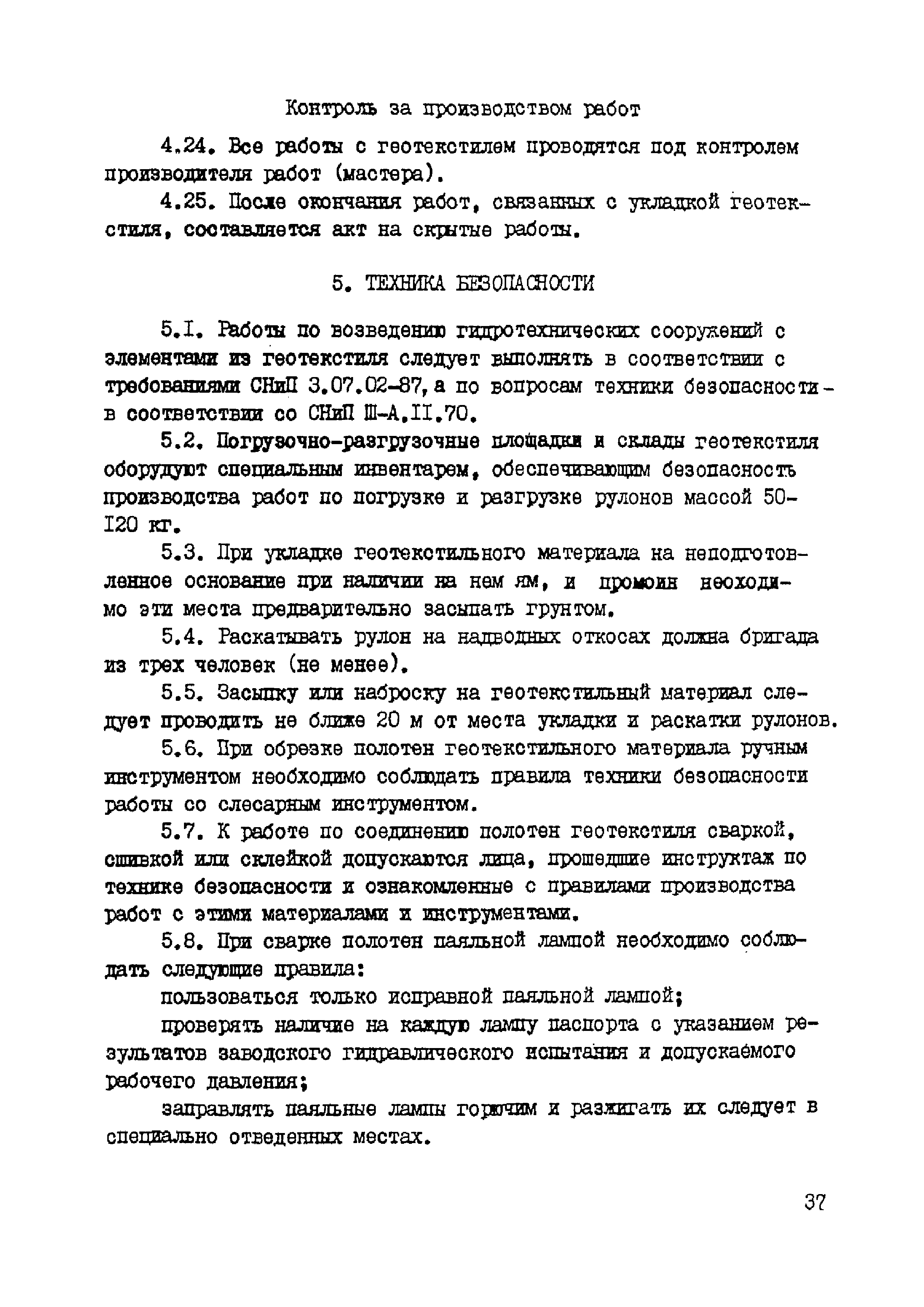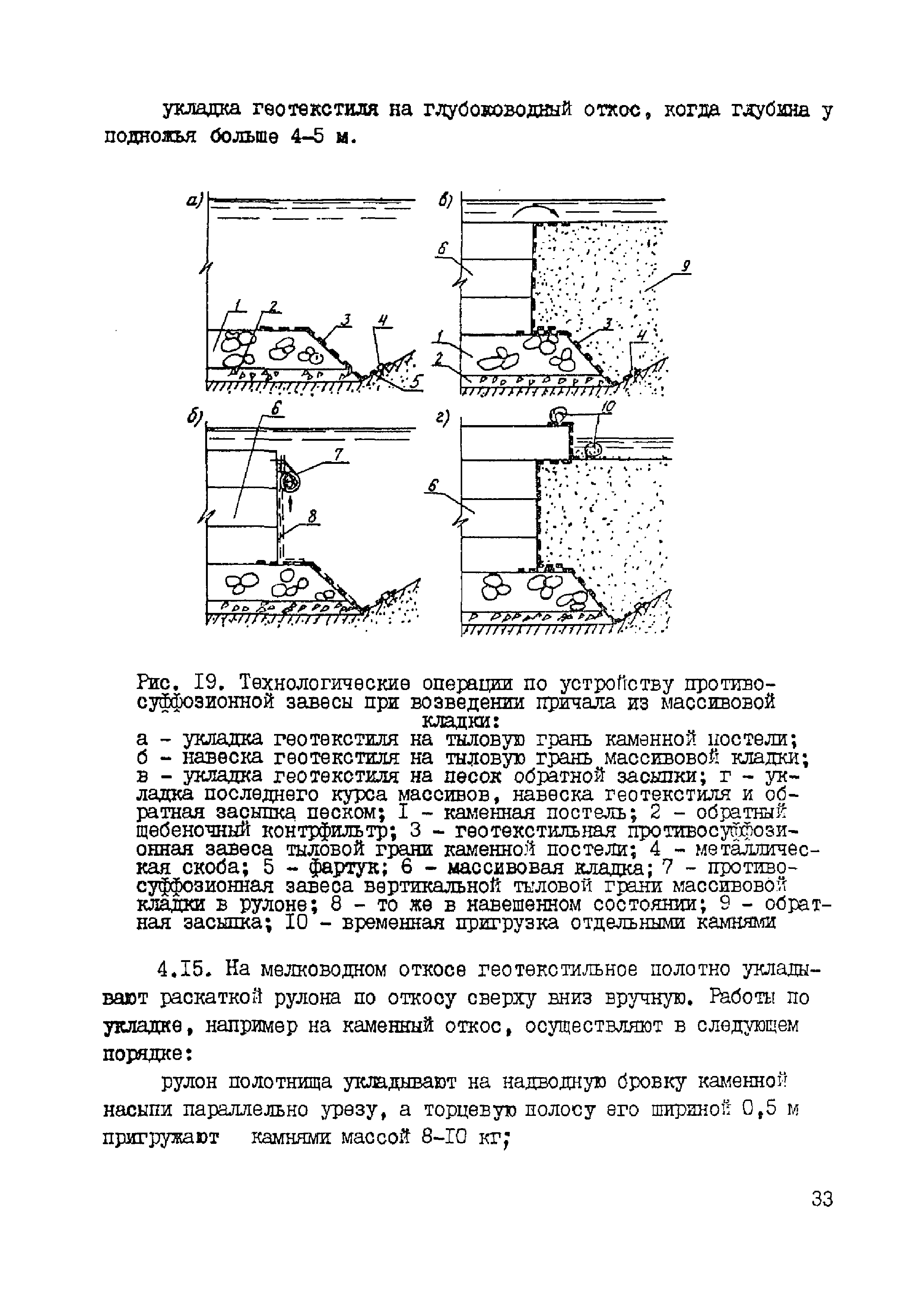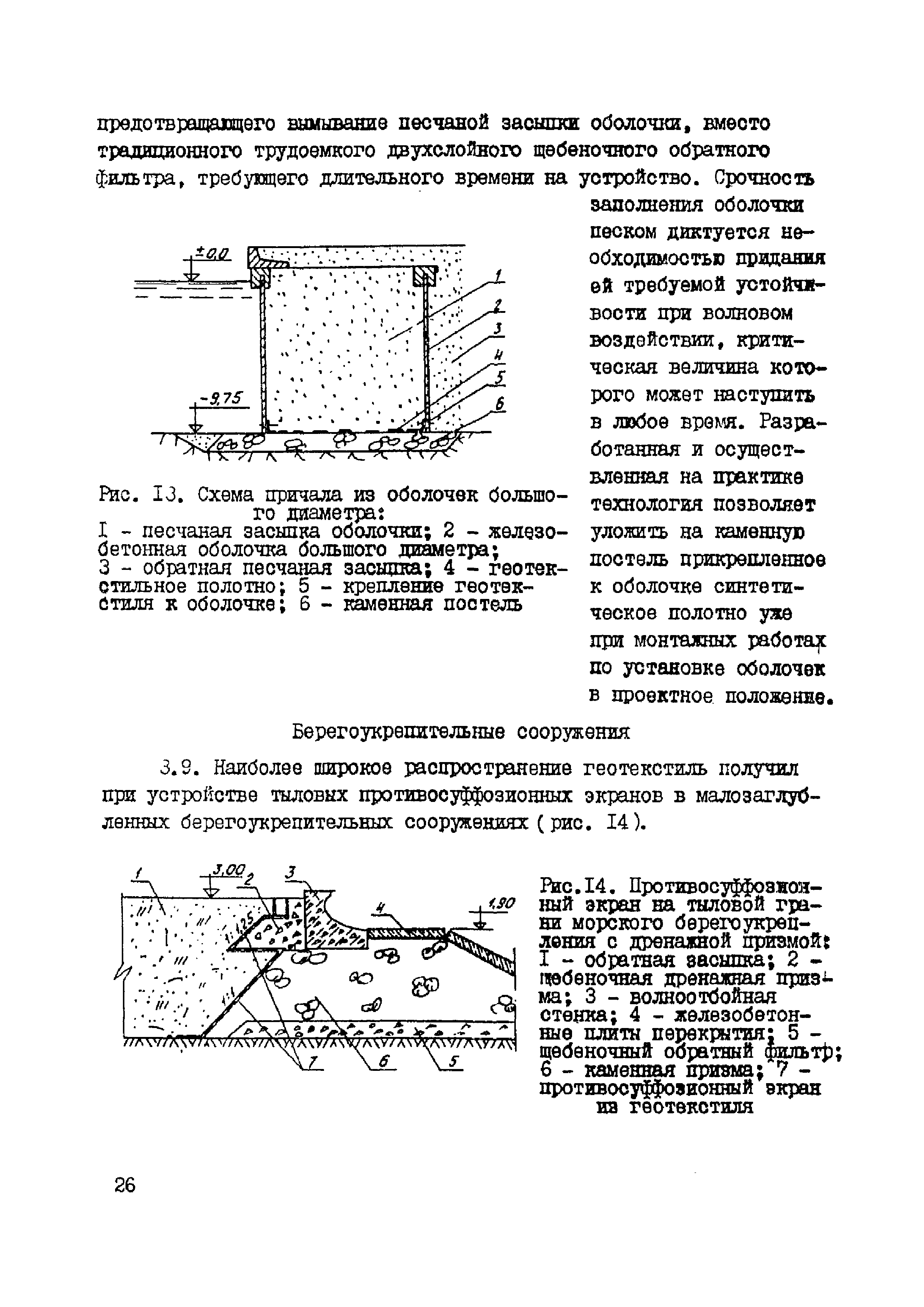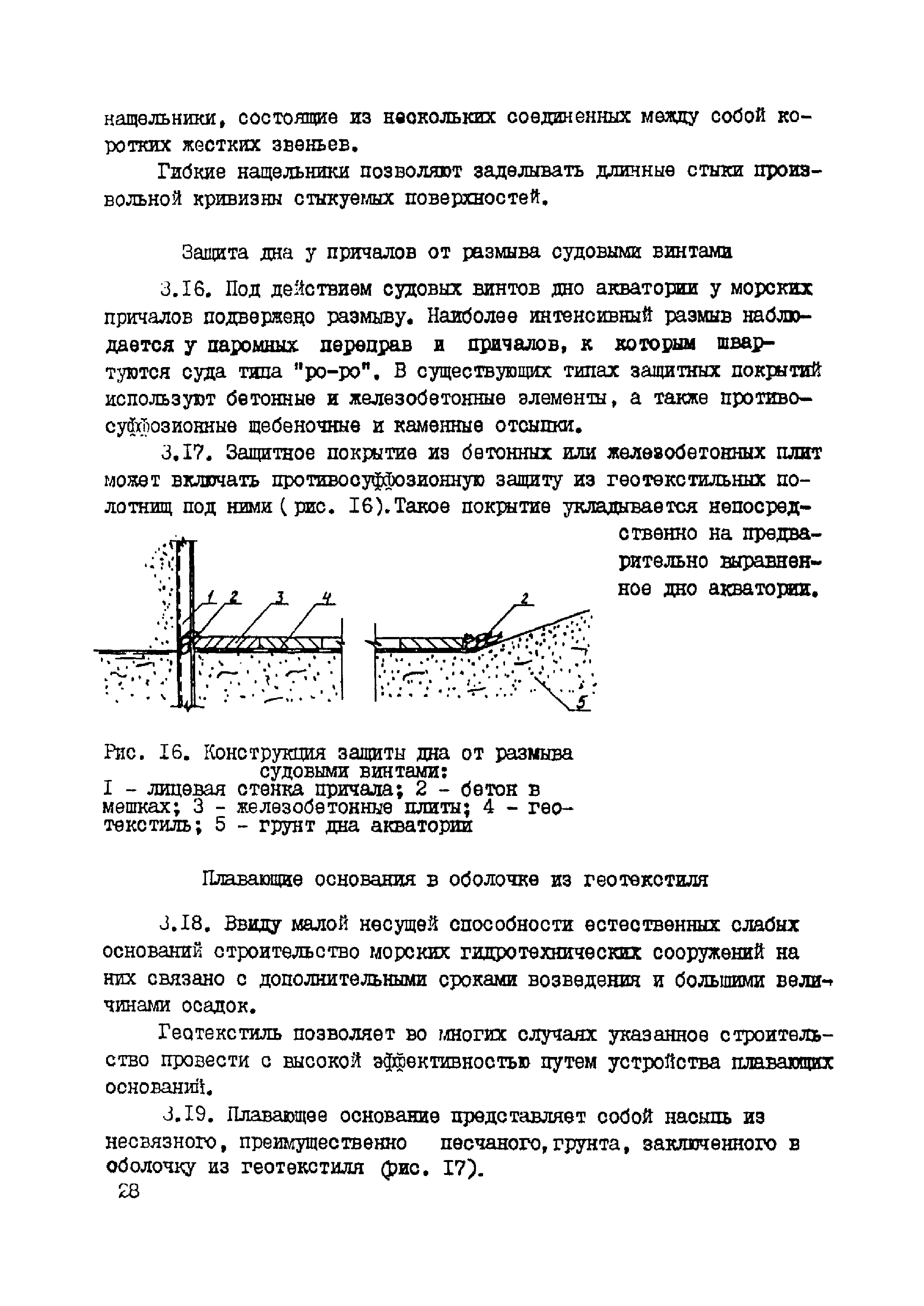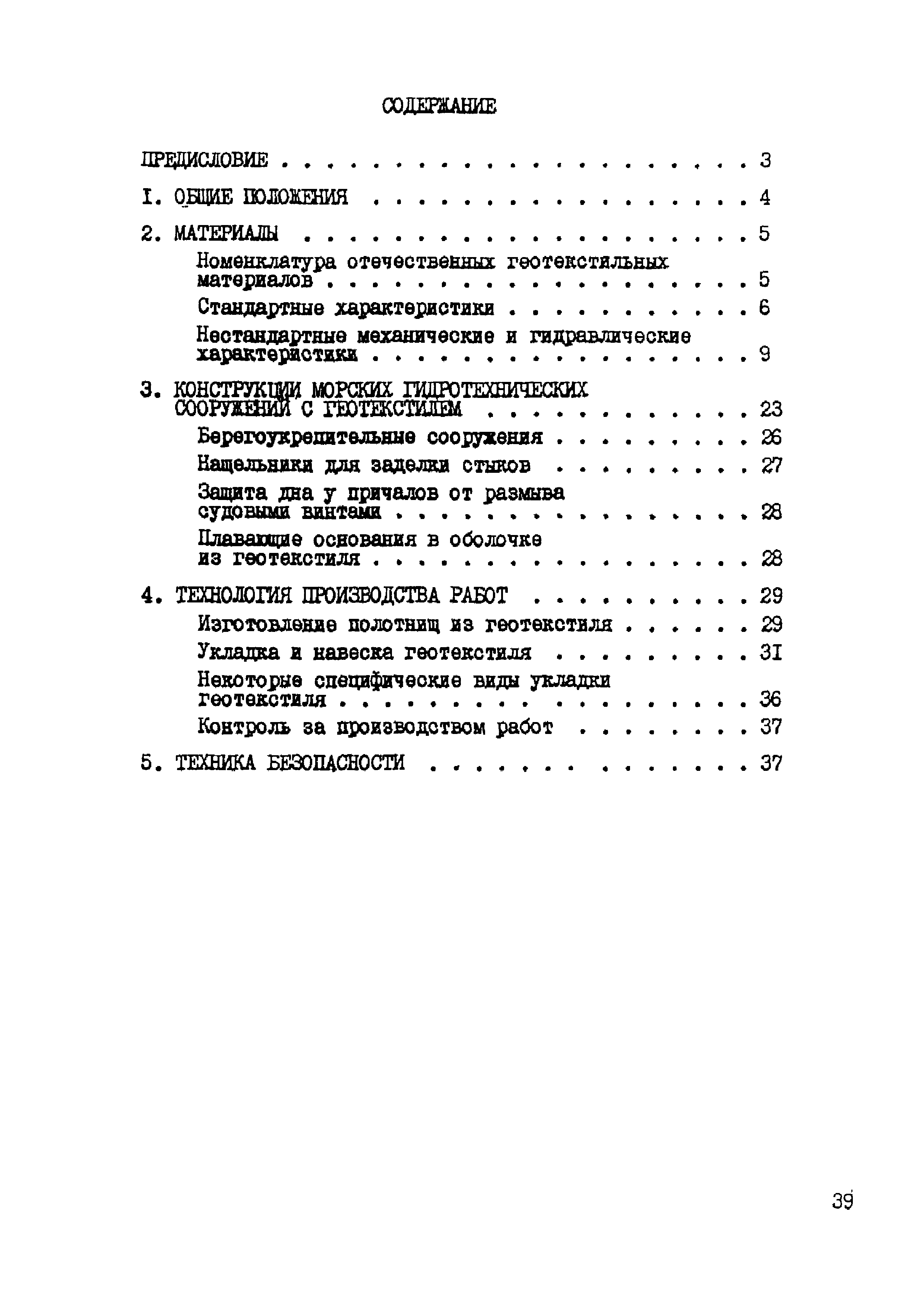 | Оглавление: | Предисловие 1 Общие положения 2 Материалы Номенклатура отечественных геотекстильных материалов Стандартные характеристики Нестандапртные механические и гидравлические характеристики 3 Конструкции морских гидротехнических сооружений с геотекстилем Берегоукрепительные сооружения Нащельники для заделки стыков Защита дна у причалов от размыва судовыми винтами Плавающие основания в оболочке из геотекстиля 4 Технология производства работ Изготовление полотнищ из геотекстиля Укладка и навеска геотекстиля Некоторые специфические виды укладки геотекстиля Контроль за производством работ 5 Техника безопасности |