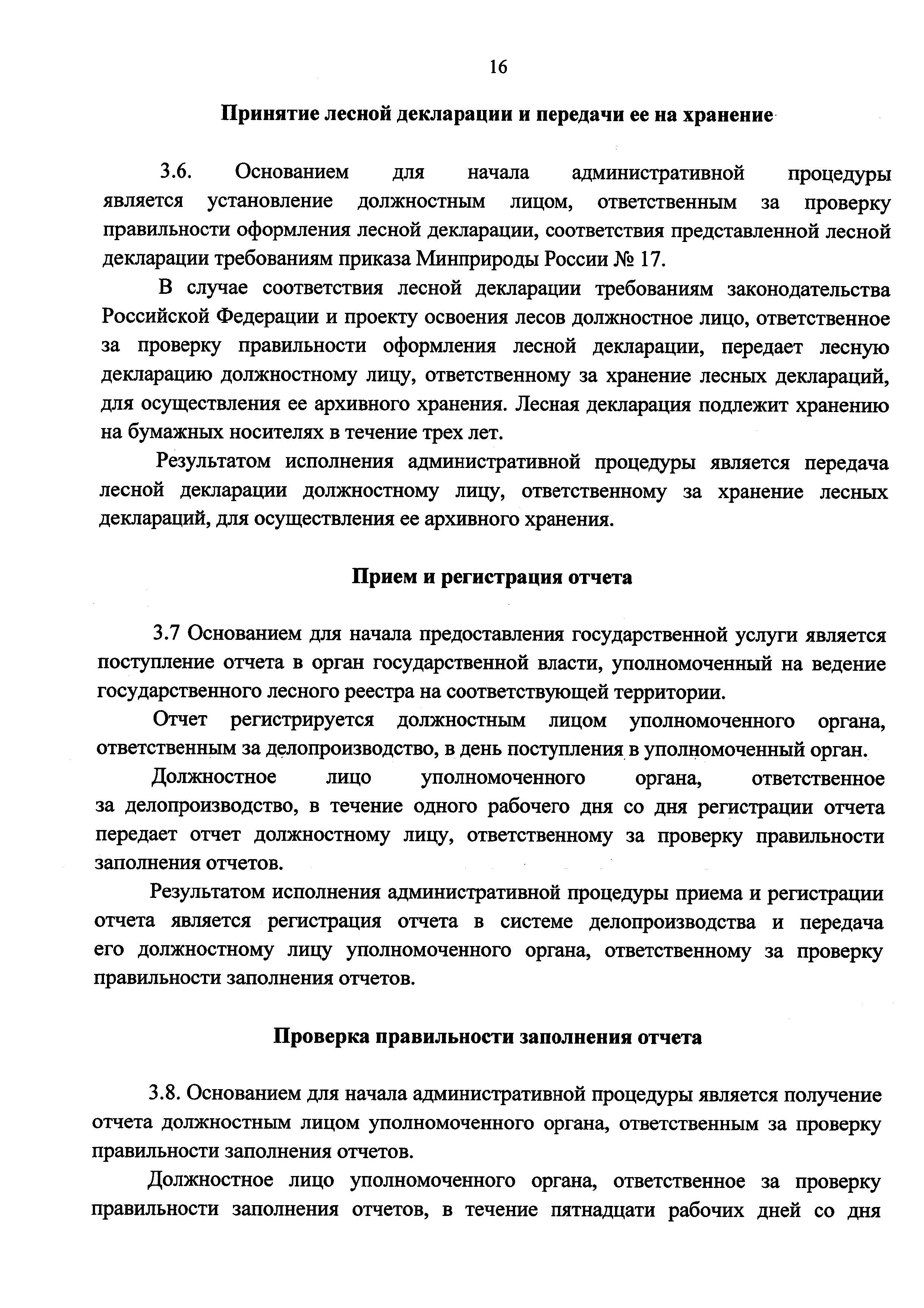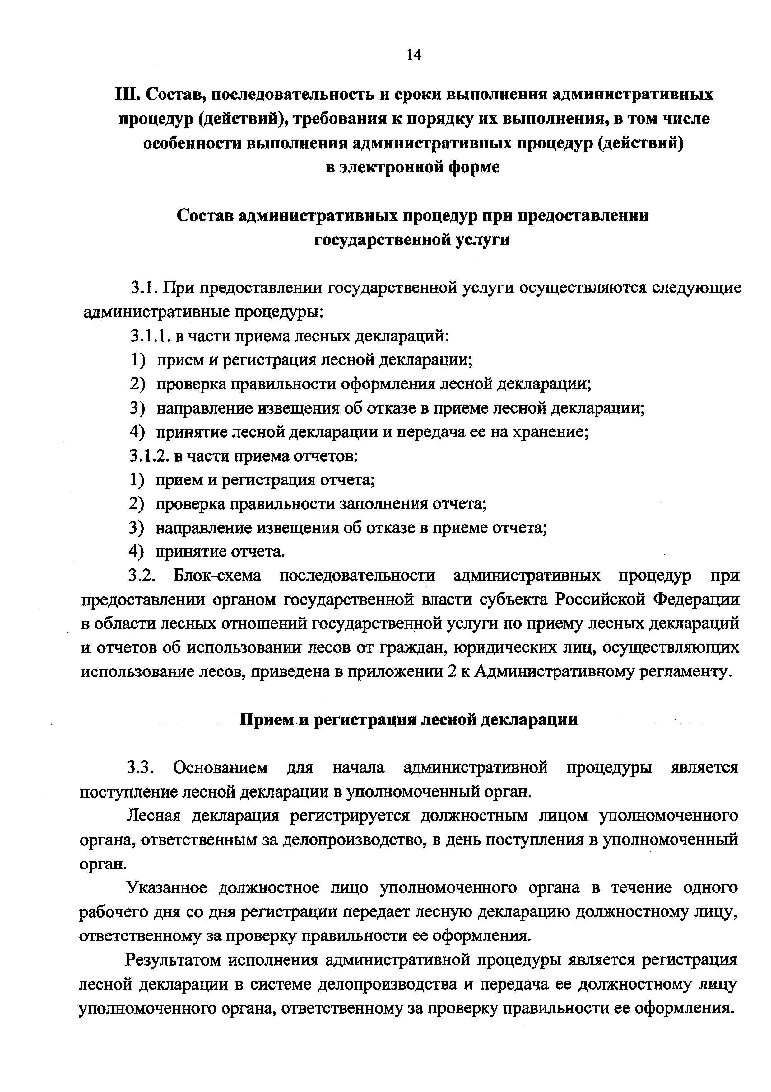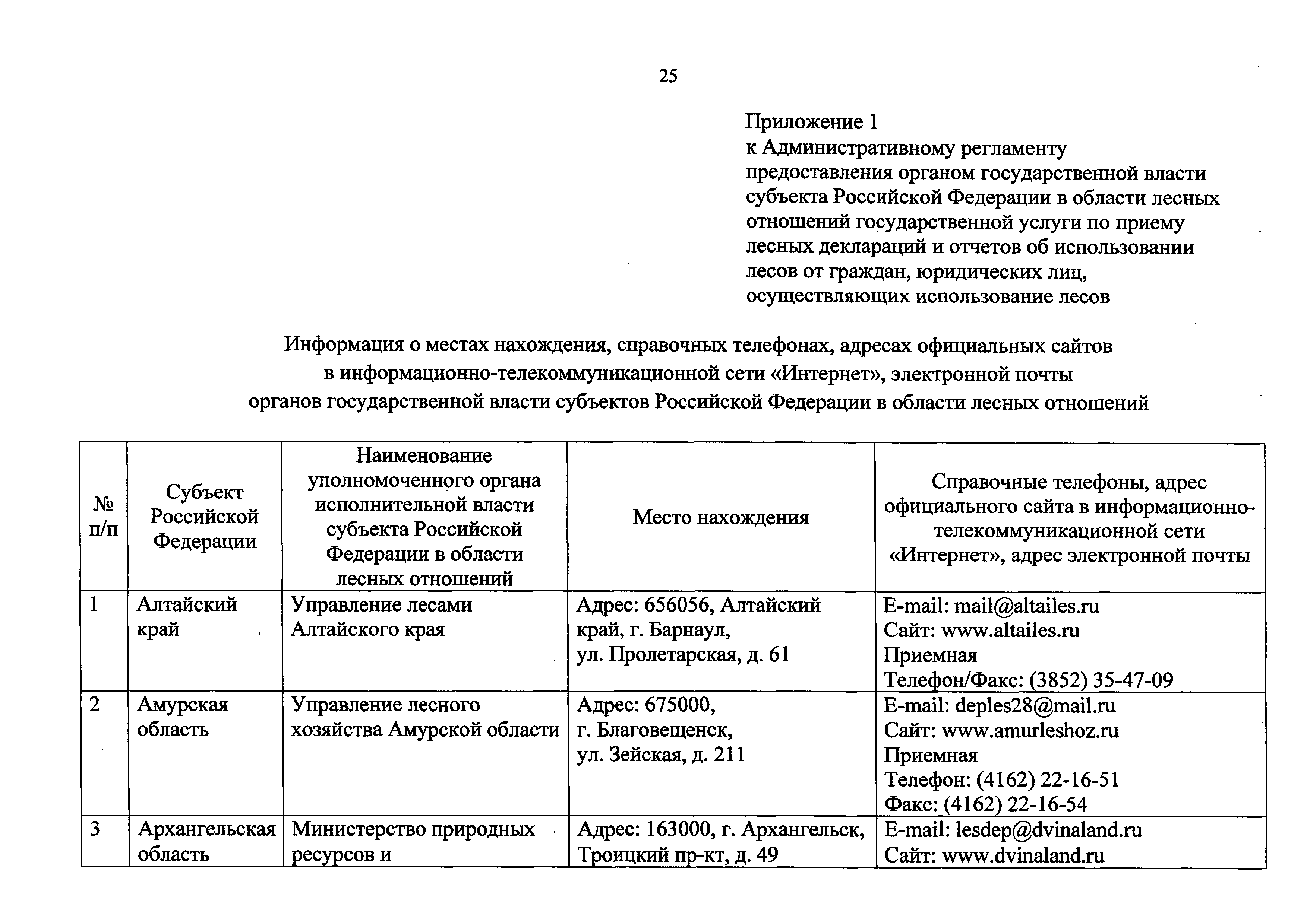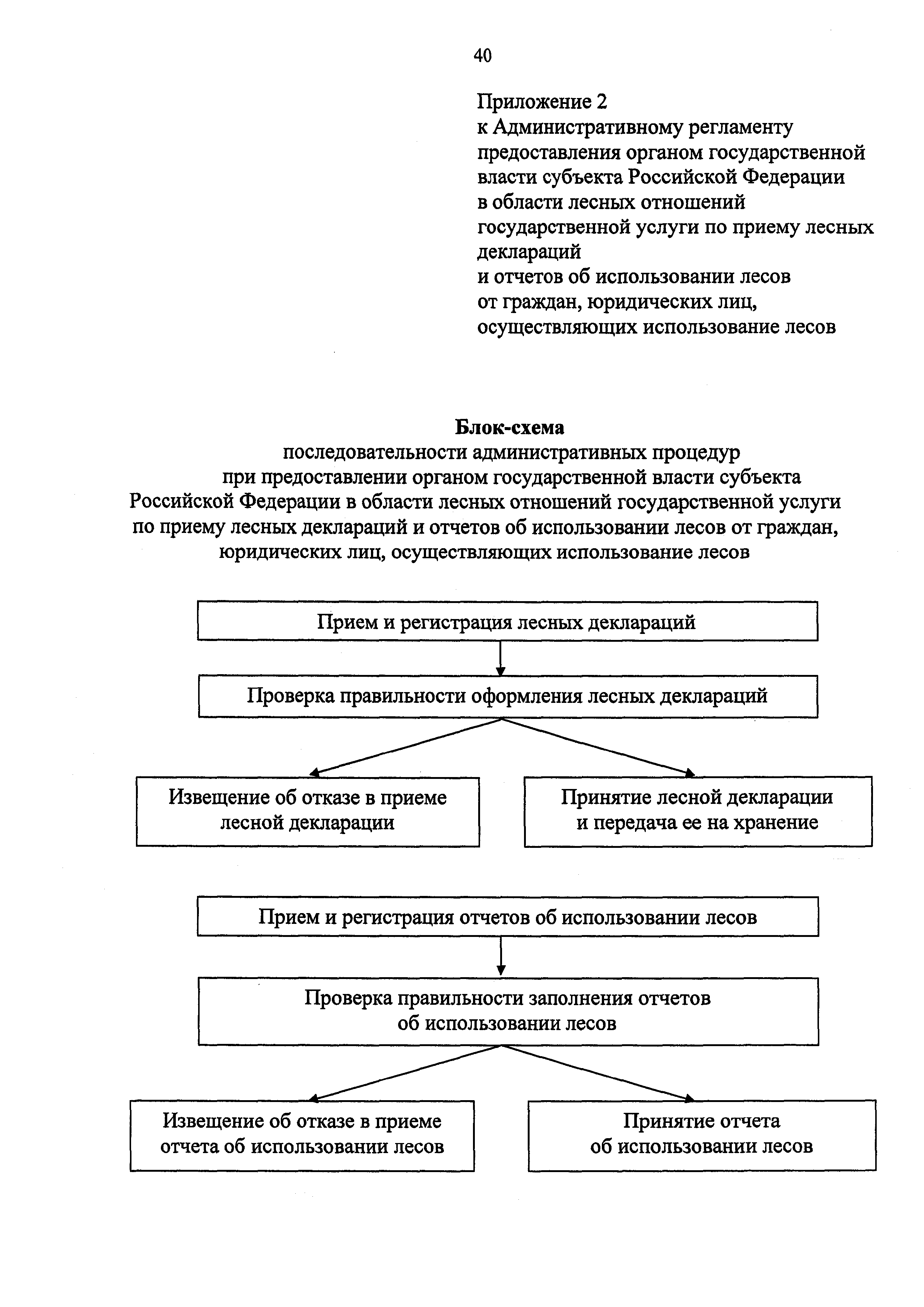 | Оглавление: | I. Общие положения II. Стандарт предоставления государственной услуги III. Состав, последовательность и сроки выполнения административных процедур (действий), требования к порядку их выполнения, в том числе особенности выполнения административных процедур (действий) в электронной форме IV. Формы контроля предоставления государственной услуги V. Досудебный (внесудебный) порядок обжалования решений и действий (бездействия) уполномоченного органа, а также его должностных лиц Приложение 1. Информация о местах нахождения, справочных телефонах, адресах официальных сайтов в информационно-телекоммуникационной сети "Интернет", электронной почты органов государственной власти субъектов Российской Федерации в области лесных отношений Приложение 2. Блок-схема последовательности административных процедур при предоставлении органом государственной власти субъекта Российской Федерации в области лесных отношений государственной услуги по приему лесных деклараций и отчетов об использовании лесов от граждан, юридических лиц, осуществляющих использование лесов |