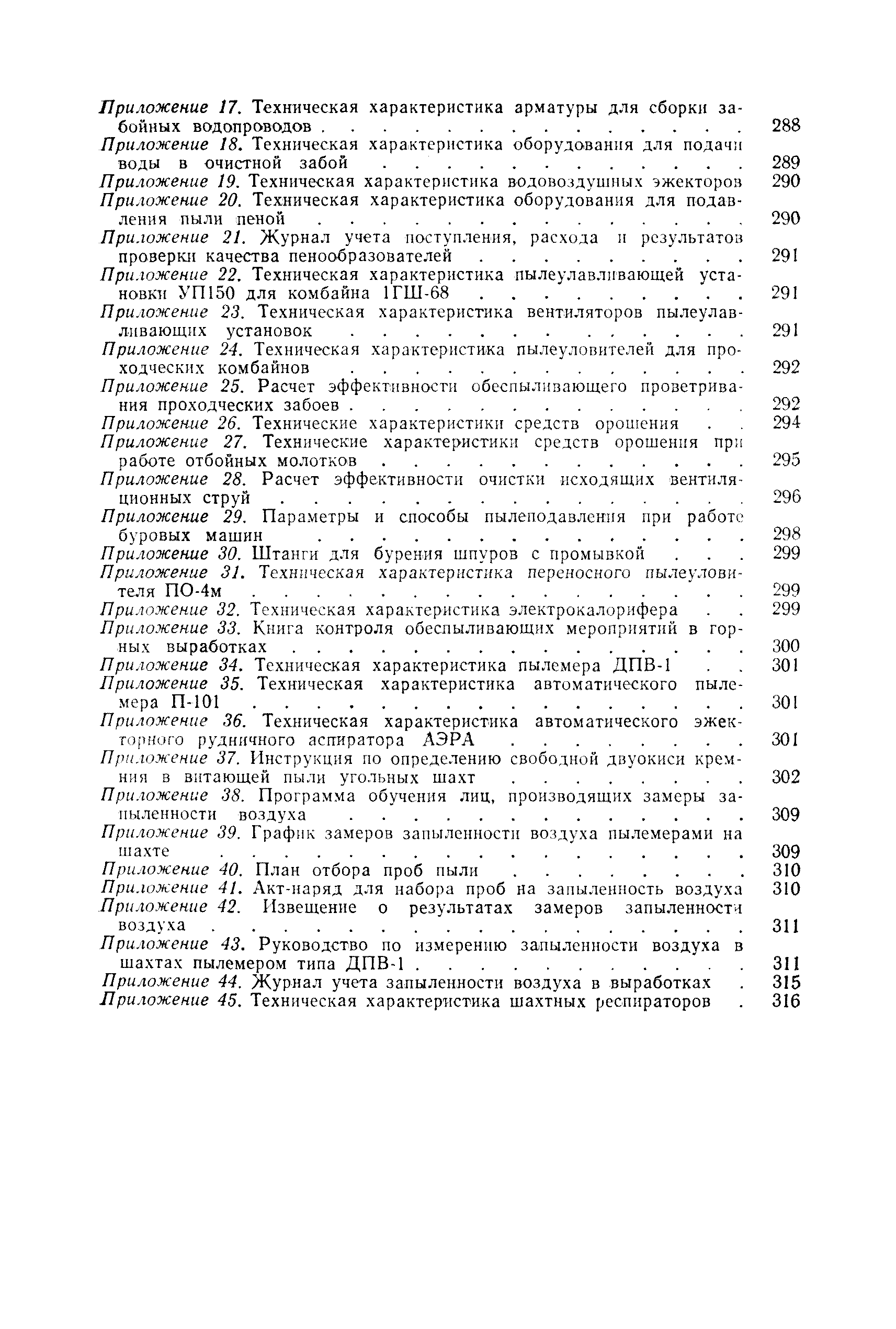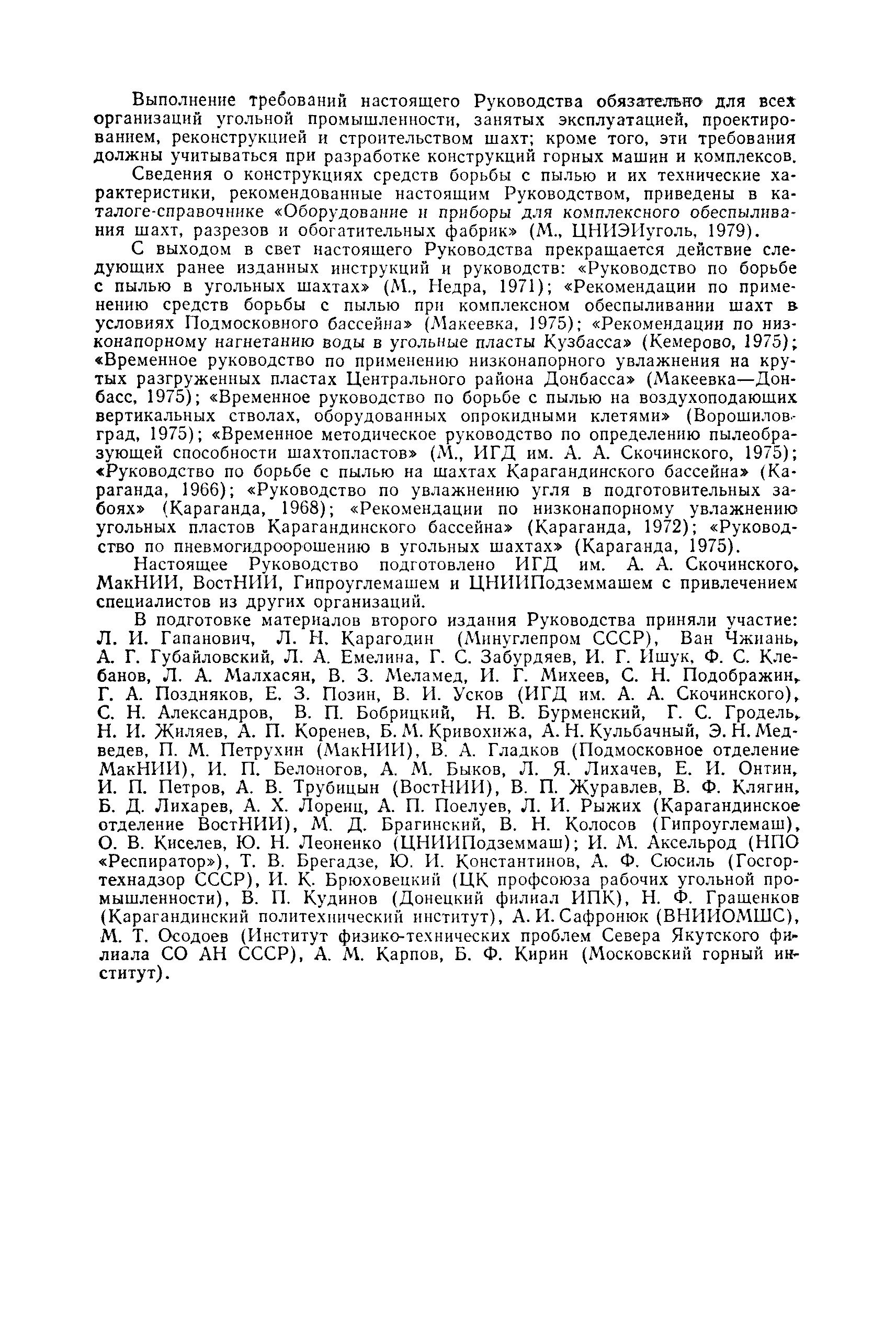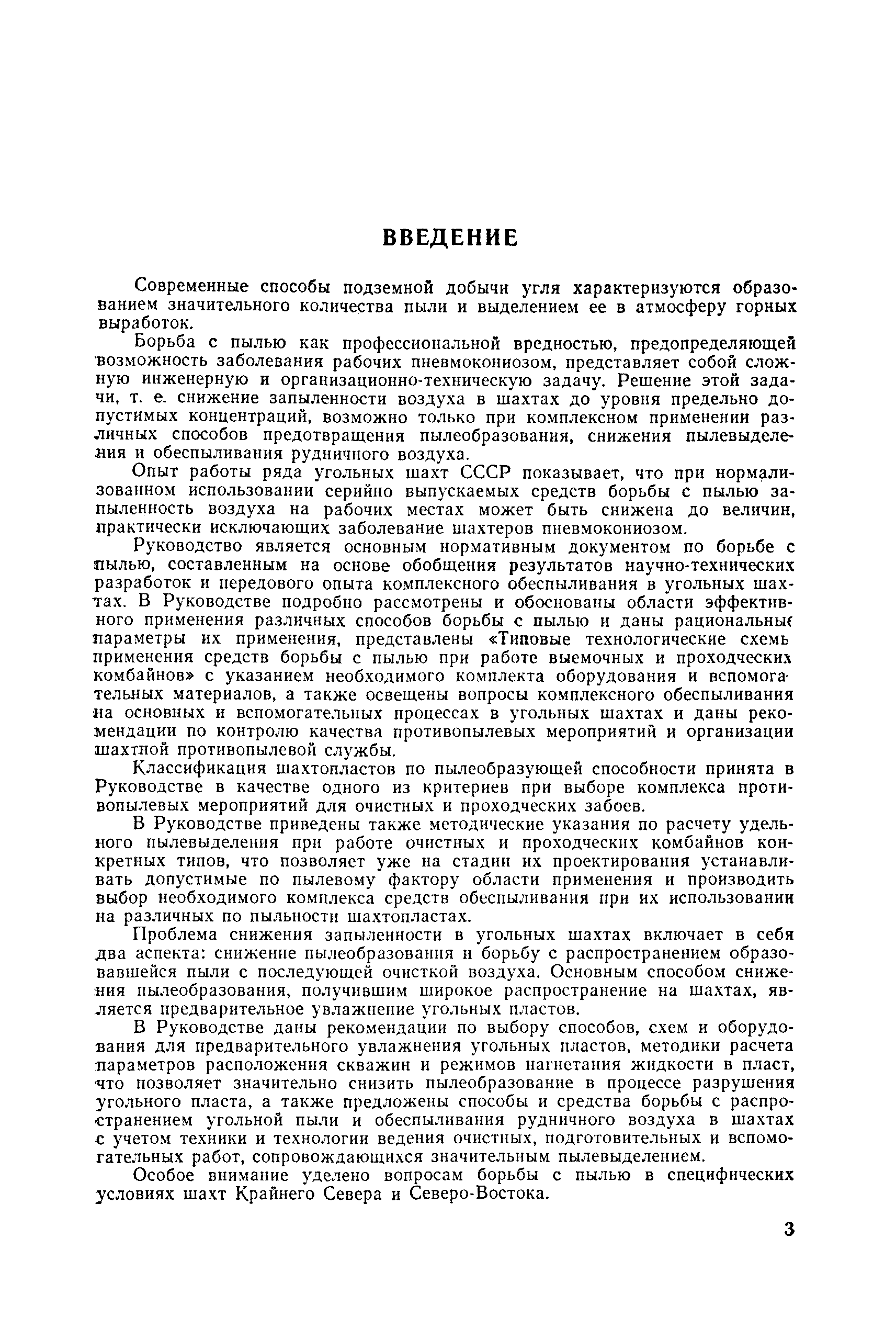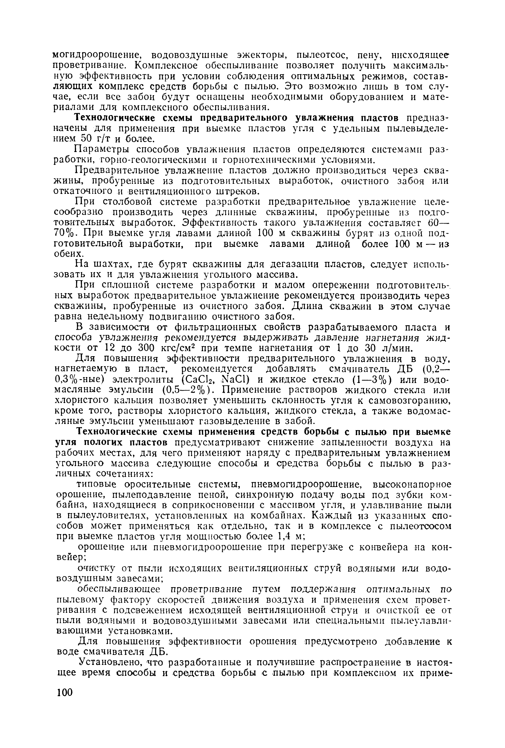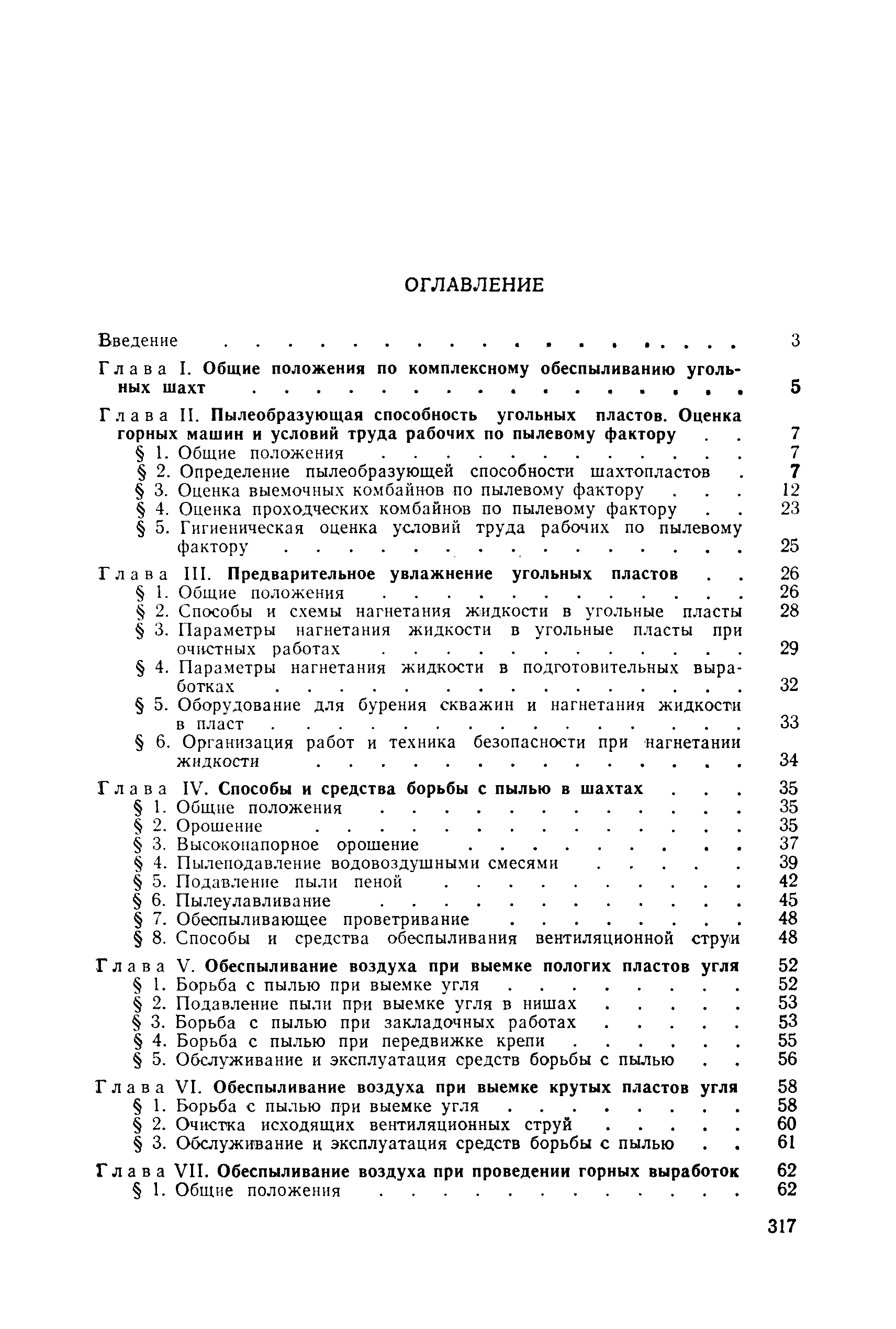 | Оглавление: | Введение Глава I. Общие положения по комплексному обеспыливанию угольных шахт Глава II. Пылеобразующая способность угольных пластов. Оценка горных машин и условий труда рабочих по пылевому фактору § 1. Общие положения § 2. Определение пылеобразующей способности шахтопластов § 3. Оценка выемочных комбайнов по пылевому фактору § 4. Оценка проходческих комбайнов по пылевому фактору § 5. Гигиеническая оценка условий труда рабочих по пылевому фактору Глава III. Предварительное увлажнение угольных пластов § 1. Общие положения § 2. Способы и схемы нагнетания жидкости в угольные пласты § 3. Параметры нагнетания жидкости в угольные пласты при очистных работах § 4. Параметры нагнетания жидкости в подготовительных выработках § 5. Оборудование для бурения скважин и нагнетания жидкости в пласт § 6. Организация работ и техника безопасности при нагнетании жидкости Глава IV. Способы и средства борьбы с пылью в шахтах § 1. Общие положения § 2. Орошение § 3. Высоконапорное орошение § 4. Пылеподавление водовоздушными смесями § 5. Подавление пыли пеной § 6. Пылеулавливание § 7. Обеспыливающее проветривание § 8. Способы и средства обеспыливания вентиляционной струи Глава V. Обеспыливание воздуха при выемке пологих пластов угля § 1. Борьба с пылью при выемке угля § 2. Подавление пыли при выемке угля в нишах § 3. Борьба с пылью при закладочных работах § 4. Борьба с пылью при передвижке крепи § 5. Обслуживание и эксплуатация средств борьбы с пылью Глава VI. Обеспыливание воздуха при выемке крутых пластов угля § 1. Борьба с пылью при выемке угля § 2. Очистка исходящих вентиляционных струй § 3. Обслуживание и эксплуатация средств борьбы с пылью Глава VII. Обеспыливание воздуха при проведении горных выработок § 1. Общие положения § 2. Обеспыливание воздуха при проведении горных выработок проходческими комбайнами избирательного действия § 3. Обеспыливание воздуха при проведении горных выработок проходческими комбайнами с ограждающими щитами § 4. Обеспыливание воздуха при ведении буровзрывных работ § 5. Обслуживание и эксплуатация средств борьбы с пылью Глава VIII. Борьба с пылью при проходке стволов шахт Глава IX. Обеспыливание воздуха при погрузочно-транспортных работах § 1. Общие положения § 2. Орошение при работе погрузочных машин § 3. Обеспыливание воздуха при погрузке угля из лав § 4. Обеспыливание воздуха при транспортировании угля § 5. Обеспыливание воздуха при работе опрокидывателей Глава Х. Обеспыливание воздуха в угольных шахтах Крайнего Севера § 1. Общие положения § 2. Обеспыливание воздуха при бурении шпуров и скважин § 3. Обеспыливание воздуха при взрывных работах § 4. Обеспыливание воздуха при погрузочно-разгрузочных операциях § 5. Обеспыливание воздуха при доставке и транспортировании угля § 6. Обеспыливание воздуха при работе комбайнов Глава XI. Обеспыливание воздуха, поступающего в шахты с поверхности Глава XII. Водоснабжение горных выработок, очистка шахтных вод Глава XIII. Контроль качества применяемых мероприятий по борьбе с пылью § 1. Организация шахтной противопылевой службы § 2. Контроль качества применяемых мероприятий § 3. Пылевой контроль Глава XIV. Индивидуальные средства защиты от пыли Приложение 1. Типовые технологические схемы применения средств борьбы с пылью при работе выемочных и проходческих комбайнов Приложение 2. Образцы паспортов 