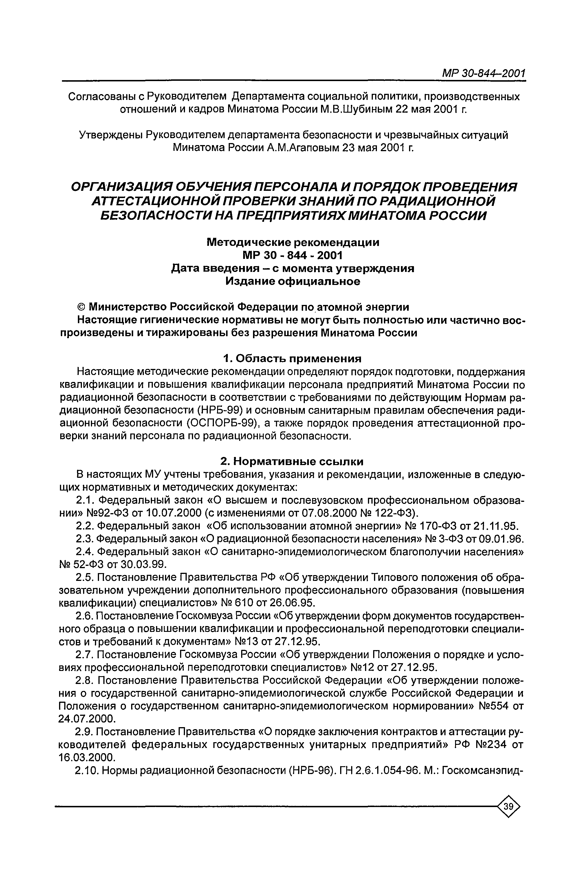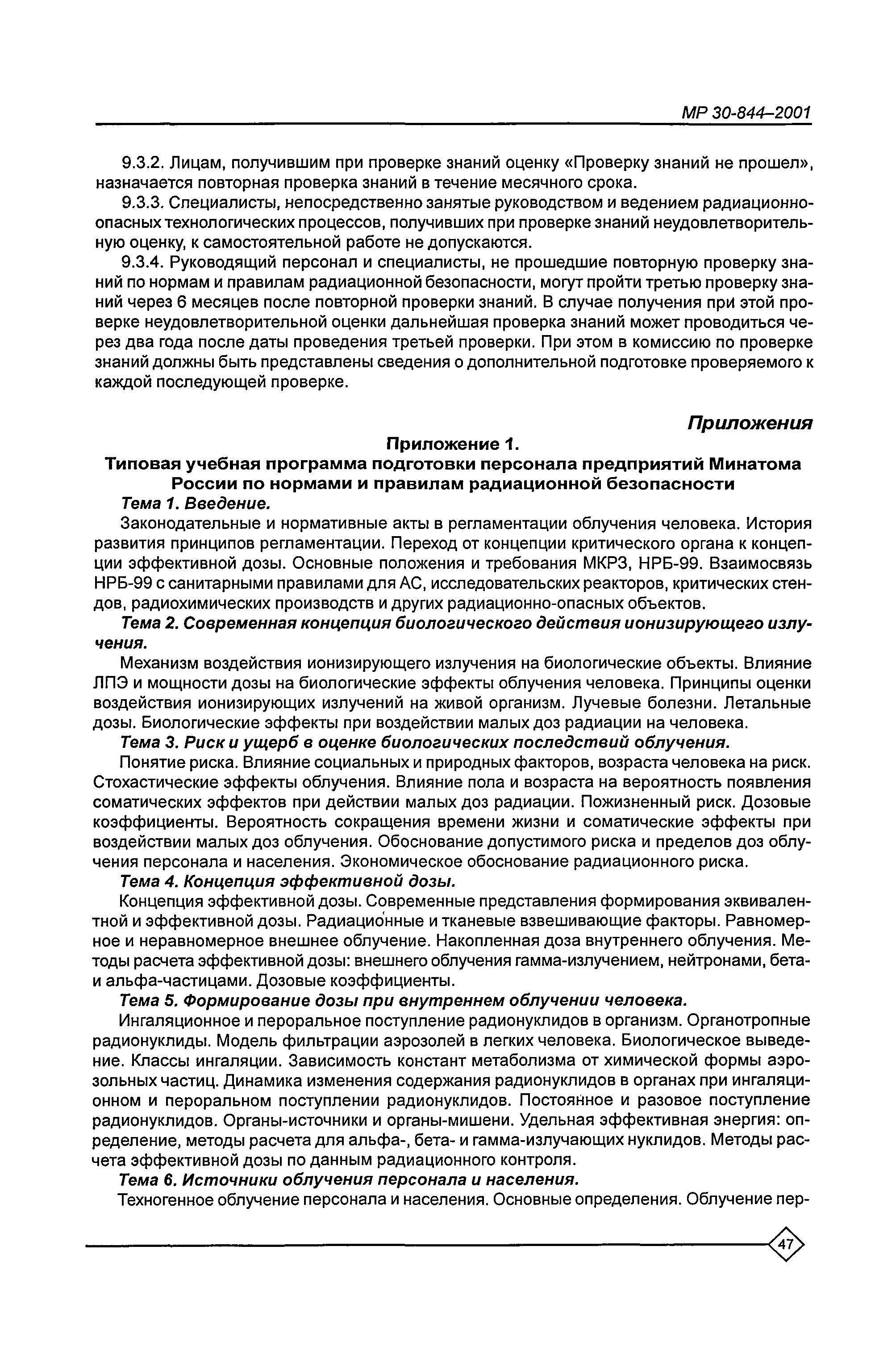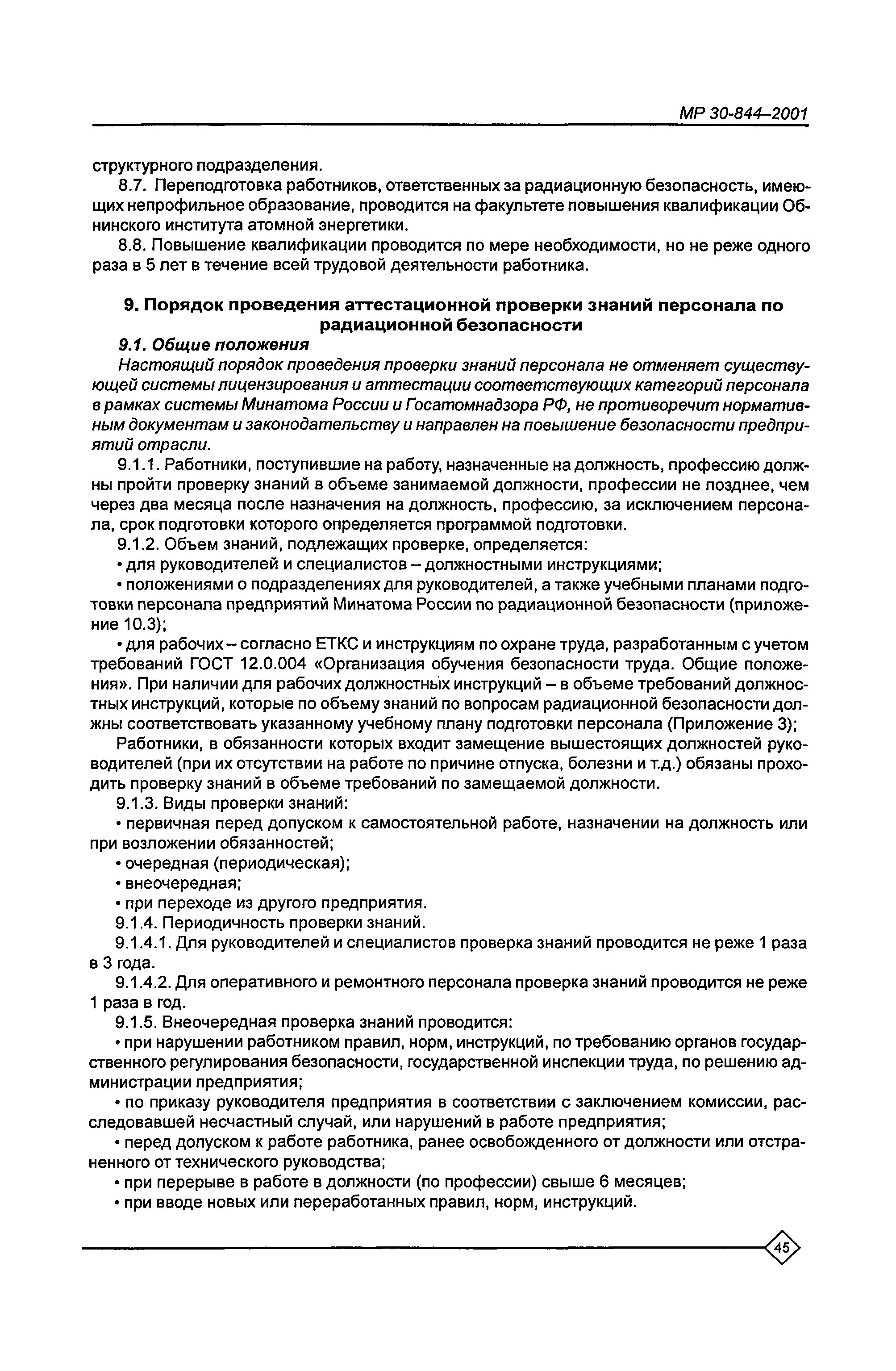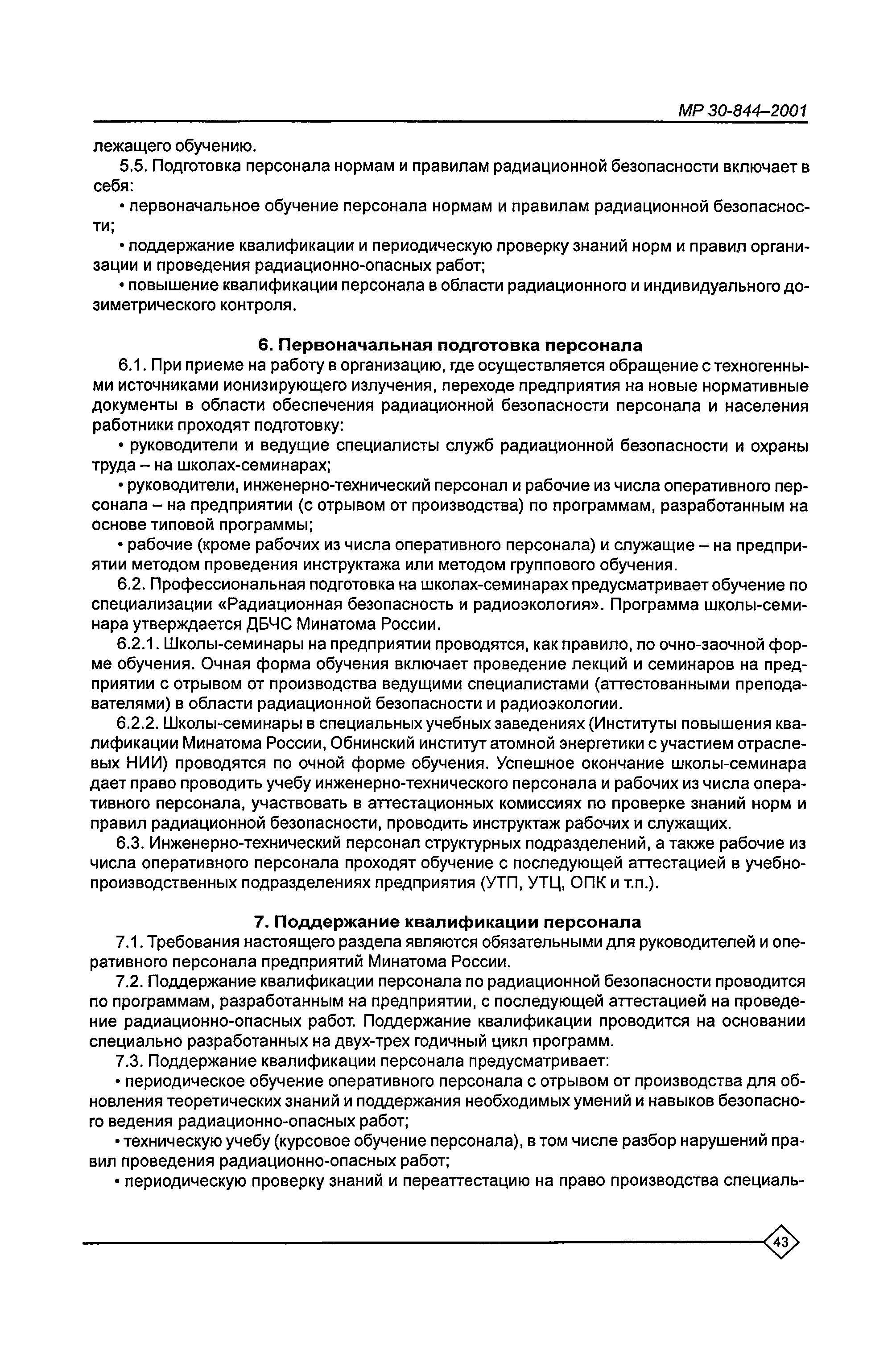 Организация обучения персонала и порядок проведения аттестационной проверки знаний по радиационной безопасности на предприятиях Минатома России. Методические рекомендации МР 30—844—2001