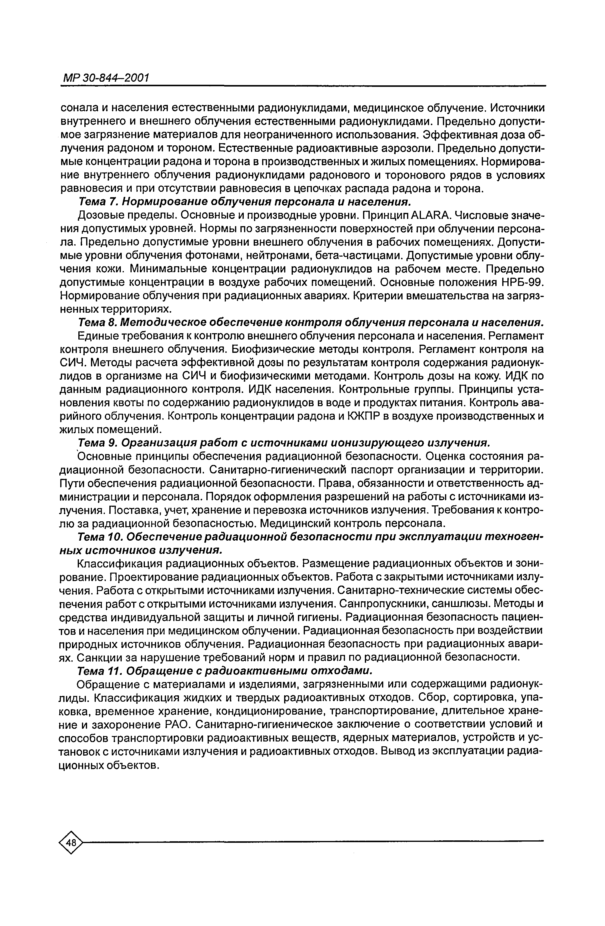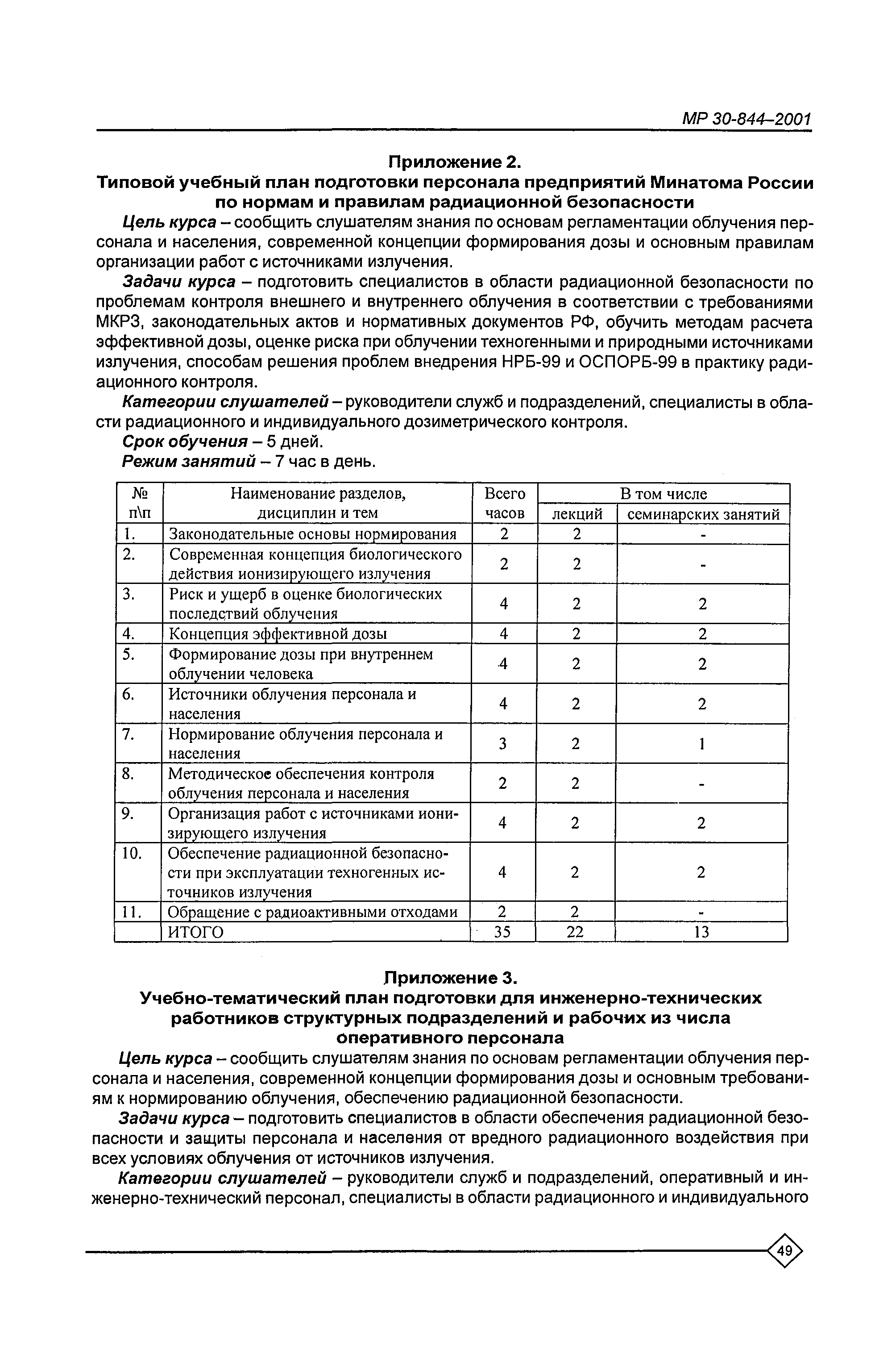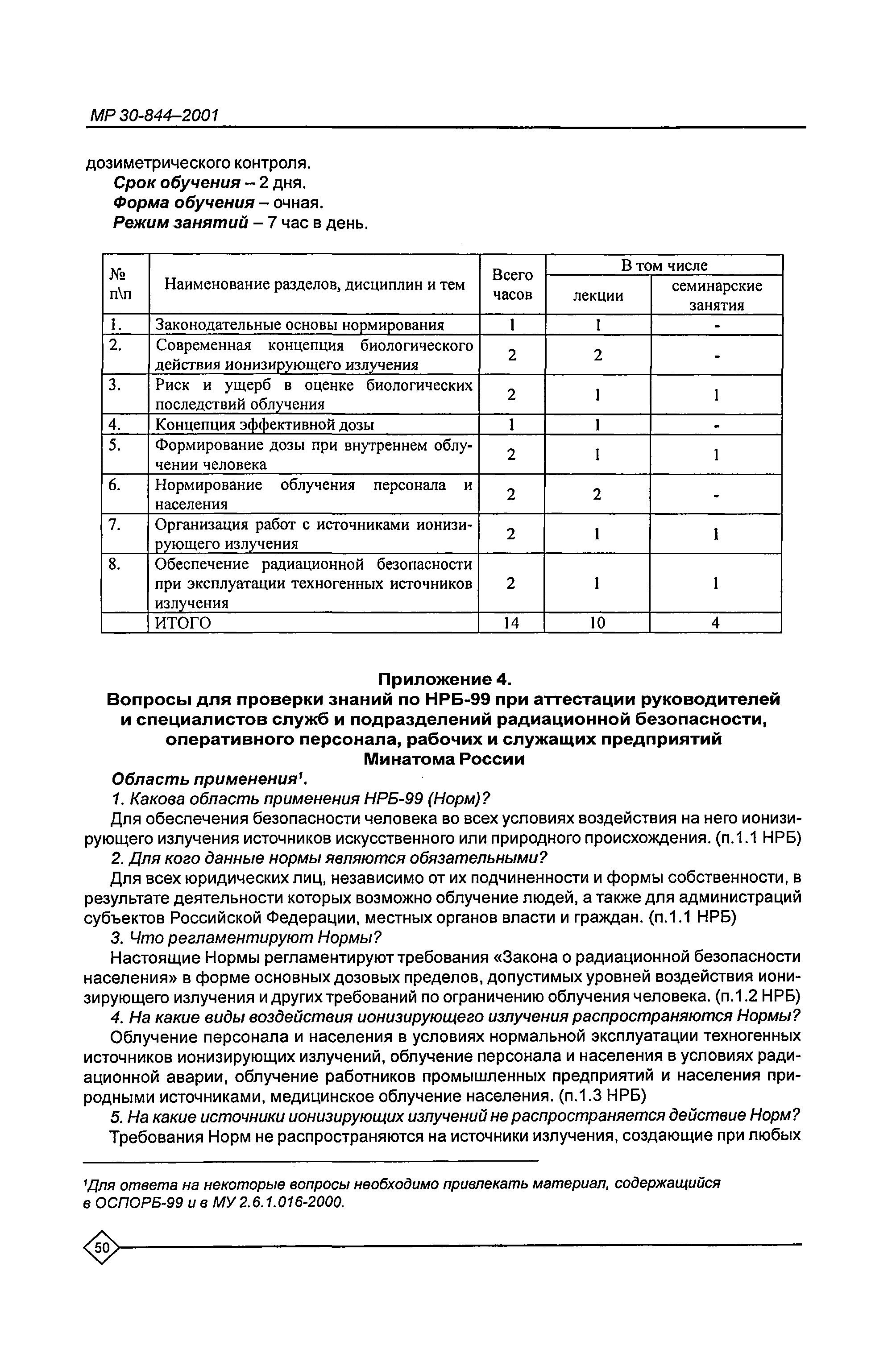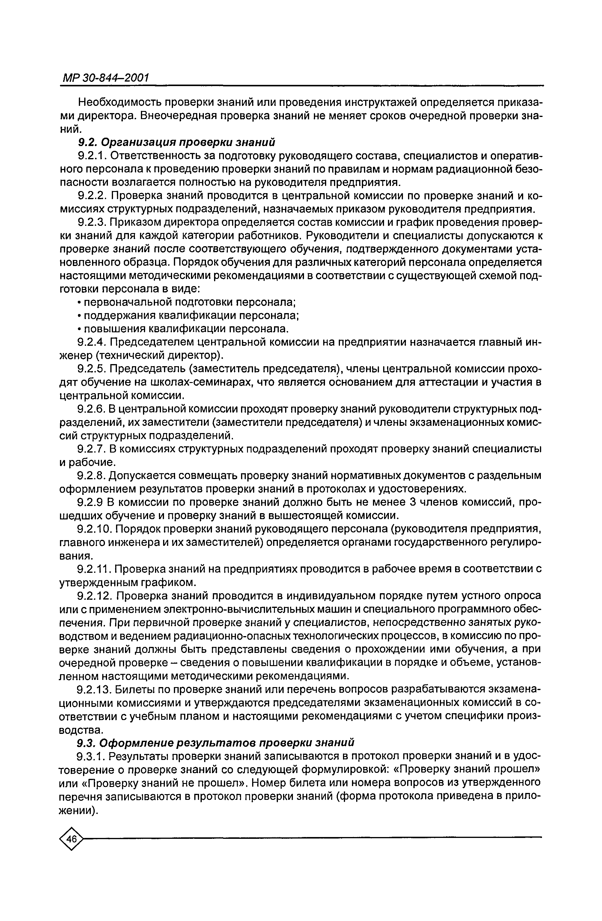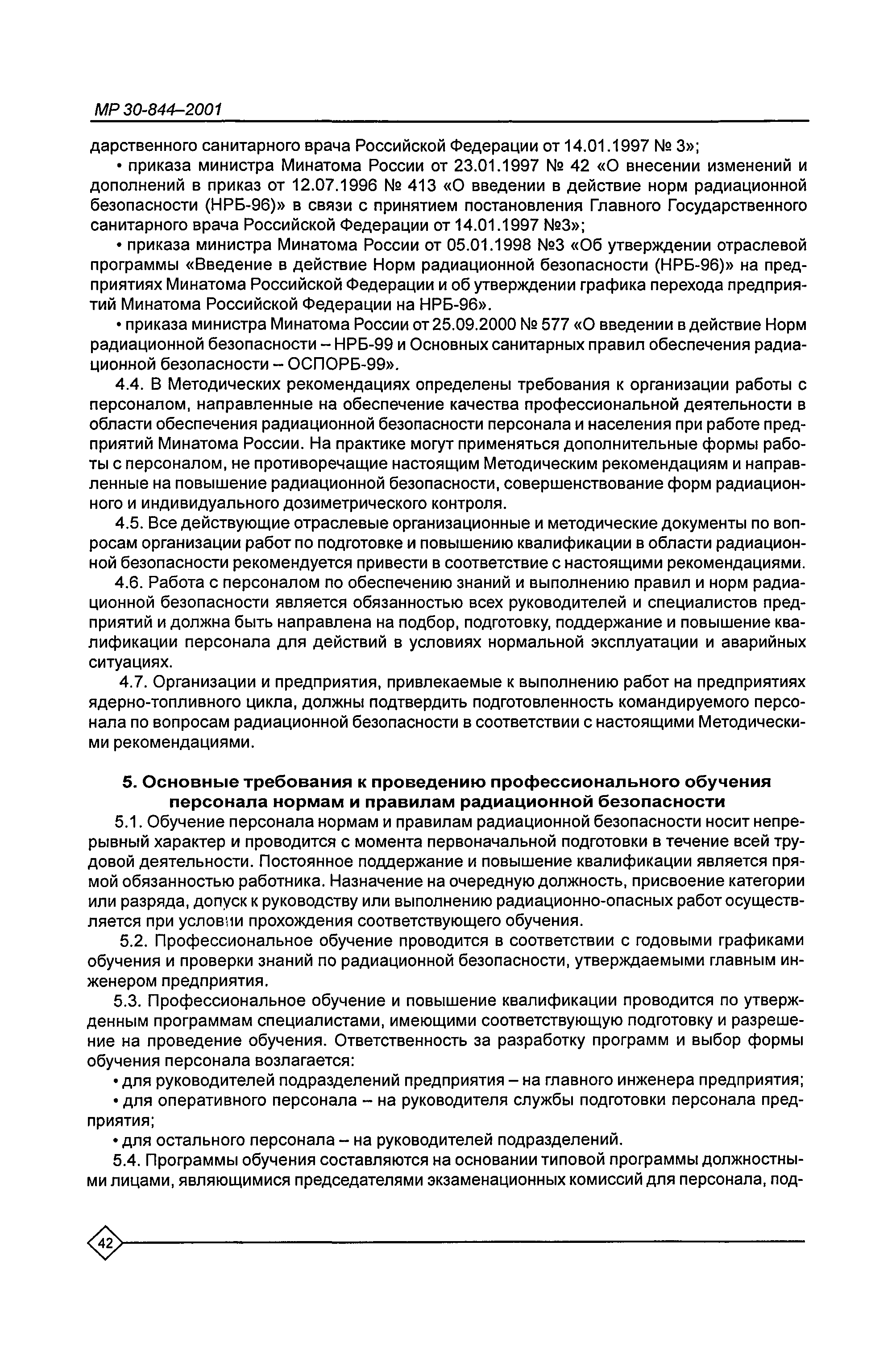 Организация обучения персонала и порядок проведения аттестационной проверки знаний по радиационной безопасности на предприятиях Минатома России. Методические рекомендации МР 30—844—2001