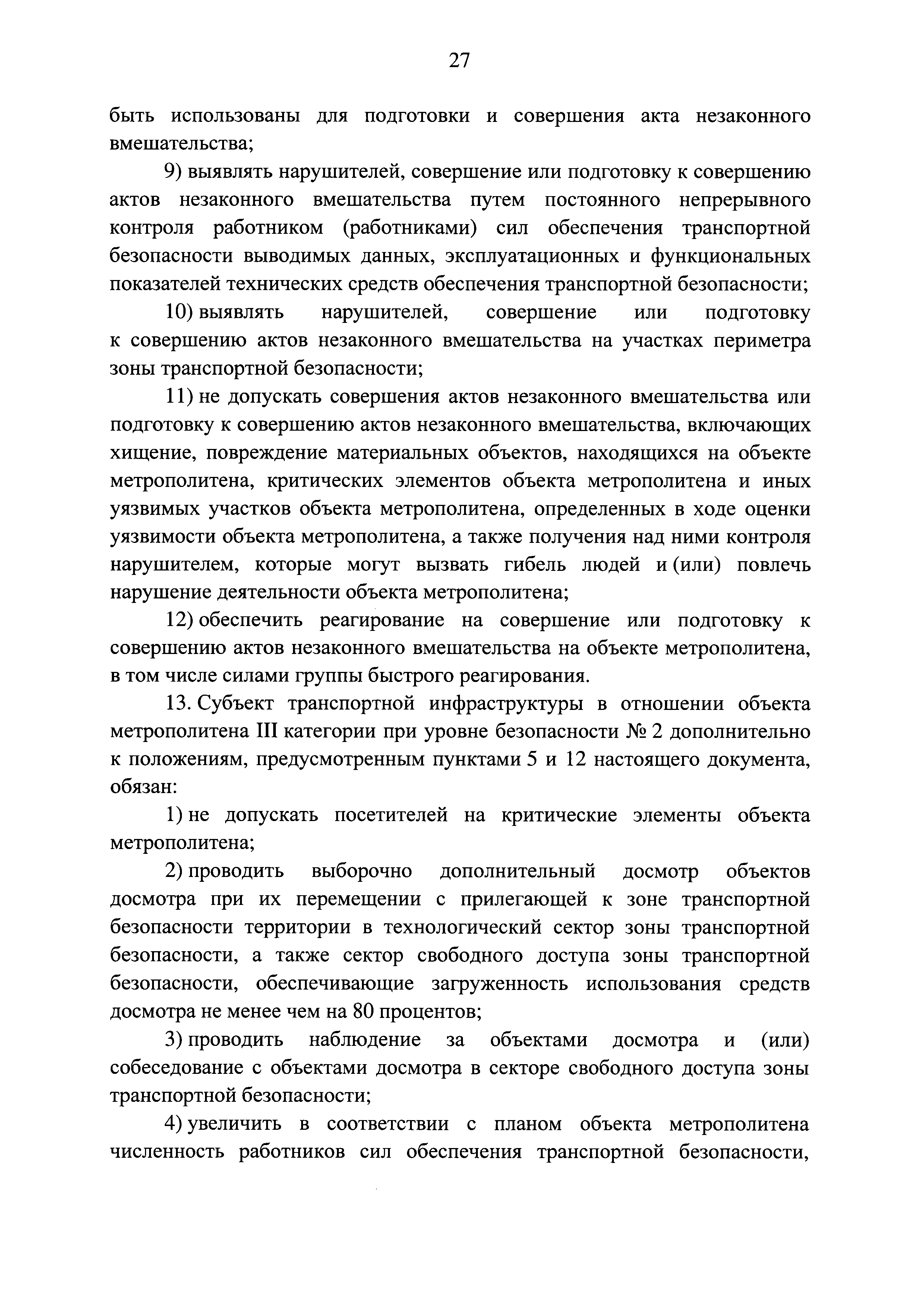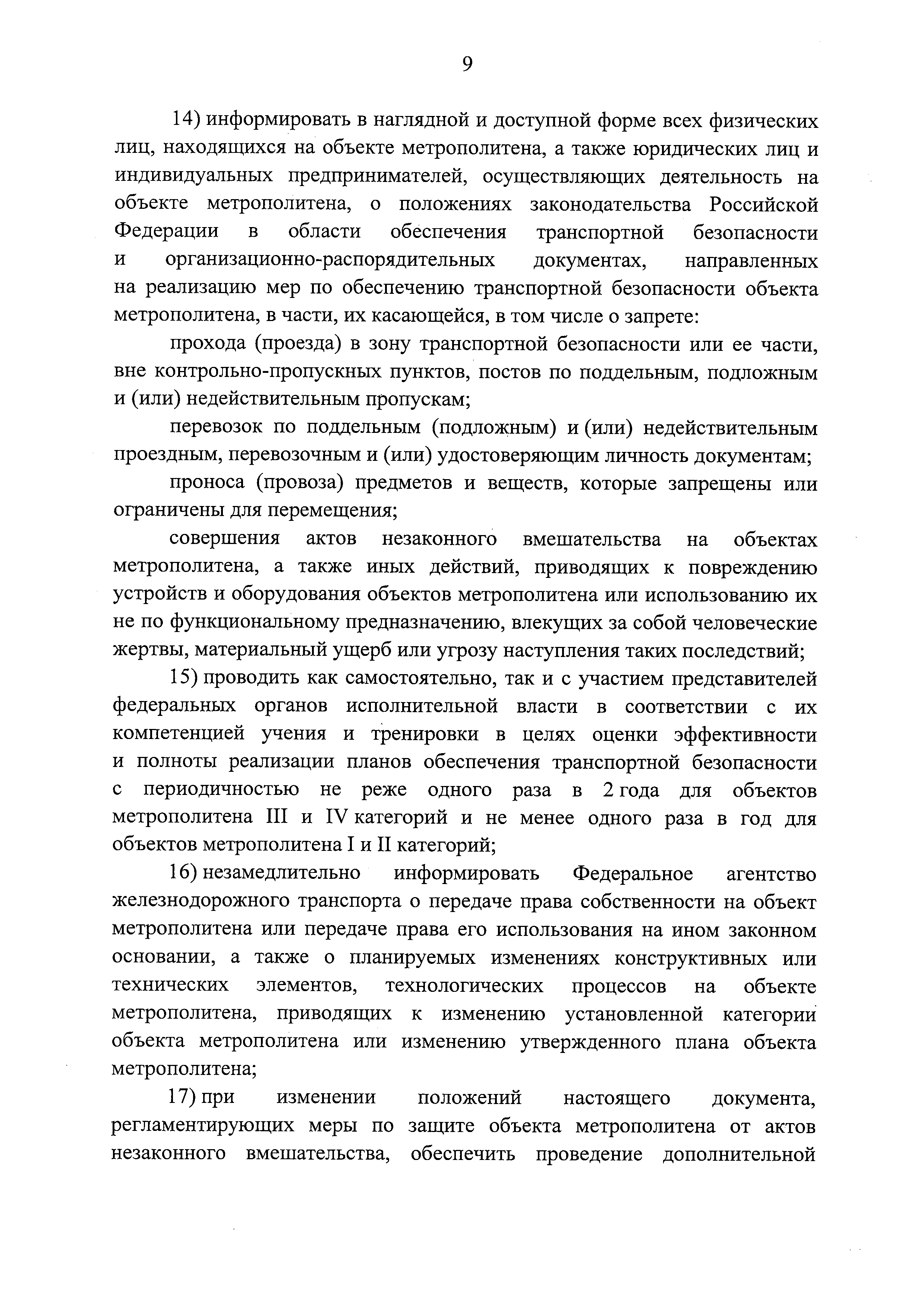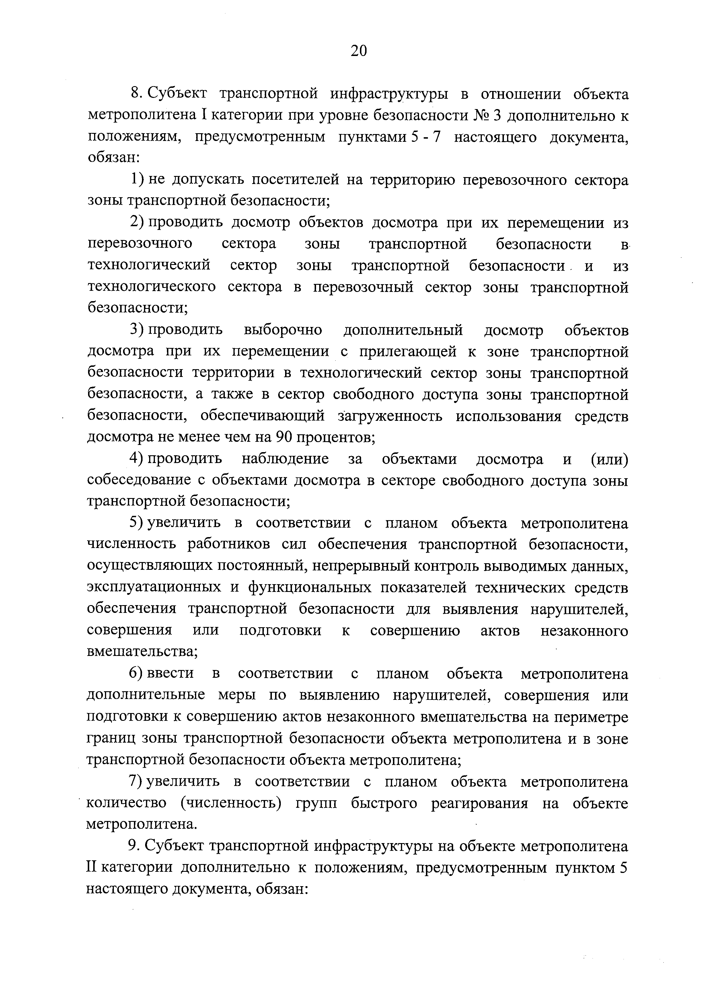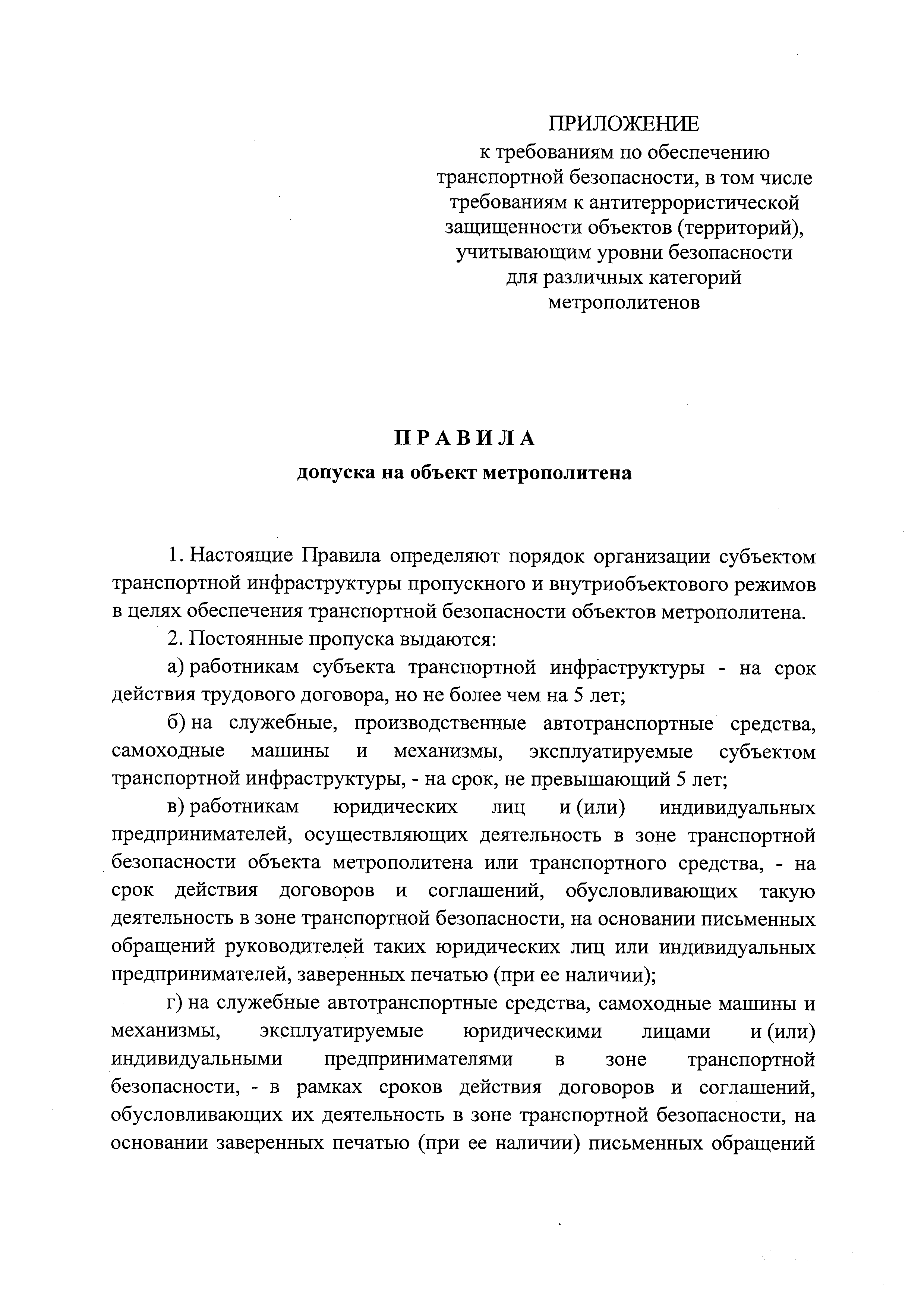 Требования по обеспечению транспортной безопасности, в том числе требования к антитеррористической защищенности объектов (территорий), учитывающие уровни безопасности для различных категорий метрополитенов| Статус: | действует | | Название рус.: | Требования по обеспечению транспортной безопасности, в том числе требования к антитеррористической защищенности объектов (территорий), учитывающие уровни безопасности для различных категорий метрополитенов | | Дата добавления в базу: | 05.05.2017 | | Дата актуализации: | 01.01.2021 | | Дата введения: | 14.04.2017 | | Дата окончания срока действия: | 01.01.2021 | | Область применения: | Документ устанавливает требования по обеспечению транспортной безопасности, в том числе требования к антитеррористической защищенности объектов (территорий), учитывающие уровни безопасности для различных категорий метрополитенов | | Оглавление: | Приложение. Правила допуска на объект метрополитена | | Утверждён: | 05.04.2017 Правительство РФ (Government of the Russian Federation 410)