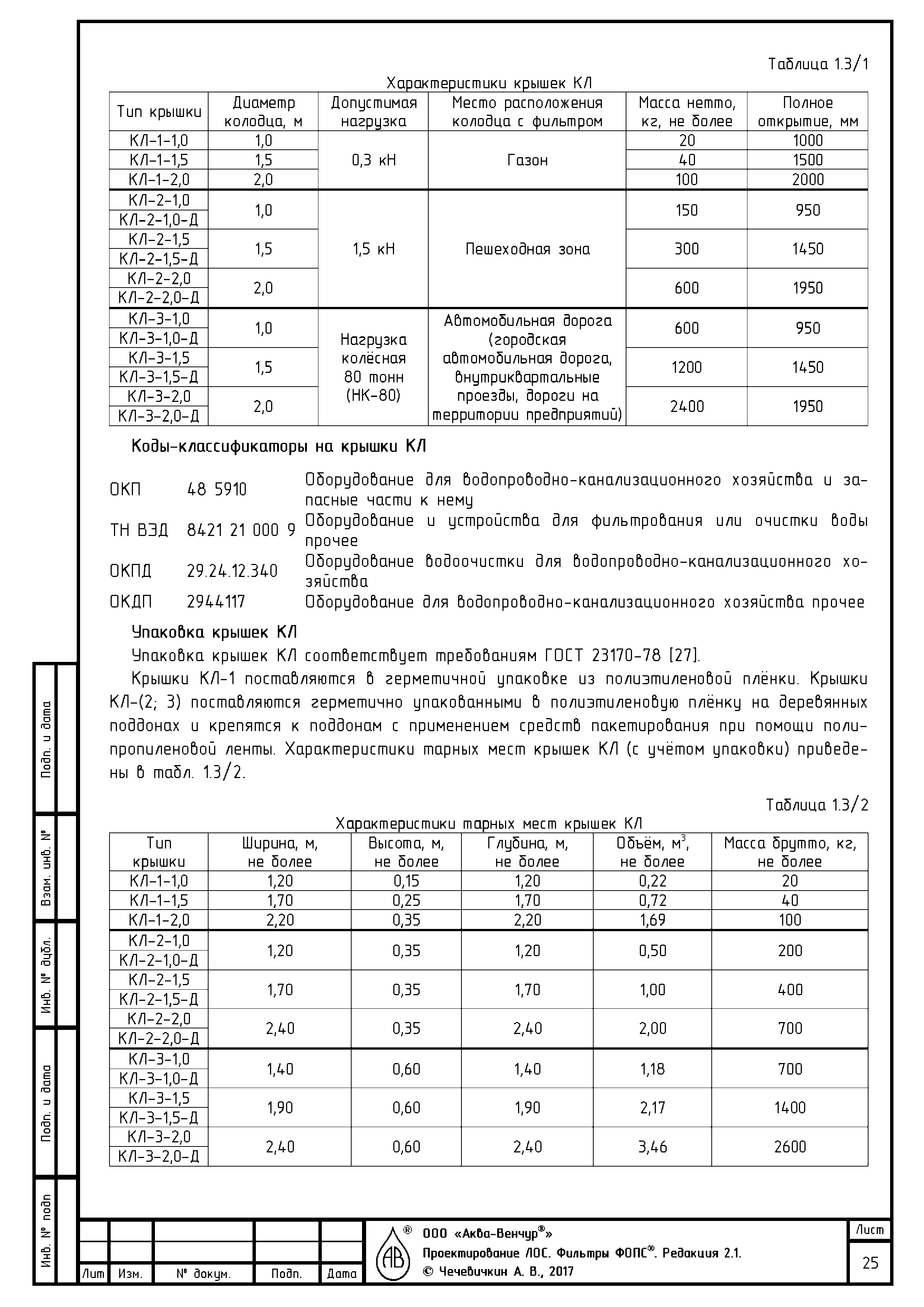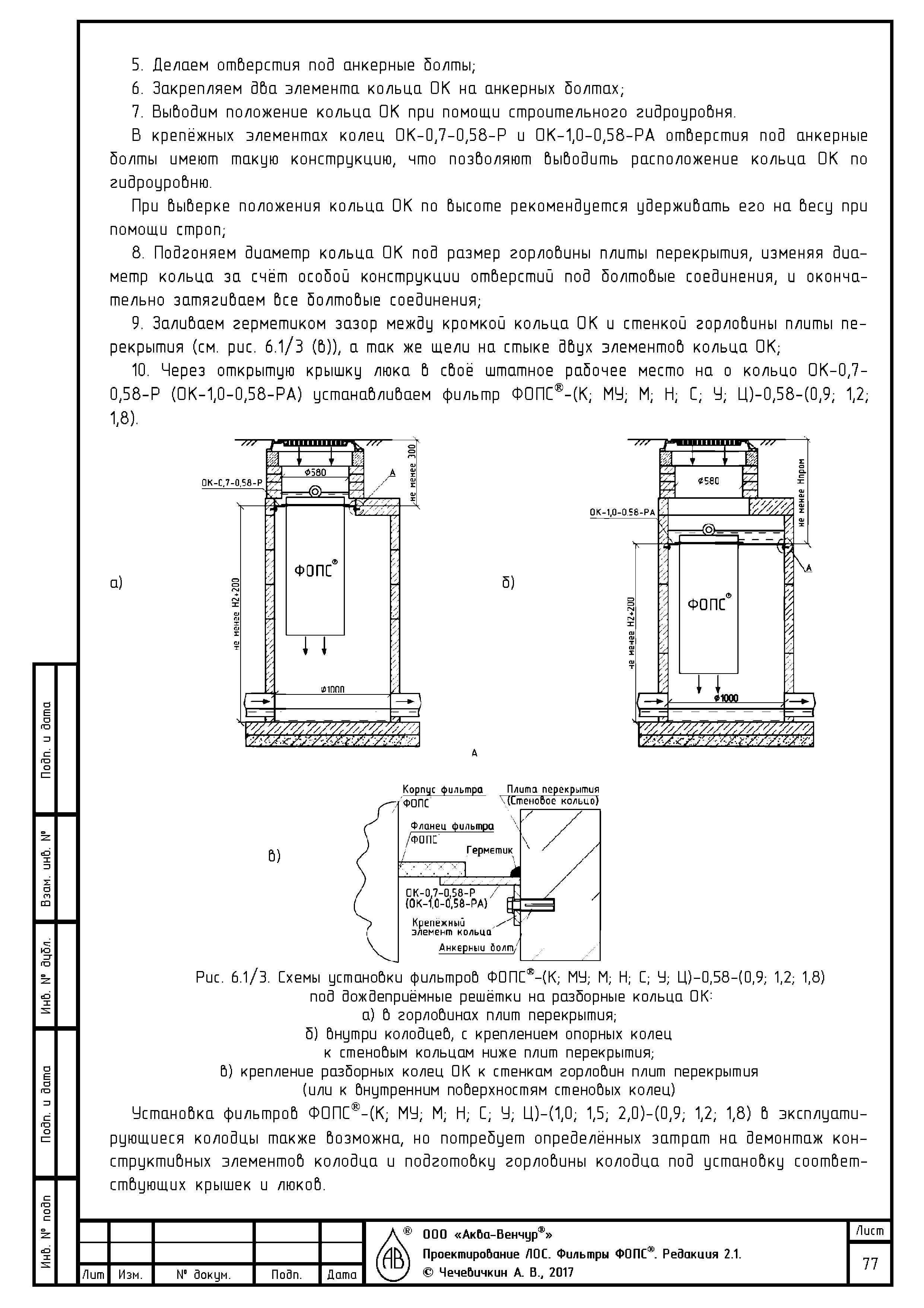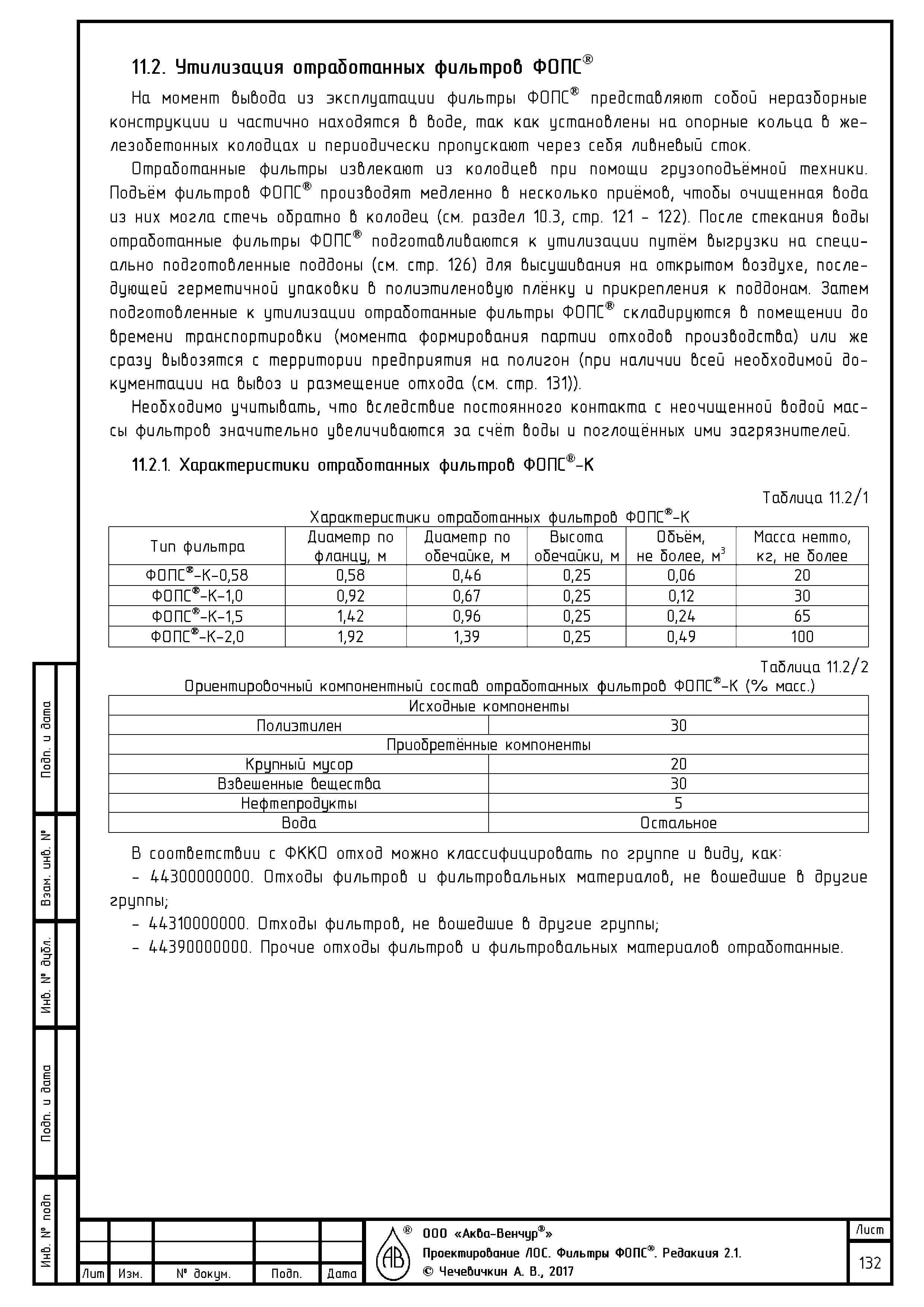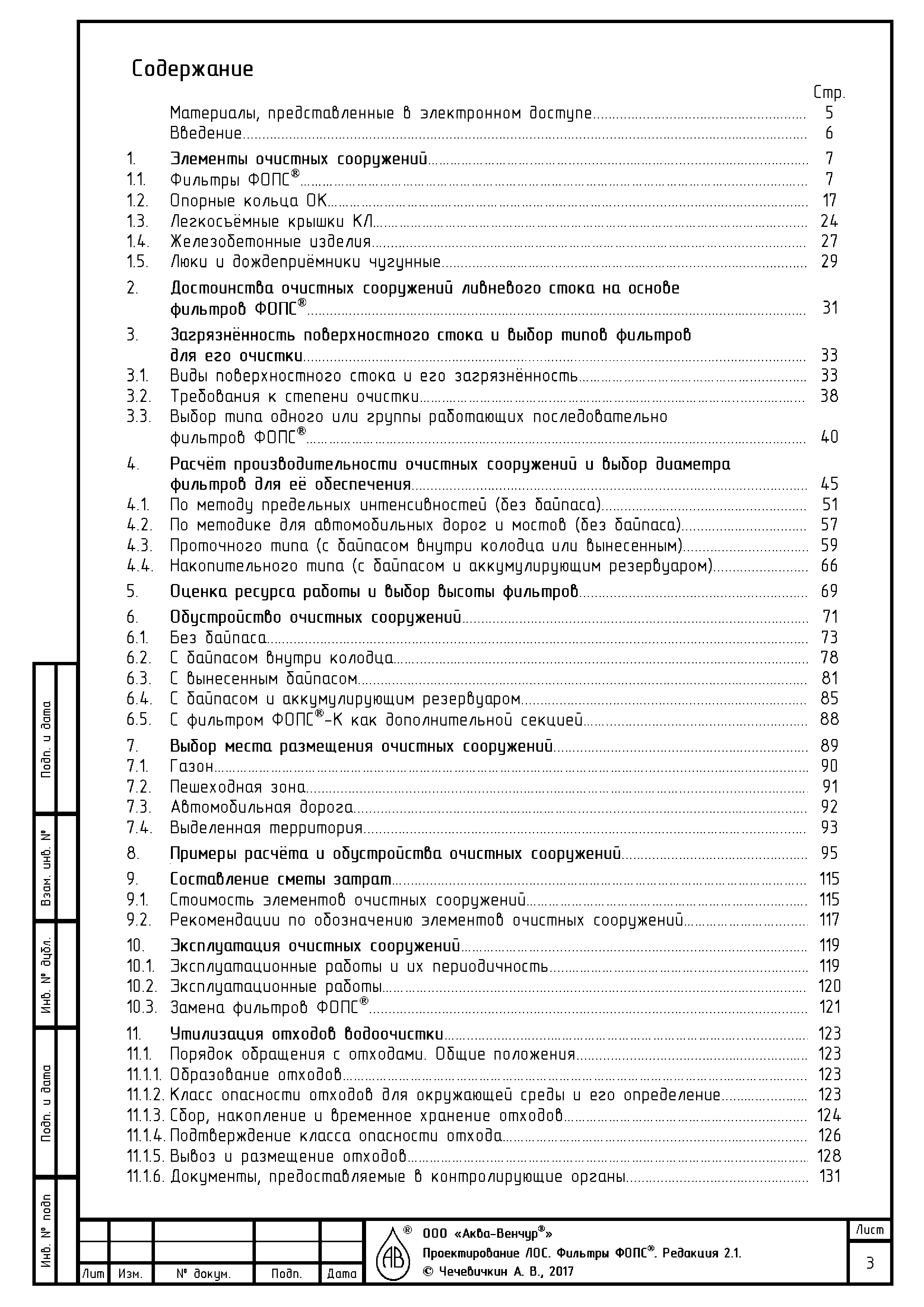 | Оглавление: | Материалы, представленные в электронном доступе Введение 1. Элементы очистных сооружений 1.1. Фильтры ФОПС® 1.2. Опорные кольца ОК 1.3. Легкосъемные крышки КЛ 1.4. Железобетонные изделия 1.5. Люки и дождеприемники чугунные 2. Достоинства очистных сооружений ливневого стока на основе фильтров ФОПС® 3. Загрязненность поверхностного стока и выбор типов фильтров для его очистки 3.1. Виды поверхностного стока и его загрязнённость 3.2. Требования к степени очистки 3.3. Выбор типа одного или группы работающих последовательно фильтров ФОПС® 4. Расчет производительности очистных сооружений и выбор диаметра фильтров для ее обеспечения 4.1. По методу предельных интенсивностей (без байпаса) 4.2. По методике для автомобильных дорого и мостов (без байпаса) 4.3. Проточного типа (с байпасом внутри колодца или вынесенным) 4.4. Накопительного типа (с байпасом и аккумулирующим резервуаром) 5. Оценка ресурса работы и выбор высоты фильтров 6. Обустройство очистных сооружений 6.1. Без байпаса 6.2. С байпасом внутри колодца 6.3. С вынесенным байпасом 6.4. С байпасом и аккумулирующим резервуаром 6.5. С фильтром ФОПС®-К как дополнительной секцией 7. Выбор места размещения очистных сооружений 7.1. Газон 7.2. Пешеходная зона 7.3. Автомобильная дорога 7.4. Выделенная территория 8. Примеры расчета и обустройства очистных сооружений 9. Составление сметы затрат 9.1. Стоимость элементов очистных сооружений 9.2. Рекомендации по обозначения элементов очистных сооружений 10. Эксплуатация очистных сооружений 10.1. Эксплуатационные работы и их периодичность 10.2. Эксплуатационные работы 10.3. Замена фильтров ФОПС® 11. Утилизация отходов водоочистки 11.1. Порядок обращения с отходами. Общие положения 11.1.1. Образование отходов 11.1.2. Класс опасности отходов для окружающей среды и его определение 11.1.3. Сбор, накопление и временное храненые отходов 11.1.4. Подтверждение класса опасности отхода 11.1.5. Вывоз и размещение отходов 11.1.6. Документы, предоставляемые в контролирующие органы 11.2. Утилизация отработанных фильтров ФОПС® 11.2.1. Характеристики отработанных фильтров ФОПС®-К 11.2.2. Характеристики отработанных фильтров ФОПС®-МУ 11.2.3. Характеристики отработанных фильтров ФОПС®-М 11.2.4. Характеристики отработанных фильтров ФОПС®-Н 11.2.5. Характеристики отработанных фильтров ФОПС®-С 11.2.6. Характеристики отработанных фильтров ФОПС®-У 11.2.7. Характеристики отработанных фильтров ФОПС®-Ц 11.2.8.Отходы, выгружаемые из фильтров ФОПС®—К и ФОПС®—С 11.2.9. Показатели опасности 11.3. Утилизация отходов из аккумулирующих резервуаров очистных сооружений Список литературы Приложение 1. Определение величины максимального суточного слоя дождевых осадков для селитебных территорий и промышленных предприятий 1 группы Приложение 2. Монтаж колодцев Приложение 3. Монтаж люков и легкосъемных крышек Приложение 4. Документы на фильтры ФОПС® |