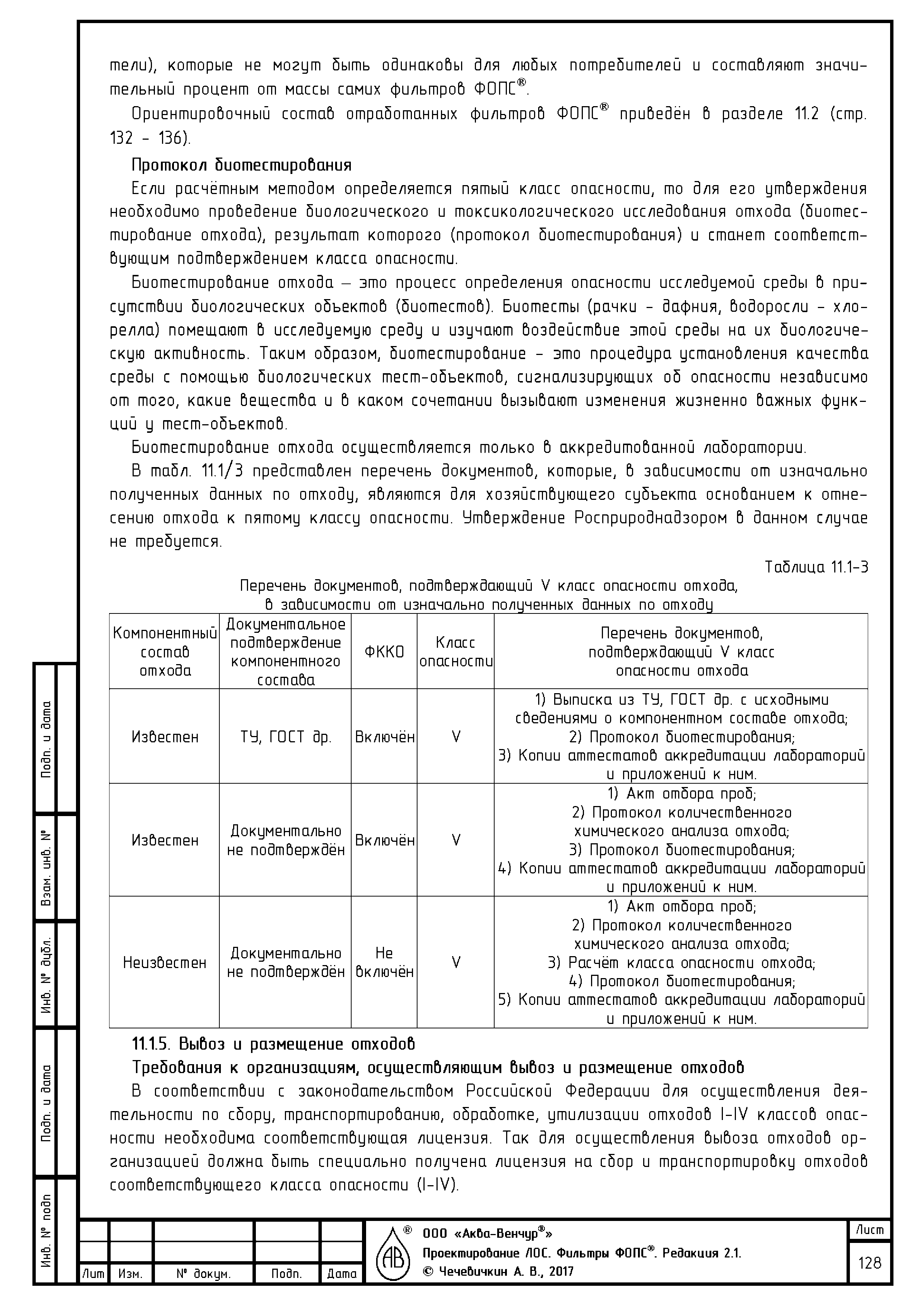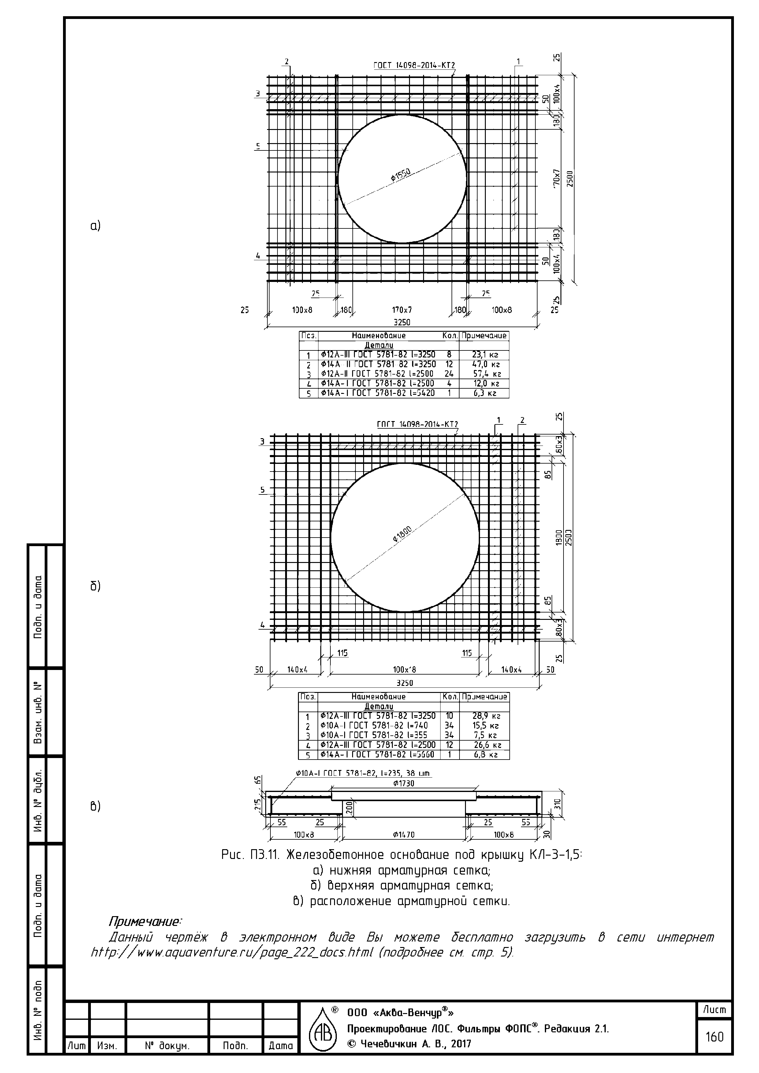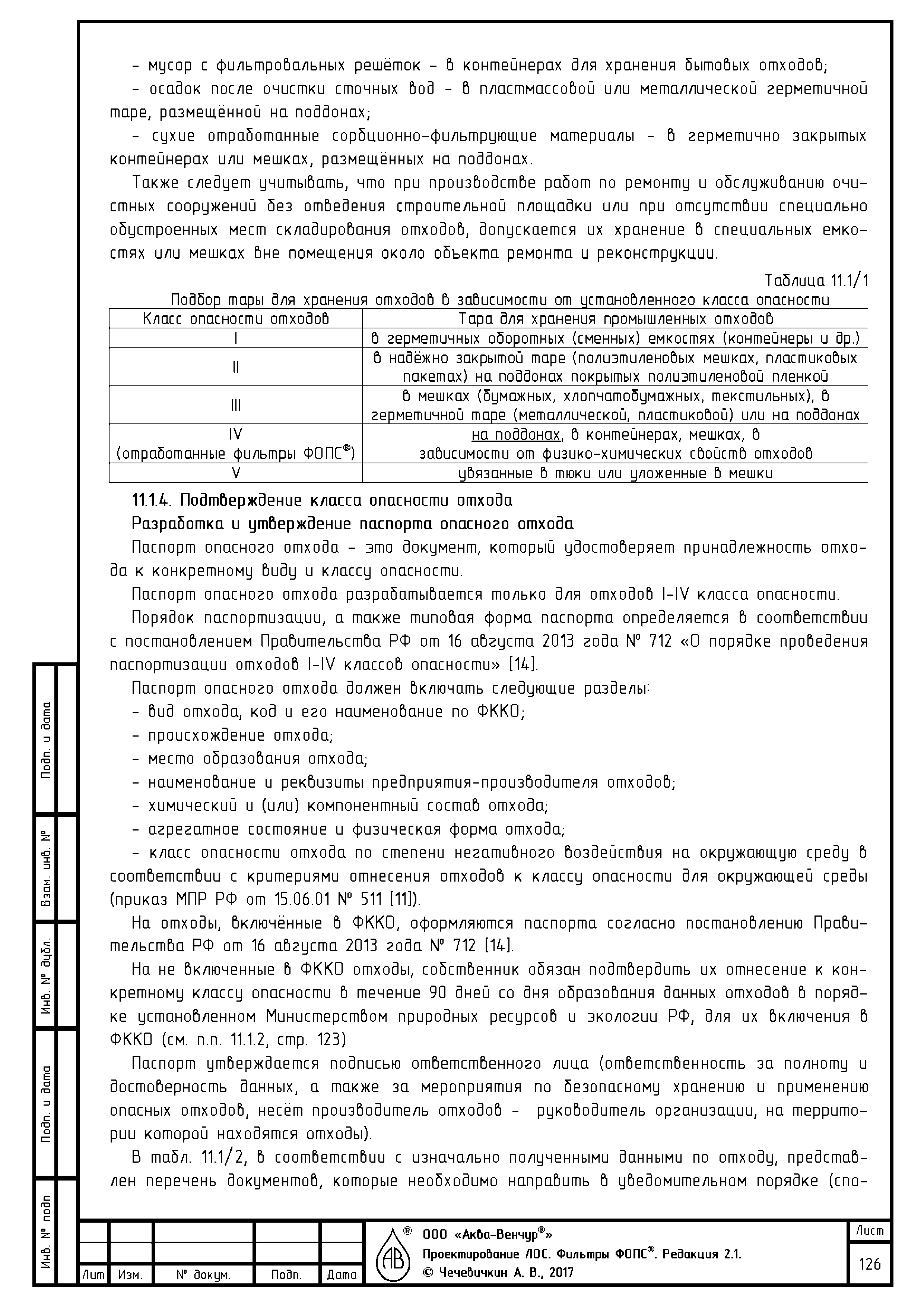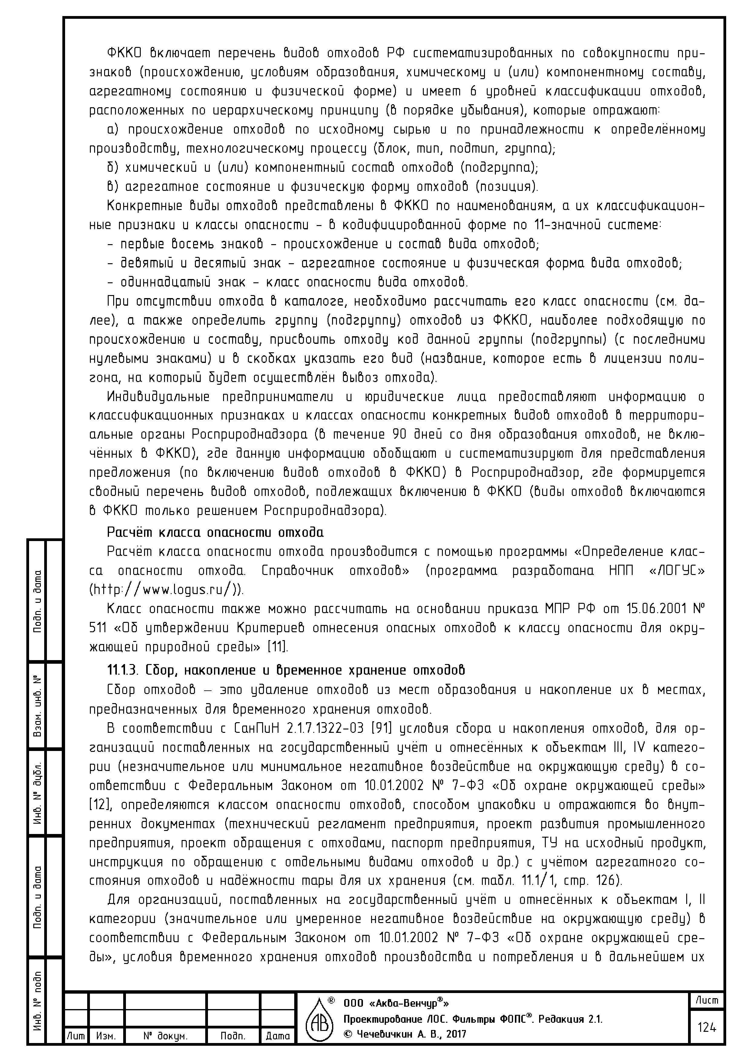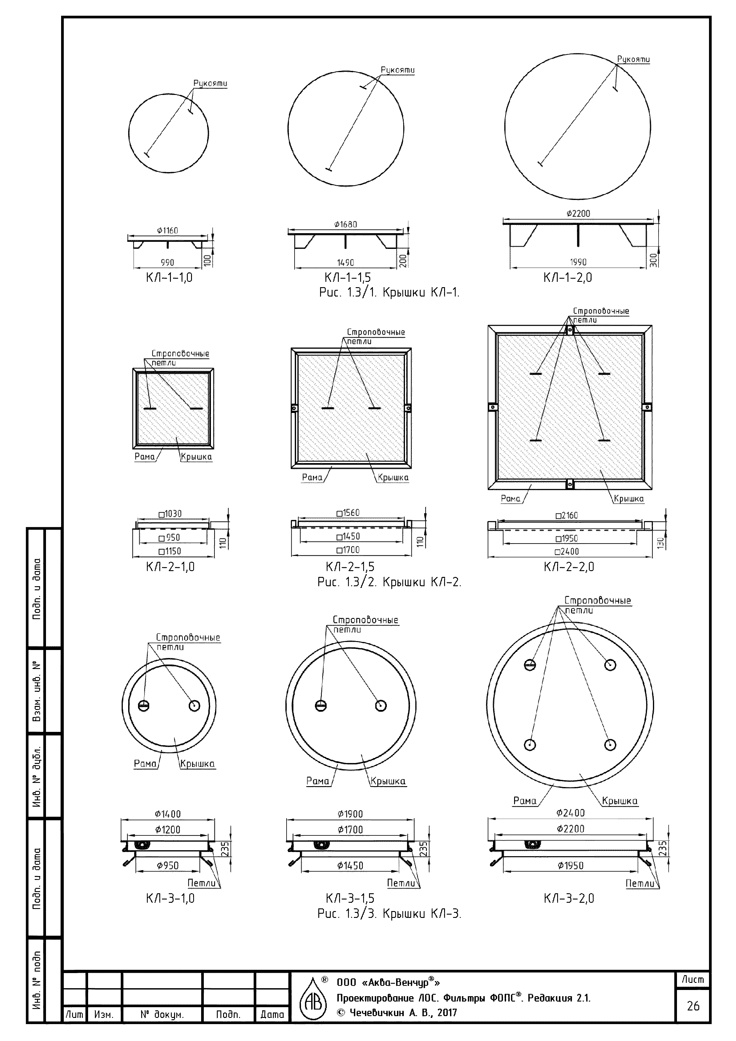 | Оглавление: | Материалы, представленные в электронном доступе Введение 1. Элементы очистных сооружений 1.1. Фильтры ФОПС® 1.2. Опорные кольца ОК 1.3. Легкосъемные крышки КЛ 1.4. Железобетонные изделия 1.5. Люки и дождеприемники чугунные 2. Достоинства очистных сооружений ливневого стока на основе фильтров ФОПС® 3. Загрязненность поверхностного стока и выбор типов фильтров для его очистки 3.1. Виды поверхностного стока и его загрязнённость 3.2. Требования к степени очистки 3.3. Выбор типа одного или группы работающих последовательно фильтров ФОПС® 4. Расчет производительности очистных сооружений и выбор диаметра фильтров для ее обеспечения 4.1. По методу предельных интенсивностей (без байпаса) 4.2. По методике для автомобильных дорого и мостов (без байпаса) 4.3. Проточного типа (с байпасом внутри колодца или вынесенным) 4.4. Накопительного типа (с байпасом и аккумулирующим резервуаром) 5. Оценка ресурса работы и выбор высоты фильтров 6. Обустройство очистных сооружений 6.1. Без байпаса 6.2. С байпасом внутри колодца 6.3. С вынесенным байпасом 6.4. С байпасом и аккумулирующим резервуаром 6.5. С фильтром ФОПС®-К как дополнительной секцией 7. Выбор места размещения очистных сооружений 7.1. Газон 7.2. Пешеходная зона 7.3. Автомобильная дорога 7.4. Выделенная территория 8. Примеры расчета и обустройства очистных сооружений 9. Составление сметы затрат 9.1. Стоимость элементов очистных сооружений 9.2. Рекомендации по обозначения элементов очистных сооружений 10. Эксплуатация очистных сооружений 10.1. Эксплуатационные работы и их периодичность 10.2. Эксплуатационные работы 10.3. Замена фильтров ФОПС® 11. Утилизация отходов водоочистки 11.1. Порядок обращения с отходами. Общие положения 11.1.1. Образование отходов 11.1.2. Класс опасности отходов для окружающей среды и его определение 11.1.3. Сбор, накопление и временное храненые отходов 11.1.4. Подтверждение класса опасности отхода 11.1.5. Вывоз и размещение отходов 11.1.6. Документы, предоставляемые в контролирующие органы 11.2. Утилизация отработанных фильтров ФОПС® 11.2.1. Характеристики отработанных фильтров ФОПС®-К 11.2.2. Характеристики отработанных фильтров ФОПС®-МУ 11.2.3. Характеристики отработанных фильтров ФОПС®-М 11.2.4. Характеристики отработанных фильтров ФОПС®-Н 11.2.5. Характеристики отработанных фильтров ФОПС®-С 11.2.6. Характеристики отработанных фильтров ФОПС®-У 11.2.7. Характеристики отработанных фильтров ФОПС®-Ц 11.2.8.Отходы, выгружаемые из фильтров ФОПС®—К и ФОПС®—С 11.2.9. Показатели опасности 11.3. Утилизация отходов из аккумулирующих резервуаров очистных сооружений Список литературы Приложение 1. Определение величины максимального суточного слоя дождевых осадков для селитебных территорий и промышленных предприятий 1 группы Приложение 2. Монтаж колодцев Приложение 3. Монтаж люков и легкосъемных крышек Приложение 4. Документы на фильтры ФОПС® |