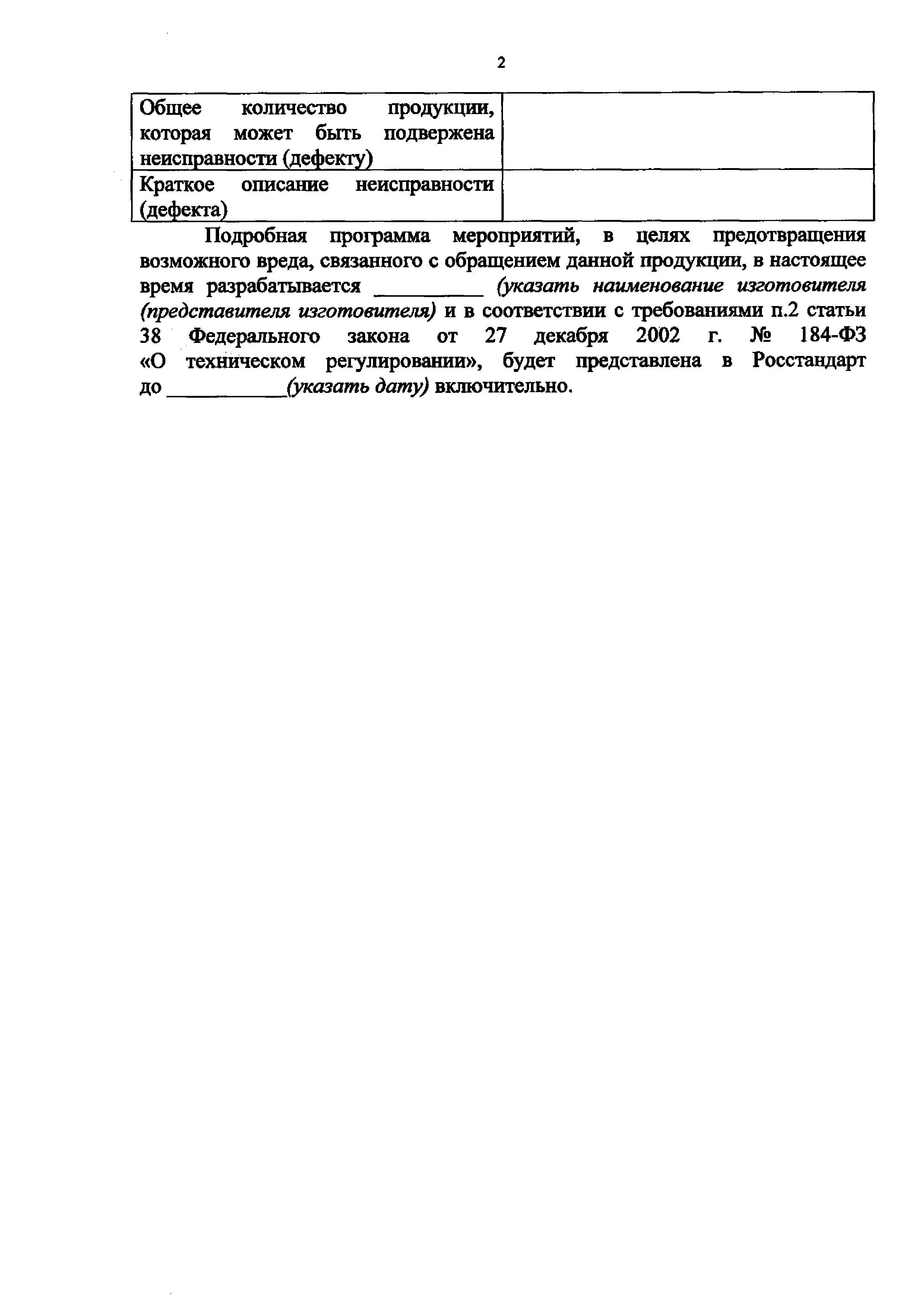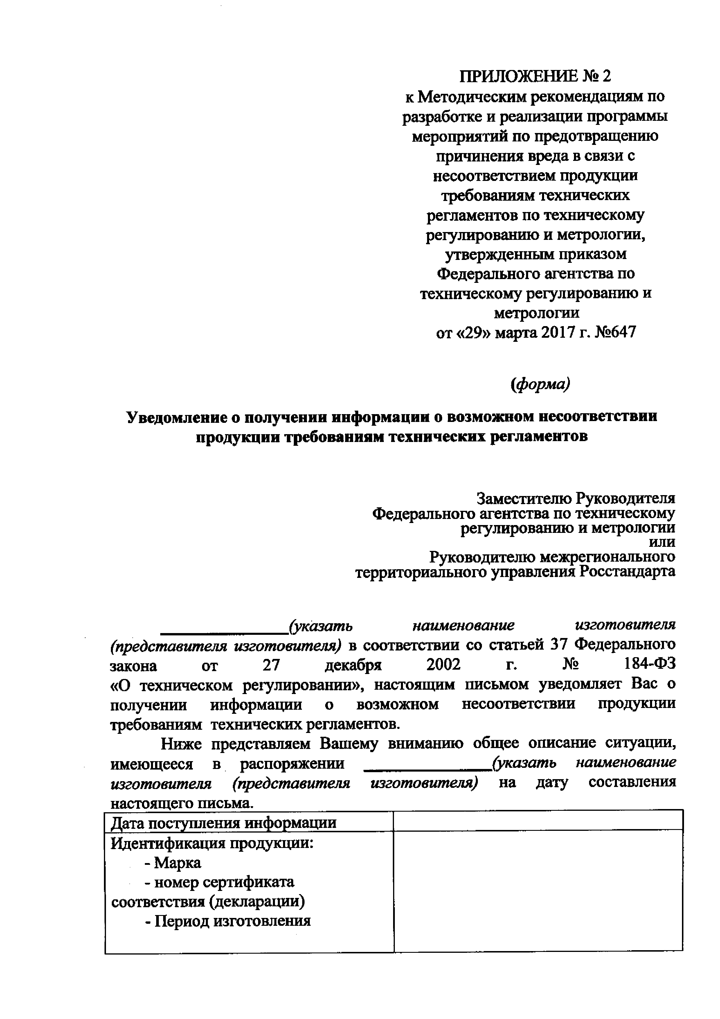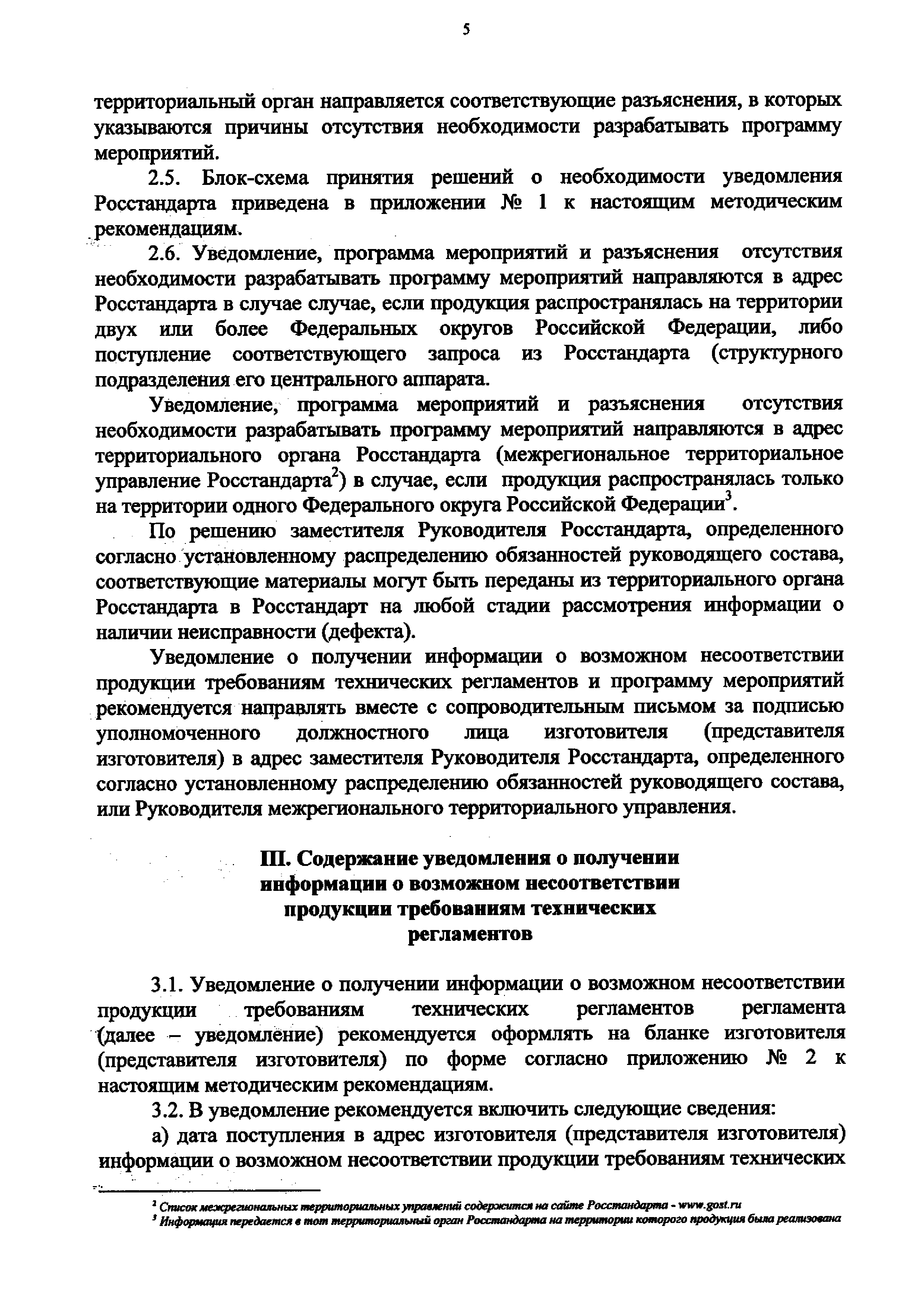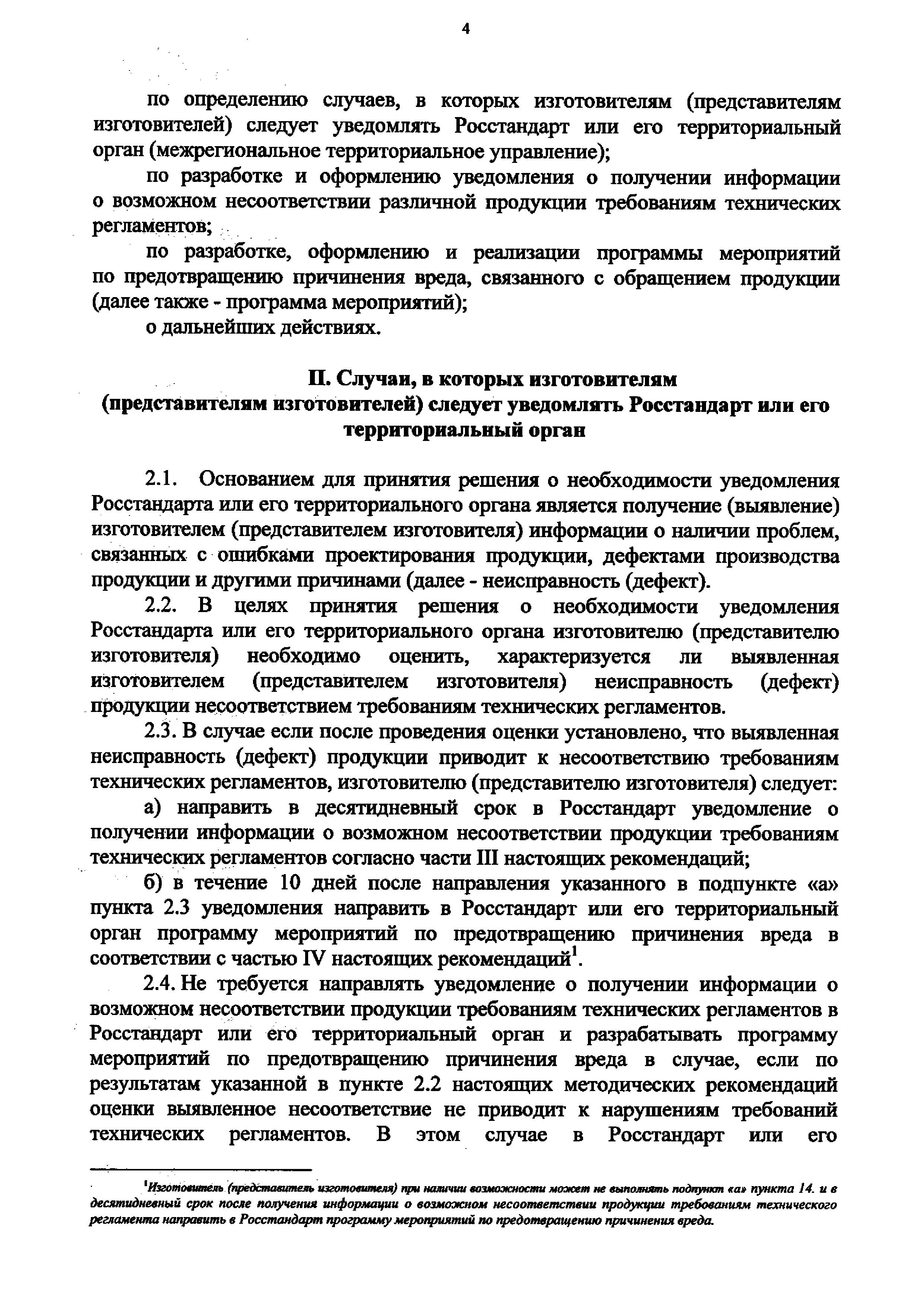 | Оглавление: | I. Общие положения II. Случаи, в которых изготовителям (представителям изготовителей) следует уведомлять Госстандарт или его территориальный орган III. Содержание уведомления о получении информации о возможном несоответствии продукции требованиям технических регламентов IV. Содержание программы мероприятий по предотвращению причинения вреда, связанного с обращением продукции V. Дальнейшие действия Приложение № 1. Блок-схема принятия решений Приложение № 2. Уведомление о получении информации о возможном несоответствии продукции требованиям технических регламентов Приложение № 3. Программа мероприятий по предотвращению причинения вреда, связанного с обращением продукции Приложение № 4. Представление информации о ходе реализации программ мероприятий по предотвращению причинения вреда, связанного с обращением продукции |