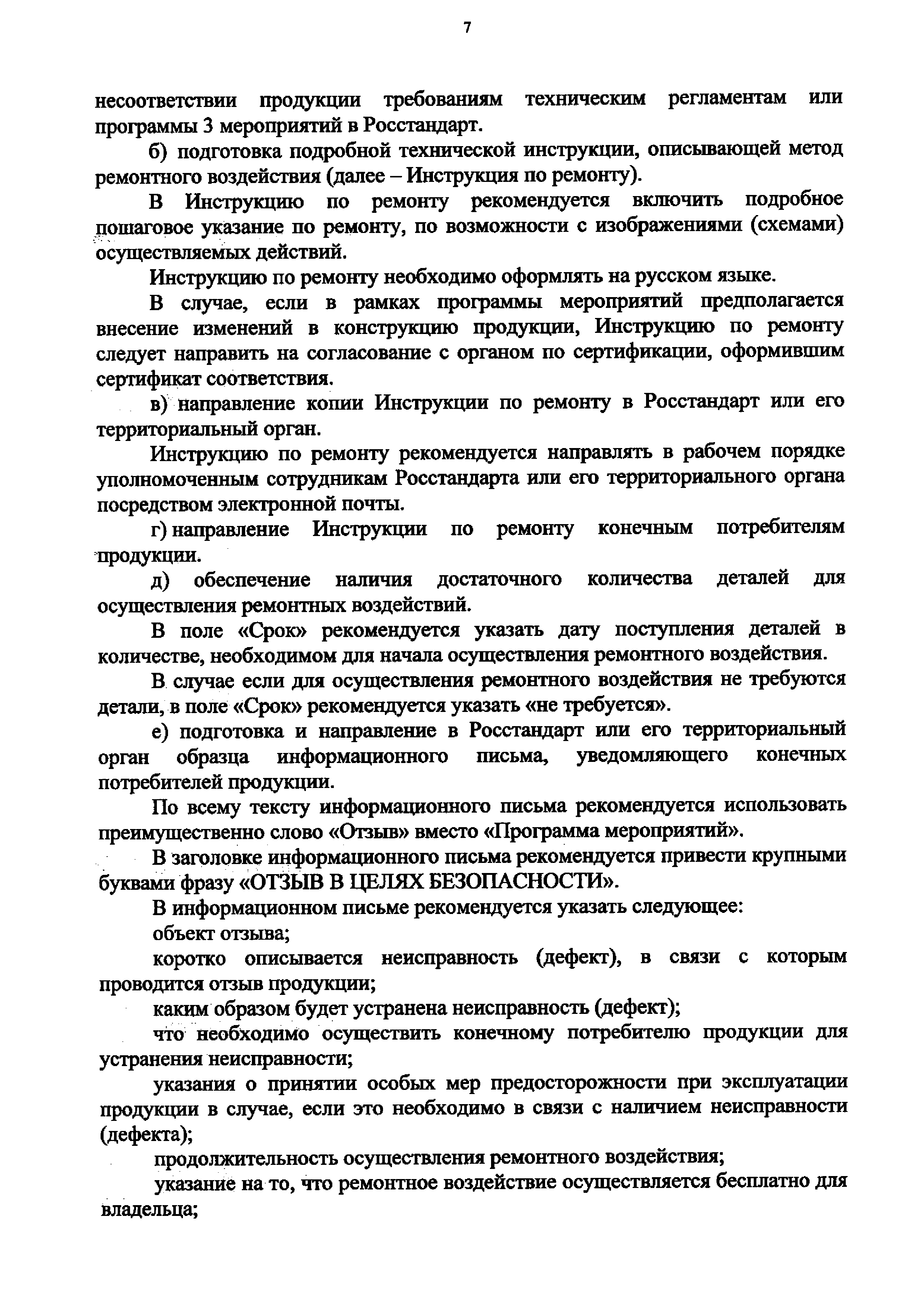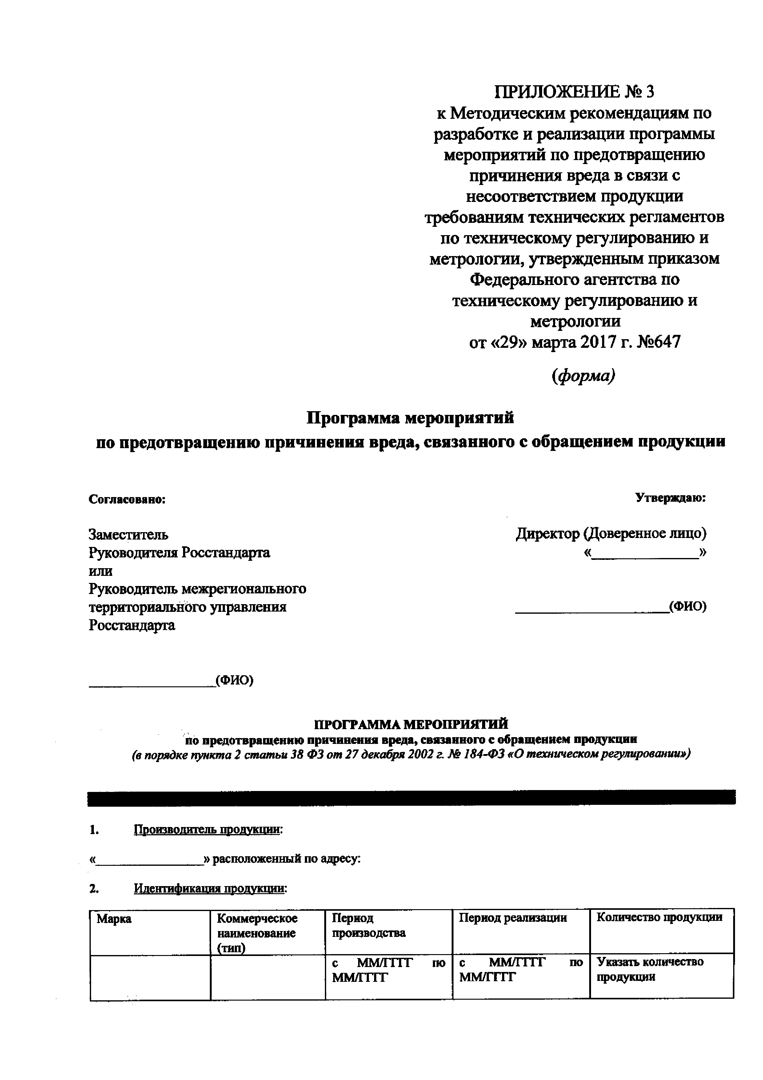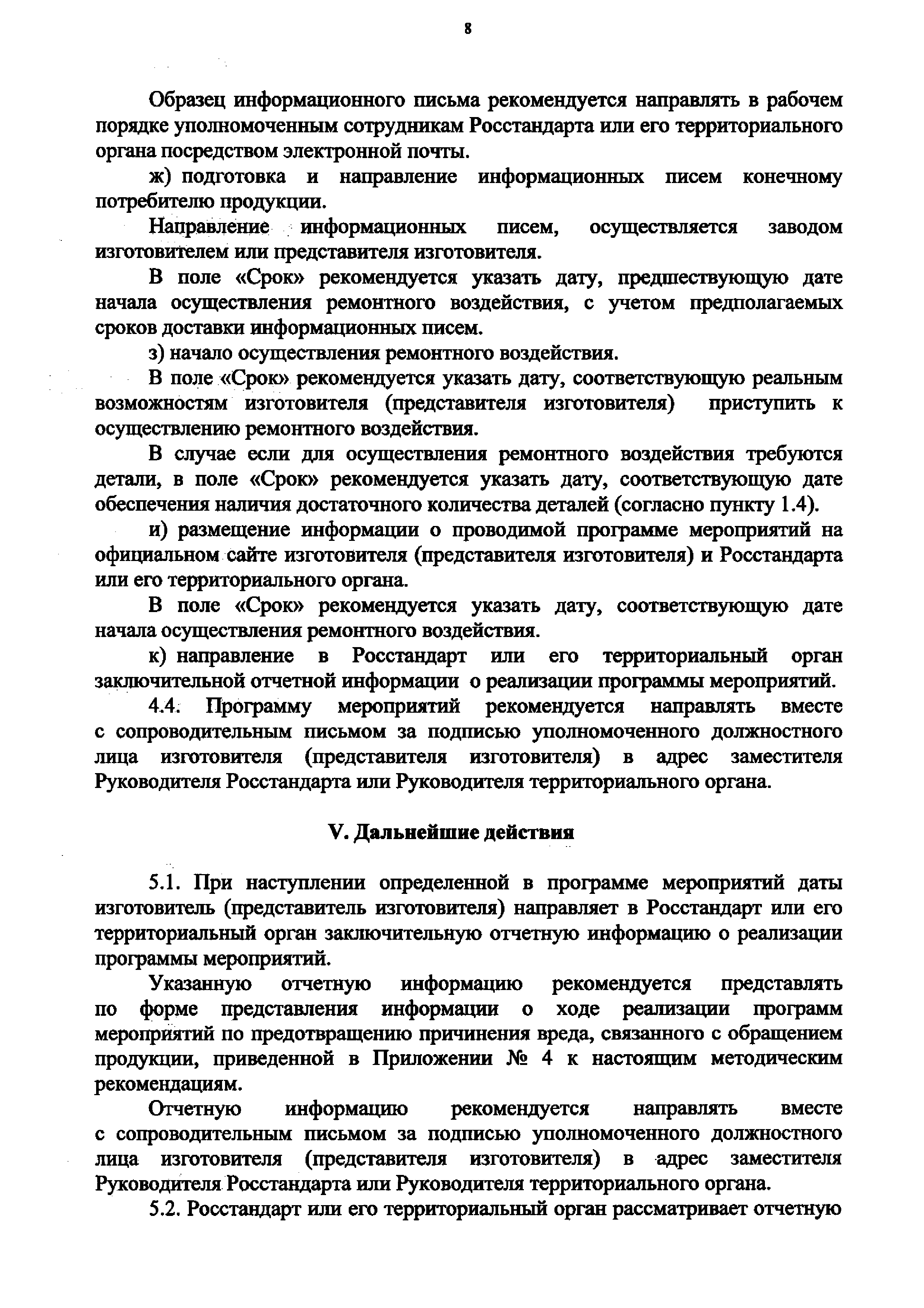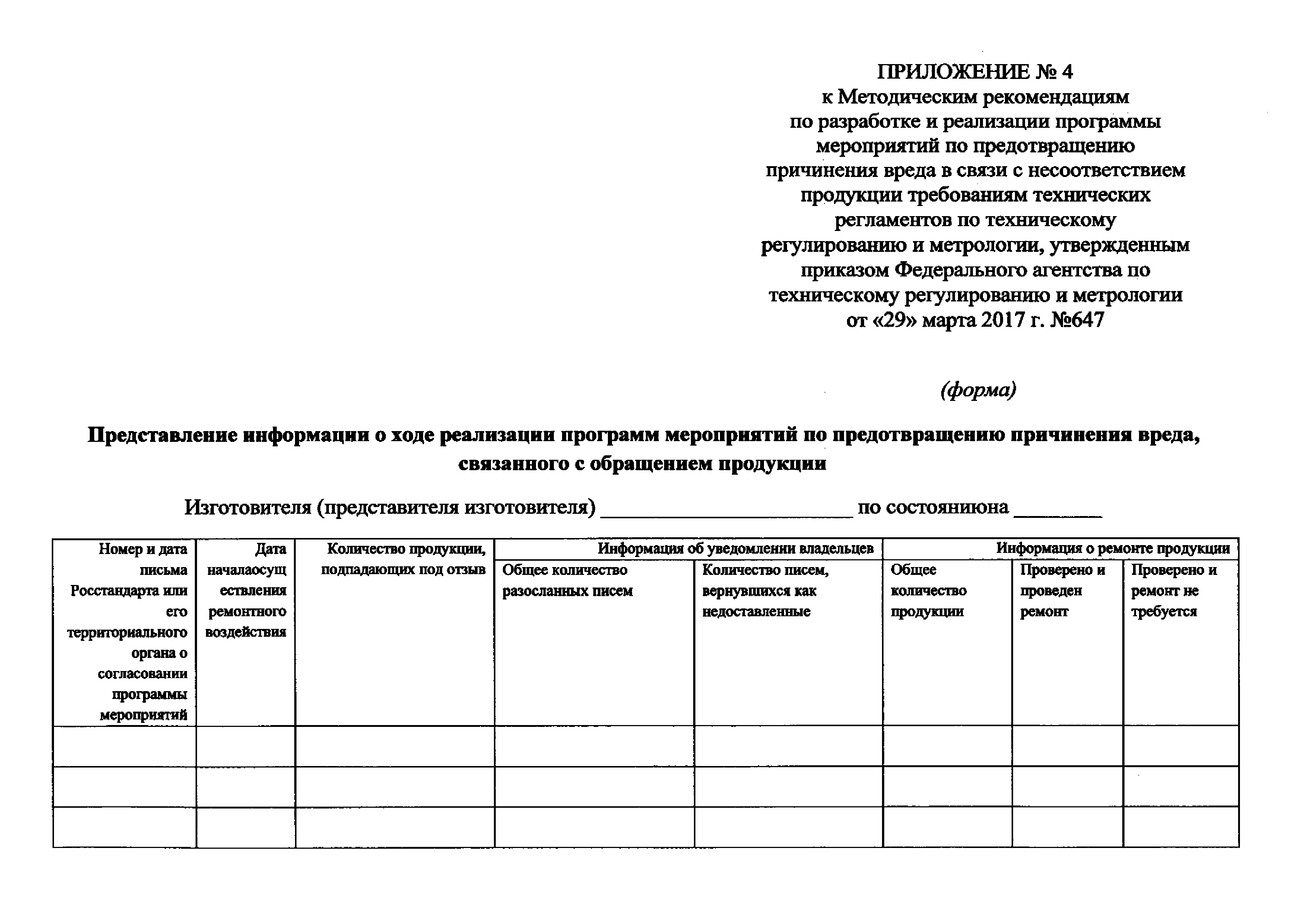 | Оглавление: | I. Общие положения II. Случаи, в которых изготовителям (представителям изготовителей) следует уведомлять Госстандарт или его территориальный орган III. Содержание уведомления о получении информации о возможном несоответствии продукции требованиям технических регламентов IV. Содержание программы мероприятий по предотвращению причинения вреда, связанного с обращением продукции V. Дальнейшие действия Приложение № 1. Блок-схема принятия решений Приложение № 2. Уведомление о получении информации о возможном несоответствии продукции требованиям технических регламентов Приложение № 3. Программа мероприятий по предотвращению причинения вреда, связанного с обращением продукции Приложение № 4. Представление информации о ходе реализации программ мероприятий по предотвращению причинения вреда, связанного с обращением продукции |