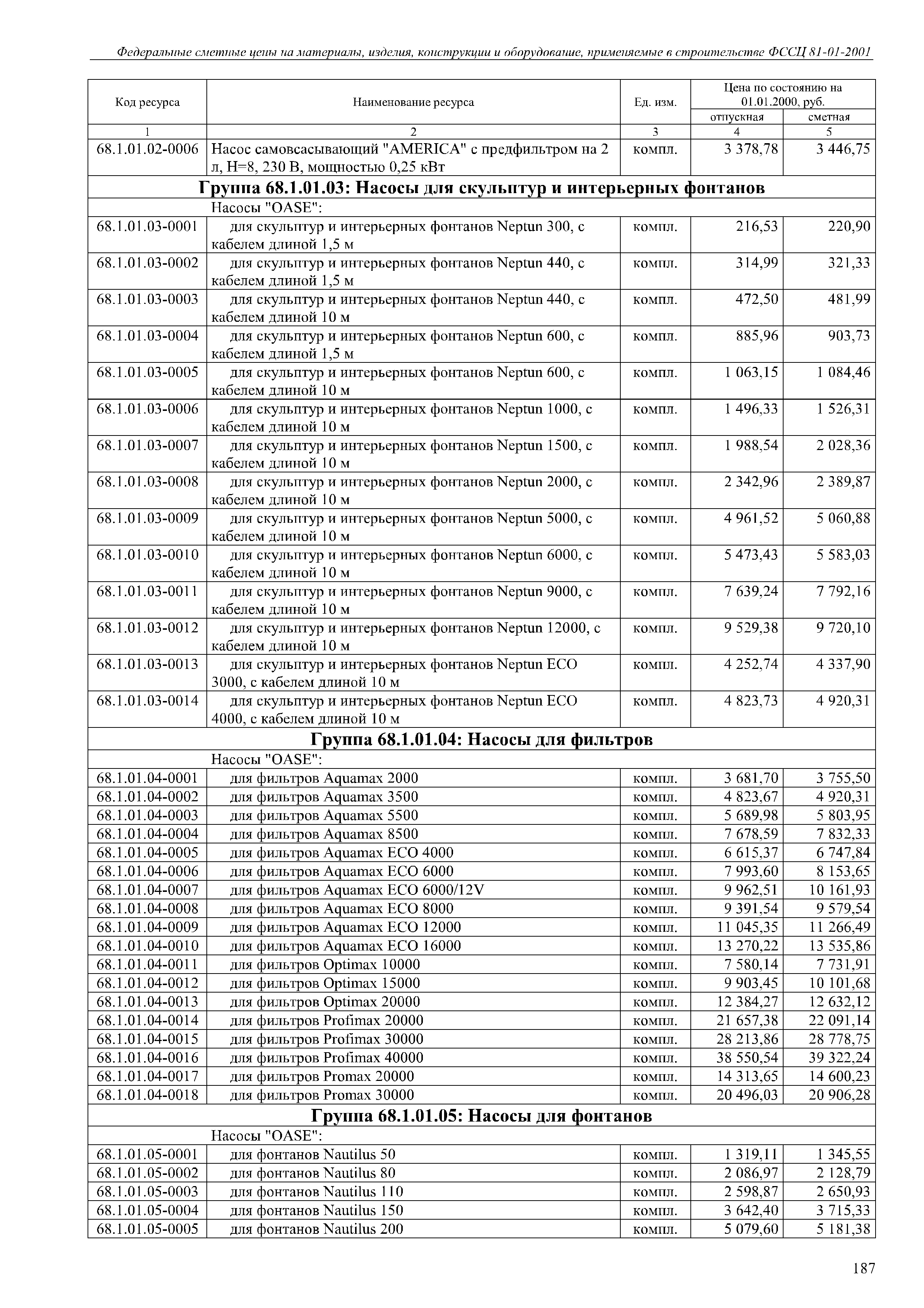Книга 68: Насосы и станции для перекачки и поднятия жидкостей. Федеральные сметные цены на материалы изделия, конструкции и оборудование, применяемые в строительстве. Федеральный сборник сметных цен на материалы, изделия и конструкции, применяемые в строительстве| Статус: | действует | | Название рус.: | Книга 68: Насосы и станции для перекачки и поднятия жидкостей. Федеральные сметные цены на материалы изделия, конструкции и оборудование, применяемые в строительстве. Федеральный сборник сметных цен на материалы, изделия и конструкции, применяемые в строительстве | | Дата добавления в базу: | 05.05.2017 | | Дата актуализации: | 01.01.2021 | | Дата введения: | 28.04.2017 | | Область применения: | Государственные сметные нормативы "Федеральные сметные цены на материалы, изделия, конструкции и оборудование, применяемые в строительстве" предназначены для определения сметной стоимости строительства, реконструкции и капитального ремонта объектов капитального строительства. | | Оглавление: | Часть 68.1: Насосы Раздел 68.1.01: Насосы специального применения Раздел 68.1.02: Насосы центробежные Раздел 68.1.03: Насосы циркуляционные Часть 68.2: Станции насосные и защиты Раздел 68.2.01: Станции защиты Раздел 68.2.02: Станции насосные | | Утверждён: | 30.12.2016 Минстрой России (Russian Federation Minstroy 1039/пр)