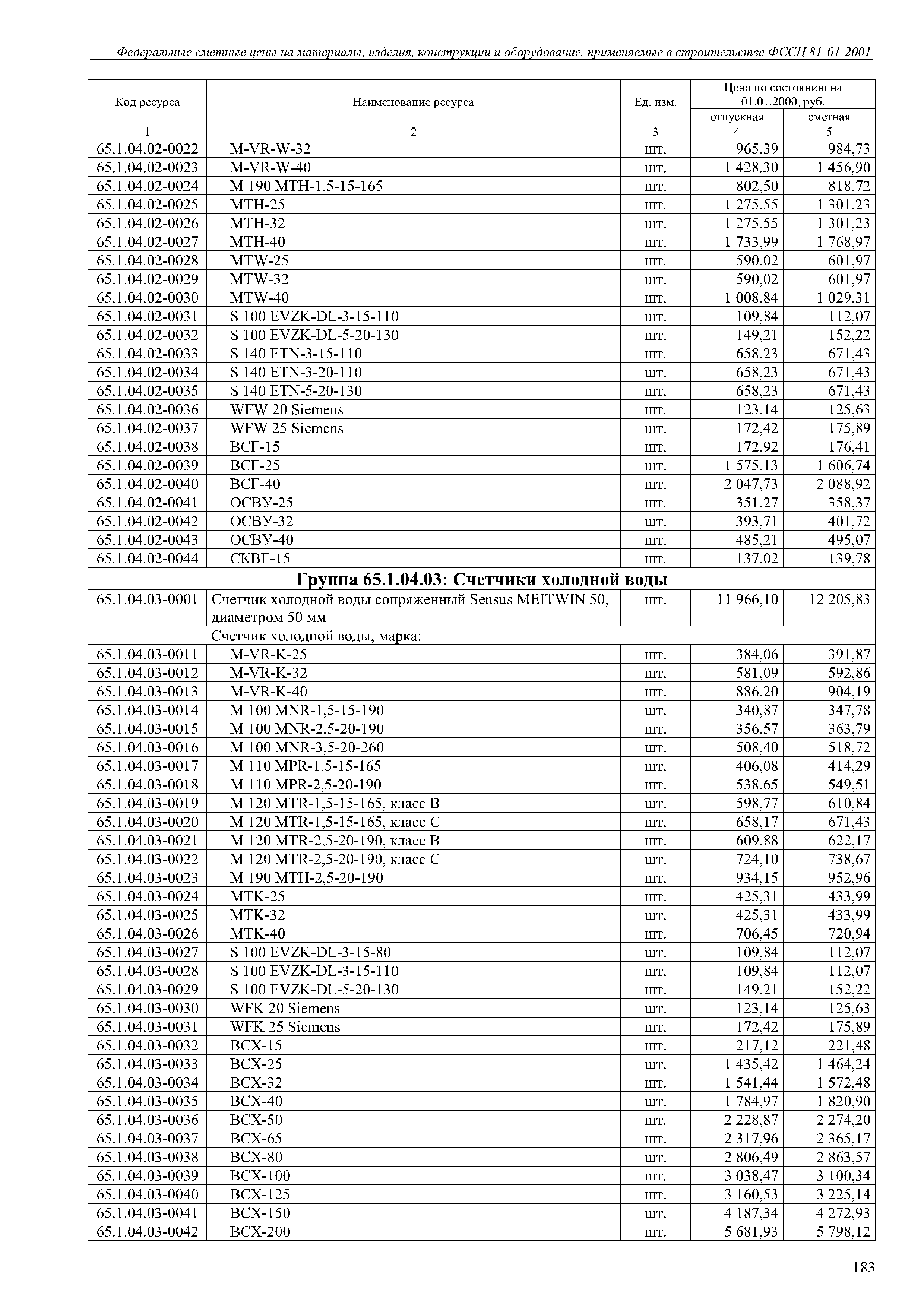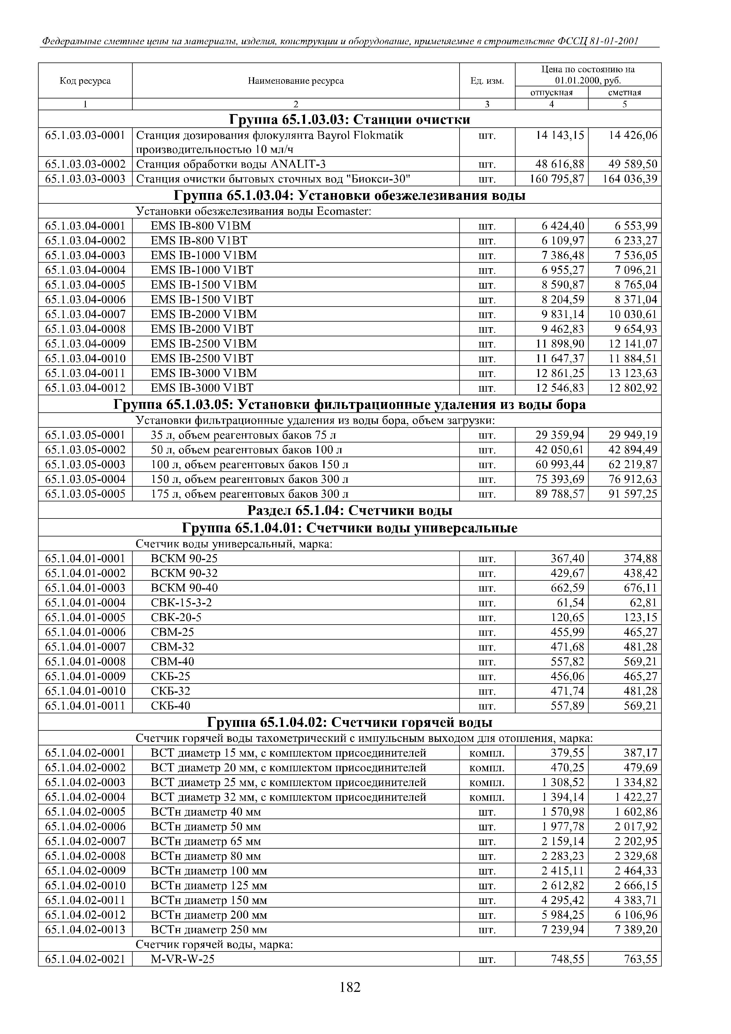 Книга 65: Оборудование, устройства и аппаратура для водоснабжения и канализации. Федеральные сметные цены на материалы изделия, конструкции и оборудование, применяемые в строительстве. Федеральный сборник сметных цен на материалы, изделия и конструкции, применяемые в строительстве| Статус: | действует | | Название рус.: | Книга 65: Оборудование, устройства и аппаратура для водоснабжения и канализации. Федеральные сметные цены на материалы изделия, конструкции и оборудование, применяемые в строительстве. Федеральный сборник сметных цен на материалы, изделия и конструкции, применяемые в строительстве | | Дата добавления в базу: | 05.05.2017 | | Дата актуализации: | 01.01.2021 | | Дата введения: | 28.04.2017 | | Область применения: | Государственные сметные нормативы "Федеральные сметные цены на материалы, изделия, конструкции и оборудование, применяемые в строительстве" предназначены для определения сметной стоимости строительства, реконструкции и капитального ремонта объектов капитального строительства. | | Оглавление: | Часть 65.1: Приборы и установки Раздел 65.1.0 1: Водомеры (счетчики) Раздел 65.1.02: Приборы управления Раздел 65.1.03: Сооружения и установки очистные Раздел 65.1.04: Счетчики воды | | Утверждён: | 30.12.2016 Минстрой России (Russian Federation Minstroy 1039/пр)