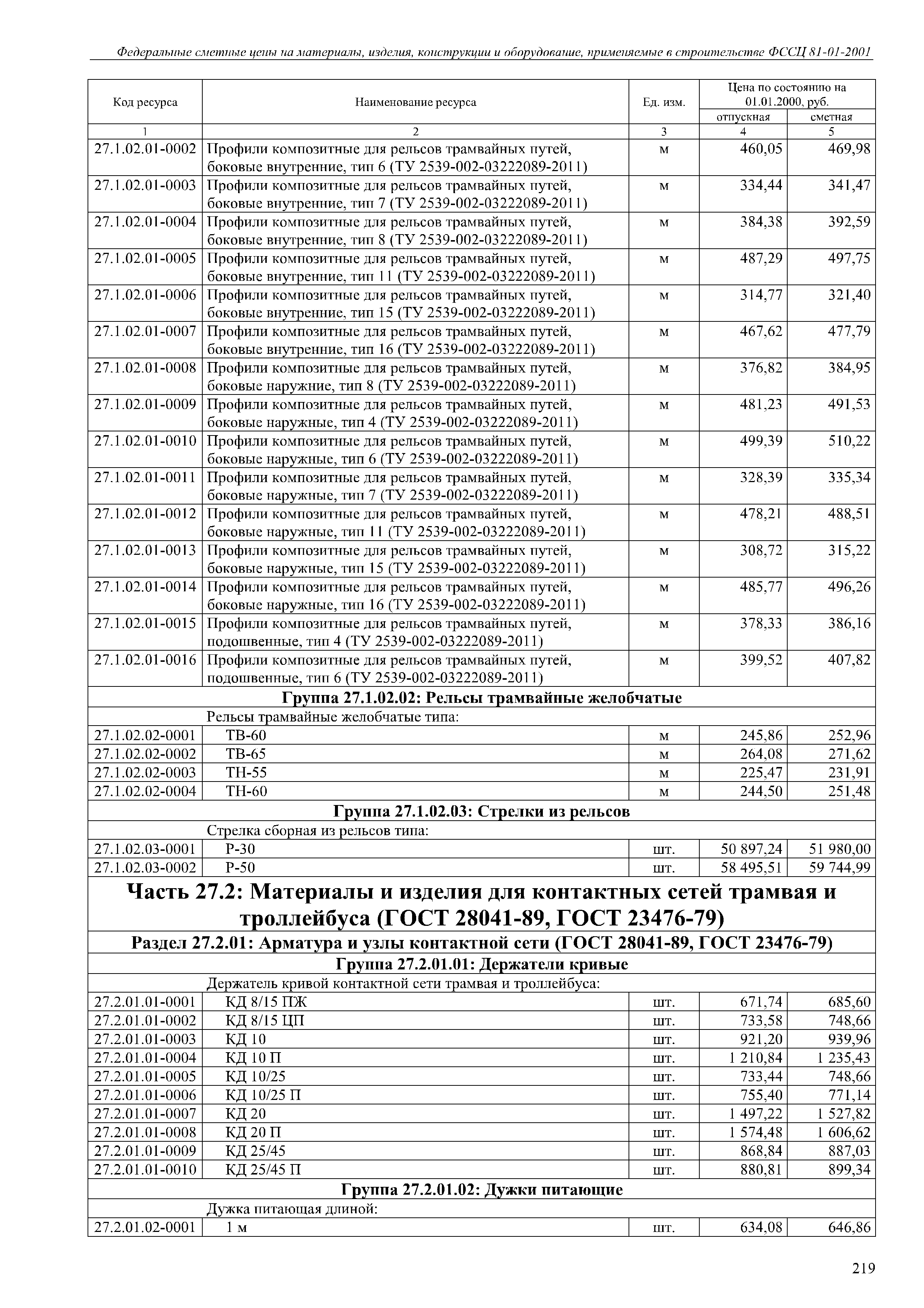 Книга 27: Материалы и изделия для сетей экологически чистого транспорта. Федеральные сметные цены на материалы изделия, конструкции и оборудование, применяемые в строительстве. Федеральный сборник сметных цен на материалы, изделия и конструкции, применяемые в строительстве| Статус: | действует | | Название рус.: | Книга 27: Материалы и изделия для сетей экологически чистого транспорта. Федеральные сметные цены на материалы изделия, конструкции и оборудование, применяемые в строительстве. Федеральный сборник сметных цен на материалы, изделия и конструкции, применяемые в строительстве | | Дата добавления в базу: | 05.05.2017 | | Дата актуализации: | 01.01.2021 | | Дата введения: | 28.04.2017 | | Область применения: | Государственные сметные нормативы "Федеральные сметные цены на материалы, изделия, конструкции и оборудование, применяемые в строительстве" предназначены для определения сметной стоимости строительства, реконструкции и капитального ремонта объектов капитального строительства. | | Оглавление: | Часть 27.1: Материалы верхнего строения трамвайньтх путей Раздел 27.1.01: Материалы и изделия крепежные Раздел 27.1.02: Профили рельсовые для трамвайных путей Часть 27.2: Материалм и изделия для контактнмх сетей трамвая и троллейбуса Раздел 27.2.01: Арматура и узлм контактной сети Раздел 27.2.02: Изоляторы контактной сети троллейбуса и трамвая Раздел 27.2.03: Крепления контактной сети | | Утверждён: | 30.12.2016 Минстрой России (Russian Federation Minstroy 1039/пр)