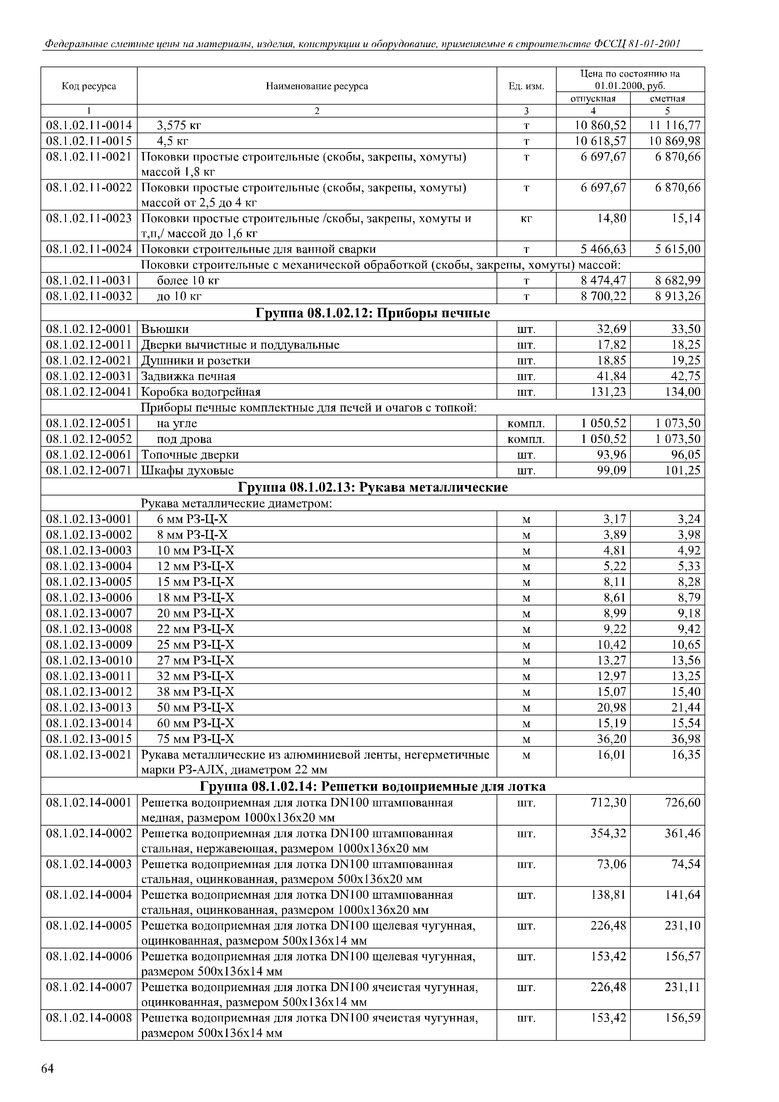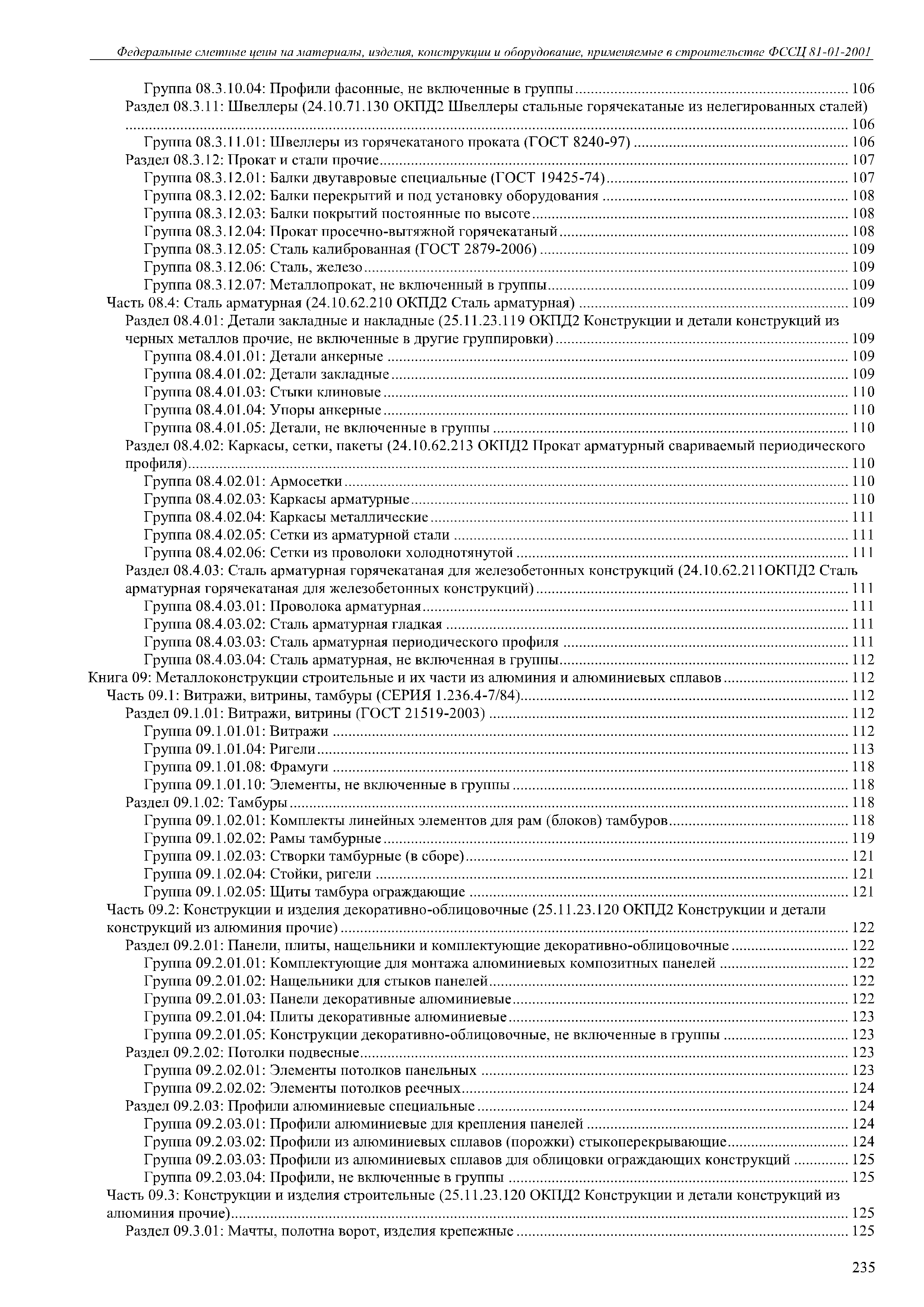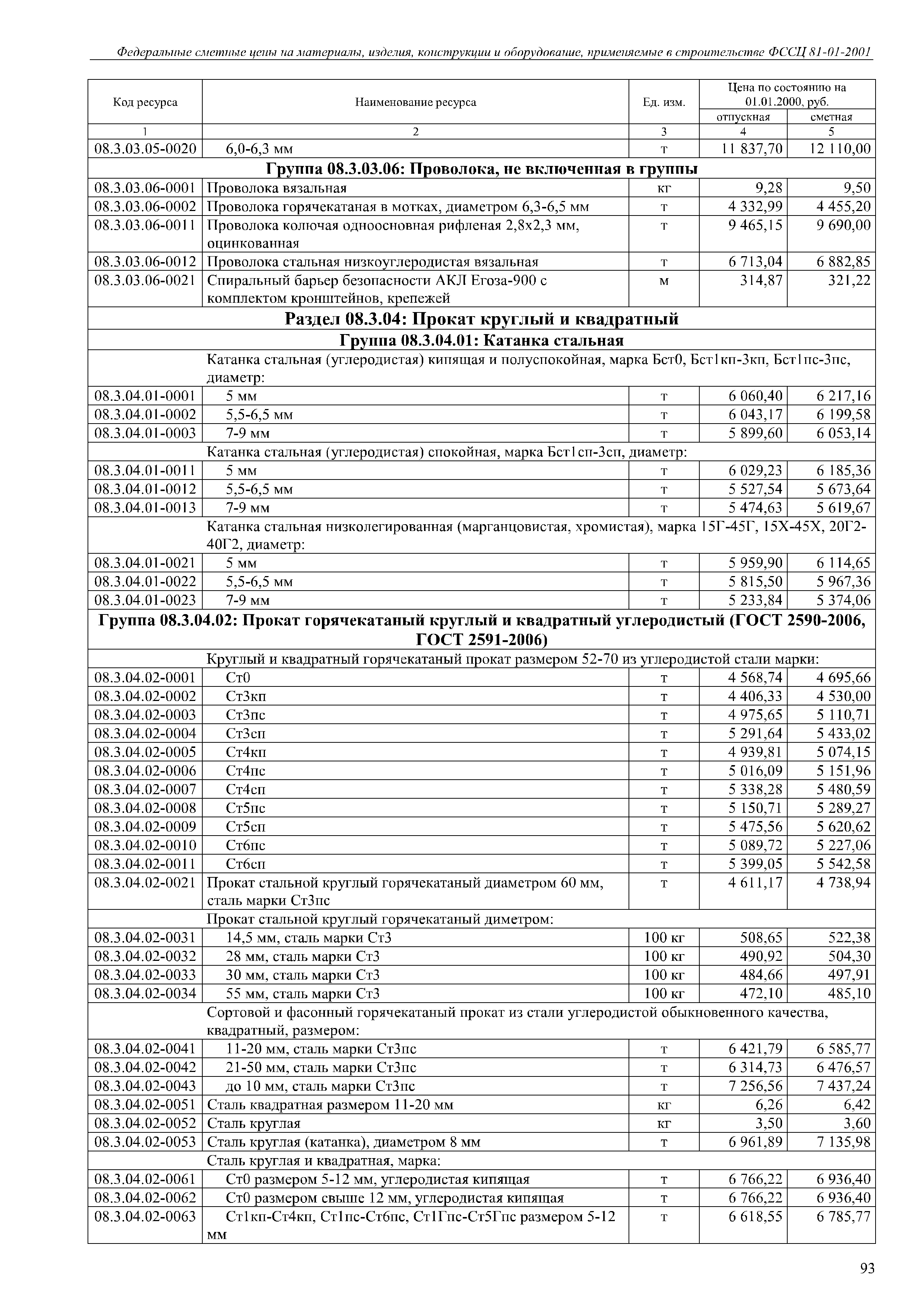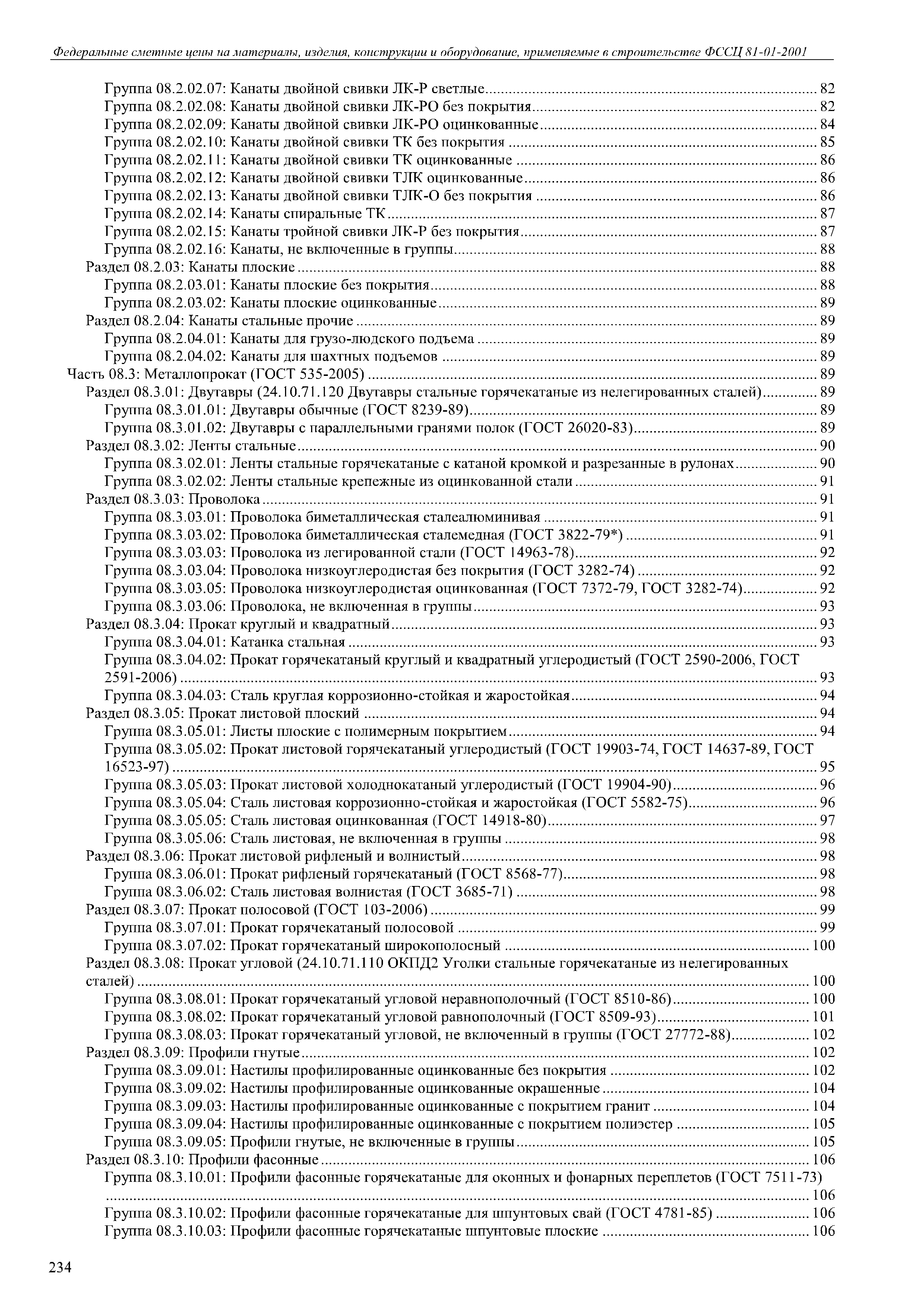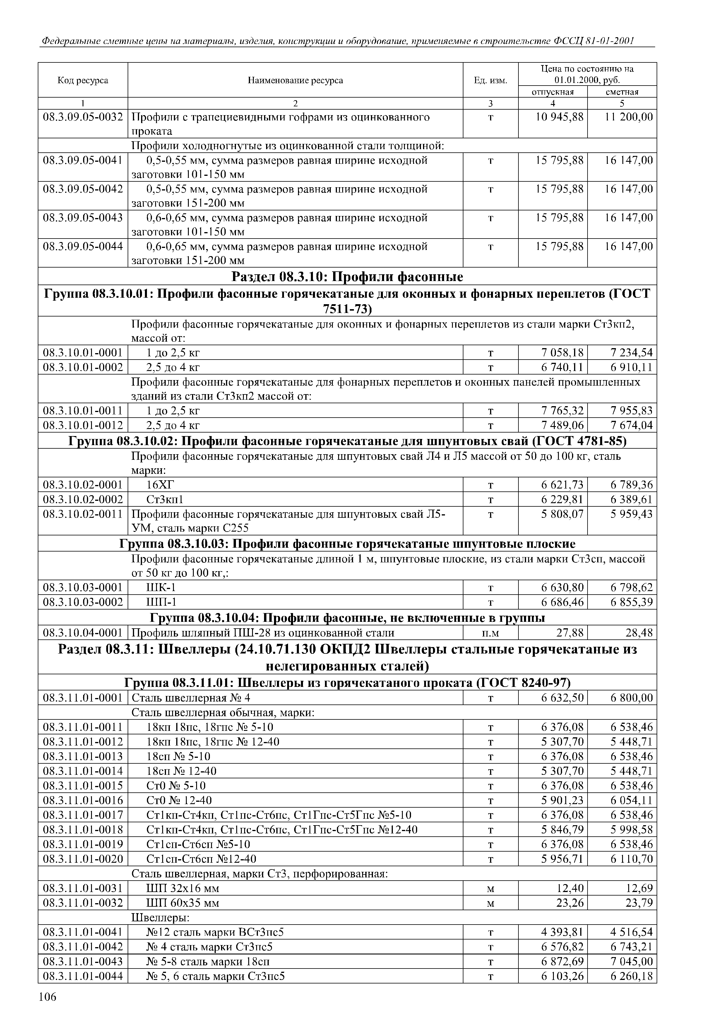 Книга 08: Изделия металлические, металлопрокат, канаты. Федеральные сметные цены на материалы изделия, конструкции и оборудование, применяемые в строительстве. Федеральный сборник сметных цен на материалы, изделия и конструкции, применяемые в строительстве| Статус: | действует | | Название рус.: | Книга 08: Изделия металлические, металлопрокат, канаты. Федеральные сметные цены на материалы изделия, конструкции и оборудование, применяемые в строительстве. Федеральный сборник сметных цен на материалы, изделия и конструкции, применяемые в строительстве | | Дата добавления в базу: | 05.05.2017 | | Дата актуализации: | 01.01.2021 | | Дата введения: | 28.04.2017 | | Область применения: | Государственные сметные нормативы "Федеральные сметные цены на материалы, изделия, конструкции и оборудование, применяемые в строительстве" предназначены для определения сметной стоимости строительства, реконструкции и капитального ремонта объектов капитального строительства. | | Оглавление: | Часть 08.1: Изделия из металла Раздел 08.1.01: Конструкции габионные Раздел 08.1.02: Металлоизделия общестроительного и специального назначения Раздел 08.1.03: Элементы вентиляционных камер и шахт Раздел 08.1.04: Элементы дымоходов Раздел 08.1.05: Элементы мусоропроводов Раздел 08.1.06: Элементы ограждений Часть 08.2: Канаты стальные Раздел 08.2.01: Канаты закрытые Раздел 08.2.02: Канаты круглые Раздел 08.2.03: Канаты плоские Раздел 08.2.04: Канаты стальные прочие Часть 08.3: Металлопрокат Раздел 08.3.01: Двутавры Раздел 08.3.02: Ленты стальные Раздел 08.3.03: Проволока Раздел 08.3.04: Прокат круглый и квадратный Раздел 08.3.05: Прокат листовой плоский Раздел 08.3.06: Прокат листовой рифленый и волнистый Раздел 08.3.07: Прокат полосовой Раздел 08.3.08: Прокат угловой Раздел 08.3.09: Профили гнутые Раздел 08.3.10: Профили фасонные Раздел 08.3.11: Швеллеры Раздел 08.3.12: Прокат и стали прочие Часть 08.4: Сталь арматурная Раздел 08.4.01: Детали закладные и накладные Раздел 08.4.02: Каркасы, сетки, пакеты Раздел 08.4.03: Сталь арматурная горячекатаная для железобетонных конструкций | | Утверждён: | 30.12.2016 Минстрой России (Russian Federation Minstroy 1039/пр)