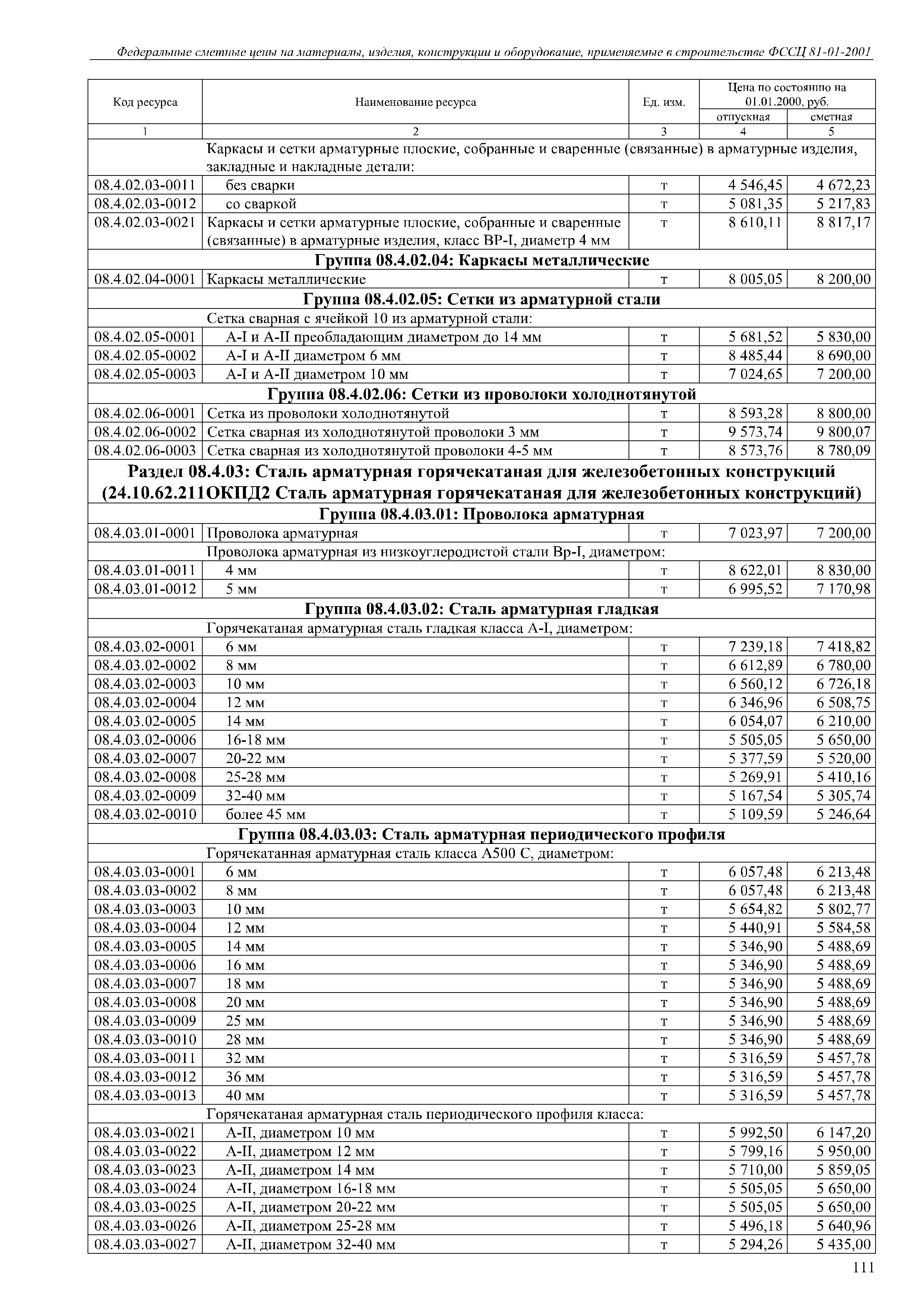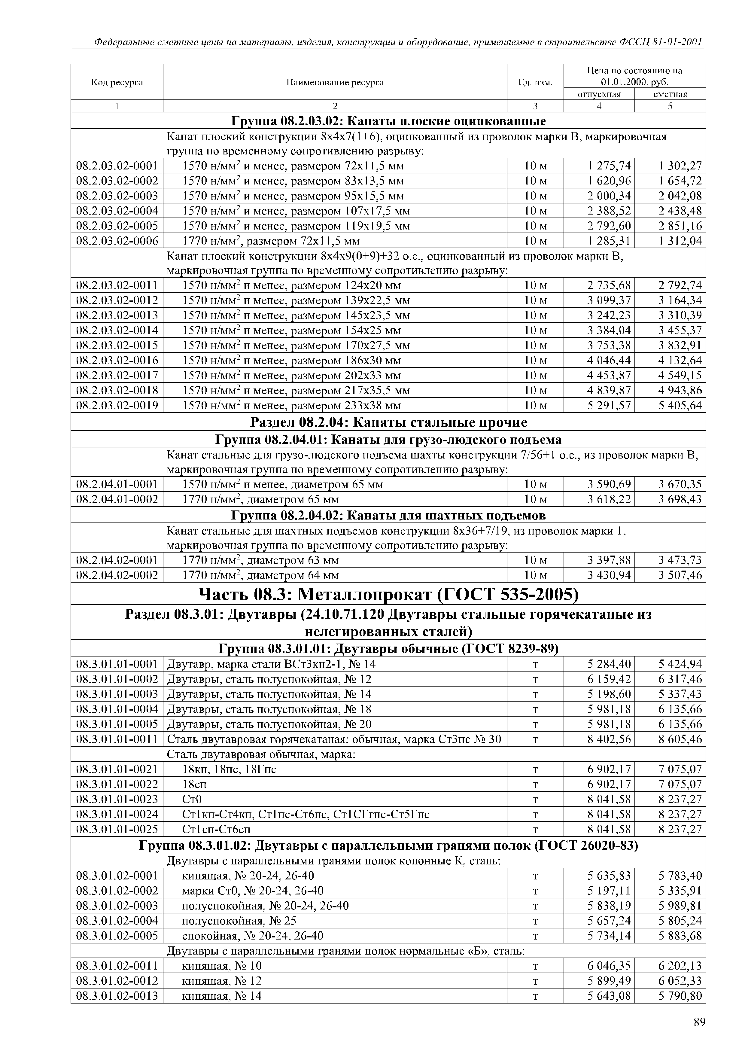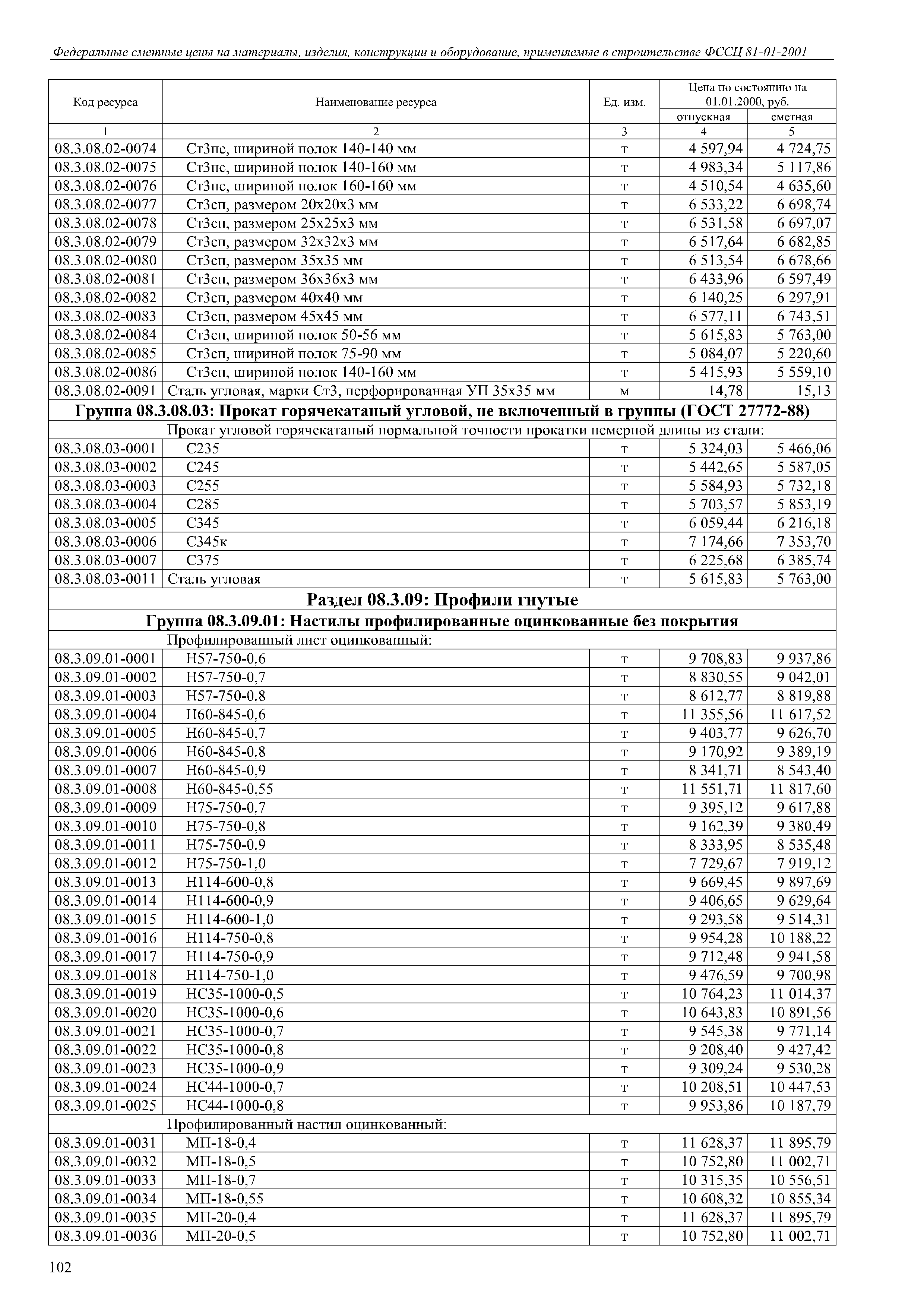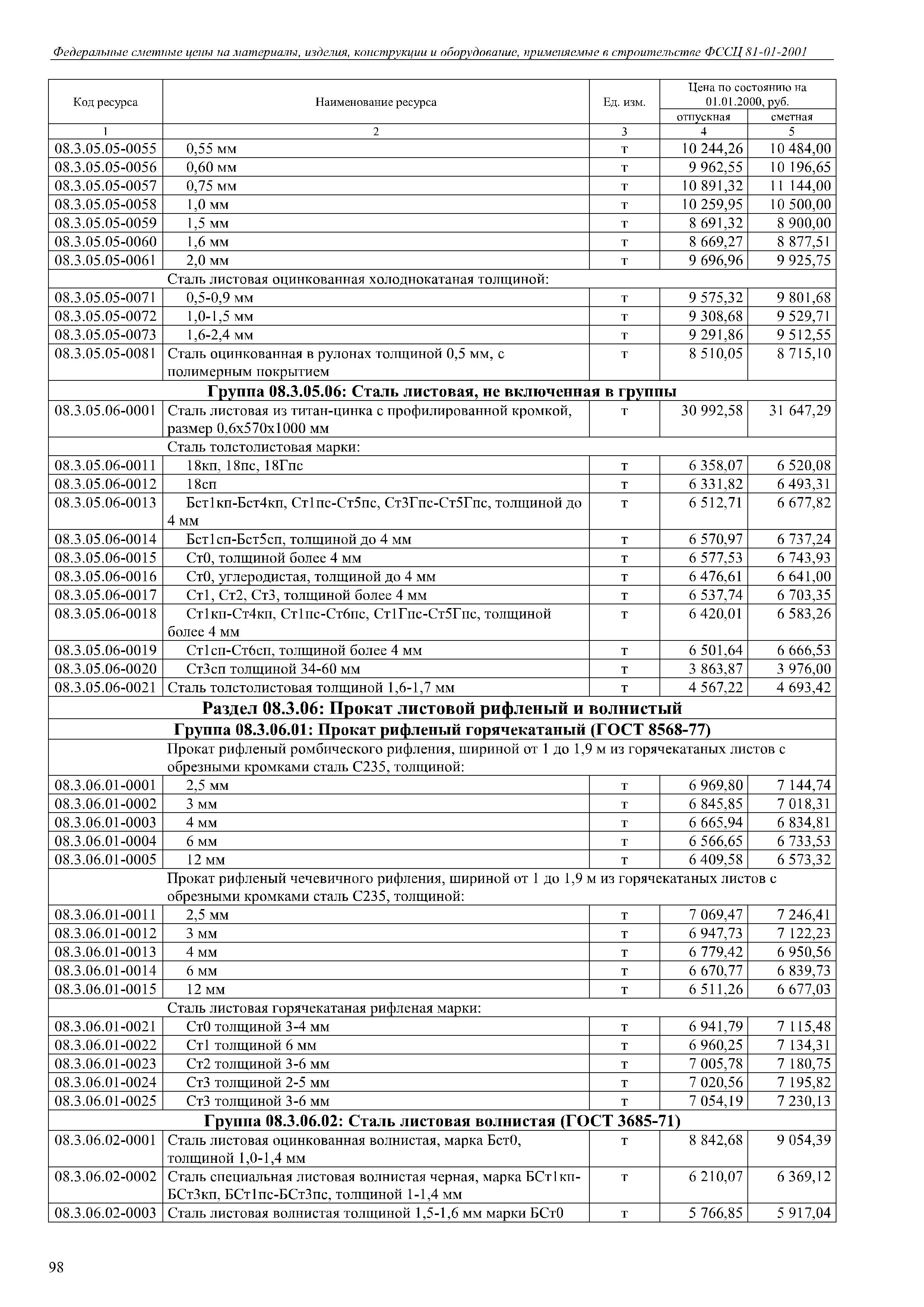 Книга 08: Изделия металлические, металлопрокат, канаты. Федеральные сметные цены на материалы изделия, конструкции и оборудование, применяемые в строительстве. Федеральный сборник сметных цен на материалы, изделия и конструкции, применяемые в строительстве| Статус: | действует | | Название рус.: | Книга 08: Изделия металлические, металлопрокат, канаты. Федеральные сметные цены на материалы изделия, конструкции и оборудование, применяемые в строительстве. Федеральный сборник сметных цен на материалы, изделия и конструкции, применяемые в строительстве | | Дата добавления в базу: | 05.05.2017 | | Дата актуализации: | 01.01.2021 | | Дата введения: | 28.04.2017 | | Область применения: | Государственные сметные нормативы "Федеральные сметные цены на материалы, изделия, конструкции и оборудование, применяемые в строительстве" предназначены для определения сметной стоимости строительства, реконструкции и капитального ремонта объектов капитального строительства. | | Оглавление: | Часть 08.1: Изделия из металла Раздел 08.1.01: Конструкции габионные Раздел 08.1.02: Металлоизделия общестроительного и специального назначения Раздел 08.1.03: Элементы вентиляционных камер и шахт Раздел 08.1.04: Элементы дымоходов Раздел 08.1.05: Элементы мусоропроводов Раздел 08.1.06: Элементы ограждений Часть 08.2: Канаты стальные Раздел 08.2.01: Канаты закрытые Раздел 08.2.02: Канаты круглые Раздел 08.2.03: Канаты плоские Раздел 08.2.04: Канаты стальные прочие Часть 08.3: Металлопрокат Раздел 08.3.01: Двутавры Раздел 08.3.02: Ленты стальные Раздел 08.3.03: Проволока Раздел 08.3.04: Прокат круглый и квадратный Раздел 08.3.05: Прокат листовой плоский Раздел 08.3.06: Прокат листовой рифленый и волнистый Раздел 08.3.07: Прокат полосовой Раздел 08.3.08: Прокат угловой Раздел 08.3.09: Профили гнутые Раздел 08.3.10: Профили фасонные Раздел 08.3.11: Швеллеры Раздел 08.3.12: Прокат и стали прочие Часть 08.4: Сталь арматурная Раздел 08.4.01: Детали закладные и накладные Раздел 08.4.02: Каркасы, сетки, пакеты Раздел 08.4.03: Сталь арматурная горячекатаная для железобетонных конструкций | | Утверждён: | 30.12.2016 Минстрой России (Russian Federation Minstroy 1039/пр)