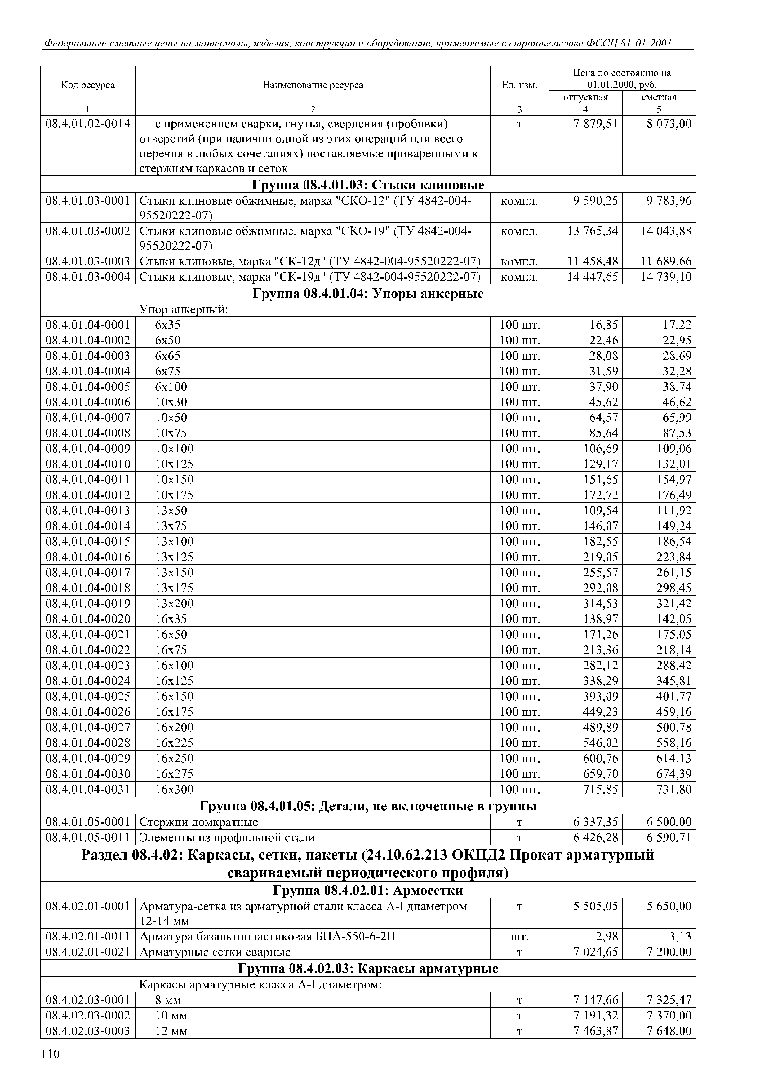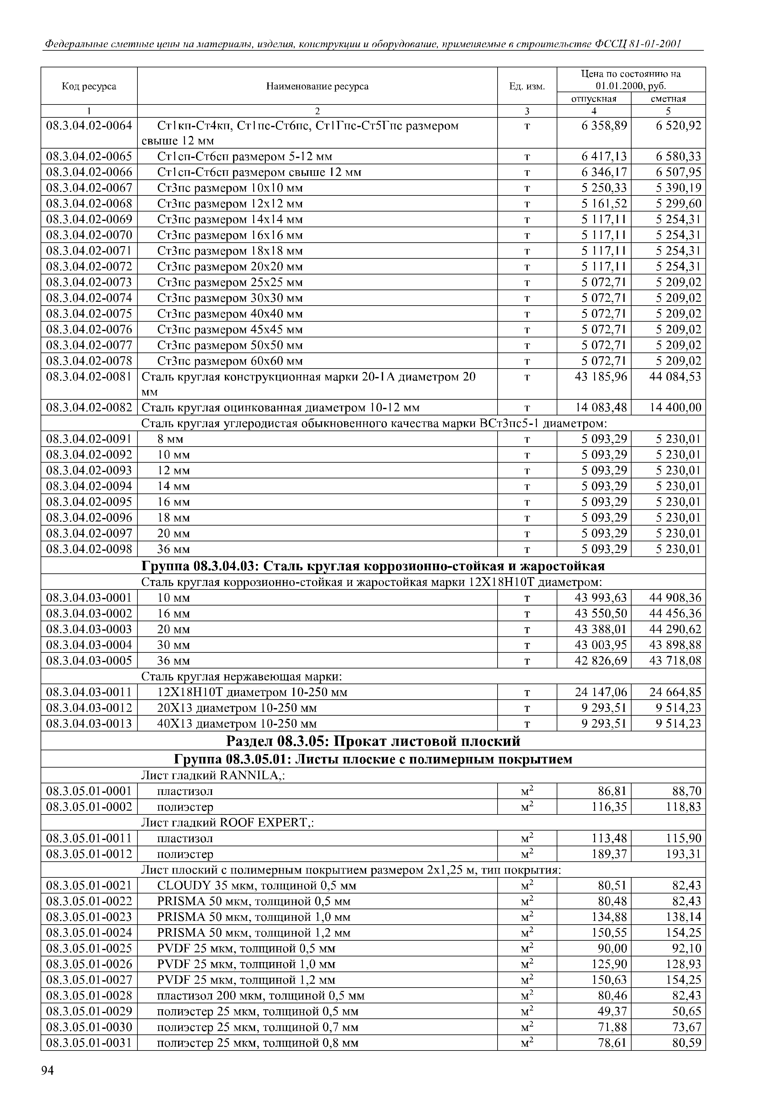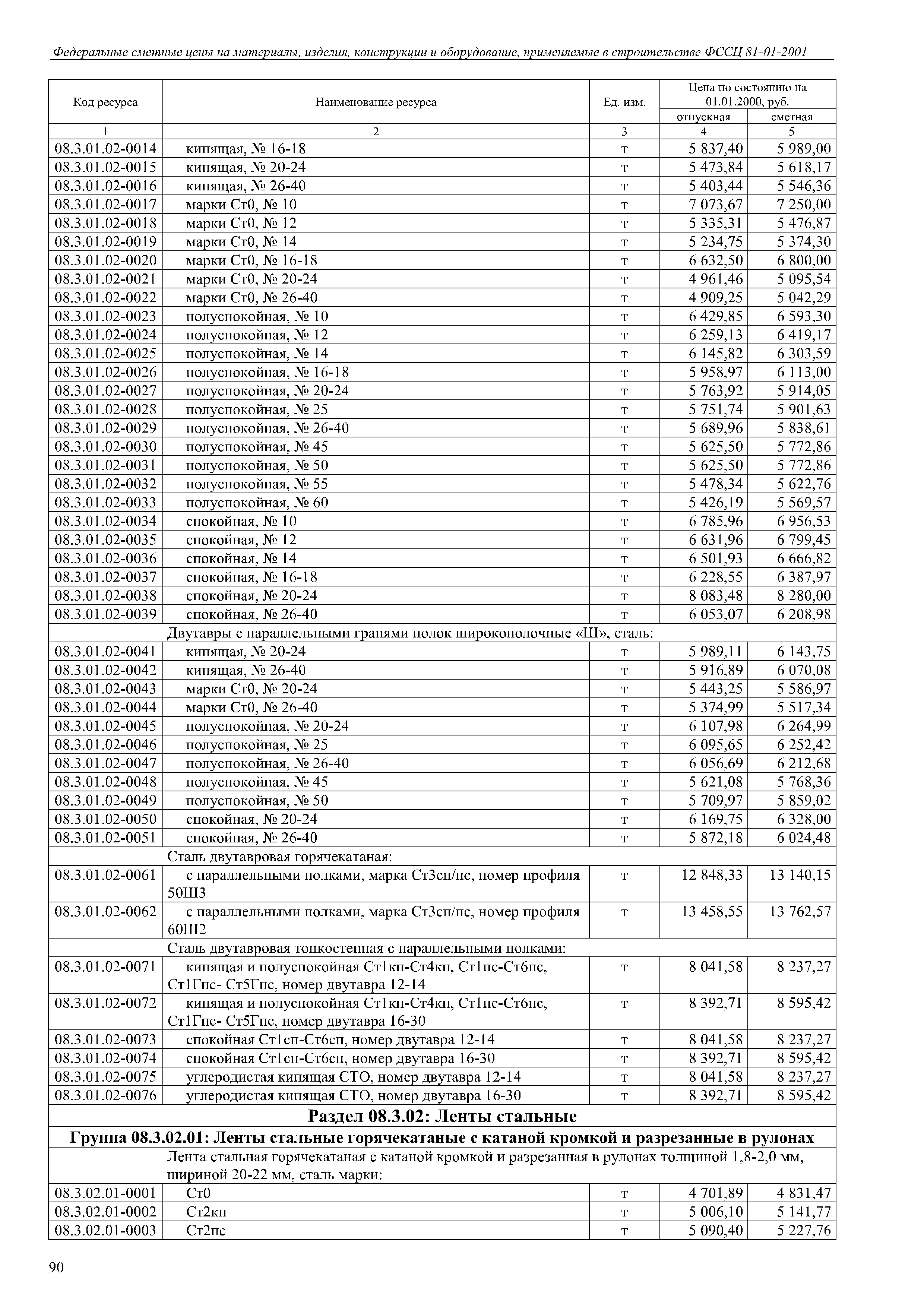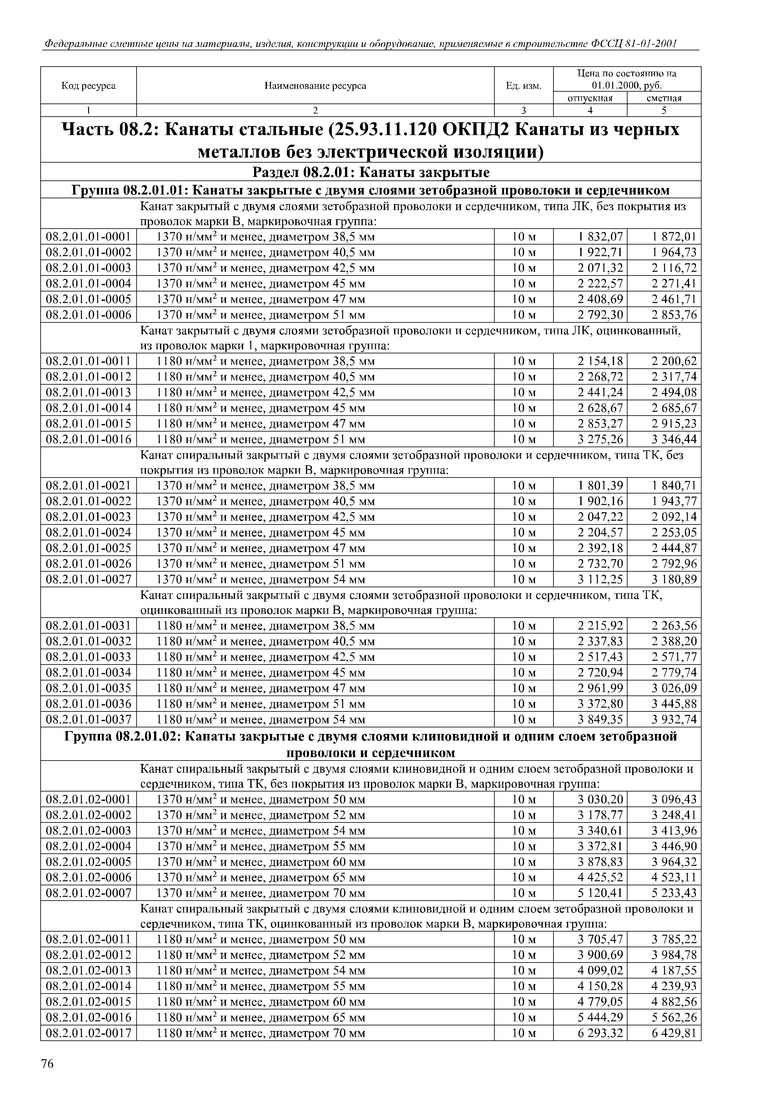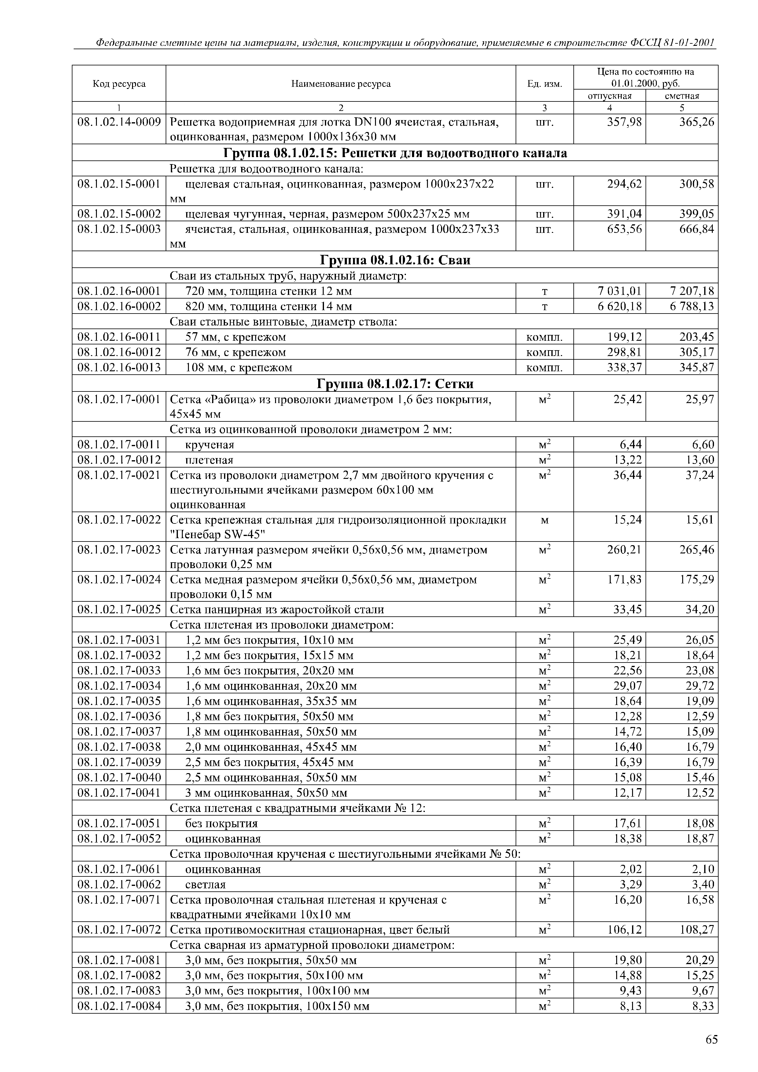 Книга 08: Изделия металлические, металлопрокат, канаты. Федеральные сметные цены на материалы изделия, конструкции и оборудование, применяемые в строительстве. Федеральный сборник сметных цен на материалы, изделия и конструкции, применяемые в строительстве| Статус: | действует | | Название рус.: | Книга 08: Изделия металлические, металлопрокат, канаты. Федеральные сметные цены на материалы изделия, конструкции и оборудование, применяемые в строительстве. Федеральный сборник сметных цен на материалы, изделия и конструкции, применяемые в строительстве | | Дата добавления в базу: | 05.05.2017 | | Дата актуализации: | 01.01.2021 | | Дата введения: | 28.04.2017 | | Область применения: | Государственные сметные нормативы "Федеральные сметные цены на материалы, изделия, конструкции и оборудование, применяемые в строительстве" предназначены для определения сметной стоимости строительства, реконструкции и капитального ремонта объектов капитального строительства. | | Оглавление: | Часть 08.1: Изделия из металла Раздел 08.1.01: Конструкции габионные Раздел 08.1.02: Металлоизделия общестроительного и специального назначения Раздел 08.1.03: Элементы вентиляционных камер и шахт Раздел 08.1.04: Элементы дымоходов Раздел 08.1.05: Элементы мусоропроводов Раздел 08.1.06: Элементы ограждений Часть 08.2: Канаты стальные Раздел 08.2.01: Канаты закрытые Раздел 08.2.02: Канаты круглые Раздел 08.2.03: Канаты плоские Раздел 08.2.04: Канаты стальные прочие Часть 08.3: Металлопрокат Раздел 08.3.01: Двутавры Раздел 08.3.02: Ленты стальные Раздел 08.3.03: Проволока Раздел 08.3.04: Прокат круглый и квадратный Раздел 08.3.05: Прокат листовой плоский Раздел 08.3.06: Прокат листовой рифленый и волнистый Раздел 08.3.07: Прокат полосовой Раздел 08.3.08: Прокат угловой Раздел 08.3.09: Профили гнутые Раздел 08.3.10: Профили фасонные Раздел 08.3.11: Швеллеры Раздел 08.3.12: Прокат и стали прочие Часть 08.4: Сталь арматурная Раздел 08.4.01: Детали закладные и накладные Раздел 08.4.02: Каркасы, сетки, пакеты Раздел 08.4.03: Сталь арматурная горячекатаная для железобетонных конструкций | | Утверждён: | 30.12.2016 Минстрой России (Russian Federation Minstroy 1039/пр)