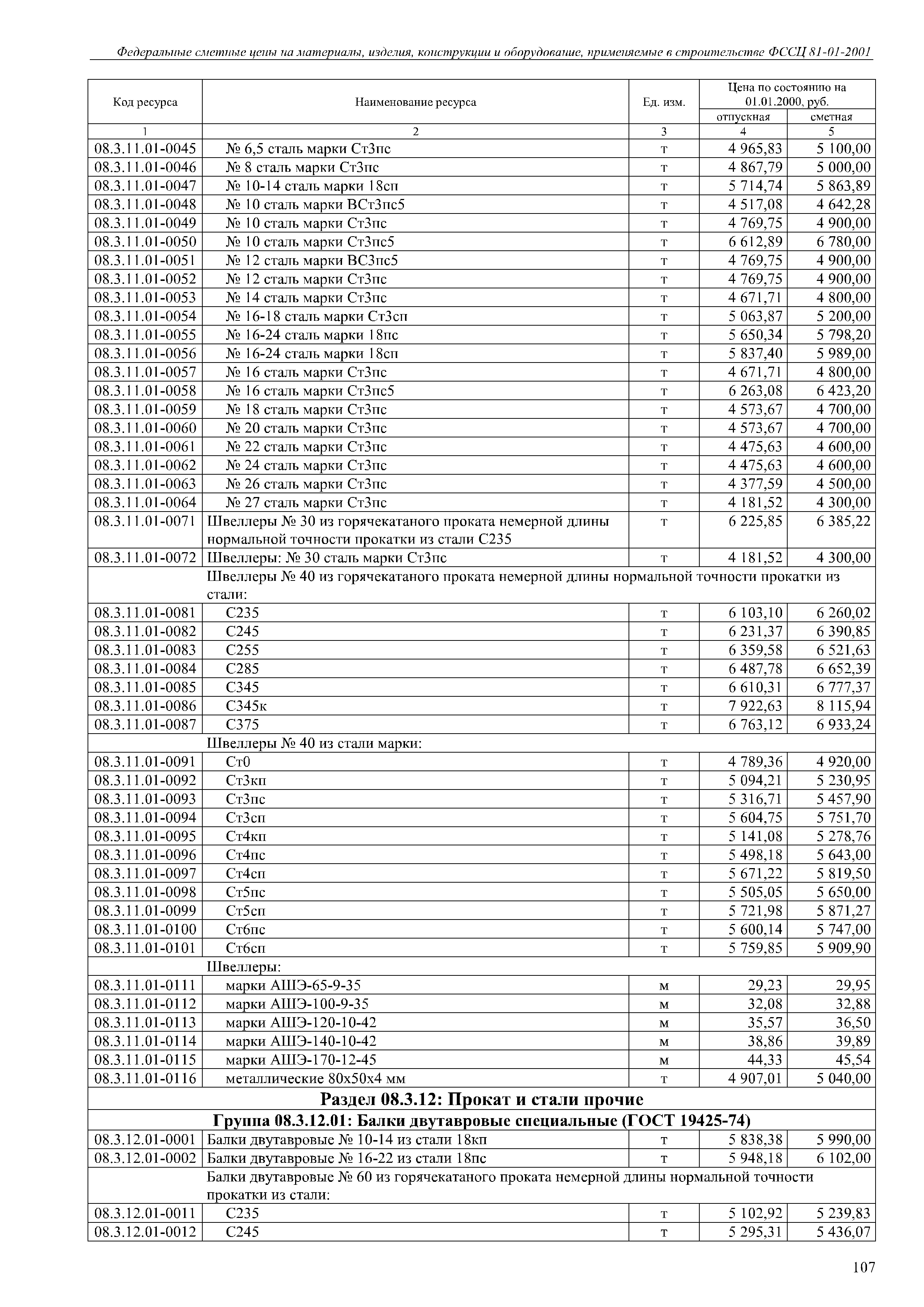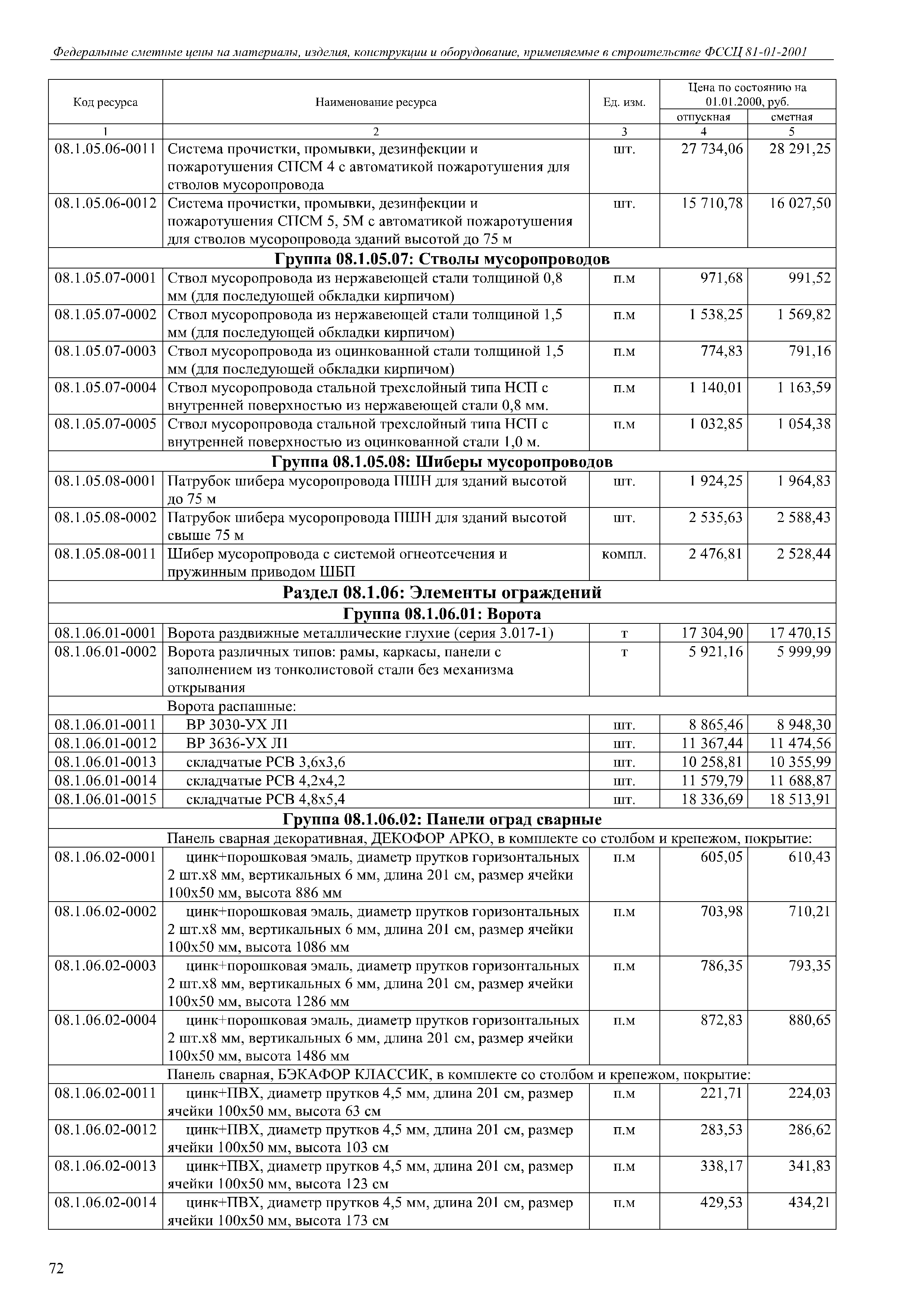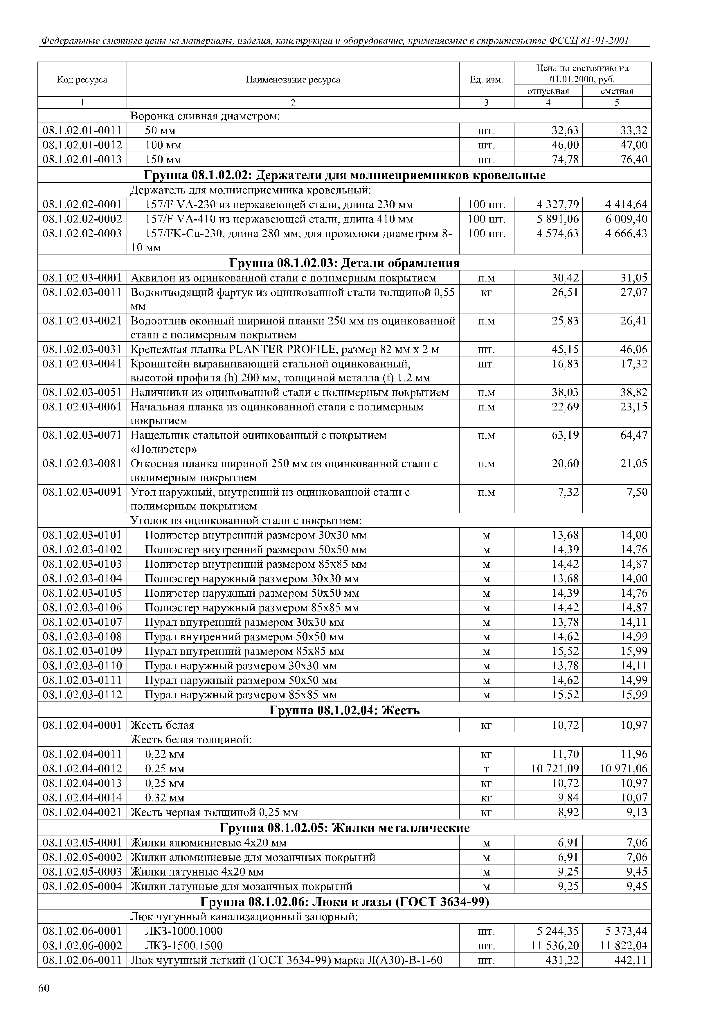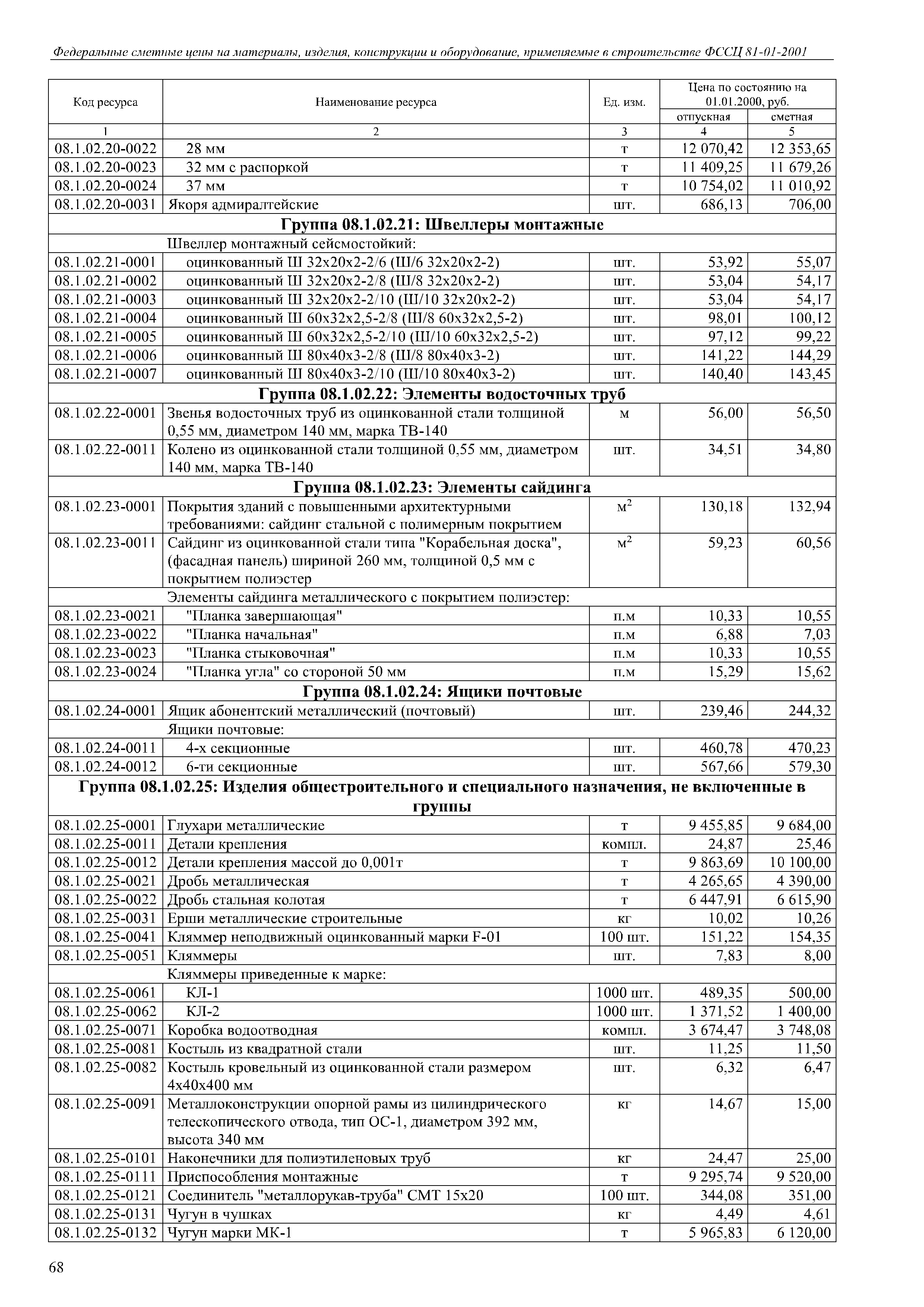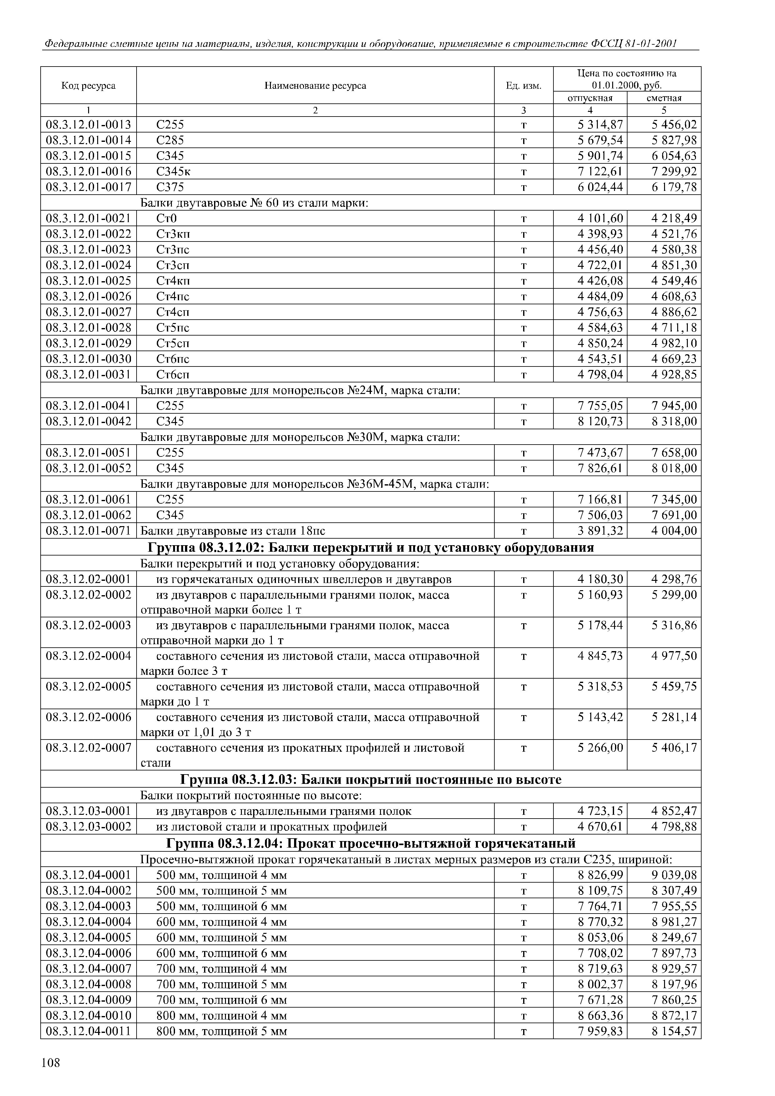 Книга 08: Изделия металлические, металлопрокат, канаты. Федеральные сметные цены на материалы изделия, конструкции и оборудование, применяемые в строительстве. Федеральный сборник сметных цен на материалы, изделия и конструкции, применяемые в строительстве| Статус: | действует | | Название рус.: | Книга 08: Изделия металлические, металлопрокат, канаты. Федеральные сметные цены на материалы изделия, конструкции и оборудование, применяемые в строительстве. Федеральный сборник сметных цен на материалы, изделия и конструкции, применяемые в строительстве | | Дата добавления в базу: | 05.05.2017 | | Дата актуализации: | 01.01.2021 | | Дата введения: | 28.04.2017 | | Область применения: | Государственные сметные нормативы "Федеральные сметные цены на материалы, изделия, конструкции и оборудование, применяемые в строительстве" предназначены для определения сметной стоимости строительства, реконструкции и капитального ремонта объектов капитального строительства. | | Оглавление: | Часть 08.1: Изделия из металла Раздел 08.1.01: Конструкции габионные Раздел 08.1.02: Металлоизделия общестроительного и специального назначения Раздел 08.1.03: Элементы вентиляционных камер и шахт Раздел 08.1.04: Элементы дымоходов Раздел 08.1.05: Элементы мусоропроводов Раздел 08.1.06: Элементы ограждений Часть 08.2: Канаты стальные Раздел 08.2.01: Канаты закрытые Раздел 08.2.02: Канаты круглые Раздел 08.2.03: Канаты плоские Раздел 08.2.04: Канаты стальные прочие Часть 08.3: Металлопрокат Раздел 08.3.01: Двутавры Раздел 08.3.02: Ленты стальные Раздел 08.3.03: Проволока Раздел 08.3.04: Прокат круглый и квадратный Раздел 08.3.05: Прокат листовой плоский Раздел 08.3.06: Прокат листовой рифленый и волнистый Раздел 08.3.07: Прокат полосовой Раздел 08.3.08: Прокат угловой Раздел 08.3.09: Профили гнутые Раздел 08.3.10: Профили фасонные Раздел 08.3.11: Швеллеры Раздел 08.3.12: Прокат и стали прочие Часть 08.4: Сталь арматурная Раздел 08.4.01: Детали закладные и накладные Раздел 08.4.02: Каркасы, сетки, пакеты Раздел 08.4.03: Сталь арматурная горячекатаная для железобетонных конструкций | | Утверждён: | 30.12.2016 Минстрой России (Russian Federation Minstroy 1039/пр)