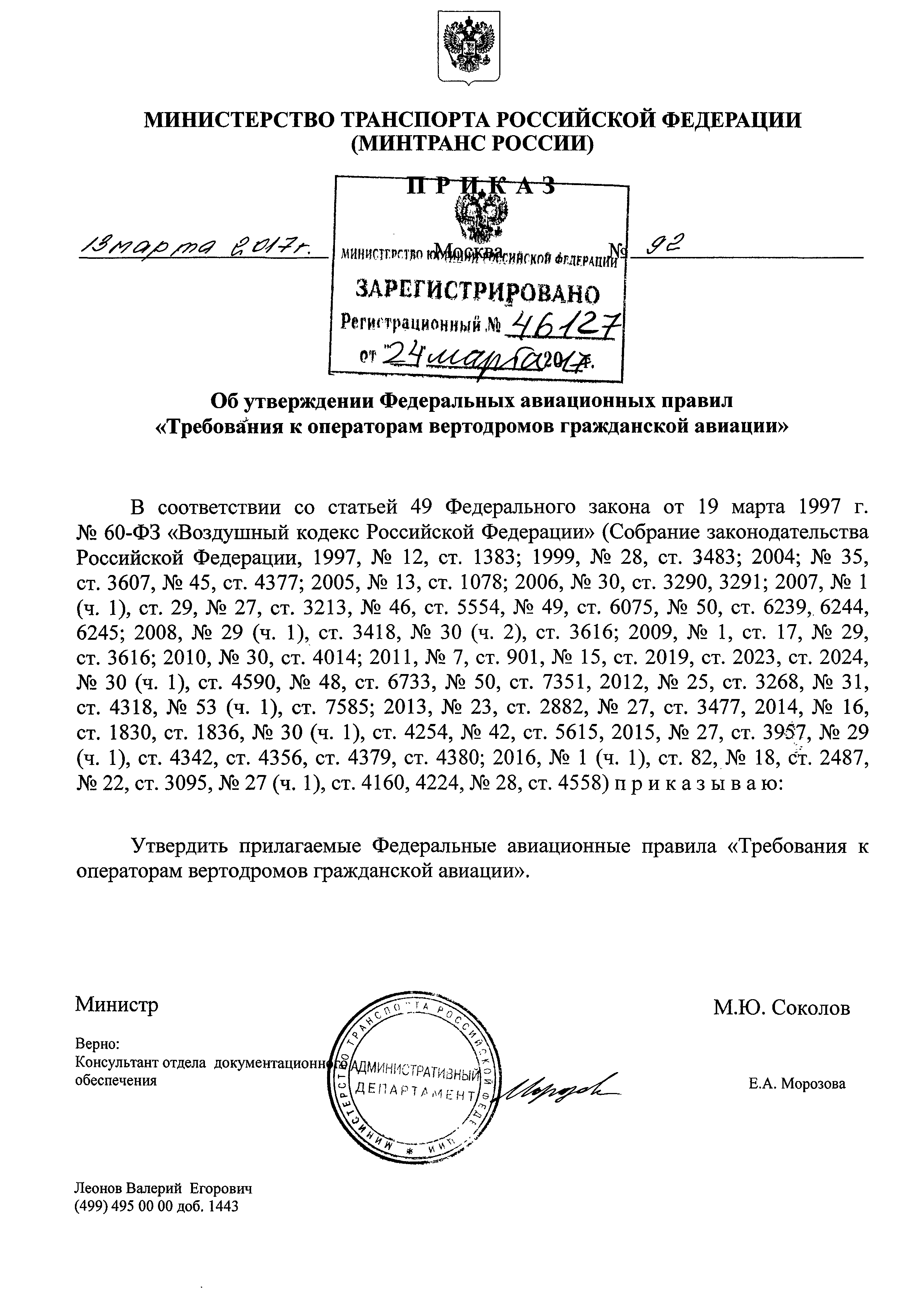 | Утверждён: | 13.03.2017 Министерство транспорта Российской Федерации (Russian Federation Ministry of Transportation 92)