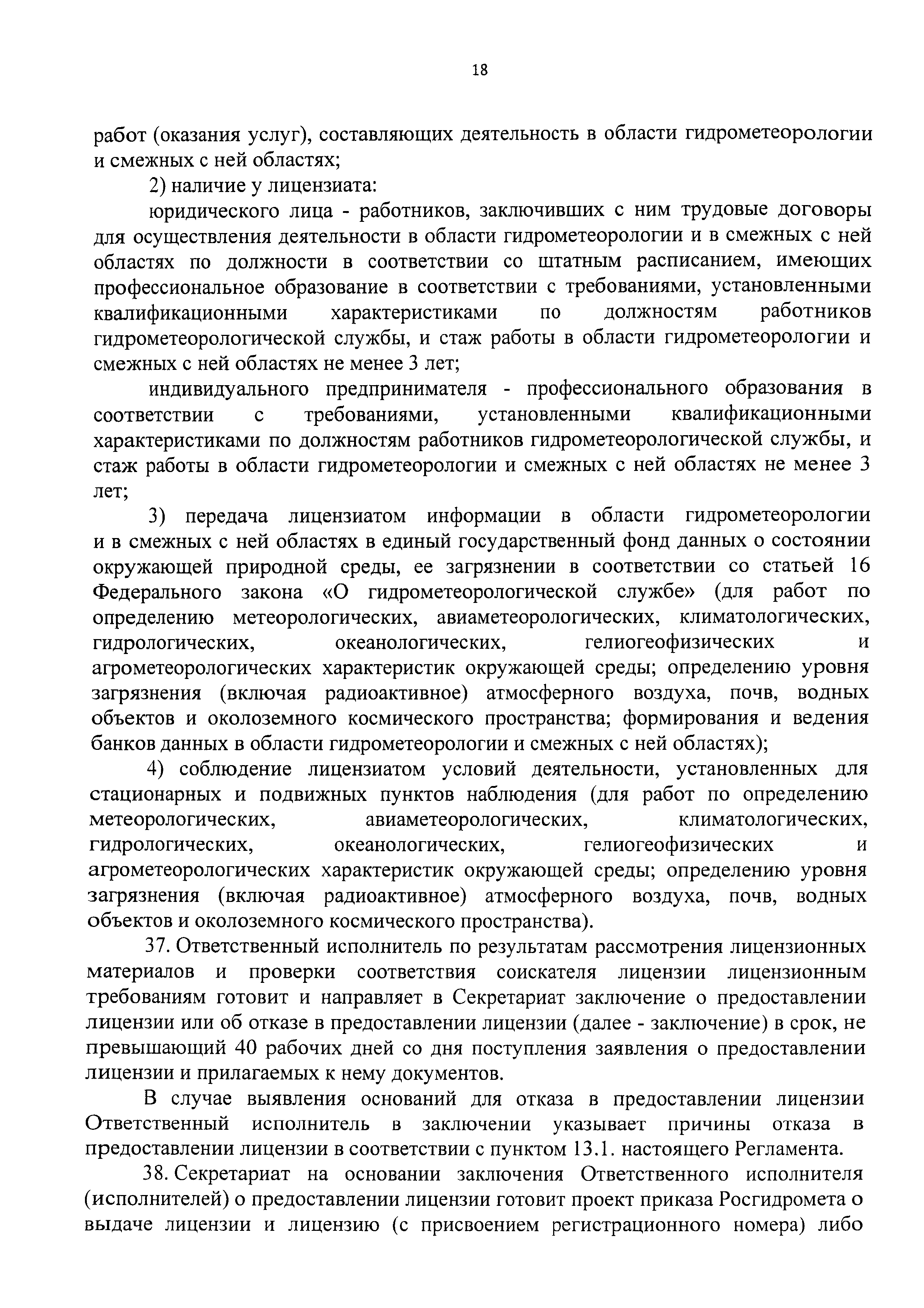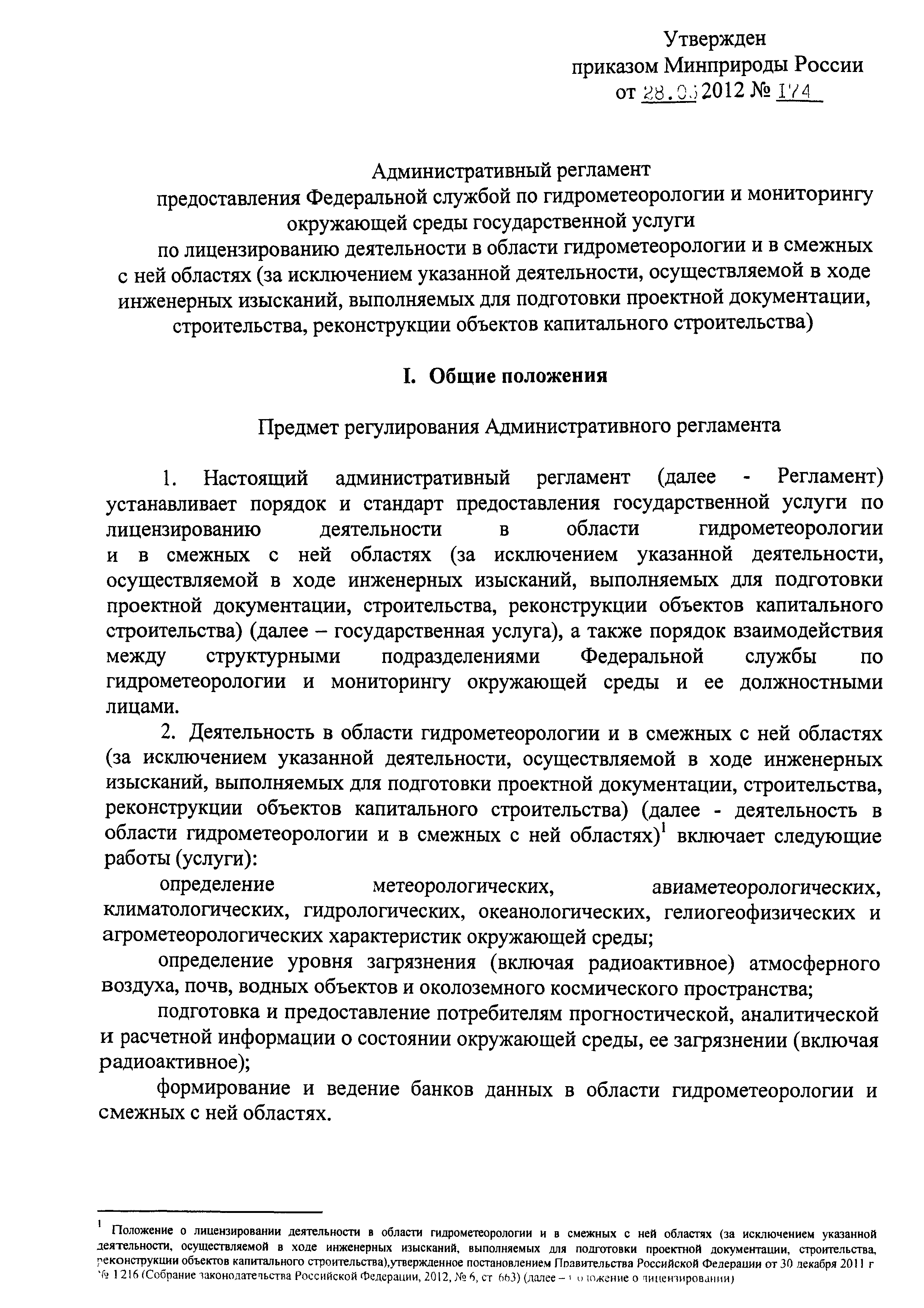 Административный регламент предоставления Федеральной службой по гидрометеорологии и мониторингу окружающей среды государственной услуги по лицензированию деятельности в области гидрометеорологии и в смежных с ней областях (за исключением указанной деятельности, осуществляемой в ходе инженерных изысканий, выполняемых для подготовки проектной документации, строительства, реконструкции объектов капитального строительства)| Статус: | действует | | Название рус.: | Административный регламент предоставления Федеральной службой по гидрометеорологии и мониторингу окружающей среды государственной услуги по лицензированию деятельности в области гидрометеорологии и в смежных с ней областях (за исключением указанной деятельности, осуществляемой в ходе инженерных изысканий, выполняемых для подготовки проектной документации, строительства, реконструкции объектов капитального строительства) | | Дата добавления в базу: | 05.05.2017 | | Дата актуализации: | 01.01.2021 | | Дата введения: | 12.04.2013 | | Область применения: | Административный регламент устанавливает порядок и стандарт предоставления государственной услуги по лицензированию деятельности в области гидрометеорологии и в смежных с ней областях (за исключением указанной деятельности, осуществляемой в ходе инженерных изысканий, выполняемых для подготовки проектной документации, строительства, реконструкции объектов капитального строительства), а также порядок взаимодействия между структурными подразделениями Федеральной службы по гидрометеорологии и мониторингу окружающей среды и ее должностными лицами | | Оглавление: | I. Общие положения II. Стандарт предоставления государственной услуги III. Состав, последовательность и сроки выполнения административных процедур, требования к порядку их выполнения IV. Формы контроля за предоставлением государственной услуги V. Досудебное (внесудебное) обжалование заявителем решений и действий (бездействия) федерального органа исполнительной власти, предоставляющего государственную услугу, должностного лица органа, предоставляющего государственную услугу, либо государственного служащего Приложение № 1. Блок-схема предоставления государственной услуги | | Утверждён: | 28.06.2012 Министерство природных ресурсов и экологии Российской Федерации (174)