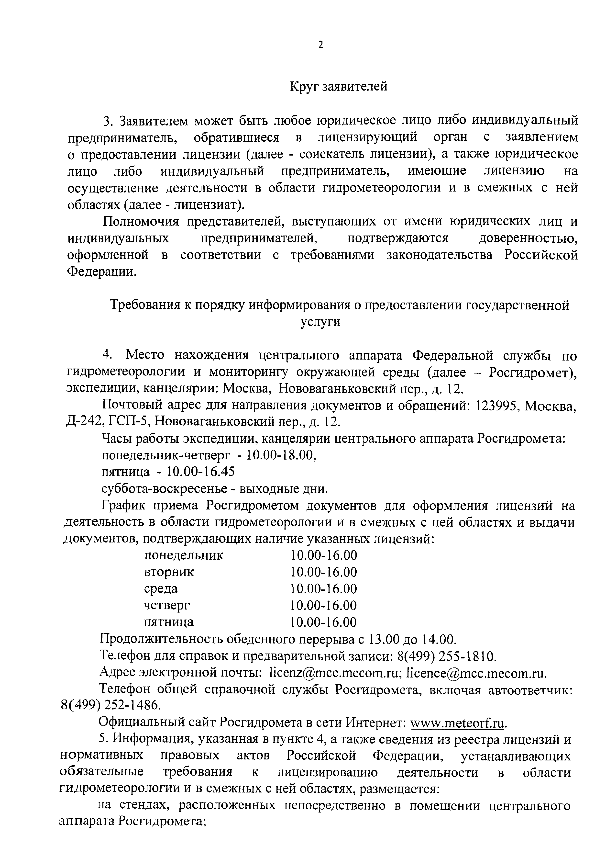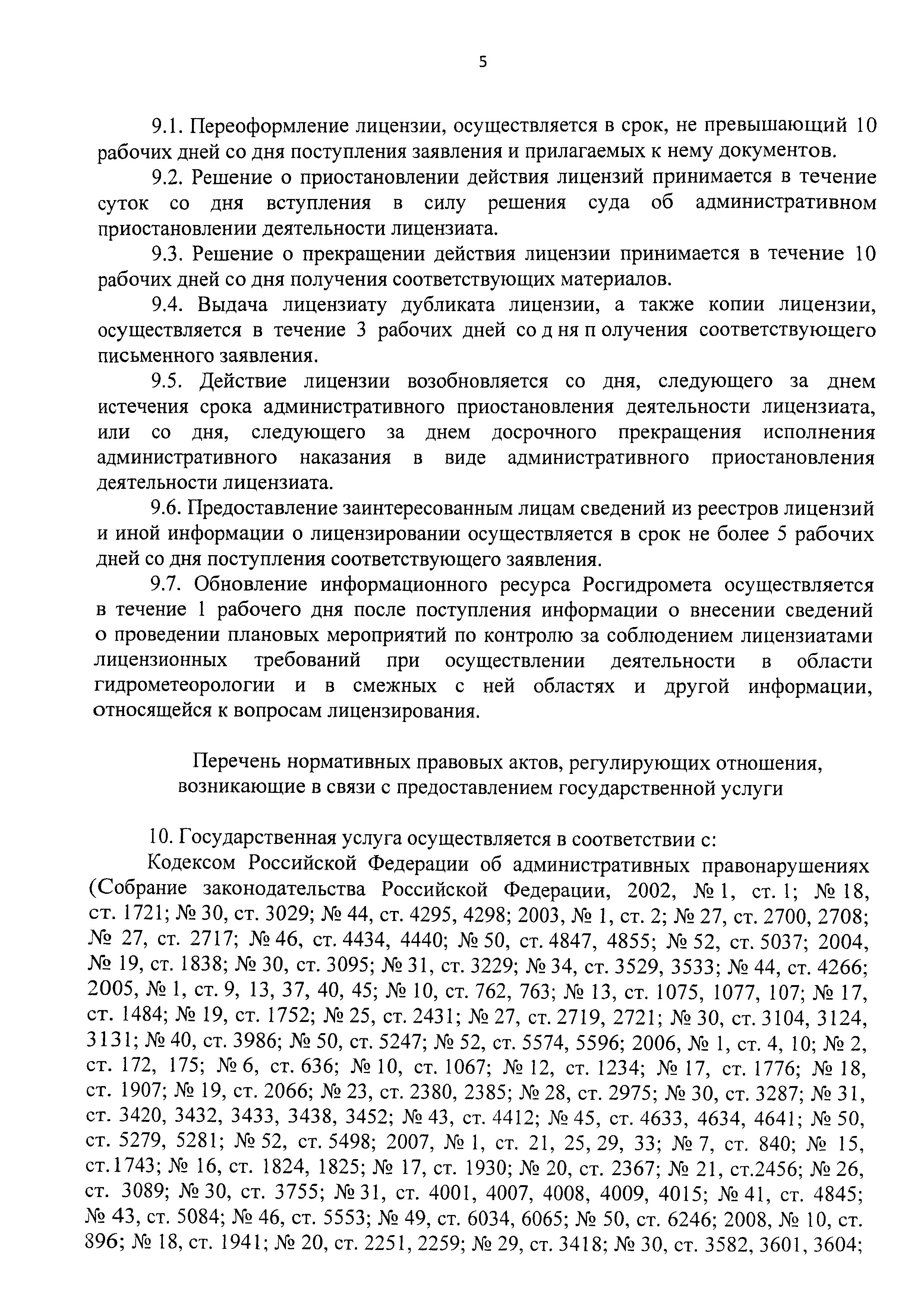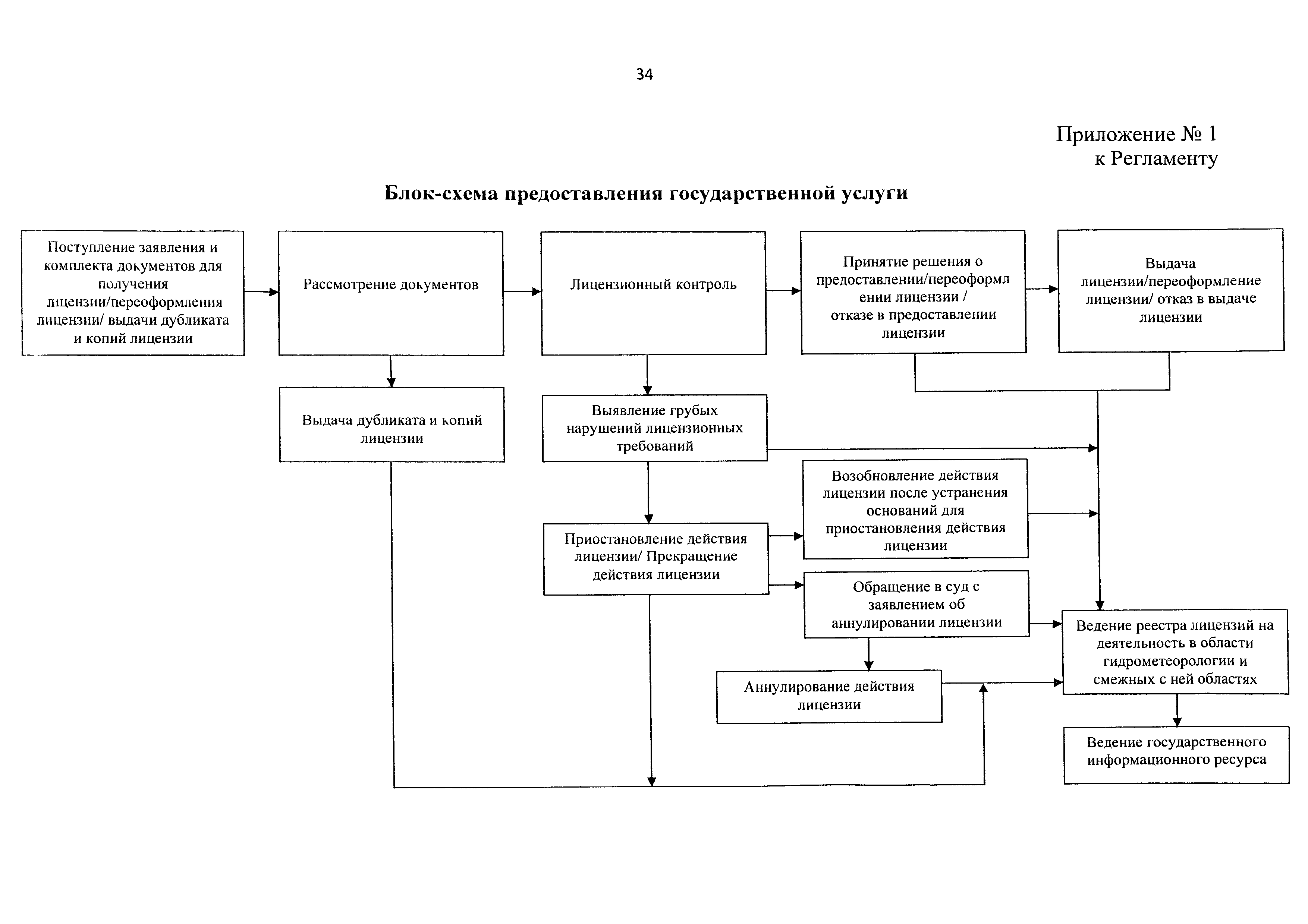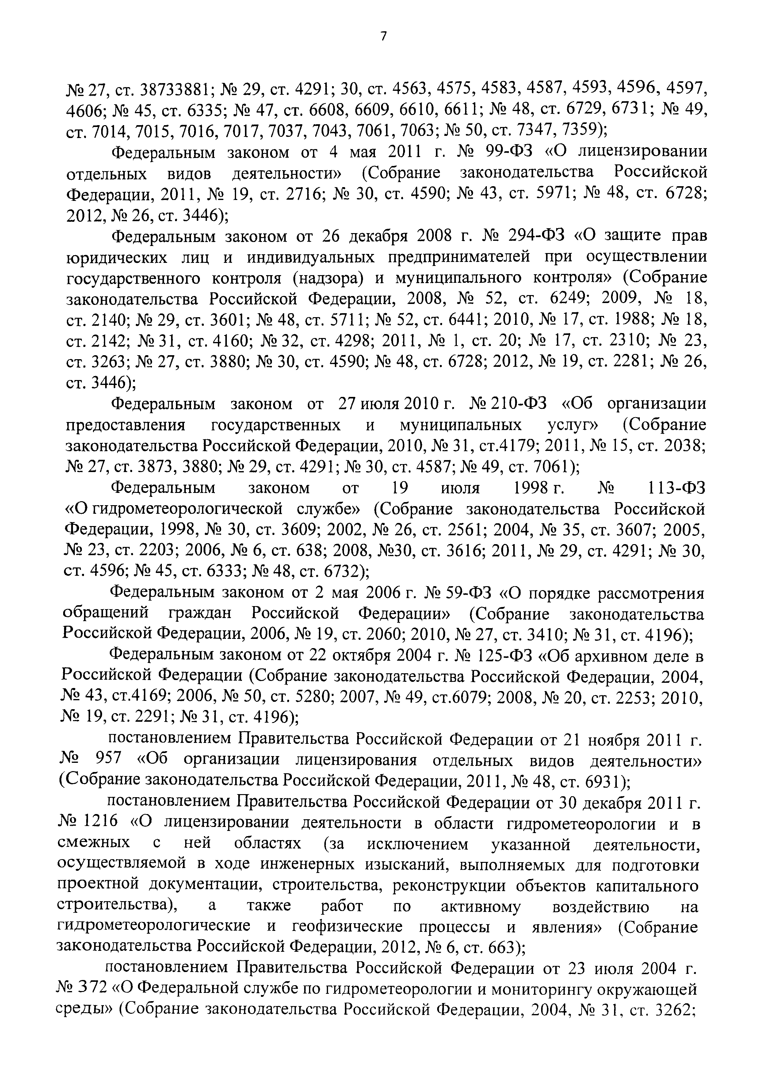 | | Нормативные ссылки: |  Кодекс «Кодекс Российской Федерации об административных правонарушениях»  Постановление 404 «О Министерстве природных ресурсов и экологии Российской Федерации»  Федеральный закон 294-ФЗ «О защите прав юридических лиц и индивидуальных предпринимателей при осуществлении государственного контроля (надзора) и муниципального контроля»  Федеральный закон 59-ФЗ «О порядке рассмотрения обращений граждан Российской Федерации»  Федеральный закон 125-ФЗ «Об архивном деле в Российской Федерации»  Федеральный закон 99-ФЗ «О лицензировании отдельных видов деятельности» Постановление 957 «Об организации лицензирования отдельных видов деятельности» Постановление 373 «О разработке и утверждении административных регламентов осуществления государственного контроля (надзора) и административных регламентов предоставления государственных услуг»  Федеральный закон 210-ФЗ «Об организации предоставления государственных и муниципальных услуг»  Федеральный закон 113-ФЗ «О гидрометеорологической службе» «Положение о создании и ведении Единого государственного фонда данных о состоянии окружающей среды, ее загрязнении» «Положение о Федеральной службе по гидрометеорологии и мониторингу окружающей среды» «Положение об информационных услугах в области гидрометеорологии и мониторинга загрязнения окружающей природной среды»  «Типовая форма лицензии»  Постановление 1219 «Об утверждении Положения о Министерстве природных ресурсов и экологии Российской Федерации и об изменении и признании утратившими силу некоторых актов Правительства Российской Федерации»  «Требования к предоставлению в электронной форме государственных и муниципальных услуг» «Правила подготовки докладов об осуществлении государственного контроля (надзора), муниципального контроля в соответствующих сферах деятельности и об эффективности такого контроля (надзора)» «Правила направления запроса и получения на безвозмездной основе, в том числе в электронной форме, документов и (или) информации органами государственного контроля (надзора), органами муниципального контроля при организации и проведении проверок от иных государственных органов, органов местного самоуправления либо подведомственных государственным органам или органам местного самоуправления организаций, в распоряжении которых находятся эти документы и (или) информация, в рамках межведомственного информационного взаимодействия» «Правила подачи и рассмотрения жалоб на решения и действия (бездействие) федеральных органов исполнительной власти и их должностных лиц, федеральных государственных служащих, должностных лиц государственных внебюджетных фондов Российской Федерации, государственных корпораций, наделенных в соответствии с федеральными законами полномочиями по предоставлению государственных услуг в установленной сфере деятельности, и их должностных лиц, организаций, предусмотренных частью 1.1 статьи 16 Федерального закона "Об организации предоставления государственных и муниципальных услуг", и их работников, а также многофункциональных центров предоставления государственных и муниципальных услуг и их работников»  Федеральный закон 181-ФЗ «О социальной защите инвалидов в Российской Федерации»