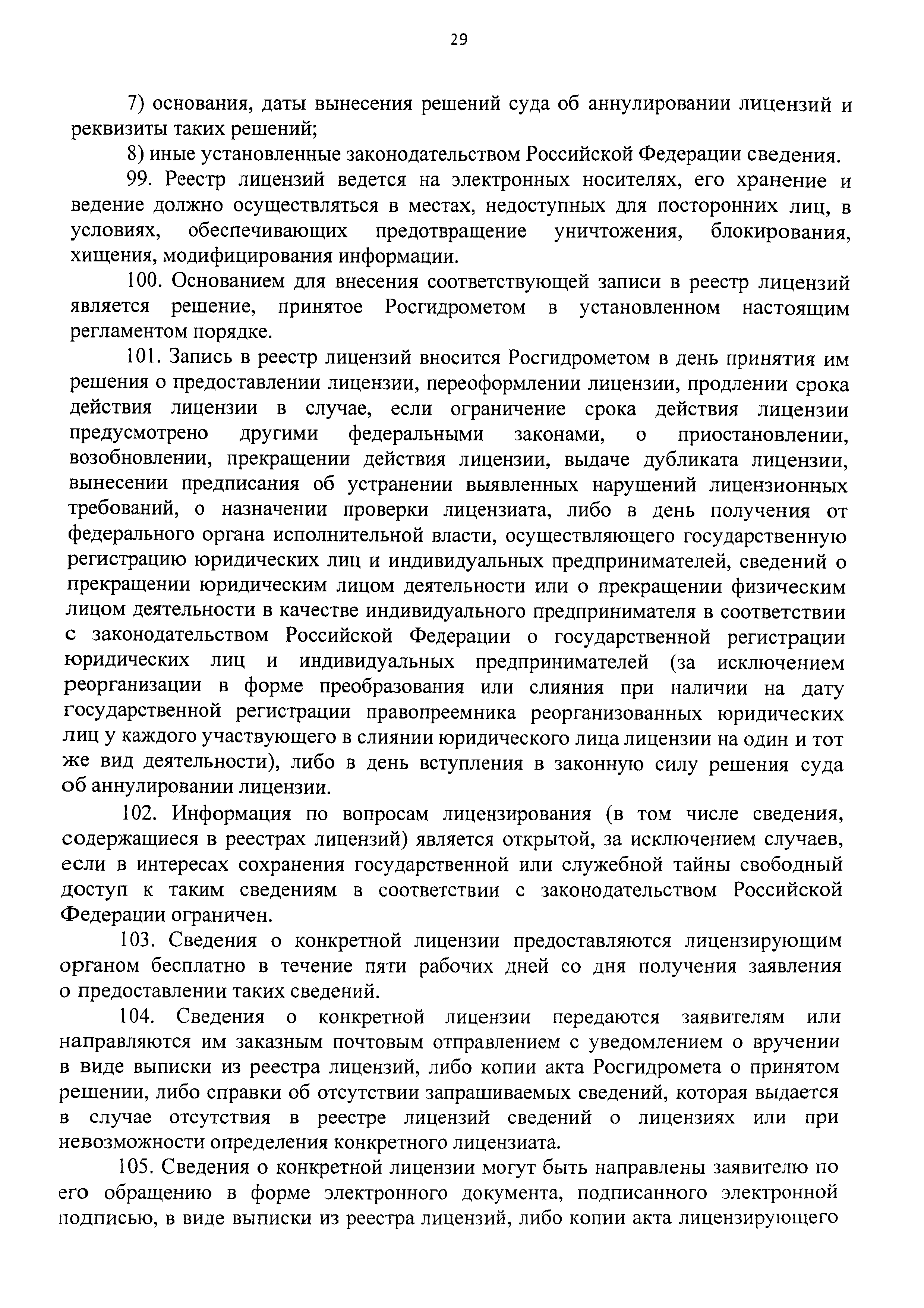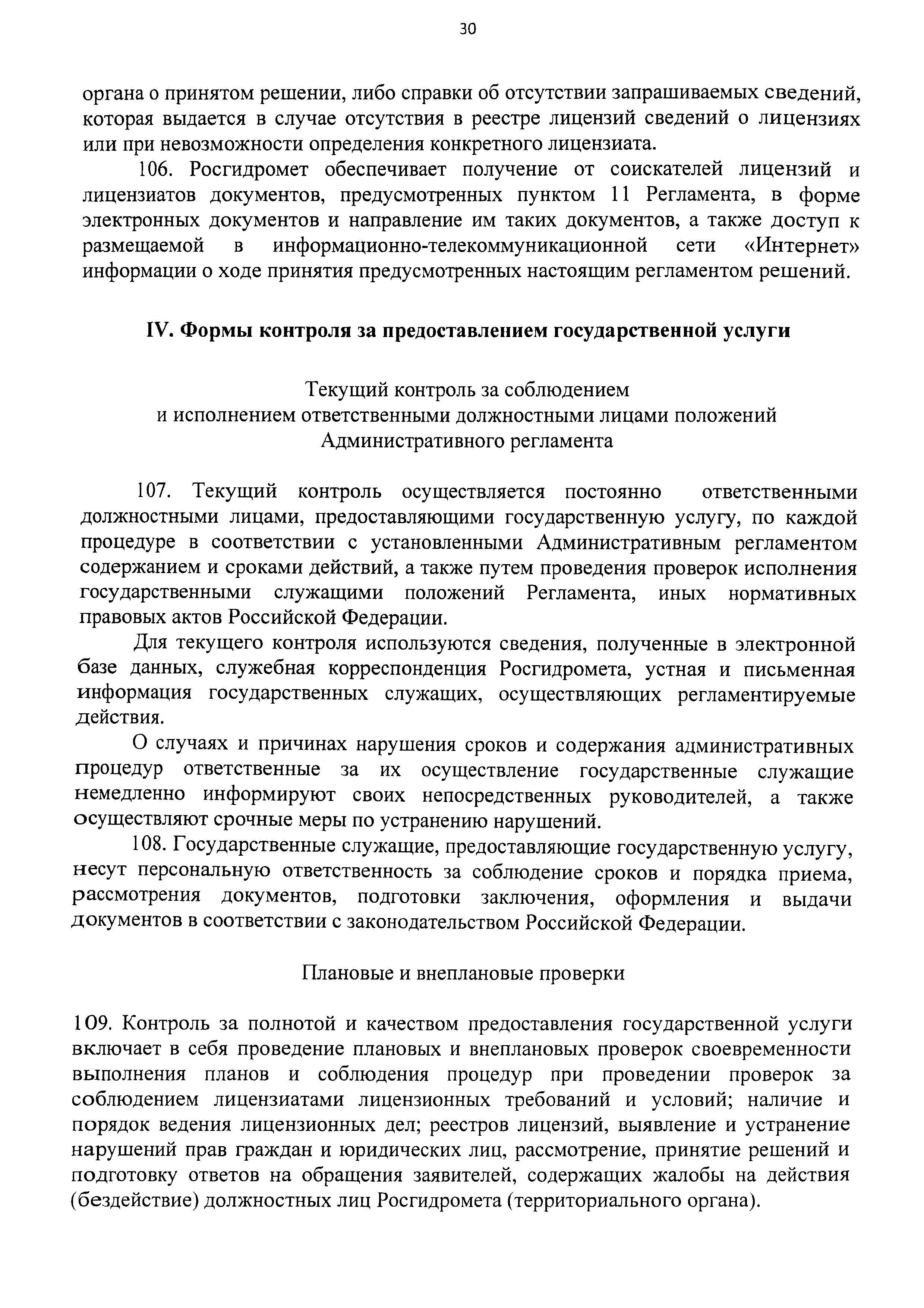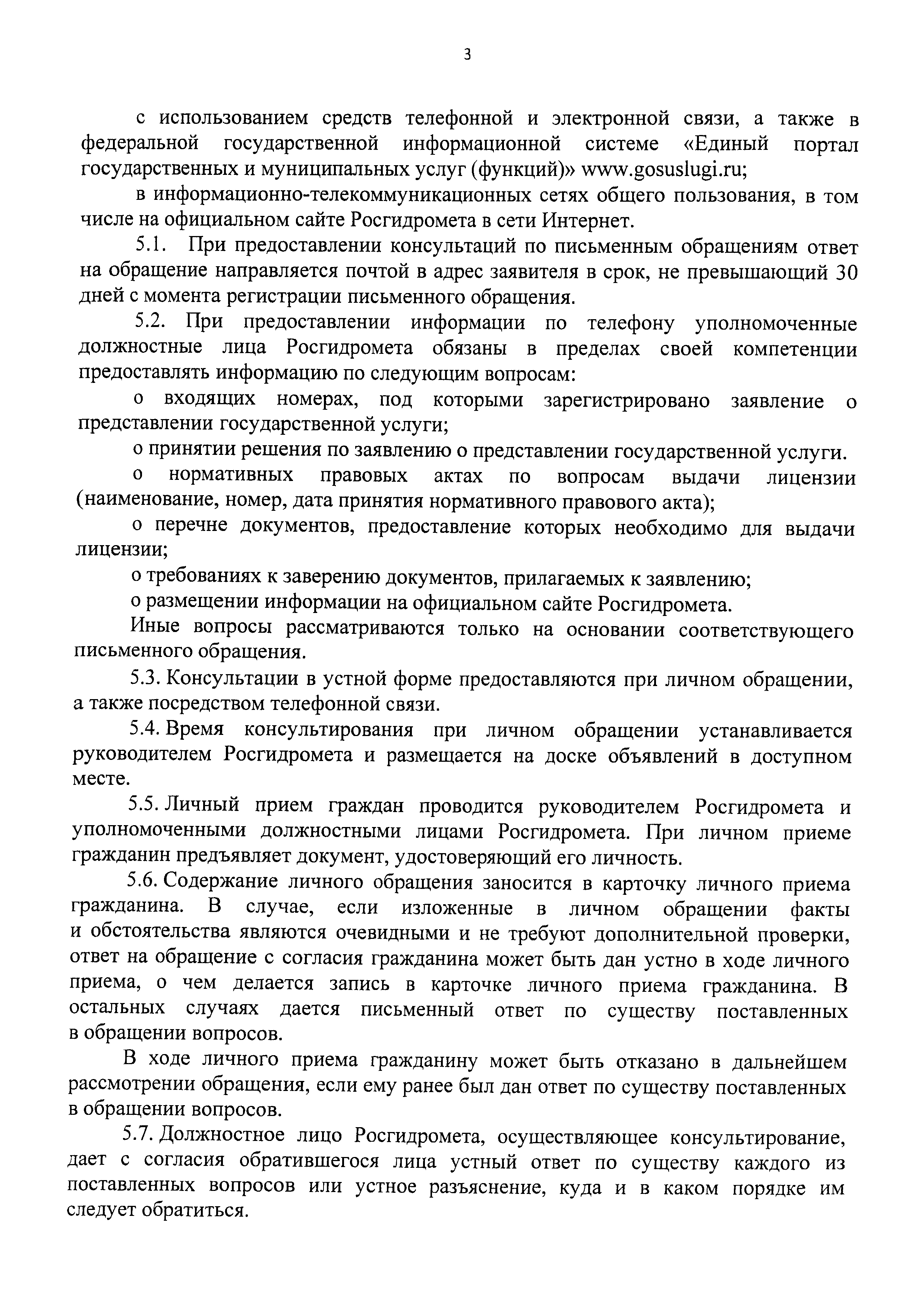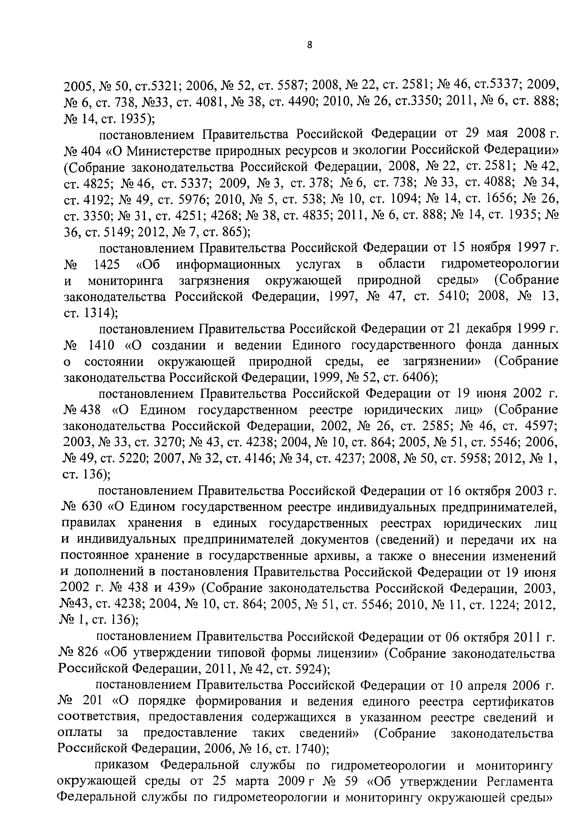 | | Нормативные ссылки: |  Кодекс «Кодекс Российской Федерации об административных правонарушениях»  Постановление 404 «О Министерстве природных ресурсов и экологии Российской Федерации»  Федеральный закон 294-ФЗ «О защите прав юридических лиц и индивидуальных предпринимателей при осуществлении государственного контроля (надзора) и муниципального контроля»  Федеральный закон 59-ФЗ «О порядке рассмотрения обращений граждан Российской Федерации»  Федеральный закон 125-ФЗ «Об архивном деле в Российской Федерации»  Федеральный закон 99-ФЗ «О лицензировании отдельных видов деятельности» Постановление 957 «Об организации лицензирования отдельных видов деятельности» Постановление 373 «О разработке и утверждении административных регламентов осуществления государственного контроля (надзора) и административных регламентов предоставления государственных услуг»  Федеральный закон 210-ФЗ «Об организации предоставления государственных и муниципальных услуг»  Федеральный закон 113-ФЗ «О гидрометеорологической службе» «Положение о создании и ведении Единого государственного фонда данных о состоянии окружающей среды, ее загрязнении» «Положение о Федеральной службе по гидрометеорологии и мониторингу окружающей среды» «Положение об информационных услугах в области гидрометеорологии и мониторинга загрязнения окружающей природной среды»  «Типовая форма лицензии»  Постановление 1219 «Об утверждении Положения о Министерстве природных ресурсов и экологии Российской Федерации и об изменении и признании утратившими силу некоторых актов Правительства Российской Федерации»  «Требования к предоставлению в электронной форме государственных и муниципальных услуг» «Правила подготовки докладов об осуществлении государственного контроля (надзора), муниципального контроля в соответствующих сферах деятельности и об эффективности такого контроля (надзора)» «Правила направления запроса и получения на безвозмездной основе, в том числе в электронной форме, документов и (или) информации органами государственного контроля (надзора), органами муниципального контроля при организации и проведении проверок от иных государственных органов, органов местного самоуправления либо подведомственных государственным органам или органам местного самоуправления организаций, в распоряжении которых находятся эти документы и (или) информация, в рамках межведомственного информационного взаимодействия» «Правила подачи и рассмотрения жалоб на решения и действия (бездействие) федеральных органов исполнительной власти и их должностных лиц, федеральных государственных служащих, должностных лиц государственных внебюджетных фондов Российской Федерации, государственных корпораций, наделенных в соответствии с федеральными законами полномочиями по предоставлению государственных услуг в установленной сфере деятельности, и их должностных лиц, организаций, предусмотренных частью 1.1 статьи 16 Федерального закона "Об организации предоставления государственных и муниципальных услуг", и их работников, а также многофункциональных центров предоставления государственных и муниципальных услуг и их работников»  Федеральный закон 181-ФЗ «О социальной защите инвалидов в Российской Федерации»
