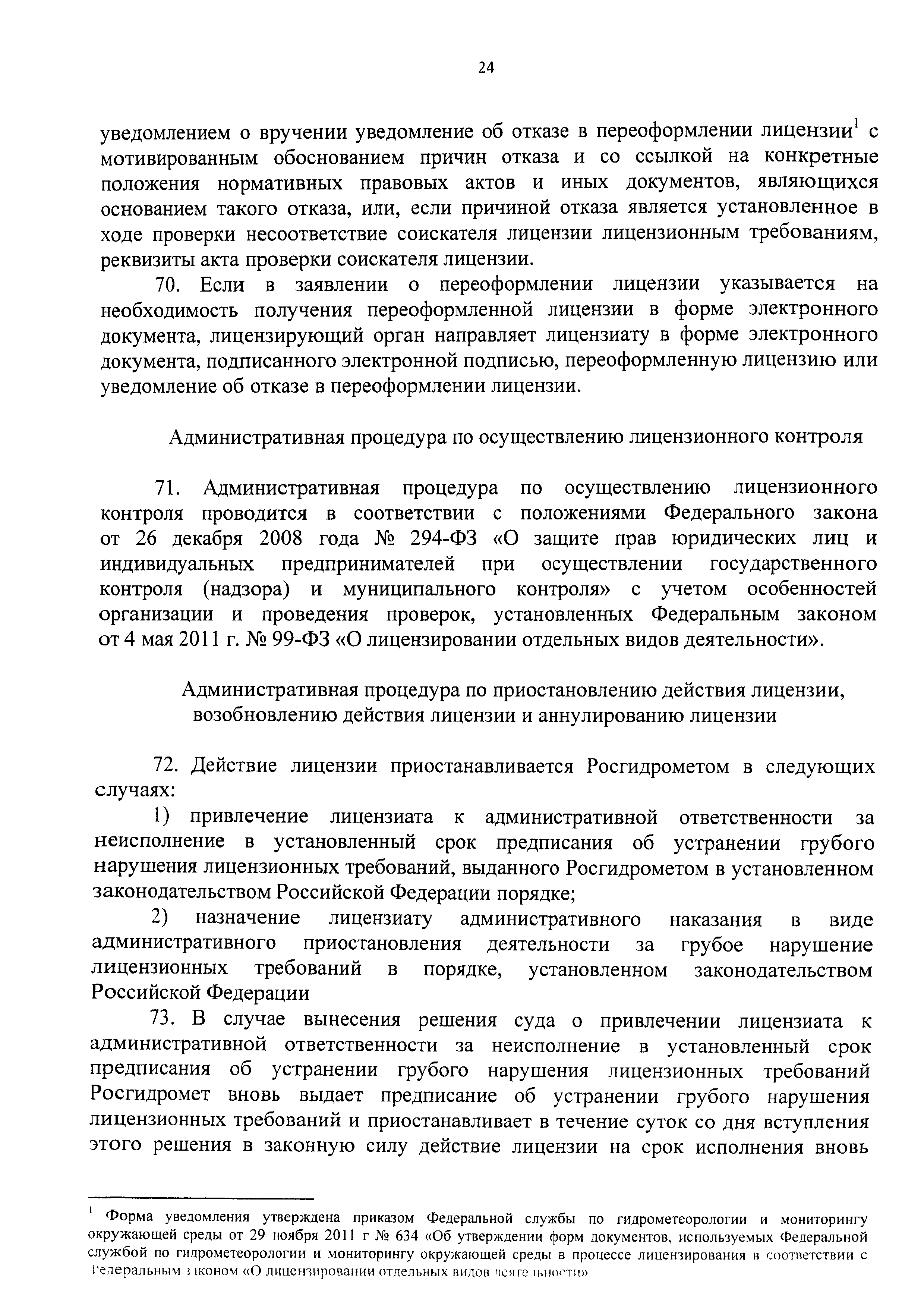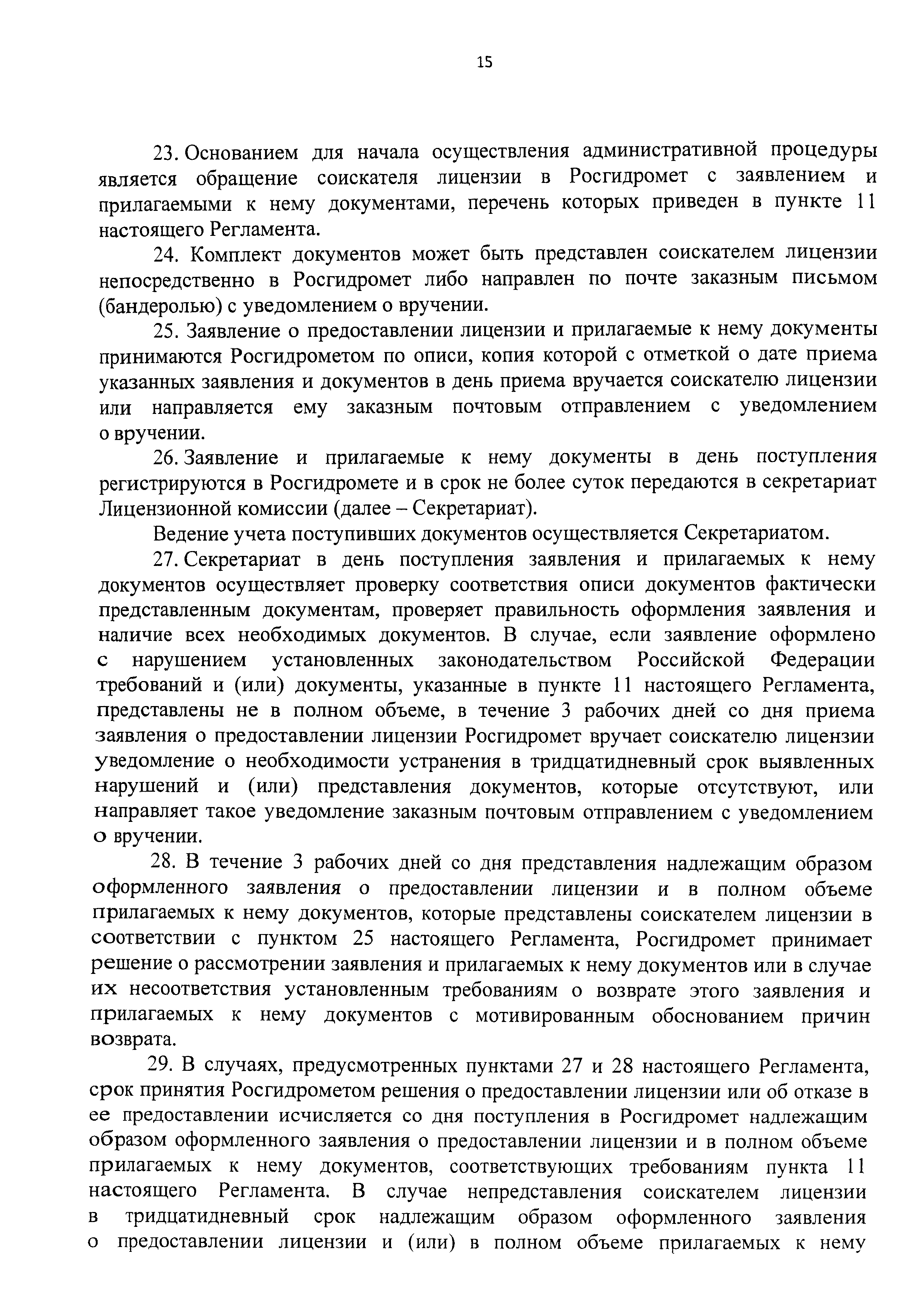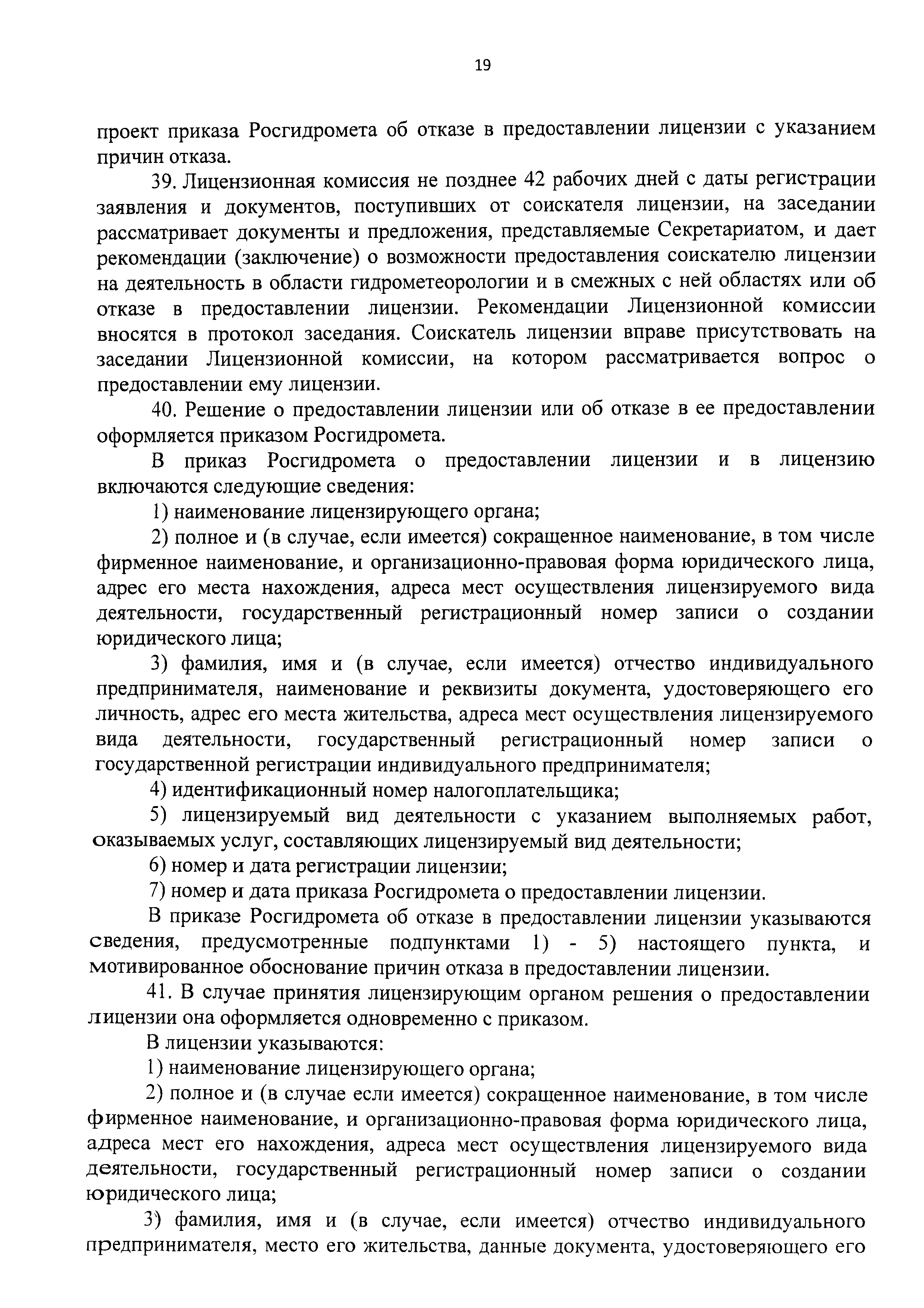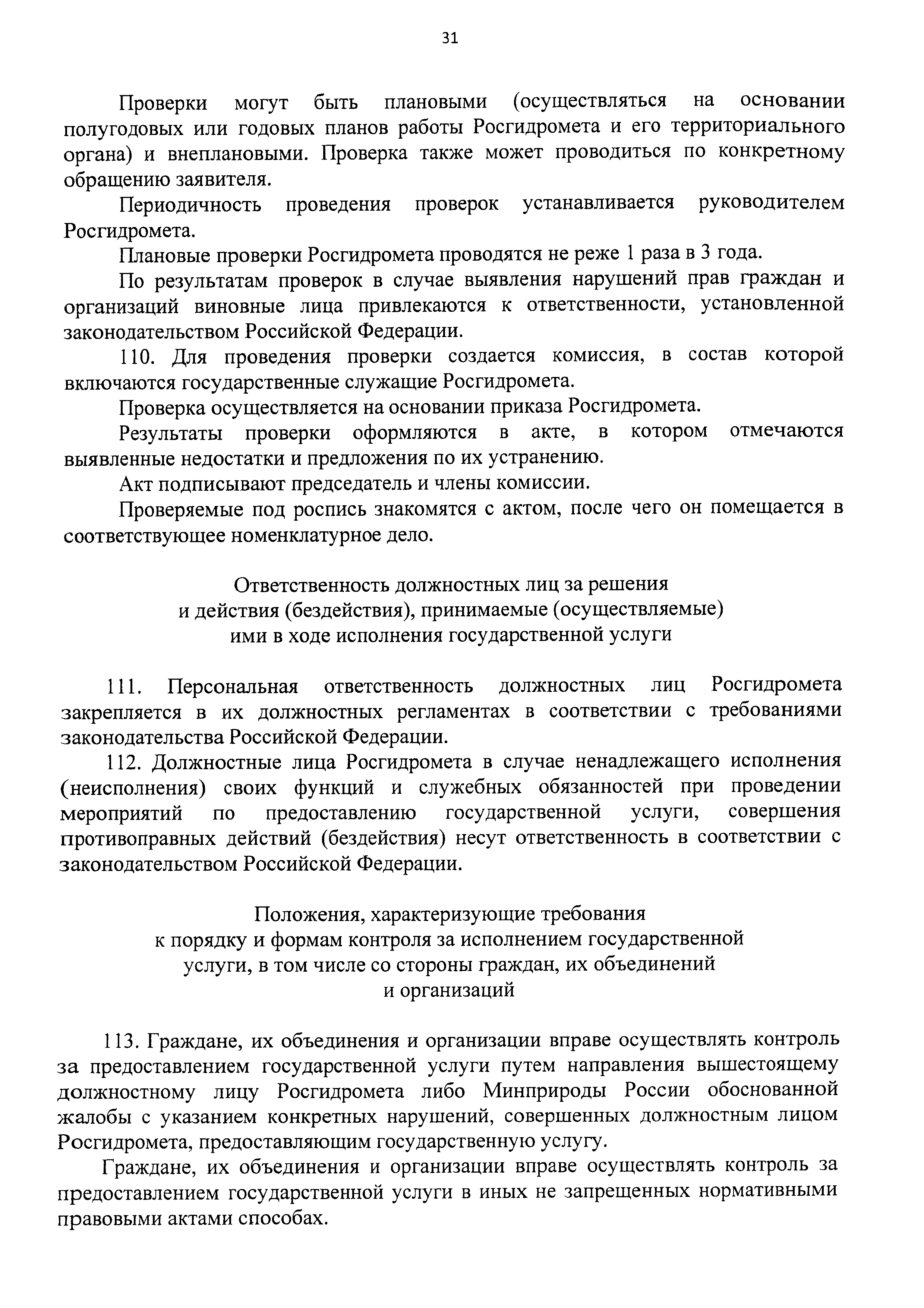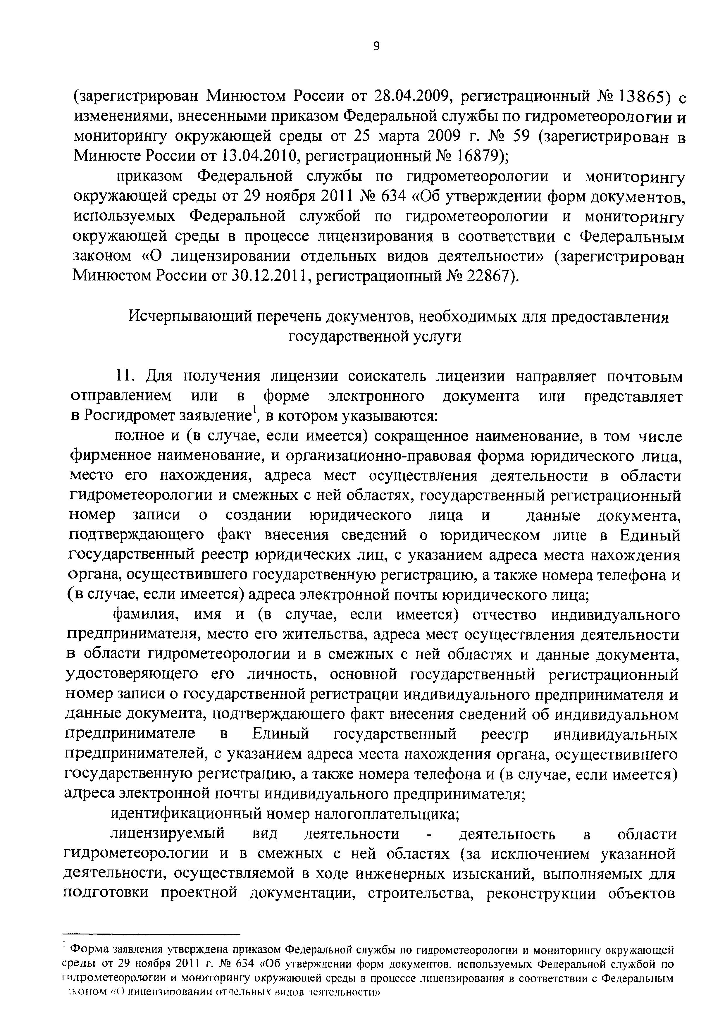 | | Нормативные ссылки: |  Кодекс «Кодекс Российской Федерации об административных правонарушениях»  Постановление 404 «О Министерстве природных ресурсов и экологии Российской Федерации»  Федеральный закон 294-ФЗ «О защите прав юридических лиц и индивидуальных предпринимателей при осуществлении государственного контроля (надзора) и муниципального контроля»  Федеральный закон 59-ФЗ «О порядке рассмотрения обращений граждан Российской Федерации»  Федеральный закон 125-ФЗ «Об архивном деле в Российской Федерации»  Федеральный закон 99-ФЗ «О лицензировании отдельных видов деятельности» Постановление 957 «Об организации лицензирования отдельных видов деятельности» Постановление 373 «О разработке и утверждении административных регламентов осуществления государственного контроля (надзора) и административных регламентов предоставления государственных услуг»  Федеральный закон 210-ФЗ «Об организации предоставления государственных и муниципальных услуг»  Федеральный закон 113-ФЗ «О гидрометеорологической службе» «Положение о создании и ведении Единого государственного фонда данных о состоянии окружающей среды, ее загрязнении» «Положение о Федеральной службе по гидрометеорологии и мониторингу окружающей среды» «Положение об информационных услугах в области гидрометеорологии и мониторинга загрязнения окружающей природной среды»  «Типовая форма лицензии»  Постановление 1219 «Об утверждении Положения о Министерстве природных ресурсов и экологии Российской Федерации и об изменении и признании утратившими силу некоторых актов Правительства Российской Федерации»  «Требования к предоставлению в электронной форме государственных и муниципальных услуг» «Правила подготовки докладов об осуществлении государственного контроля (надзора), муниципального контроля в соответствующих сферах деятельности и об эффективности такого контроля (надзора)» «Правила направления запроса и получения на безвозмездной основе, в том числе в электронной форме, документов и (или) информации органами государственного контроля (надзора), органами муниципального контроля при организации и проведении проверок от иных государственных органов, органов местного самоуправления либо подведомственных государственным органам или органам местного самоуправления организаций, в распоряжении которых находятся эти документы и (или) информация, в рамках межведомственного информационного взаимодействия» «Правила подачи и рассмотрения жалоб на решения и действия (бездействие) федеральных органов исполнительной власти и их должностных лиц, федеральных государственных служащих, должностных лиц государственных внебюджетных фондов Российской Федерации, государственных корпораций, наделенных в соответствии с федеральными законами полномочиями по предоставлению государственных услуг в установленной сфере деятельности, и их должностных лиц, организаций, предусмотренных частью 1.1 статьи 16 Федерального закона "Об организации предоставления государственных и муниципальных услуг", и их работников, а также многофункциональных центров предоставления государственных и муниципальных услуг и их работников»  Федеральный закон 181-ФЗ «О социальной защите инвалидов в Российской Федерации»