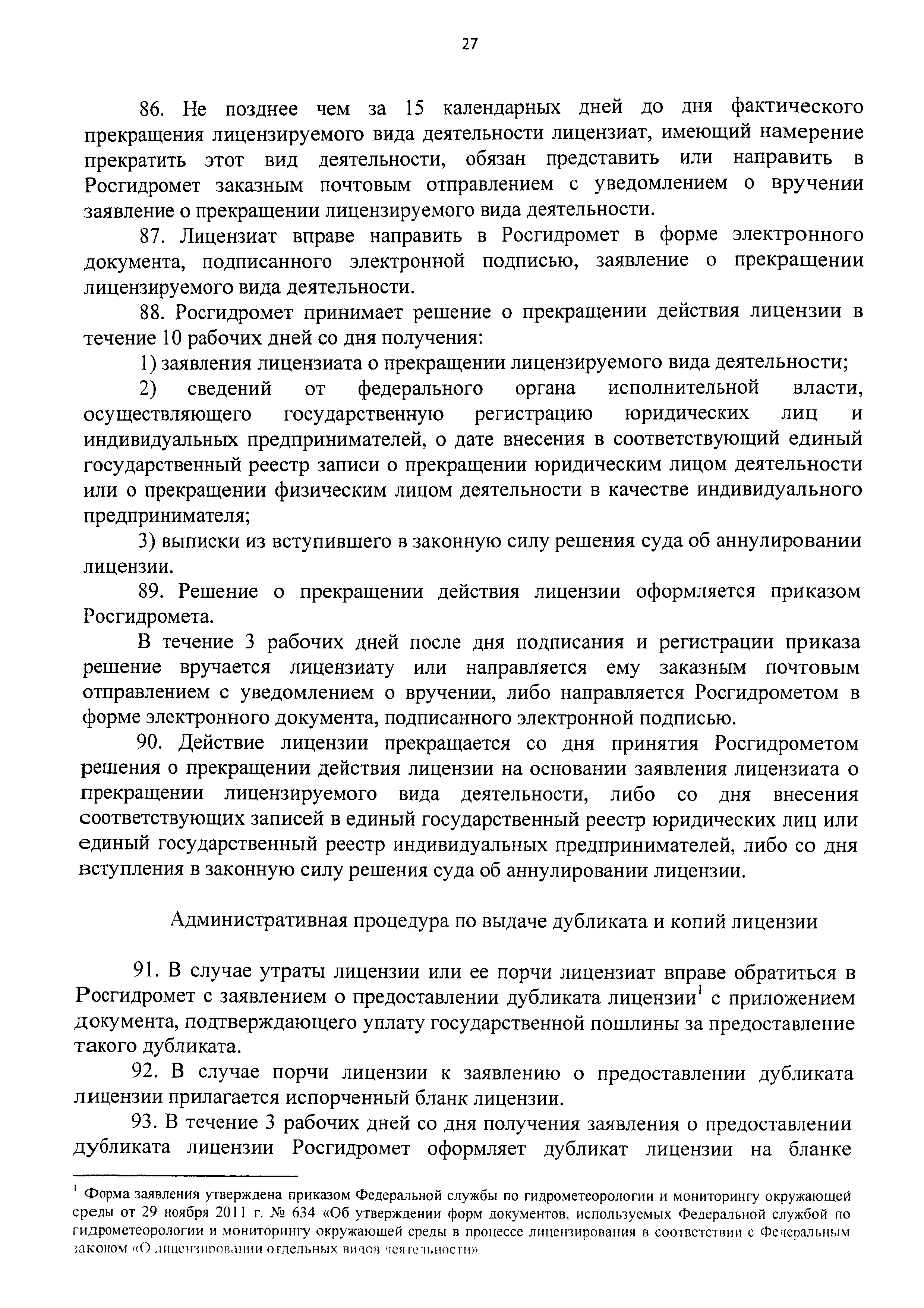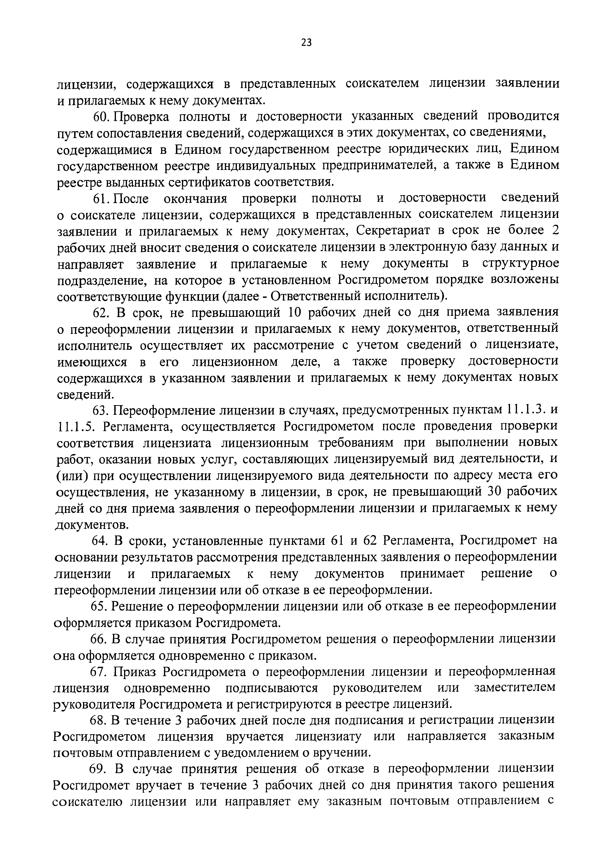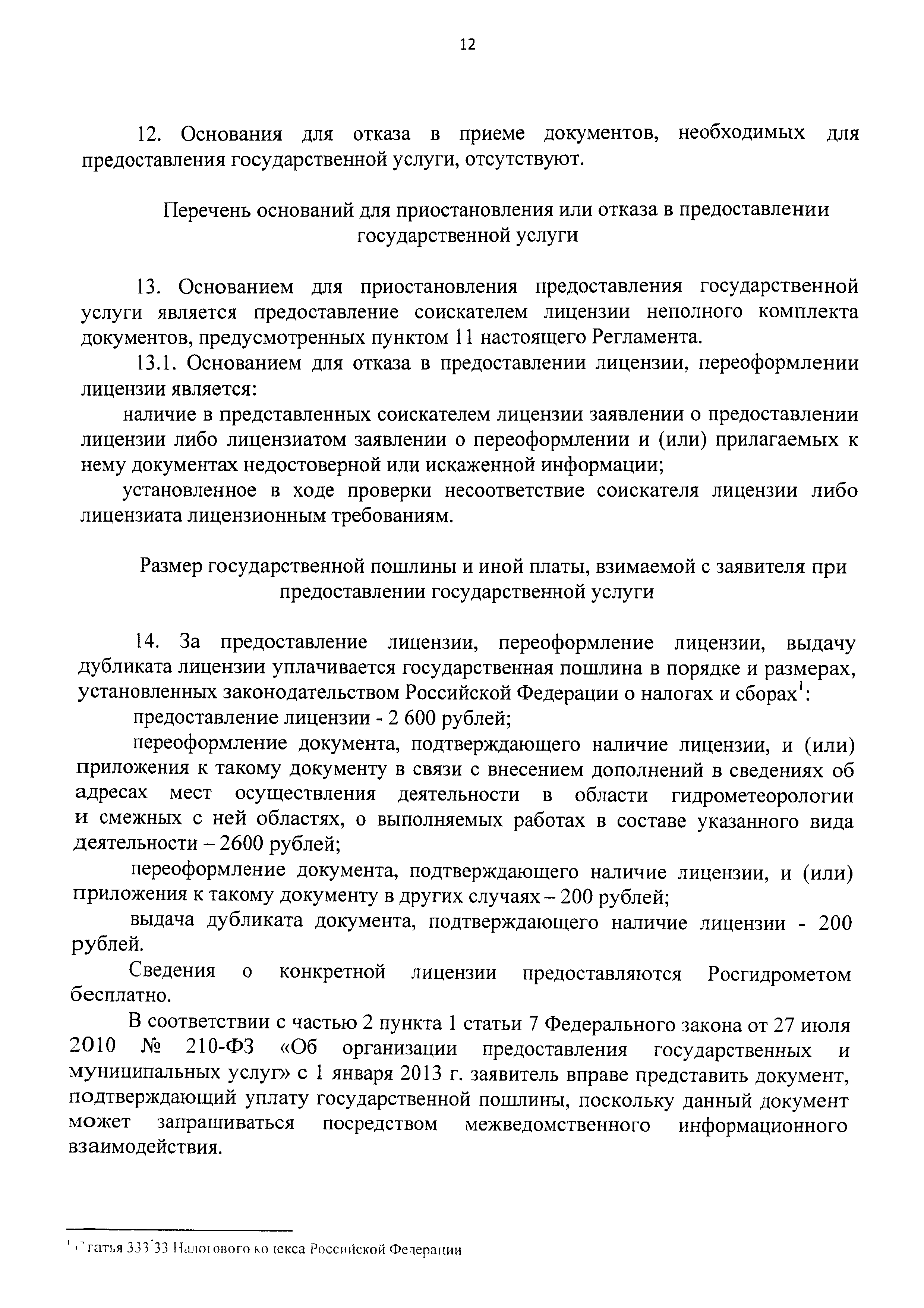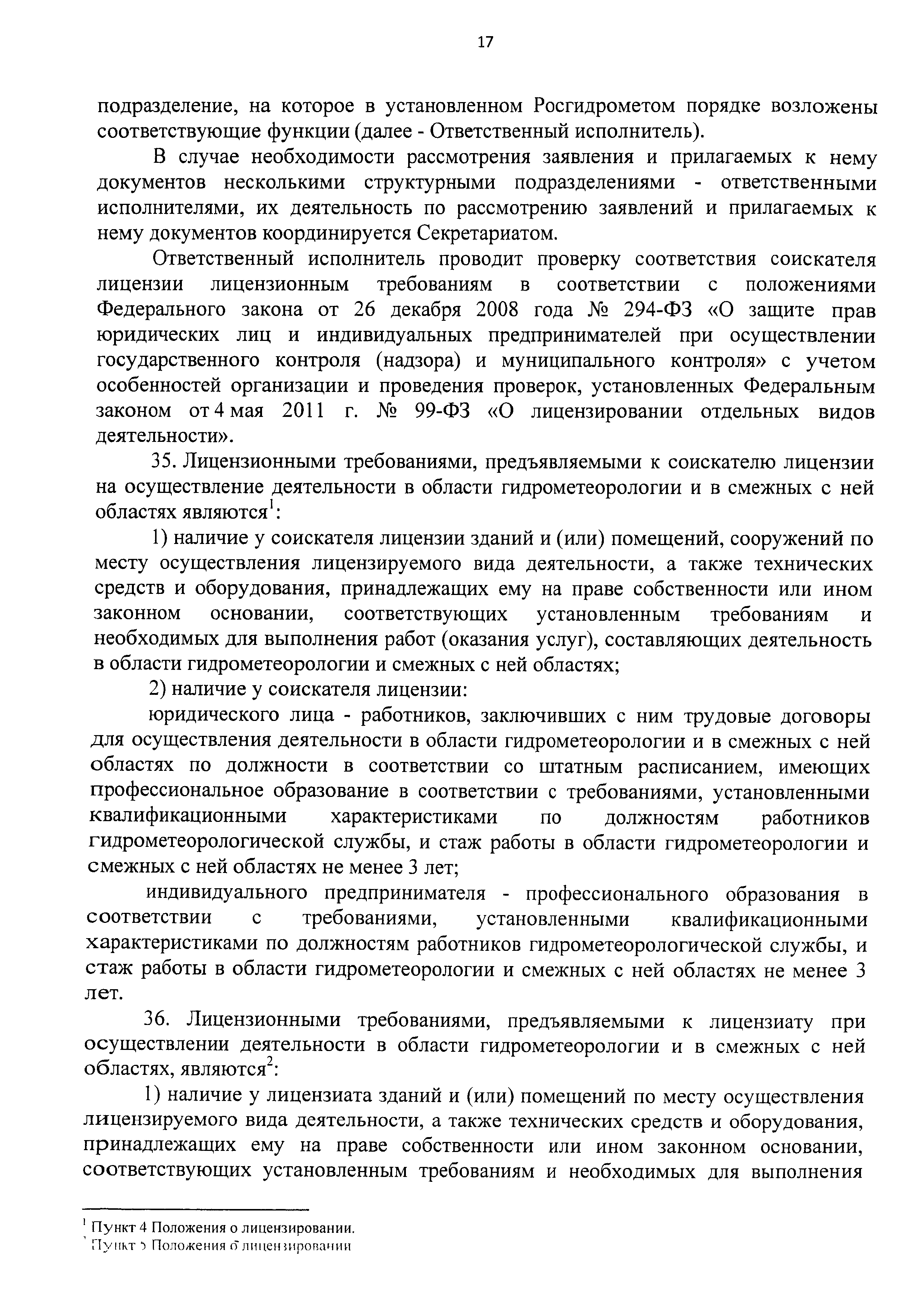 | | Нормативные ссылки: |  Кодекс «Кодекс Российской Федерации об административных правонарушениях»  Постановление 404 «О Министерстве природных ресурсов и экологии Российской Федерации»  Федеральный закон 294-ФЗ «О защите прав юридических лиц и индивидуальных предпринимателей при осуществлении государственного контроля (надзора) и муниципального контроля»  Федеральный закон 59-ФЗ «О порядке рассмотрения обращений граждан Российской Федерации»  Федеральный закон 125-ФЗ «Об архивном деле в Российской Федерации»  Федеральный закон 99-ФЗ «О лицензировании отдельных видов деятельности» Постановление 957 «Об организации лицензирования отдельных видов деятельности» Постановление 373 «О разработке и утверждении административных регламентов осуществления государственного контроля (надзора) и административных регламентов предоставления государственных услуг»  Федеральный закон 210-ФЗ «Об организации предоставления государственных и муниципальных услуг»  Федеральный закон 113-ФЗ «О гидрометеорологической службе» «Положение о создании и ведении Единого государственного фонда данных о состоянии окружающей среды, ее загрязнении» «Положение о Федеральной службе по гидрометеорологии и мониторингу окружающей среды» «Положение об информационных услугах в области гидрометеорологии и мониторинга загрязнения окружающей природной среды»  «Типовая форма лицензии»  Постановление 1219 «Об утверждении Положения о Министерстве природных ресурсов и экологии Российской Федерации и об изменении и признании утратившими силу некоторых актов Правительства Российской Федерации»  «Требования к предоставлению в электронной форме государственных и муниципальных услуг» «Правила подготовки докладов об осуществлении государственного контроля (надзора), муниципального контроля в соответствующих сферах деятельности и об эффективности такого контроля (надзора)» «Правила направления запроса и получения на безвозмездной основе, в том числе в электронной форме, документов и (или) информации органами государственного контроля (надзора), органами муниципального контроля при организации и проведении проверок от иных государственных органов, органов местного самоуправления либо подведомственных государственным органам или органам местного самоуправления организаций, в распоряжении которых находятся эти документы и (или) информация, в рамках межведомственного информационного взаимодействия» «Правила подачи и рассмотрения жалоб на решения и действия (бездействие) федеральных органов исполнительной власти и их должностных лиц, федеральных государственных служащих, должностных лиц государственных внебюджетных фондов Российской Федерации, государственных корпораций, наделенных в соответствии с федеральными законами полномочиями по предоставлению государственных услуг в установленной сфере деятельности, и их должностных лиц, организаций, предусмотренных частью 1.1 статьи 16 Федерального закона "Об организации предоставления государственных и муниципальных услуг", и их работников, а также многофункциональных центров предоставления государственных и муниципальных услуг и их работников»  Федеральный закон 181-ФЗ «О социальной защите инвалидов в Российской Федерации»