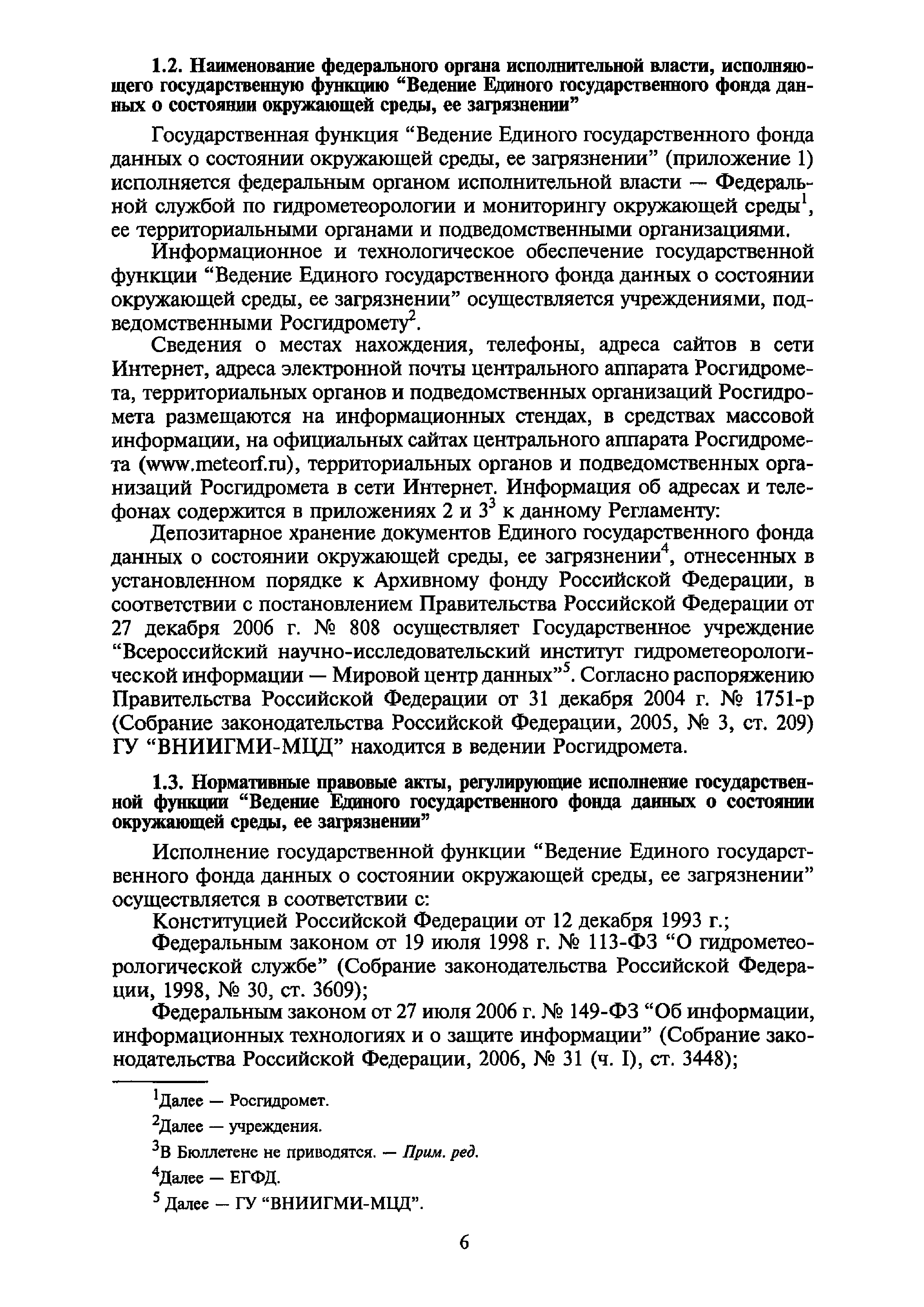 | Название рус.: | Административный регламент Федеральной службы по гидрометеорологии и мониторингу окружающей среды по исполнению государственной функции "Ведение Единого государственного фонда данных о состоянии окружающей среды, ее загрязнении" |
